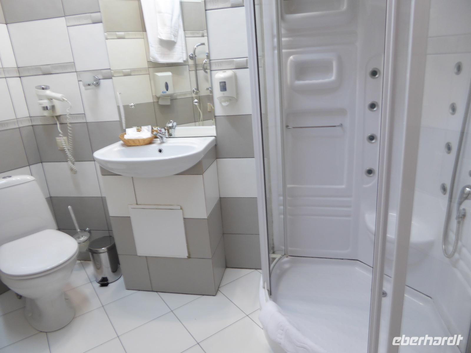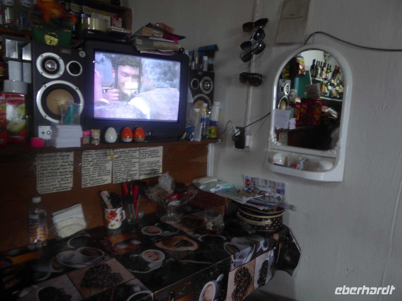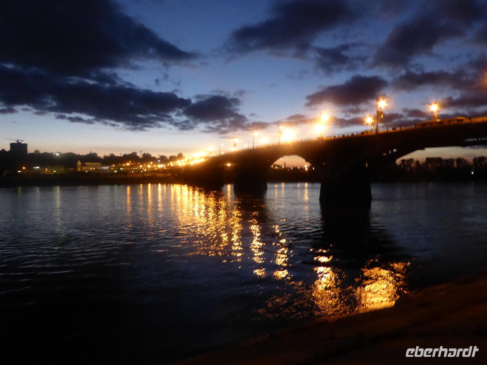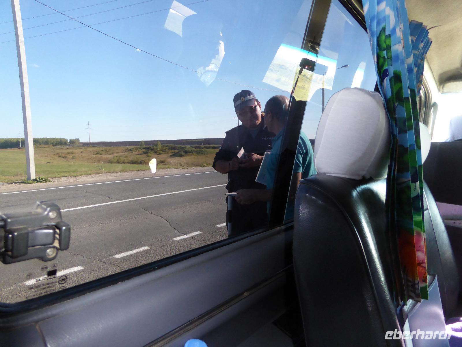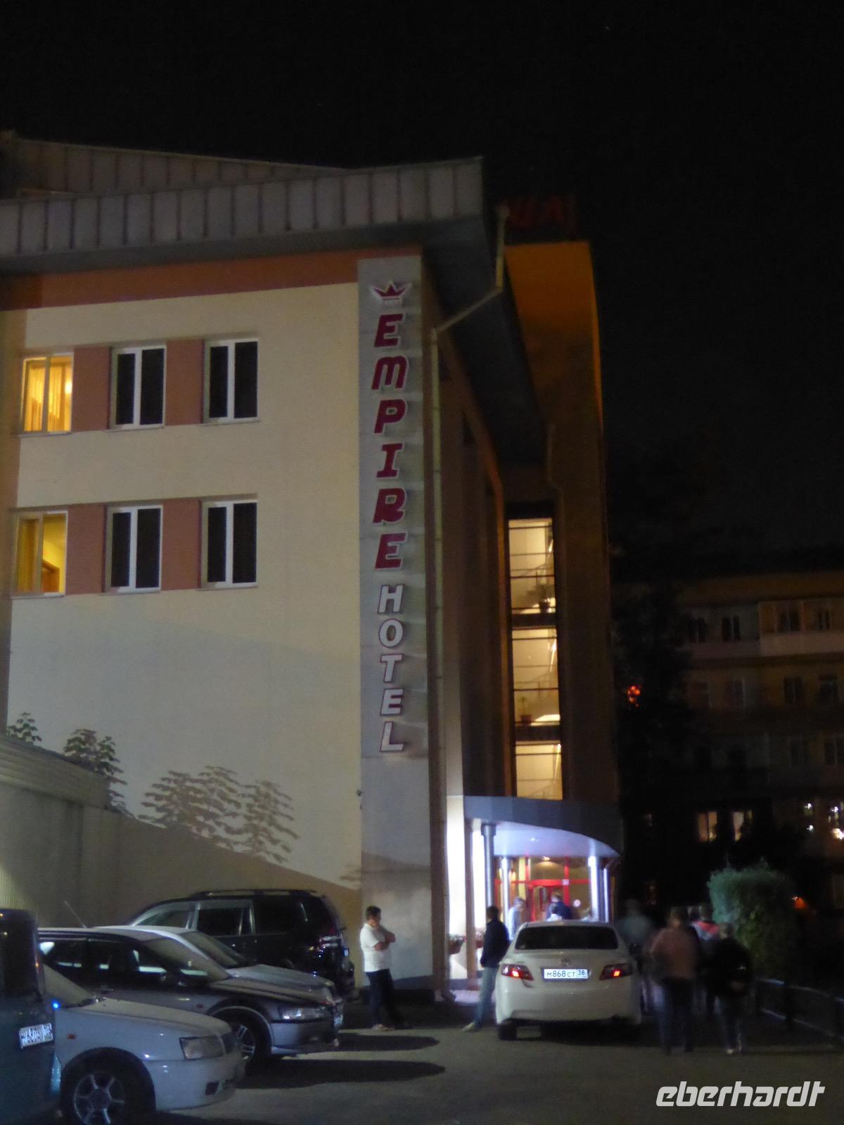 Noch einmal die leckeren Blinis, hmm. Alexander und Sergej verladen die Koffer. Heute verlassen wir Olchon. Am Fährhafen russische Verhältnisse. Eine Fähre ist kaputt. Die Autos stehen in langer Reihe an der anderen Fähre an. Tanja schlägt vor, dass wir als Fußgänger mit der nächsten (in einer halben Stunde) Fähre fahren und auf der anderen Seite auf die Autos warten. Dort sind die Souvenirläden besser bestückt. Gesagt getan. Bis Alexander und Sergej kommen, mischen wir die Souvenirgeschäfte auf. Kalender und ein Buch über die Insel Olchon sind bald ausverkauft. Um den Weg nach Irkutsk nicht langweilig werden zu lassen, steht der Besuch weiterer Felszeichnungen auf dem Programm. Doch zuerst gibt es Mittagessen im Restaurant Jurta. In Plastikschüsseln werden Salat, Soljanka und Posy serviert. Der Besuch des WCs entwickelt sich zu einem Abenteuer, da der entsprechende Schlüssel entweder weg ist und verzweifelt gesucht wird oder abgebrochen im Schloss hängen geblieben ist oder die Türen einfach nicht aufgehen wollen. Aber auch diese Hürde wird gemeistert und wir setzen unseren Rückweg fort. Kurz vor drei biegen wir von der asphaltierten Straße ab. Nur ein paar Meter weiter bleibt Alexander mit seinem Bus in einer Schlammpfütze stecken. Wir Sergej-Mitfahrer steigen aus und beobachten, wie er verzweifelt hin und her fährt und versucht, aus der Misere herauszukommen. Na hoffentlich wird da drin keinem schlecht. Es nutzt alles nichts. Auch Alexanders Fahrgäste müssen aussteigen. Nur drei sollen ganz hinten als Gewicht sitzen bleiben. Langsam macht sich Unmut breit. Müssen wir wirklich noch wandern? Können wir nicht weiterfahren. Tanja ist auch schon unruhig. Die Zeit rennt. Ich frage rum und die Meinung ist geteilt. Die einen wollen nach Irkutsk, die anderen (die wandern würden) verhalten sich neutral. Also entscheiden wir mit der Vernunft. Als es Sergej endlich gelungen ist, Alexanders Bus aus dem Matsch zu ziehen, fahren wir nach Irkutsk. Am Abend kommen wir im Hotel Imperia an. Was für ein Luxus. Bäder und Duschen! Nicht lange bleibt Zeit zum Ausruhen, denn unser Abendessen im russischen Ambiente wartet. Tanja hält eine kleine Abschiedsrede und spendiert Wodka, wir bedanken uns und haben auch für Tanja noch Überraschungsgeschenke dabei. Nach dem Essen spazieren wir durch das beleuchtete Irkutsk und begeben uns zu unserer letzten Nachtruhe auf russischem Boden.