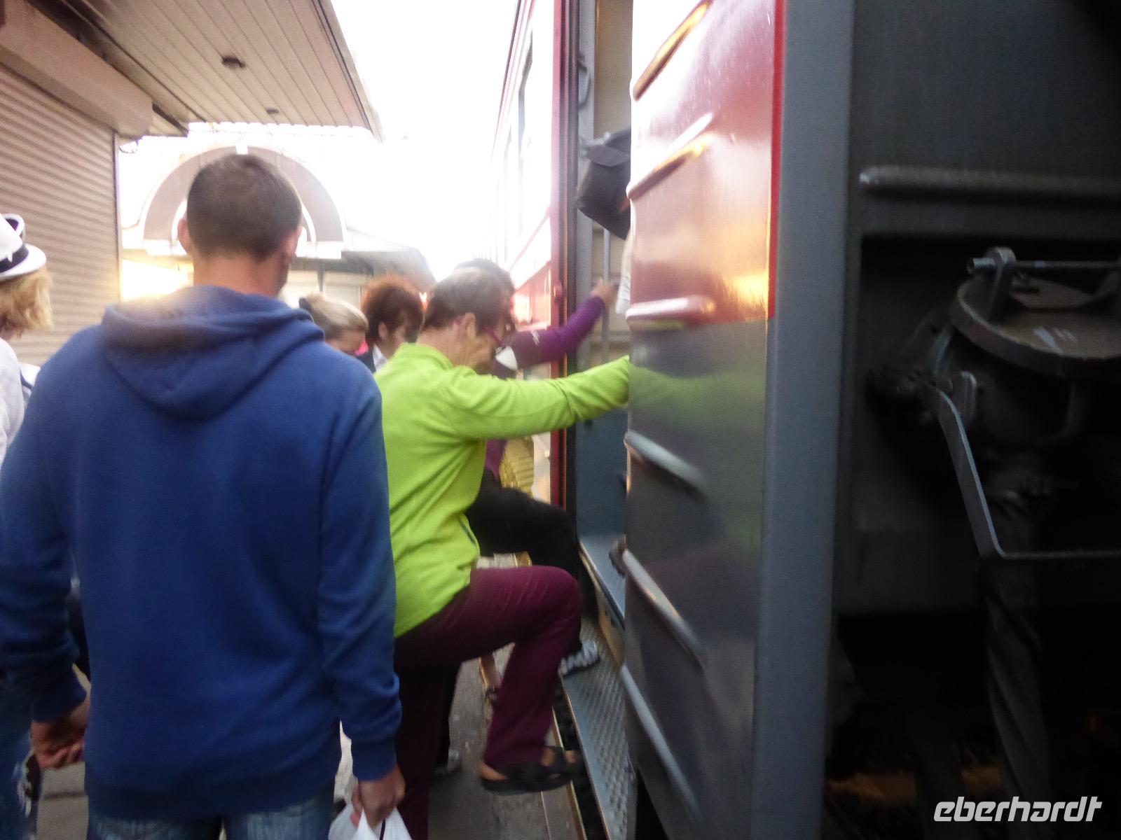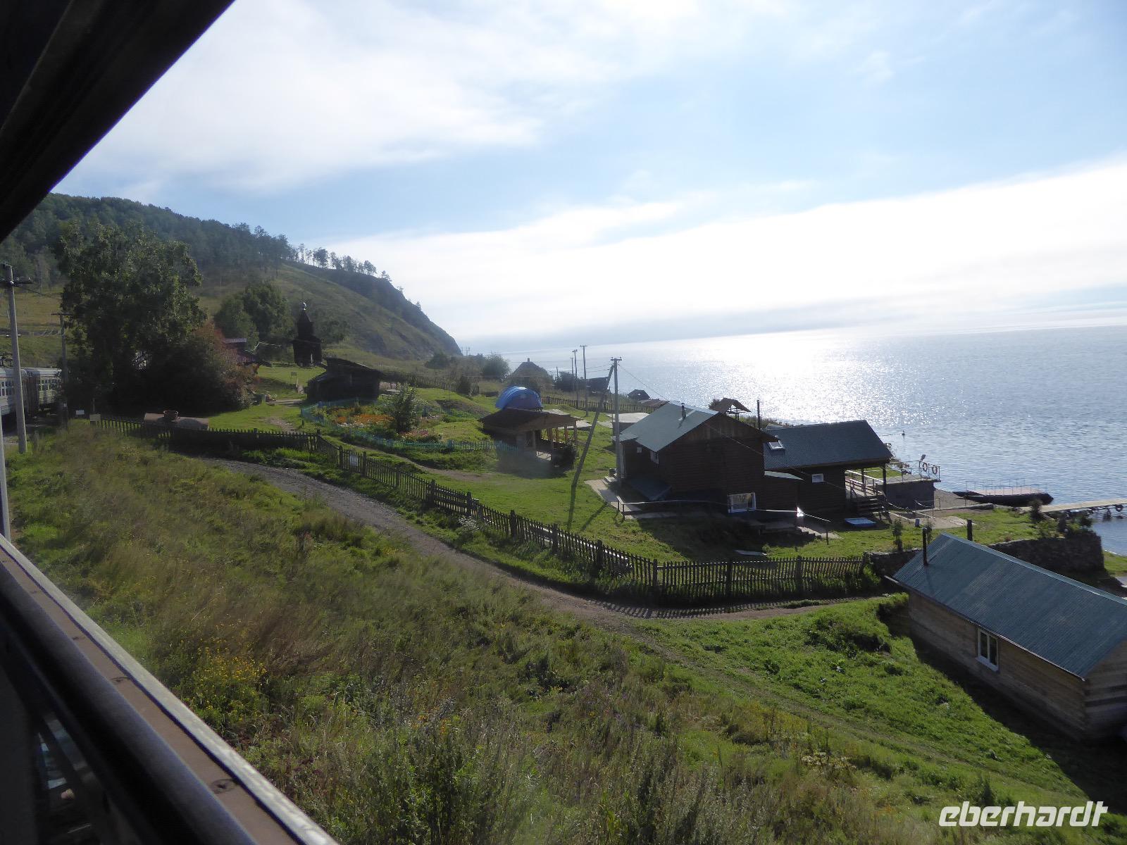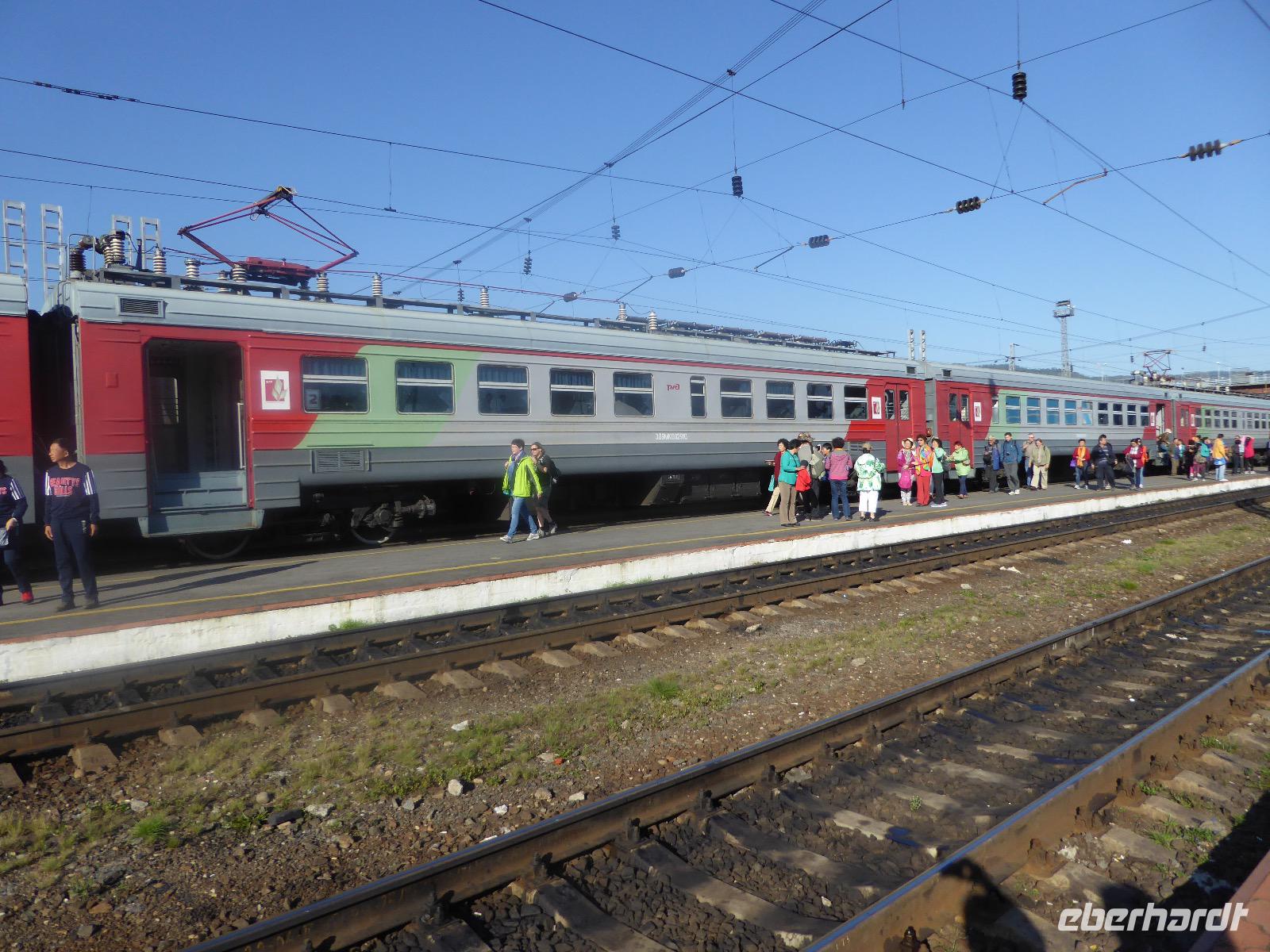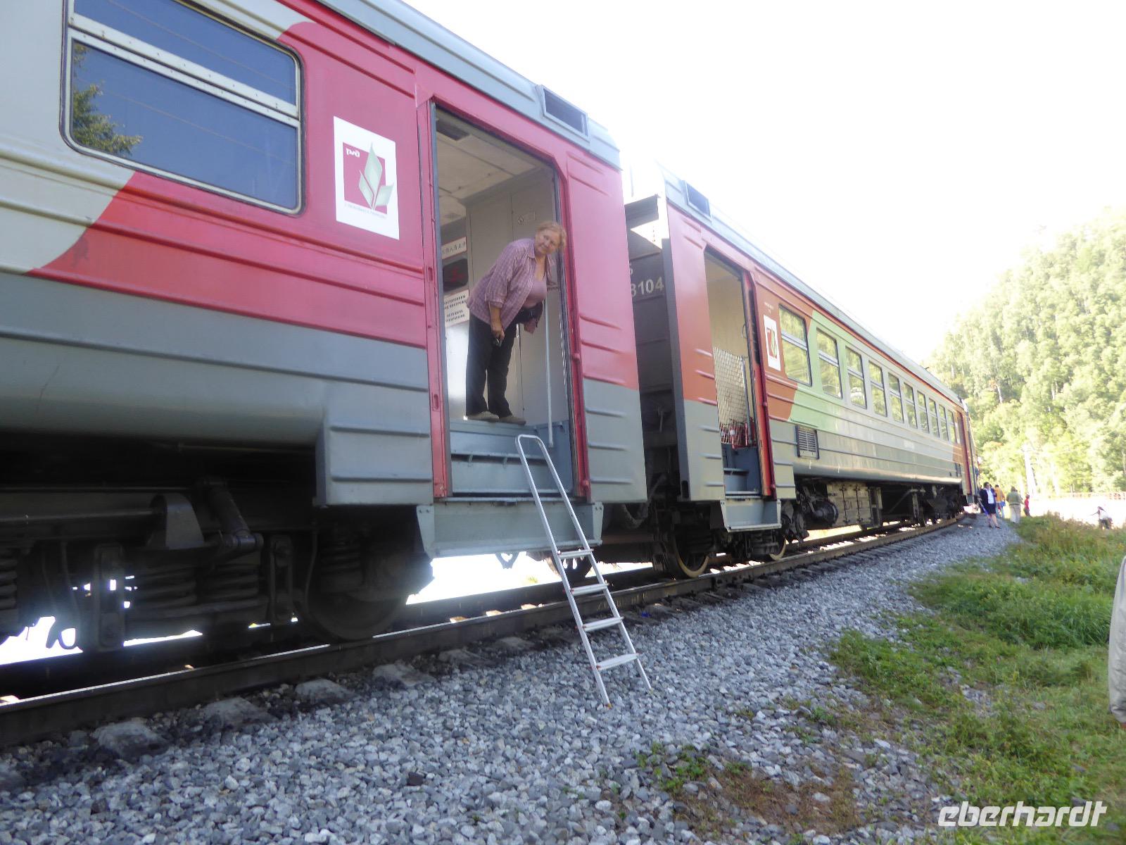 Oh Gott! Fünf Uhr Aufstehen. Das ist definitiv zu früh. Frühstück gibts auch nicht, aber Verpflegungsbeutel. Um sechs fahren wir zum Bahnhof, 6.48 Uhr fährt der Zug los. Wir fahren mit der Baikalbahn. 1. Klasse. Außer uns noch gefühlte eine Million Chinesen. Diese fahren allerdings in den Wagen der 2. oder 3. Klasse. Leider gibt es keine russischen Mütterchen mit flügelschlagenden Hühnern, die man in ein Freundschaftsgespräch verwickeln könnte. (So hatte ich mir das irgenwie vorgestellt). Es ist eben heute ein Touristenzug. Nun dann muss Elena dran glauben, denn sie verantwortet die zugansässige MITROPA oder wie auch immer heutzutage die Gastwirtschaft in einem russischen Zug heißt. Elena versorgt uns mit Kaffee und geräuchertem Omul und bekommt dafür ein freundliches Spassibo von uns. Gegen Mittag erreichen wir Sludjanka. Auf dem Bahnsteig befindet sich eine Büste von Michail Iwanowitsch Chilkow. Hinter dem Bahnhof eine kleine Kirche. Der Zug setzt jetzt seine Fahrt fort, immer am Ufer des Baikalsees entlang. Abenteuerlich sind die Ausstiege an den Fotostopps. Über eine Trittleiter, die vom Zugpersonal vor dem Umkippen geschützt wird, klettern wir mehr oder weniger geschickt aus dem Zug. Einen Stopp legen wir zum Beispiel in Kirkirei am Tunnel Nummer 18 ein. Hier wurden 1904 der östliche und westliche Streckenabschnitt der Transsibirischen Eisenbahn verbunden. Im Zug ist jetzt ein junger Mann unterwegs, der Zedernmilch verkauft. Diese wurde aus den Kernen der Zedernzapfen hergestellt, ist in Sibirien beliebt und auch sehr gesund. Ich bestelle drei Flaschen, so dass jeder einmal kosten kann. Schmeckt wie mit Wasser gekochter Kakao mit Nebengeschmack. An der Station Polowinaja gibt es Mittagessen. Unsere Gastgeberin ist sehr bemüht, alle Zugreisenden schnell zu bedienen. Als wir sie darauf aufmerksam machen, dass an einem Tisch noch ein Tellerchen Suppe fehlt, reagiert sie recht unwirsch, so nach dem Motto - ja ja, wartet doch mal ab, ich komme ja schon. Zum Glück habe ich ein kleines Souvenir dabei, das ich ihr gebe und schon lächelt sie wieder ganz versöhnlich und schenkt mir ihrerseits drei Zedernzapfen. Und schon ist die deutsch-russische Freundschaft wieder hergestellt. Nach einer Stunde fahren wir weiter. Am Bahnof Port Baikal erwartet eine kleine Musikgruppe in traditioneller Kleidung die Zuggäste. Sofort sind sie von Chinesen umringt. Kaum gelingt es uns, mitzumischen. Nur Chris und Christine lassen sich nicht abhalten und tanzen fröhlich mit. Dann geht es weiter zur Fähre, wir sind noch immer nicht da. Ab Listwjanka sind es noch ca. 1,5 Kilometer zu Fuß bis zu unserem Quartier. Müde, aber glücklich erreichen wir Krestowaja Pad. Ein schönes Hotel mit vielen Treppen.