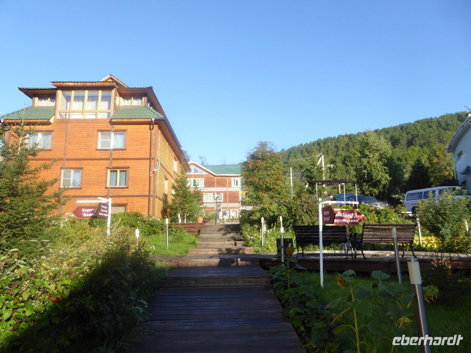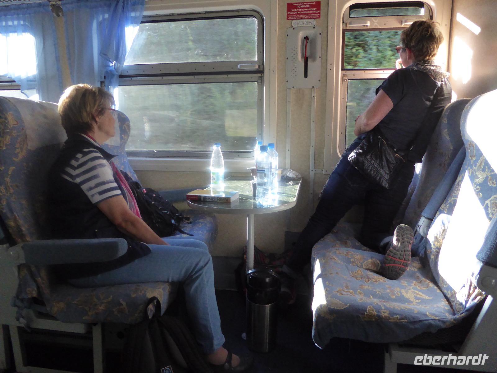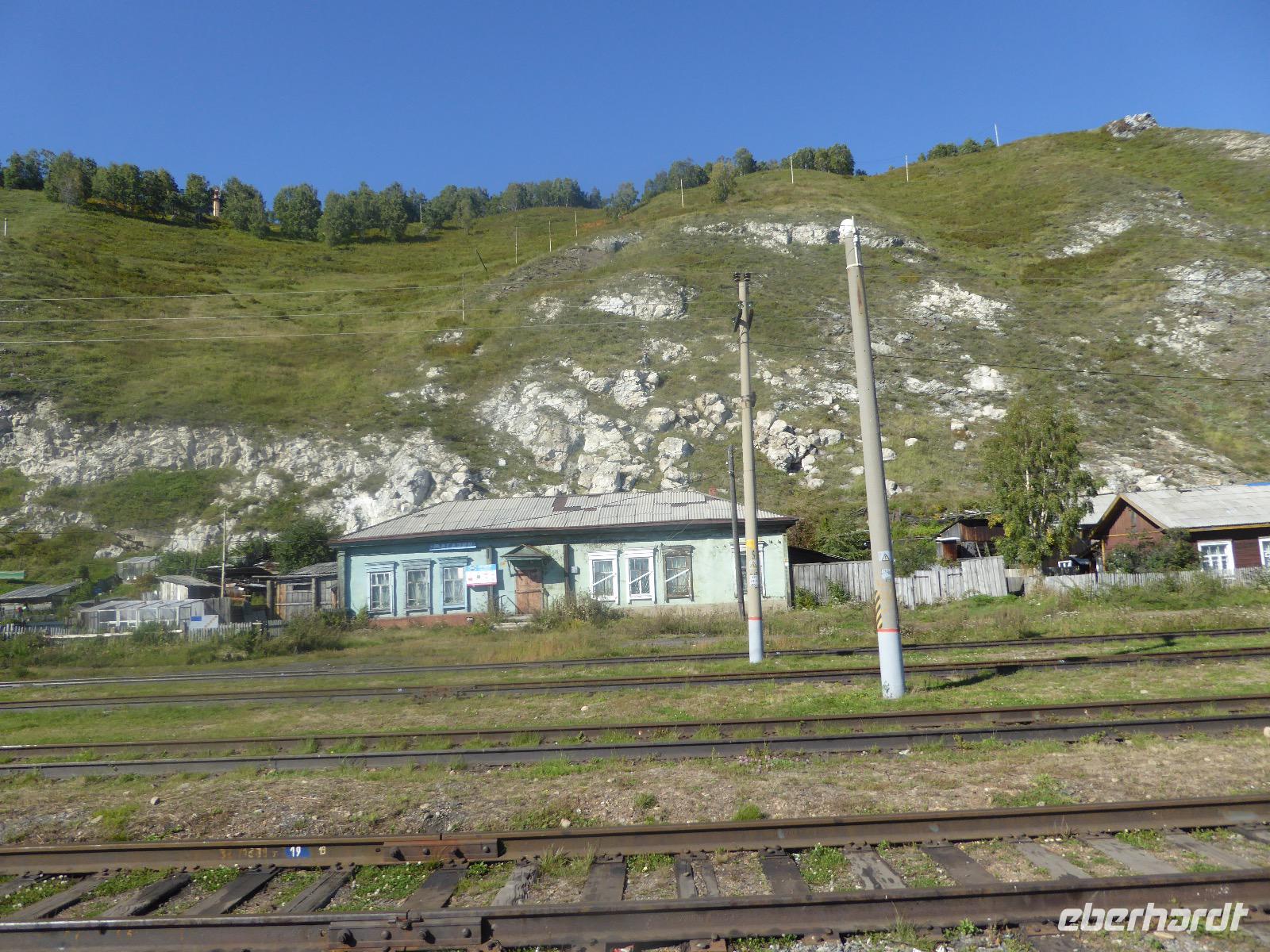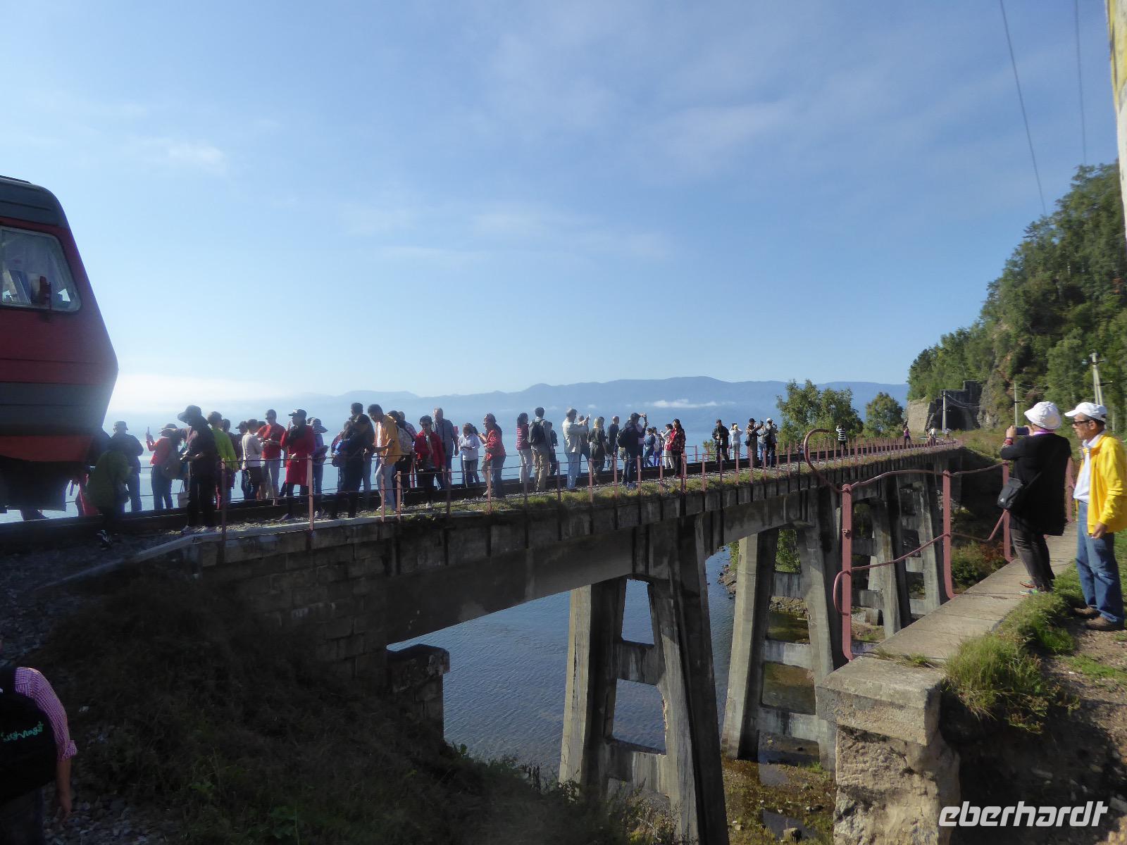 Oh Gott! Fünf Uhr Aufstehen. Das ist definitiv zu früh. Frühstück gibts auch nicht, aber Verpflegungsbeutel. Um sechs fahren wir zum Bahnhof, 6.48 Uhr fährt der Zug los. Wir fahren mit der Baikalbahn. 1. Klasse. Außer uns noch gefühlte eine Million Chinesen. Diese fahren allerdings in den Wagen der 2. oder 3. Klasse. Leider gibt es keine russischen Mütterchen mit flügelschlagenden Hühnern, die man in ein Freundschaftsgespräch verwickeln könnte. (So hatte ich mir das irgenwie vorgestellt). Es ist eben heute ein Touristenzug. Nun dann muss Elena dran glauben, denn sie verantwortet die zugansässige MITROPA oder wie auch immer heutzutage die Gastwirtschaft in einem russischen Zug heißt. Elena versorgt uns mit Kaffee und geräuchertem Omul und bekommt dafür ein freundliches Spassibo von uns. Gegen Mittag erreichen wir Sludjanka. Auf dem Bahnsteig befindet sich eine Büste von Michail Iwanowitsch Chilkow. Hinter dem Bahnhof eine kleine Kirche. Der Zug setzt jetzt seine Fahrt fort, immer am Ufer des Baikalsees entlang. Abenteuerlich sind die Ausstiege an den Fotostopps. Über eine Trittleiter, die vom Zugpersonal vor dem Umkippen geschützt wird, klettern wir mehr oder weniger geschickt aus dem Zug. Einen Stopp legen wir zum Beispiel in Kirkirei am Tunnel Nummer 18 ein. Hier wurden 1904 der östliche und westliche Streckenabschnitt der Transsibirischen Eisenbahn verbunden. Im Zug ist jetzt ein junger Mann unterwegs, der Zedernmilch verkauft. Diese wurde aus den Kernen der Zedernzapfen hergestellt, ist in Sibirien beliebt und auch sehr gesund. Ich bestelle drei Flaschen, so dass jeder einmal kosten kann. Schmeckt wie mit Wasser gekochter Kakao mit Nebengeschmack. An der Station Polowinaja gibt es Mittagessen. Unsere Gastgeberin ist sehr bemüht, alle Zugreisenden schnell zu bedienen. Als wir sie darauf aufmerksam machen, dass an einem Tisch noch ein Tellerchen Suppe fehlt, reagiert sie recht unwirsch, so nach dem Motto - ja ja, wartet doch mal ab, ich komme ja schon. Zum Glück habe ich ein kleines Souvenir dabei, das ich ihr gebe und schon lächelt sie wieder ganz versöhnlich und schenkt mir ihrerseits drei Zedernzapfen. Und schon ist die deutsch-russische Freundschaft wieder hergestellt. Nach einer Stunde fahren wir weiter. Am Bahnof Port Baikal erwartet eine kleine Musikgruppe in traditioneller Kleidung die Zuggäste. Sofort sind sie von Chinesen umringt. Kaum gelingt es uns, mitzumischen. Nur Chris und Christine lassen sich nicht abhalten und tanzen fröhlich mit. Dann geht es weiter zur Fähre, wir sind noch immer nicht da. Ab Listwjanka sind es noch ca. 1,5 Kilometer zu Fuß bis zu unserem Quartier. Müde, aber glücklich erreichen wir Krestowaja Pad. Ein schönes Hotel mit vielen Treppen.