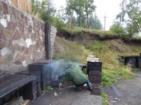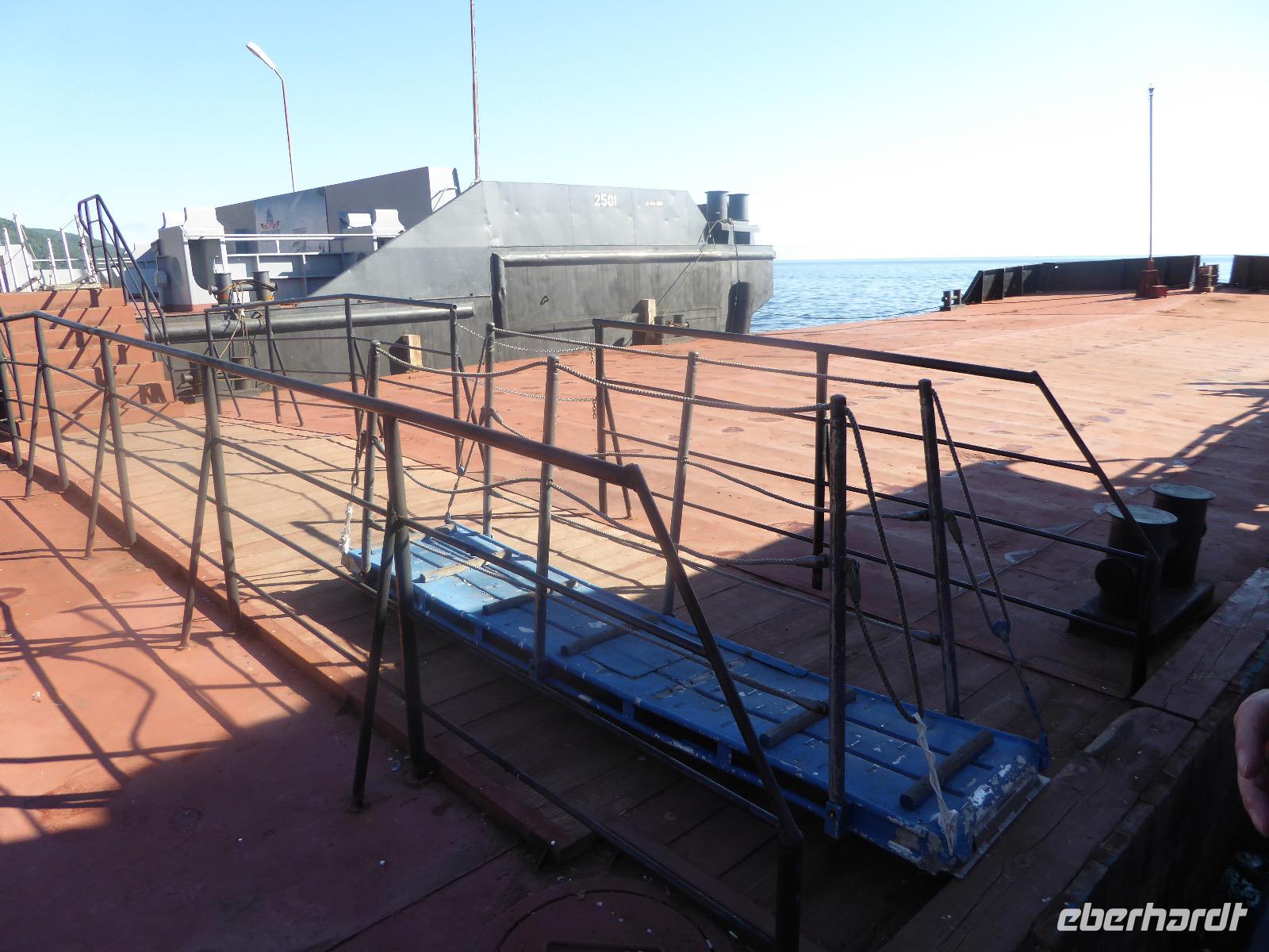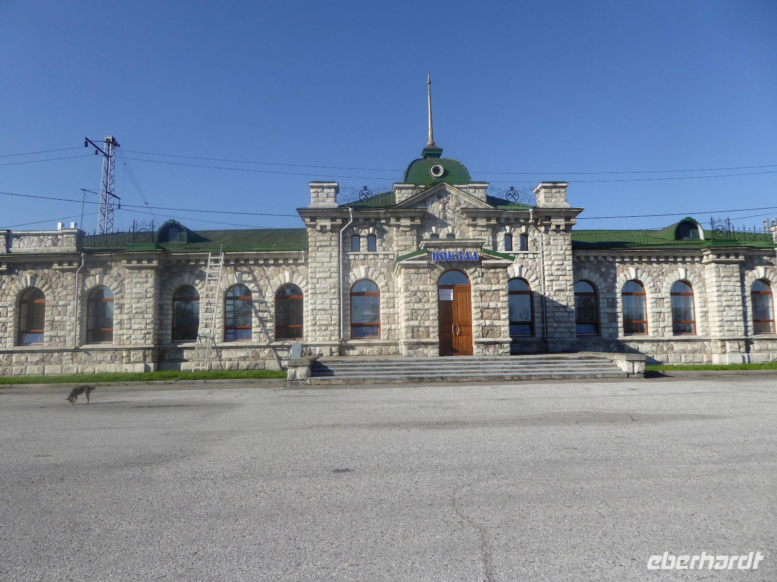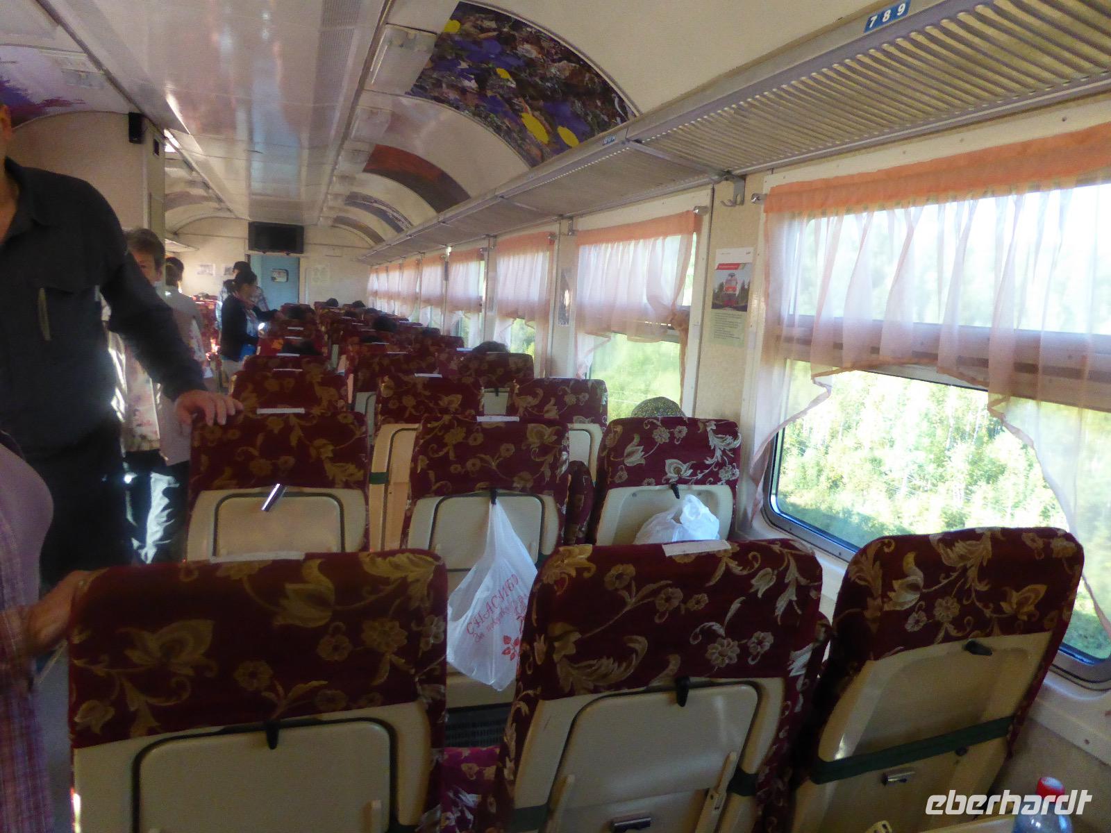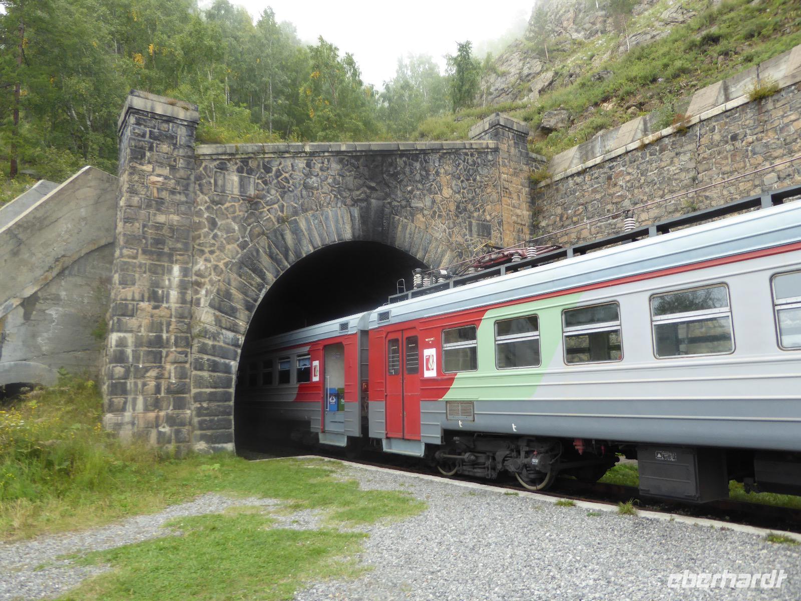 Oh Gott! Fünf Uhr Aufstehen. Das ist definitiv zu früh. Frühstück gibts auch nicht, aber Verpflegungsbeutel. Um sechs fahren wir zum Bahnhof, 6.48 Uhr fährt der Zug los. Wir fahren mit der Baikalbahn. 1. Klasse. Außer uns noch gefühlte eine Million Chinesen. Diese fahren allerdings in den Wagen der 2. oder 3. Klasse. Leider gibt es keine russischen Mütterchen mit flügelschlagenden Hühnern, die man in ein Freundschaftsgespräch verwickeln könnte. (So hatte ich mir das irgenwie vorgestellt). Es ist eben heute ein Touristenzug. Nun dann muss Elena dran glauben, denn sie verantwortet die zugansässige MITROPA oder wie auch immer heutzutage die Gastwirtschaft in einem russischen Zug heißt. Elena versorgt uns mit Kaffee und geräuchertem Omul und bekommt dafür ein freundliches Spassibo von uns. Gegen Mittag erreichen wir Sludjanka. Auf dem Bahnsteig befindet sich eine Büste von Michail Iwanowitsch Chilkow. Hinter dem Bahnhof eine kleine Kirche. Der Zug setzt jetzt seine Fahrt fort, immer am Ufer des Baikalsees entlang. Abenteuerlich sind die Ausstiege an den Fotostopps. Über eine Trittleiter, die vom Zugpersonal vor dem Umkippen geschützt wird, klettern wir mehr oder weniger geschickt aus dem Zug. Einen Stopp legen wir zum Beispiel in Kirkirei am Tunnel Nummer 18 ein. Hier wurden 1904 der östliche und westliche Streckenabschnitt der Transsibirischen Eisenbahn verbunden. Im Zug ist jetzt ein junger Mann unterwegs, der Zedernmilch verkauft. Diese wurde aus den Kernen der Zedernzapfen hergestellt, ist in Sibirien beliebt und auch sehr gesund. Ich bestelle drei Flaschen, so dass jeder einmal kosten kann. Schmeckt wie mit Wasser gekochter Kakao mit Nebengeschmack. An der Station Polowinaja gibt es Mittagessen. Unsere Gastgeberin ist sehr bemüht, alle Zugreisenden schnell zu bedienen. Als wir sie darauf aufmerksam machen, dass an einem Tisch noch ein Tellerchen Suppe fehlt, reagiert sie recht unwirsch, so nach dem Motto - ja ja, wartet doch mal ab, ich komme ja schon. Zum Glück habe ich ein kleines Souvenir dabei, das ich ihr gebe und schon lächelt sie wieder ganz versöhnlich und schenkt mir ihrerseits drei Zedernzapfen. Und schon ist die deutsch-russische Freundschaft wieder hergestellt. Nach einer Stunde fahren wir weiter. Am Bahnof Port Baikal erwartet eine kleine Musikgruppe in traditioneller Kleidung die Zuggäste. Sofort sind sie von Chinesen umringt. Kaum gelingt es uns, mitzumischen. Nur Chris und Christine lassen sich nicht abhalten und tanzen fröhlich mit. Dann geht es weiter zur Fähre, wir sind noch immer nicht da. Ab Listwjanka sind es noch ca. 1,5 Kilometer zu Fuß bis zu unserem Quartier. Müde, aber glücklich erreichen wir Krestowaja Pad. Ein schönes Hotel mit vielen Treppen.