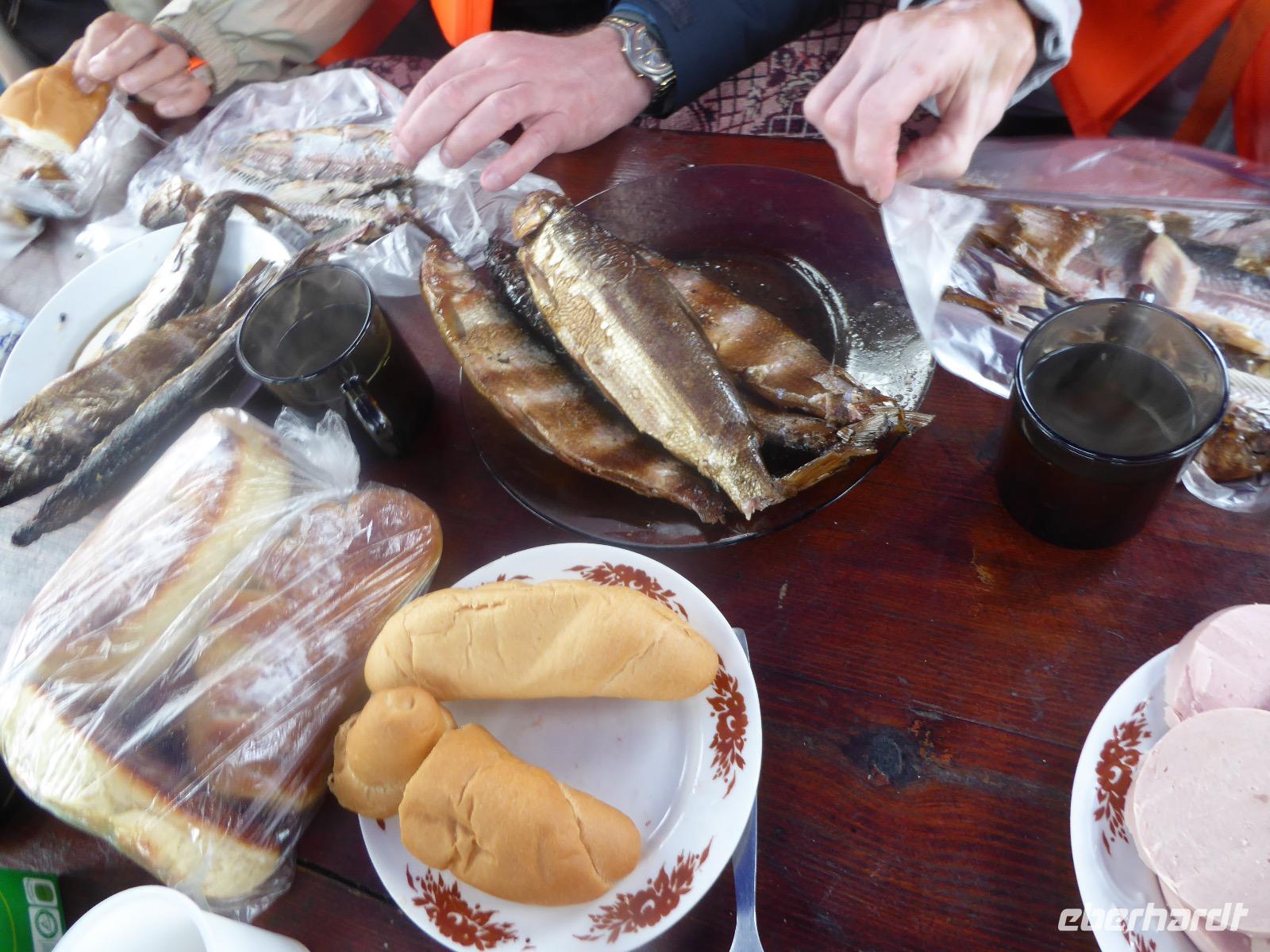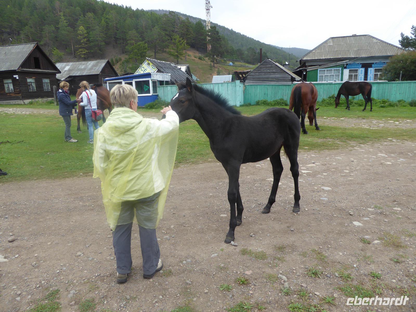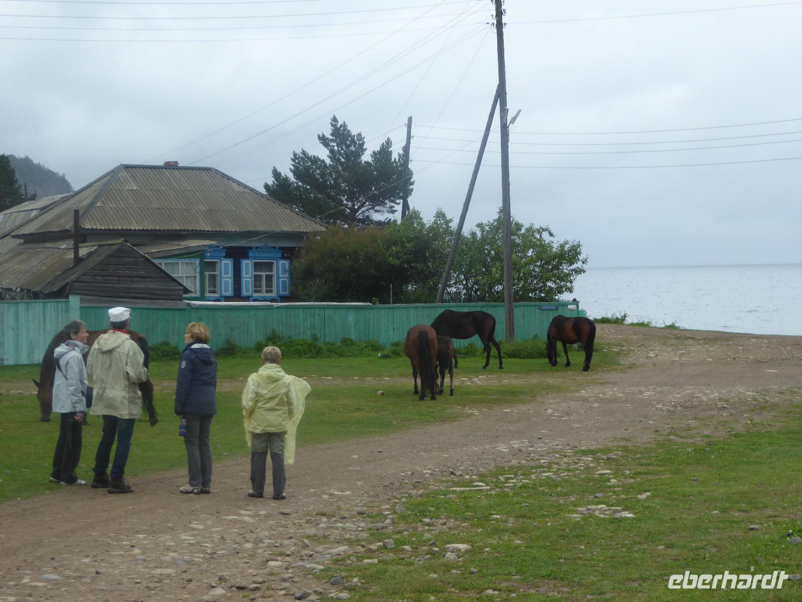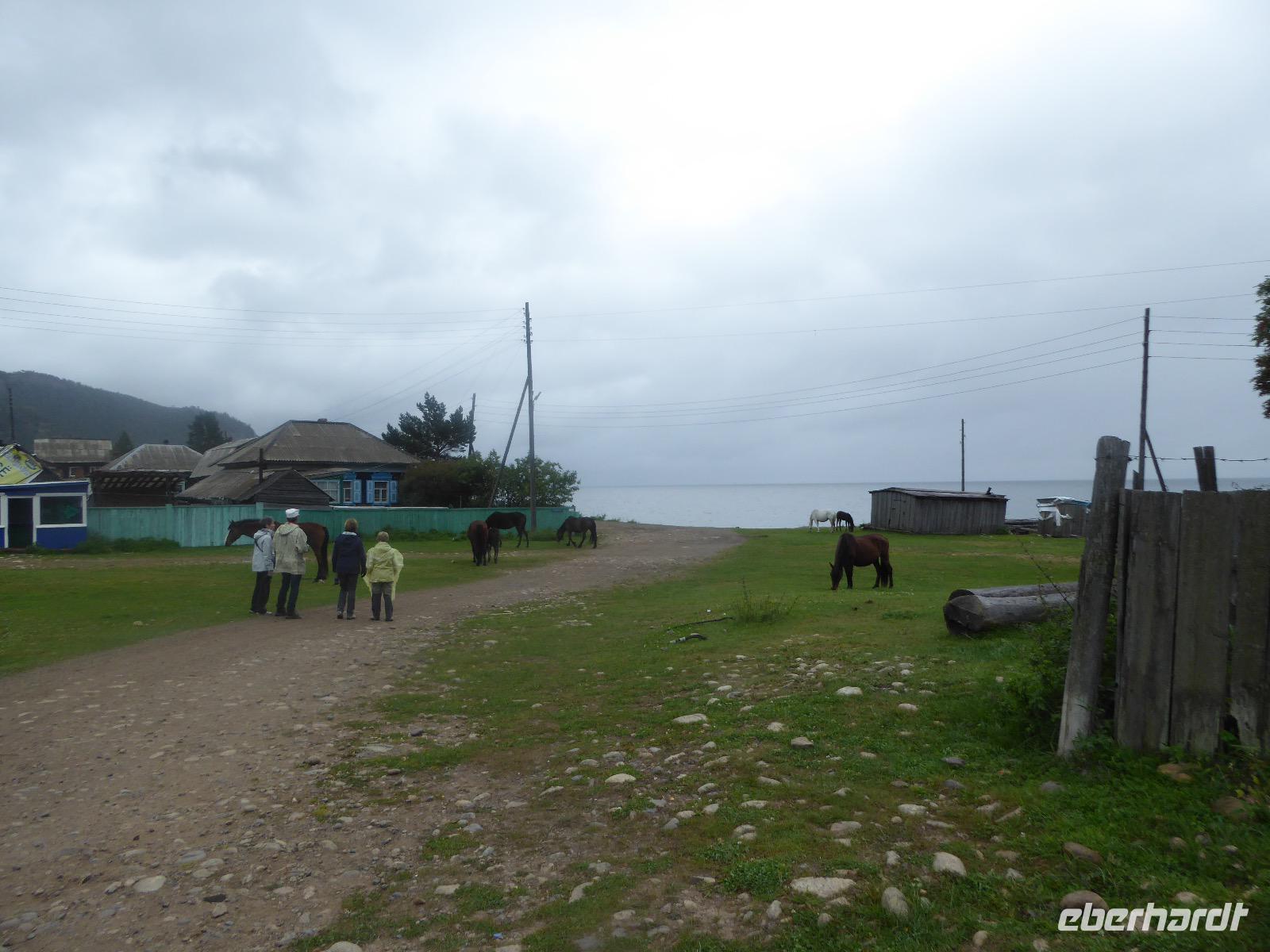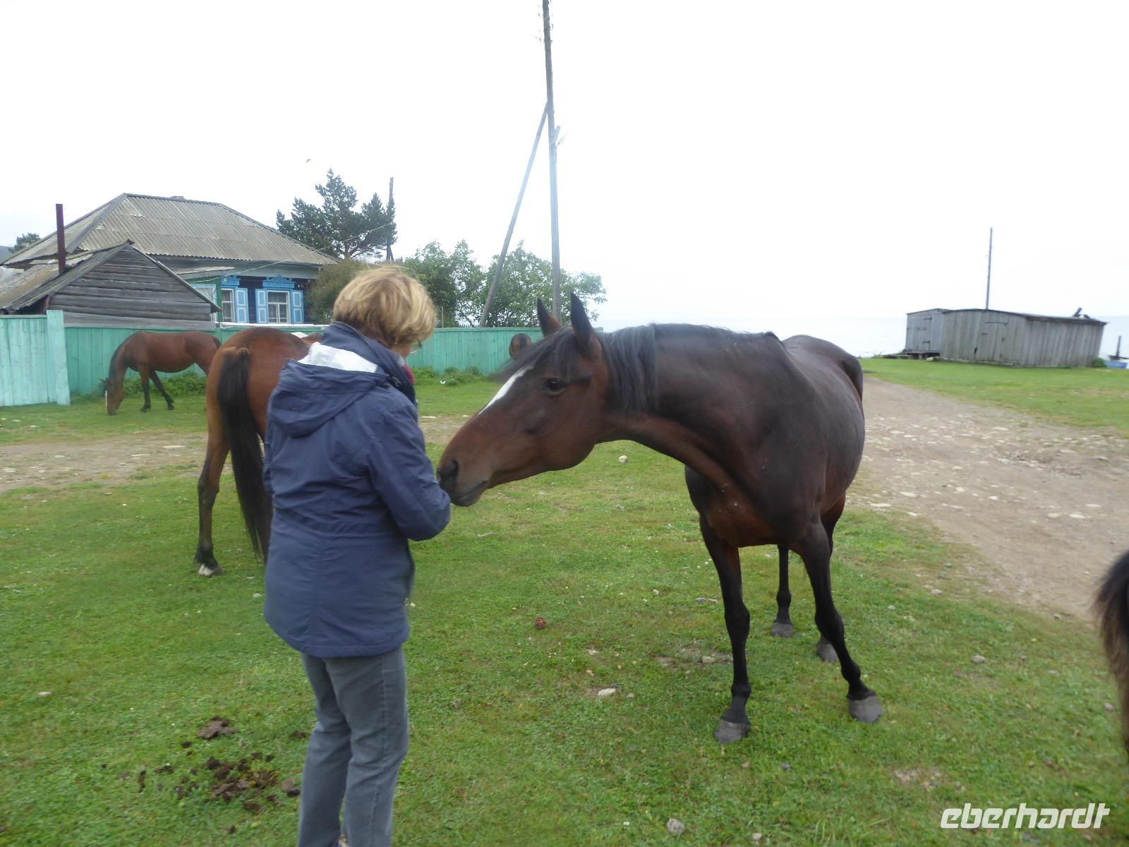 Wer will mit zum Fischmarkt? Fragt Tanja. Fast alle sind dabei. Erwartet wird ein kleiner Spaziergang endend in einem großen Erlebnis. Der Nieselregen ist fies. Bald sind wir durchnässt. Nach einer halben Stunde regt sich der erste Protest. Tanja, wie weit noch? Noch zehn Minuten... Tanjas zehn Minuten. Wir kommen am Fischmarkt an. Kaum jemand ist dort. Kein Wetter für Markt. Nur ein paar wenige Frau bieten Fisch an, ein Mann beschäftigt sich damit, einen eisernen Ofen anzufeuern. Tanja ruft Taxis für den Rückweg. Ein bisschen Zeit, sich frisch zu machen und unser Gepäck wird vom Zimmer abgeholt. Mit dem Taxi fahren wir zum Hafen. Über eine Leiter müssen wir unser Gepäck balancieren, die Männer übernehmen das bravourös. Die EISBERG, so heißt unser Schiff, wird uns in fünf Stunden über den Baikalsee nach Bolschoje Goloustnoje bringen. Kaum sind alle Passagiere und alle Koffer an Bord, beginnt unsere abenteuerliche Seefahrt. Die Wellen sind recht hoch und unser Schiffchen wackelt bedenklich. Jeder muss eine Rettungsweste anziehen, anschließend bekommen wir Decken, denn es ist doch recht kalt. Der Tisch wird gedeckt. Schwarzbrot und Brötchen, Butter und Käse, Wurst, Sardinen in Tomatensoße. Dazu Tee. Tanja kocht und deckt unermüdlich den Tisch. Wir lassen es uns schmecken. Den ersten Stopp legen wir an der Bucht der Großen Katze bzw. Fischfalle ein. Tanja erklärt uns die einheimische Tierwelt. Nach zehn Minuten Fußweg ist ein Dorf zu sehen. Zwischen uns und dem Dorf ein Fluss. Zu breit und zu kalt, um ihn ohne Brücke zu überqueren, denn die ist kaputt. Wir laufen am Flussbett entlang und finden eine richtige steinerne Brücke. So gelangen wir ins Dorf. Freilaufende Pferde erwecken unsere Aufmerksamkeit. Sie sind zutraulich und erwarten Futter. Im Konsum kaufen wir Brot und Wodka. Das Brot für die Pferde, den Wodka für uns. Zurück an Bord gibt es den warm geräucherten Omul, den Tanja für uns auf dem Fischmarkt eingekauft hat. Im Pribalski Naturreservat legen wir den zweiten Stopp ein. Eine Stunde haben wir Zeit, zu wandern, die Natur zu genießen und uns an den Blümchen zu erfreuen. Aber erst will der Rancher die Erlaubnis sehen, die wir haben, um den Park zu besuchen. Auf dem Rückweg fordert der Baikalsee uns alles ab. Das Wasser klatscht in hohem Bogen ins Schiff. Rucksäcke, Hosen und viele Füße sind nass. Es stürmt und unser Schiff ist dem Willen der Natur ausgeliefert und wir damit auch. Trotzdem wird niemand seekrank. Wir sind froh als wir pünktlich in Bolschoje Golustnoje ankommen. Soja erwartet uns mit einem Auto, in das das ganze Gepäck passen soll. Wir bezweifeln das, werden aber eines Besseren belehrt. Das Gepäck fährt, wir laufen. In zwanzig Minuten erreichen wir Gasthaus Nummer 1. Galina ist die Gastgeberin. Sechs Gäste und Tanja bleiben hier. Die anderen laufen zehn Minuten weiter zum Gasthaus Nummer 2. Dieses gehört Soja, das Nachbarhaus ihrer Tochter Anna. Die Banja ist geheizt. Wir nehmen uns die Zeit, uns mit Birkenzweigen zu malträtieren und lernen, wie entspannend das ist. Wolodja, der Sohn von Anna bringt die Gäste von Haus Nummer 2 nach Haus Nummer 1, denn dort gibt es Abendessen. Bei einem Stopp am Magasin kaufen wir Wodka, um uns den Abend zu versüßen. Zum Abendessen gibt es Krautsalat, Reisbrei und einen Fleischklops. Und viel Wodka. Später fährt Wolodja die Gäste von Haus Nummer 2 zurück. Gute Nacht.