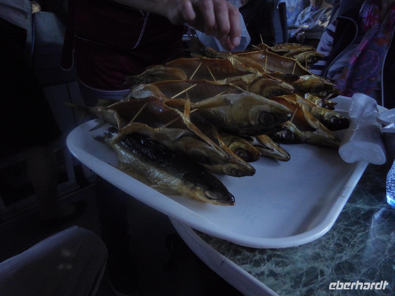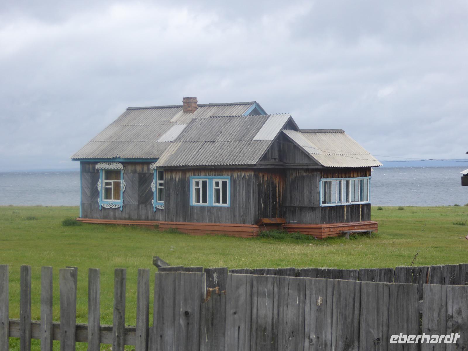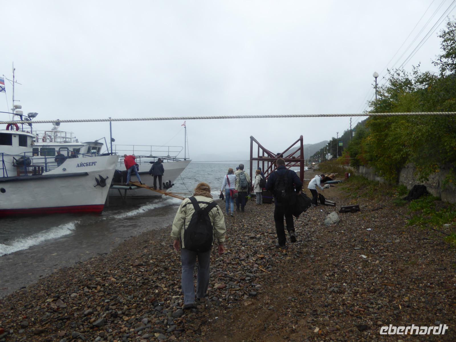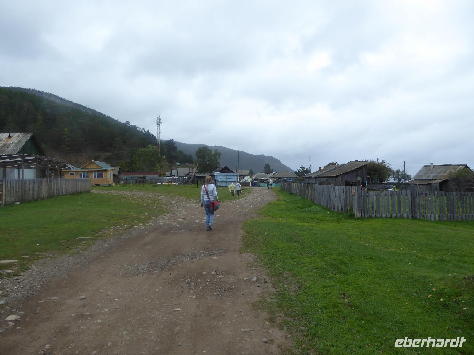 Wer will mit zum Fischmarkt? Fragt Tanja. Fast alle sind dabei. Erwartet wird ein kleiner Spaziergang endend in einem großen Erlebnis. Der Nieselregen ist fies. Bald sind wir durchnässt. Nach einer halben Stunde regt sich der erste Protest. Tanja, wie weit noch? Noch zehn Minuten... Tanjas zehn Minuten. Wir kommen am Fischmarkt an. Kaum jemand ist dort. Kein Wetter für Markt. Nur ein paar wenige Frau bieten Fisch an, ein Mann beschäftigt sich damit, einen eisernen Ofen anzufeuern. Tanja ruft Taxis für den Rückweg. Ein bisschen Zeit, sich frisch zu machen und unser Gepäck wird vom Zimmer abgeholt. Mit dem Taxi fahren wir zum Hafen. Über eine Leiter müssen wir unser Gepäck balancieren, die Männer übernehmen das bravourös. Die EISBERG, so heißt unser Schiff, wird uns in fünf Stunden über den Baikalsee nach Bolschoje Goloustnoje bringen. Kaum sind alle Passagiere und alle Koffer an Bord, beginnt unsere abenteuerliche Seefahrt. Die Wellen sind recht hoch und unser Schiffchen wackelt bedenklich. Jeder muss eine Rettungsweste anziehen, anschließend bekommen wir Decken, denn es ist doch recht kalt. Der Tisch wird gedeckt. Schwarzbrot und Brötchen, Butter und Käse, Wurst, Sardinen in Tomatensoße. Dazu Tee. Tanja kocht und deckt unermüdlich den Tisch. Wir lassen es uns schmecken. Den ersten Stopp legen wir an der Bucht der Großen Katze bzw. Fischfalle ein. Tanja erklärt uns die einheimische Tierwelt. Nach zehn Minuten Fußweg ist ein Dorf zu sehen. Zwischen uns und dem Dorf ein Fluss. Zu breit und zu kalt, um ihn ohne Brücke zu überqueren, denn die ist kaputt. Wir laufen am Flussbett entlang und finden eine richtige steinerne Brücke. So gelangen wir ins Dorf. Freilaufende Pferde erwecken unsere Aufmerksamkeit. Sie sind zutraulich und erwarten Futter. Im Konsum kaufen wir Brot und Wodka. Das Brot für die Pferde, den Wodka für uns. Zurück an Bord gibt es den warm geräucherten Omul, den Tanja für uns auf dem Fischmarkt eingekauft hat. Im Pribalski Naturreservat legen wir den zweiten Stopp ein. Eine Stunde haben wir Zeit, zu wandern, die Natur zu genießen und uns an den Blümchen zu erfreuen. Aber erst will der Rancher die Erlaubnis sehen, die wir haben, um den Park zu besuchen. Auf dem Rückweg fordert der Baikalsee uns alles ab. Das Wasser klatscht in hohem Bogen ins Schiff. Rucksäcke, Hosen und viele Füße sind nass. Es stürmt und unser Schiff ist dem Willen der Natur ausgeliefert und wir damit auch. Trotzdem wird niemand seekrank. Wir sind froh als wir pünktlich in Bolschoje Golustnoje ankommen. Soja erwartet uns mit einem Auto, in das das ganze Gepäck passen soll. Wir bezweifeln das, werden aber eines Besseren belehrt. Das Gepäck fährt, wir laufen. In zwanzig Minuten erreichen wir Gasthaus Nummer 1. Galina ist die Gastgeberin. Sechs Gäste und Tanja bleiben hier. Die anderen laufen zehn Minuten weiter zum Gasthaus Nummer 2. Dieses gehört Soja, das Nachbarhaus ihrer Tochter Anna. Die Banja ist geheizt. Wir nehmen uns die Zeit, uns mit Birkenzweigen zu malträtieren und lernen, wie entspannend das ist. Wolodja, der Sohn von Anna bringt die Gäste von Haus Nummer 2 nach Haus Nummer 1, denn dort gibt es Abendessen. Bei einem Stopp am Magasin kaufen wir Wodka, um uns den Abend zu versüßen. Zum Abendessen gibt es Krautsalat, Reisbrei und einen Fleischklops. Und viel Wodka. Später fährt Wolodja die Gäste von Haus Nummer 2 zurück. Gute Nacht.
