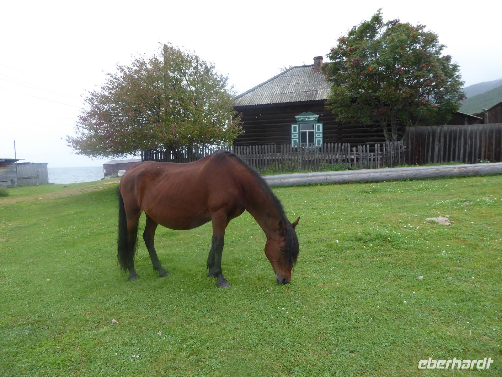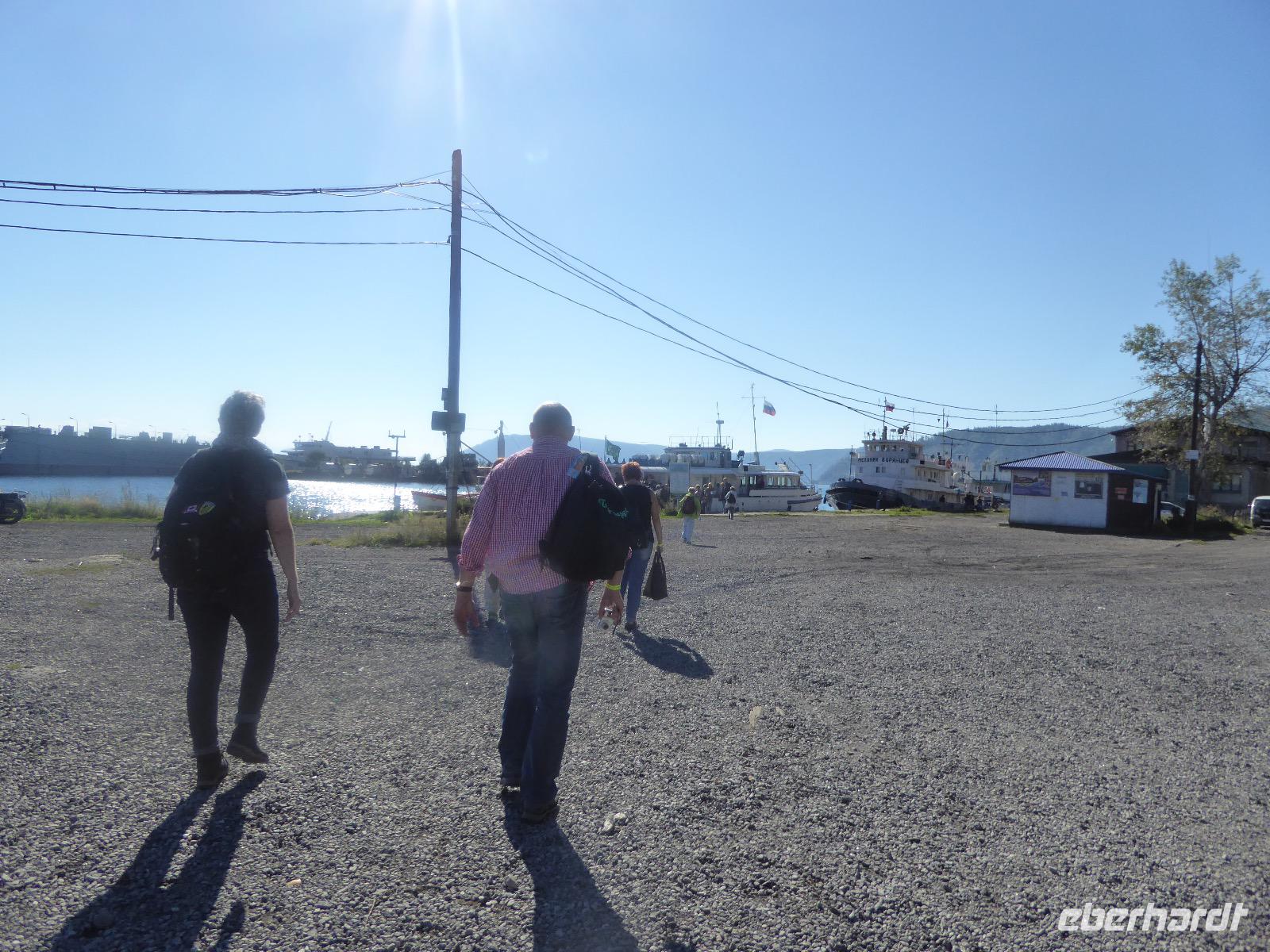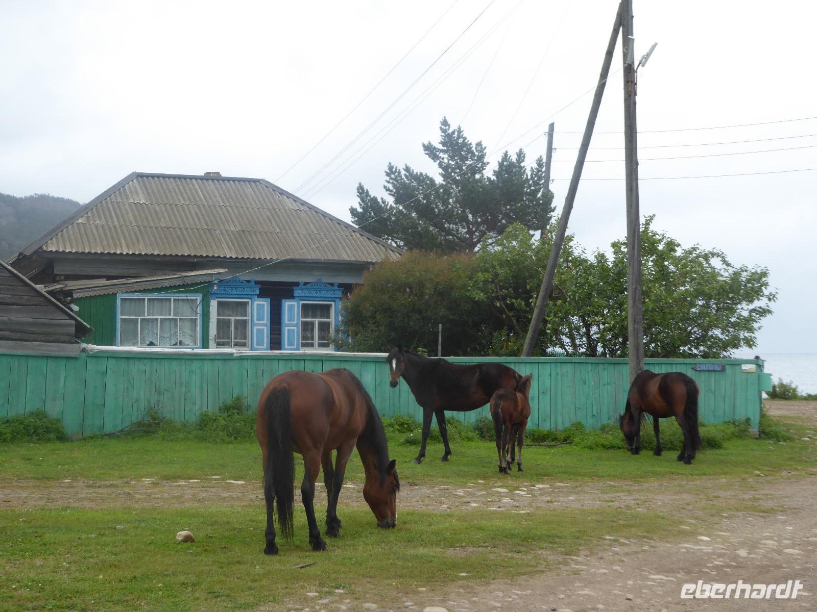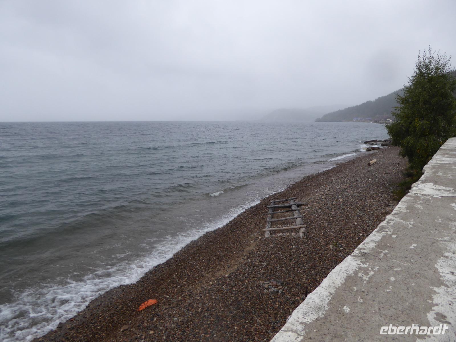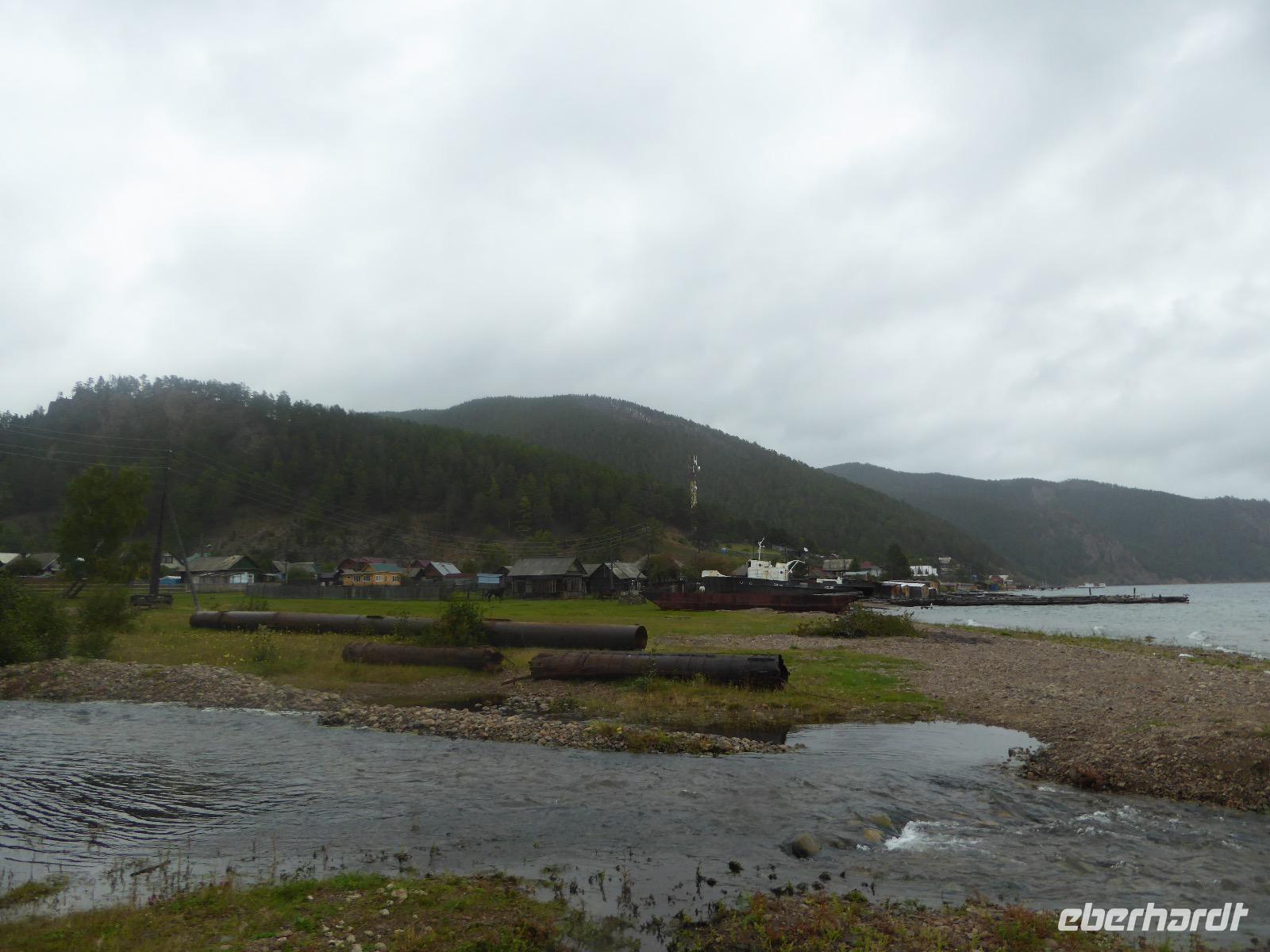Wer will mit zum Fischmarkt? Fragt Tanja. Fast alle sind dabei. Erwartet wird ein kleiner Spaziergang endend in einem großen Erlebnis. Der Nieselregen ist fies. Bald sind wir durchnässt. Nach einer halben Stunde regt sich der erste Protest. Tanja, wie weit noch? Noch zehn Minuten... Tanjas zehn Minuten. Wir kommen am Fischmarkt an. Kaum jemand ist dort. Kein Wetter für Markt. Nur ein paar wenige Frau bieten Fisch an, ein Mann beschäftigt sich damit, einen eisernen Ofen anzufeuern. Tanja ruft Taxis für den Rückweg. Ein bisschen Zeit, sich frisch zu machen und unser Gepäck wird vom Zimmer abgeholt. Mit dem Taxi fahren wir zum Hafen. Über eine Leiter müssen wir unser Gepäck balancieren, die Männer übernehmen das bravourös. Die EISBERG, so heißt unser Schiff, wird uns in fünf Stunden über den Baikalsee nach Bolschoje Goloustnoje bringen. Kaum sind alle Passagiere und alle Koffer an Bord, beginnt unsere abenteuerliche Seefahrt. Die Wellen sind recht hoch und unser Schiffchen wackelt bedenklich. Jeder muss eine Rettungsweste anziehen, anschließend bekommen wir Decken, denn es ist doch recht kalt. Der Tisch wird gedeckt. Schwarzbrot und Brötchen, Butter und Käse, Wurst, Sardinen in Tomatensoße. Dazu Tee. Tanja kocht und deckt unermüdlich den Tisch. Wir lassen es uns schmecken. Den ersten Stopp legen wir an der Bucht der Großen Katze bzw. Fischfalle ein. Tanja erklärt uns die einheimische Tierwelt. Nach zehn Minuten Fußweg ist ein Dorf zu sehen. Zwischen uns und dem Dorf ein Fluss. Zu breit und zu kalt, um ihn ohne Brücke zu überqueren, denn die ist kaputt. Wir laufen am Flussbett entlang und finden eine richtige steinerne Brücke. So gelangen wir ins Dorf. Freilaufende Pferde erwecken unsere Aufmerksamkeit. Sie sind zutraulich und erwarten Futter. Im Konsum kaufen wir Brot und Wodka. Das Brot für die Pferde, den Wodka für uns. Zurück an Bord gibt es den warm geräucherten Omul, den Tanja für uns auf dem Fischmarkt eingekauft hat. Im Pribalski Naturreservat legen wir den zweiten Stopp ein. Eine Stunde haben wir Zeit, zu wandern, die Natur zu genießen und uns an den Blümchen zu erfreuen. Aber erst will der Rancher die Erlaubnis sehen, die wir haben, um den Park zu besuchen. Auf dem Rückweg fordert der Baikalsee uns alles ab. Das Wasser klatscht in hohem Bogen ins Schiff. Rucksäcke, Hosen und viele Füße sind nass. Es stürmt und unser Schiff ist dem Willen der Natur ausgeliefert und wir damit auch. Trotzdem wird niemand seekrank. Wir sind froh als wir pünktlich in Bolschoje Golustnoje ankommen. Soja erwartet uns mit einem Auto, in das das ganze Gepäck passen soll. Wir bezweifeln das, werden aber eines Besseren belehrt. Das Gepäck fährt, wir laufen. In zwanzig Minuten erreichen wir Gasthaus Nummer 1. Galina ist die Gastgeberin. Sechs Gäste und Tanja bleiben hier. Die anderen laufen zehn Minuten weiter zum Gasthaus Nummer 2. Dieses gehört Soja, das Nachbarhaus ihrer Tochter Anna. Die Banja ist geheizt. Wir nehmen uns die Zeit, uns mit Birkenzweigen zu malträtieren und lernen, wie entspannend das ist. Wolodja, der Sohn von Anna bringt die Gäste von Haus Nummer 2 nach Haus Nummer 1, denn dort gibt es Abendessen. Bei einem Stopp am Magasin kaufen wir Wodka, um uns den Abend zu versüßen. Zum Abendessen gibt es Krautsalat, Reisbrei und einen Fleischklops. Und viel Wodka. Später fährt Wolodja die Gäste von Haus Nummer 2 zurück. Gute Nacht.