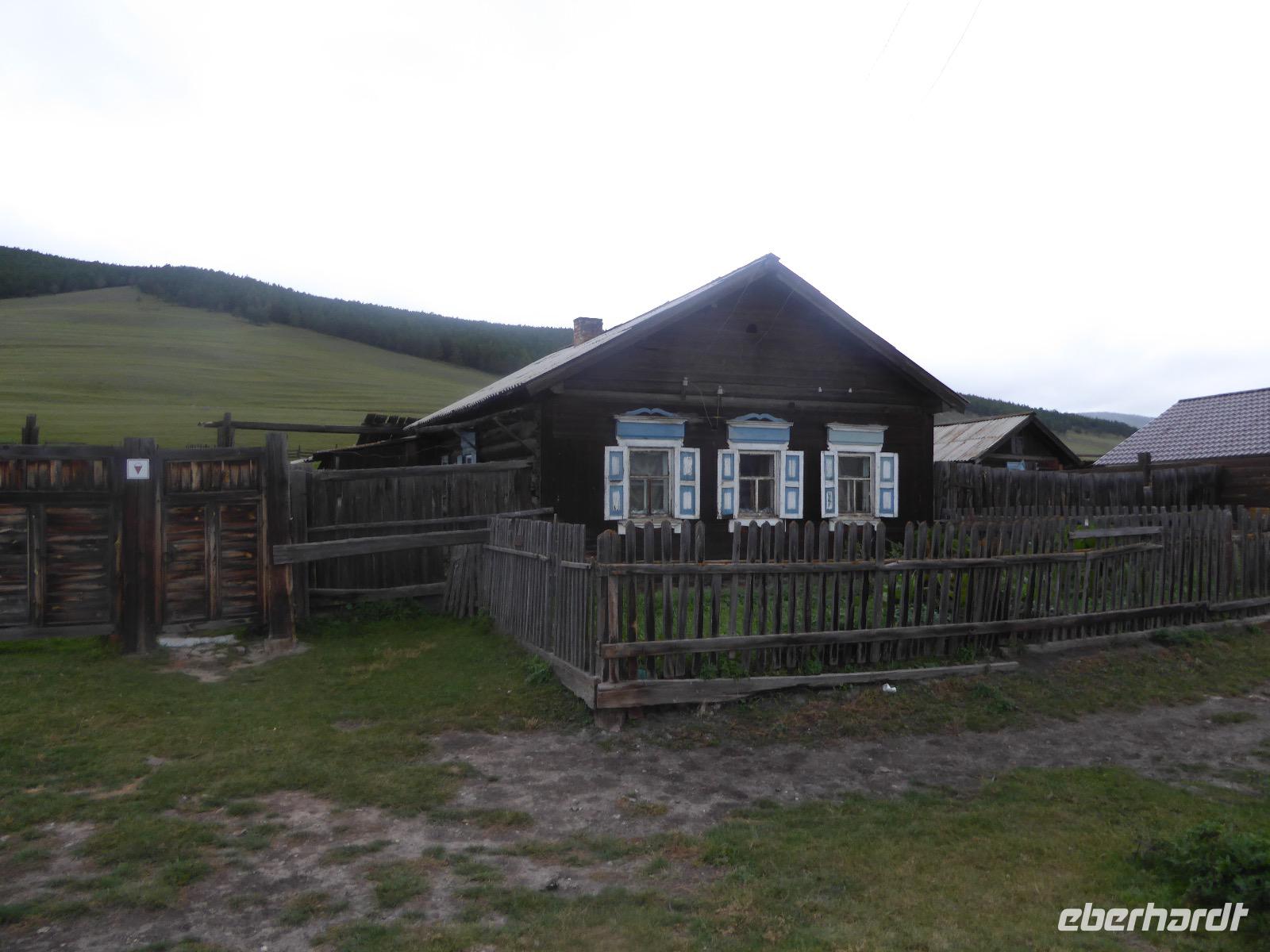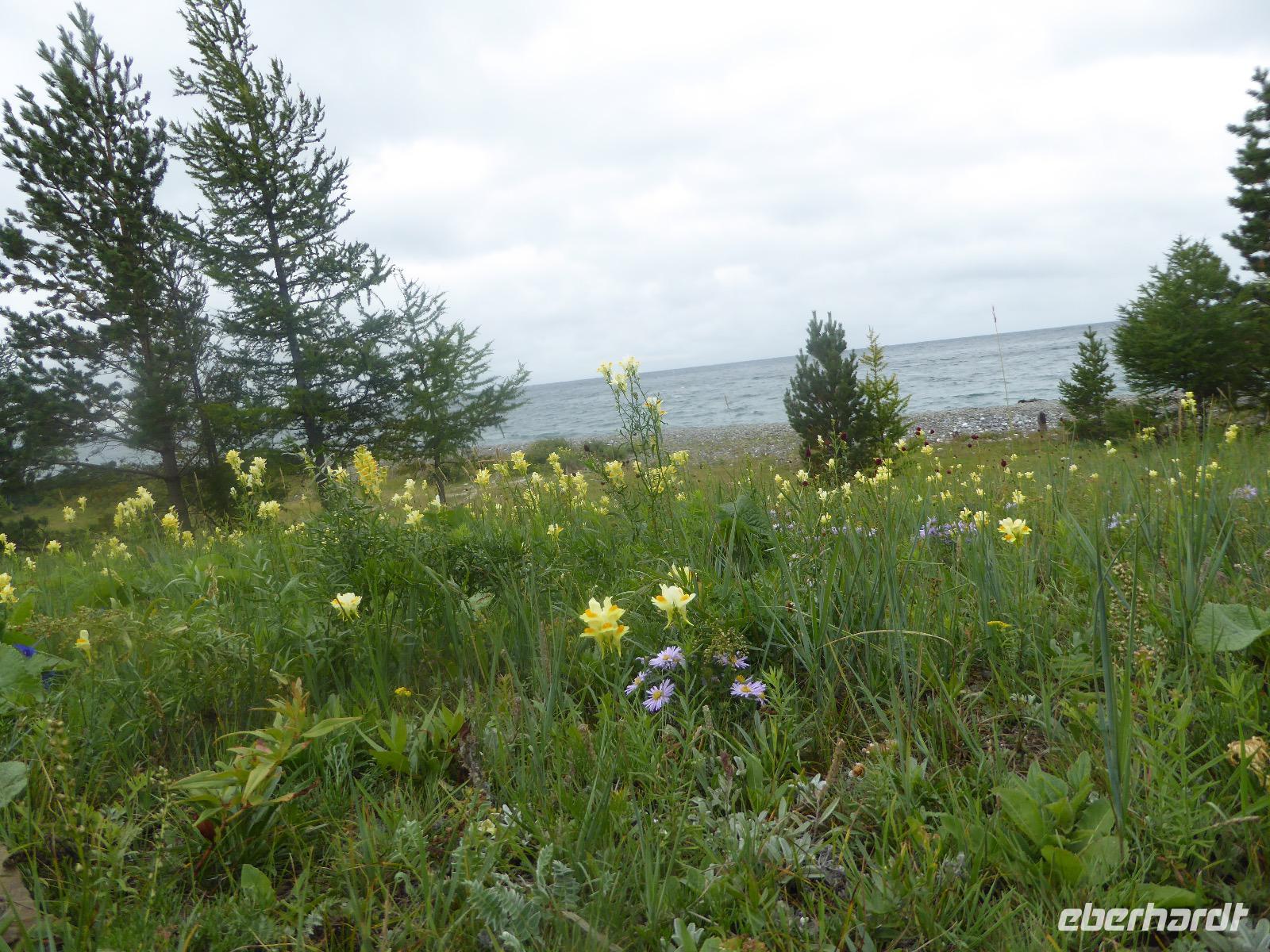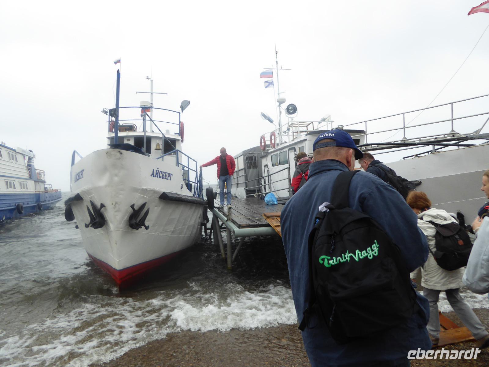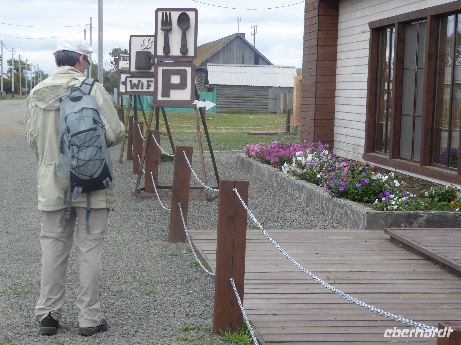 Wer will mit zum Fischmarkt? Fragt Tanja. Fast alle sind dabei. Erwartet wird ein kleiner Spaziergang endend in einem großen Erlebnis. Der Nieselregen ist fies. Bald sind wir durchnässt. Nach einer halben Stunde regt sich der erste Protest. Tanja, wie weit noch? Noch zehn Minuten... Tanjas zehn Minuten. Wir kommen am Fischmarkt an. Kaum jemand ist dort. Kein Wetter für Markt. Nur ein paar wenige Frau bieten Fisch an, ein Mann beschäftigt sich damit, einen eisernen Ofen anzufeuern. Tanja ruft Taxis für den Rückweg. Ein bisschen Zeit, sich frisch zu machen und unser Gepäck wird vom Zimmer abgeholt. Mit dem Taxi fahren wir zum Hafen. Über eine Leiter müssen wir unser Gepäck balancieren, die Männer übernehmen das bravourös. Die EISBERG, so heißt unser Schiff, wird uns in fünf Stunden über den Baikalsee nach Bolschoje Goloustnoje bringen. Kaum sind alle Passagiere und alle Koffer an Bord, beginnt unsere abenteuerliche Seefahrt. Die Wellen sind recht hoch und unser Schiffchen wackelt bedenklich. Jeder muss eine Rettungsweste anziehen, anschließend bekommen wir Decken, denn es ist doch recht kalt. Der Tisch wird gedeckt. Schwarzbrot und Brötchen, Butter und Käse, Wurst, Sardinen in Tomatensoße. Dazu Tee. Tanja kocht und deckt unermüdlich den Tisch. Wir lassen es uns schmecken. Den ersten Stopp legen wir an der Bucht der Großen Katze bzw. Fischfalle ein. Tanja erklärt uns die einheimische Tierwelt. Nach zehn Minuten Fußweg ist ein Dorf zu sehen. Zwischen uns und dem Dorf ein Fluss. Zu breit und zu kalt, um ihn ohne Brücke zu überqueren, denn die ist kaputt. Wir laufen am Flussbett entlang und finden eine richtige steinerne Brücke. So gelangen wir ins Dorf. Freilaufende Pferde erwecken unsere Aufmerksamkeit. Sie sind zutraulich und erwarten Futter. Im Konsum kaufen wir Brot und Wodka. Das Brot für die Pferde, den Wodka für uns. Zurück an Bord gibt es den warm geräucherten Omul, den Tanja für uns auf dem Fischmarkt eingekauft hat. Im Pribalski Naturreservat legen wir den zweiten Stopp ein. Eine Stunde haben wir Zeit, zu wandern, die Natur zu genießen und uns an den Blümchen zu erfreuen. Aber erst will der Rancher die Erlaubnis sehen, die wir haben, um den Park zu besuchen. Auf dem Rückweg fordert der Baikalsee uns alles ab. Das Wasser klatscht in hohem Bogen ins Schiff. Rucksäcke, Hosen und viele Füße sind nass. Es stürmt und unser Schiff ist dem Willen der Natur ausgeliefert und wir damit auch. Trotzdem wird niemand seekrank. Wir sind froh als wir pünktlich in Bolschoje Golustnoje ankommen. Soja erwartet uns mit einem Auto, in das das ganze Gepäck passen soll. Wir bezweifeln das, werden aber eines Besseren belehrt. Das Gepäck fährt, wir laufen. In zwanzig Minuten erreichen wir Gasthaus Nummer 1. Galina ist die Gastgeberin. Sechs Gäste und Tanja bleiben hier. Die anderen laufen zehn Minuten weiter zum Gasthaus Nummer 2. Dieses gehört Soja, das Nachbarhaus ihrer Tochter Anna. Die Banja ist geheizt. Wir nehmen uns die Zeit, uns mit Birkenzweigen zu malträtieren und lernen, wie entspannend das ist. Wolodja, der Sohn von Anna bringt die Gäste von Haus Nummer 2 nach Haus Nummer 1, denn dort gibt es Abendessen. Bei einem Stopp am Magasin kaufen wir Wodka, um uns den Abend zu versüßen. Zum Abendessen gibt es Krautsalat, Reisbrei und einen Fleischklops. Und viel Wodka. Später fährt Wolodja die Gäste von Haus Nummer 2 zurück. Gute Nacht.