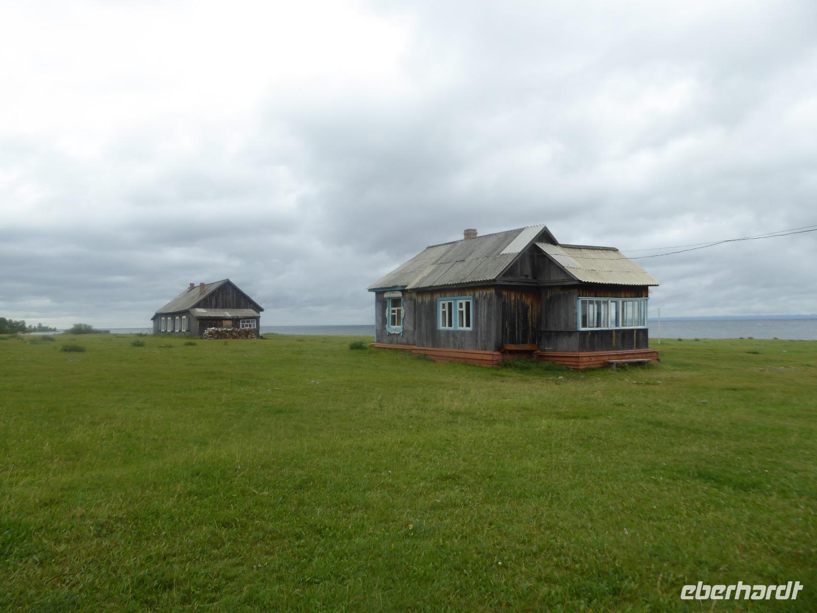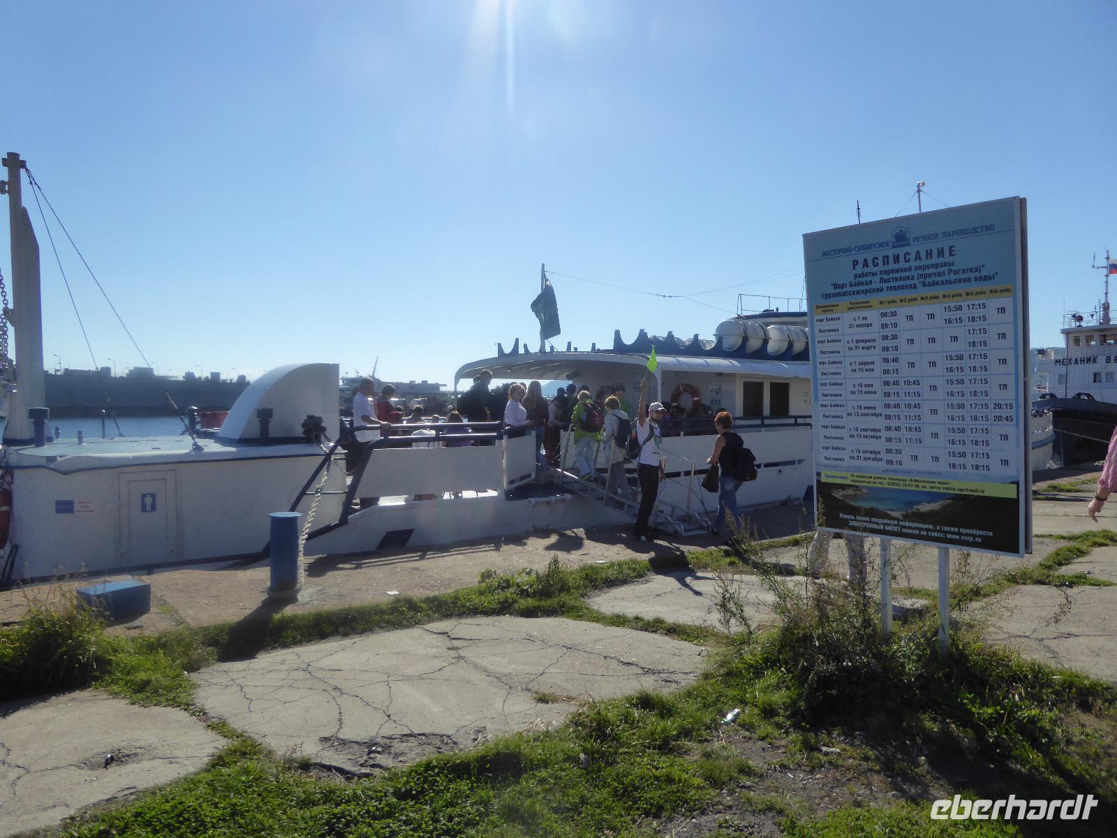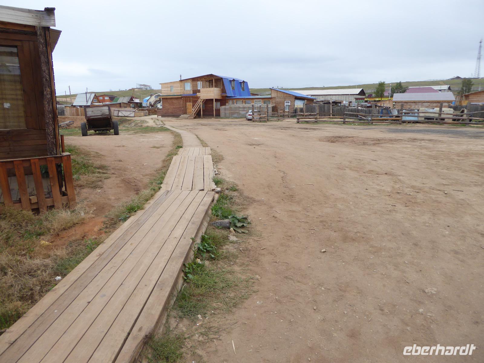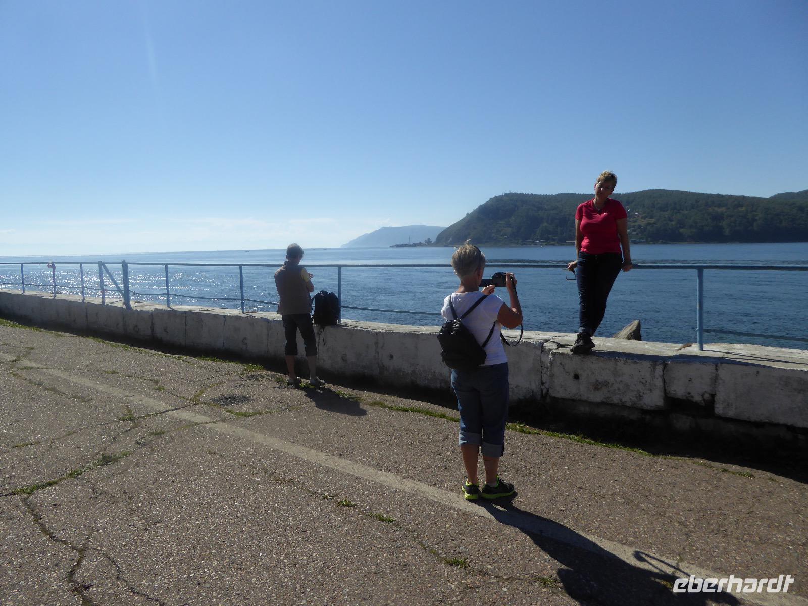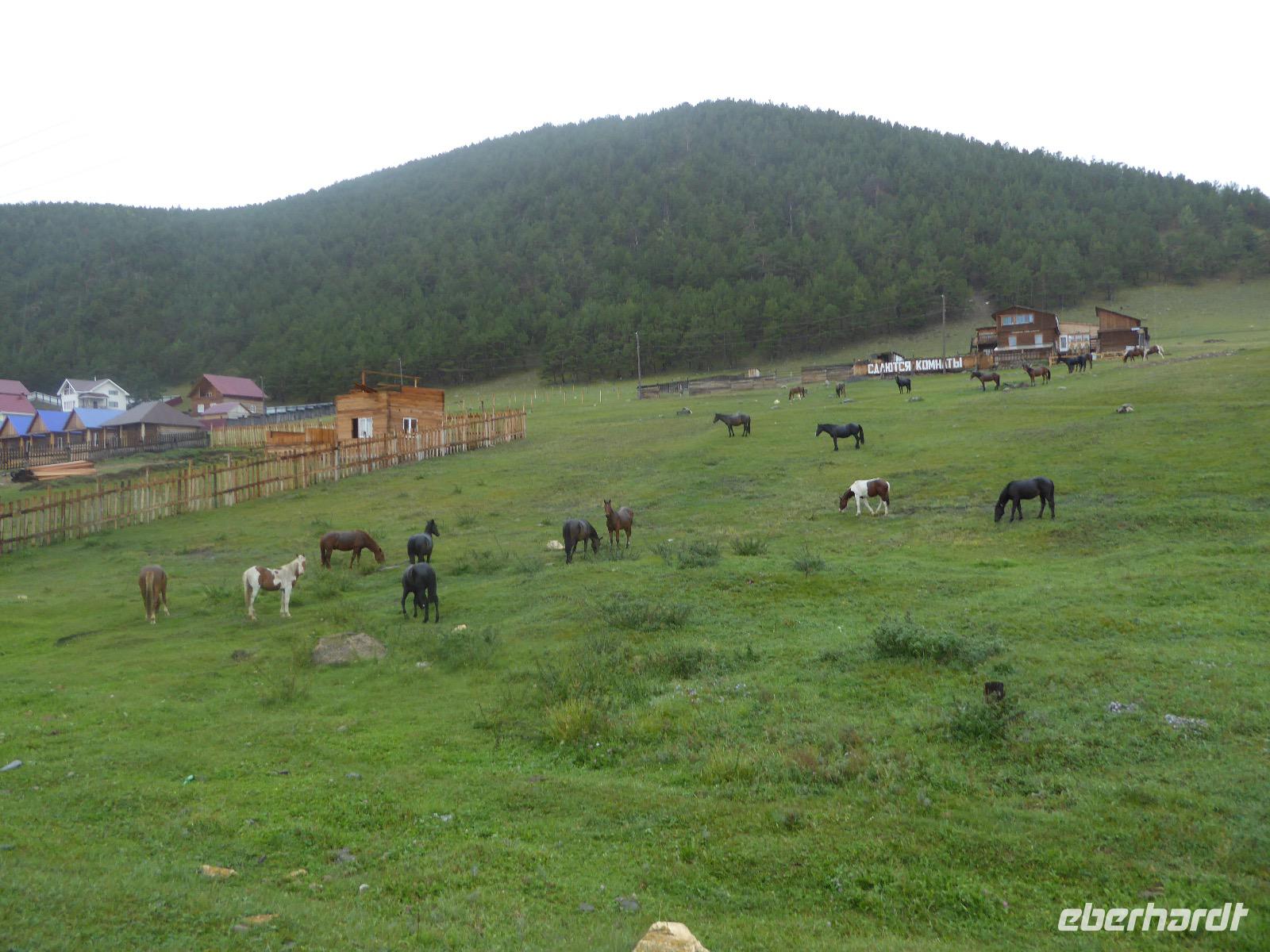 Wer will mit zum Fischmarkt? Fragt Tanja. Fast alle sind dabei. Erwartet wird ein kleiner Spaziergang endend in einem großen Erlebnis. Der Nieselregen ist fies. Bald sind wir durchnässt. Nach einer halben Stunde regt sich der erste Protest. Tanja, wie weit noch? Noch zehn Minuten... Tanjas zehn Minuten. Wir kommen am Fischmarkt an. Kaum jemand ist dort. Kein Wetter für Markt. Nur ein paar wenige Frau bieten Fisch an, ein Mann beschäftigt sich damit, einen eisernen Ofen anzufeuern. Tanja ruft Taxis für den Rückweg. Ein bisschen Zeit, sich frisch zu machen und unser Gepäck wird vom Zimmer abgeholt. Mit dem Taxi fahren wir zum Hafen. Über eine Leiter müssen wir unser Gepäck balancieren, die Männer übernehmen das bravourös. Die EISBERG, so heißt unser Schiff, wird uns in fünf Stunden über den Baikalsee nach Bolschoje Goloustnoje bringen. Kaum sind alle Passagiere und alle Koffer an Bord, beginnt unsere abenteuerliche Seefahrt. Die Wellen sind recht hoch und unser Schiffchen wackelt bedenklich. Jeder muss eine Rettungsweste anziehen, anschließend bekommen wir Decken, denn es ist doch recht kalt. Der Tisch wird gedeckt. Schwarzbrot und Brötchen, Butter und Käse, Wurst, Sardinen in Tomatensoße. Dazu Tee. Tanja kocht und deckt unermüdlich den Tisch. Wir lassen es uns schmecken. Den ersten Stopp legen wir an der Bucht der Großen Katze bzw. Fischfalle ein. Tanja erklärt uns die einheimische Tierwelt. Nach zehn Minuten Fußweg ist ein Dorf zu sehen. Zwischen uns und dem Dorf ein Fluss. Zu breit und zu kalt, um ihn ohne Brücke zu überqueren, denn die ist kaputt. Wir laufen am Flussbett entlang und finden eine richtige steinerne Brücke. So gelangen wir ins Dorf. Freilaufende Pferde erwecken unsere Aufmerksamkeit. Sie sind zutraulich und erwarten Futter. Im Konsum kaufen wir Brot und Wodka. Das Brot für die Pferde, den Wodka für uns. Zurück an Bord gibt es den warm geräucherten Omul, den Tanja für uns auf dem Fischmarkt eingekauft hat. Im Pribalski Naturreservat legen wir den zweiten Stopp ein. Eine Stunde haben wir Zeit, zu wandern, die Natur zu genießen und uns an den Blümchen zu erfreuen. Aber erst will der Rancher die Erlaubnis sehen, die wir haben, um den Park zu besuchen. Auf dem Rückweg fordert der Baikalsee uns alles ab. Das Wasser klatscht in hohem Bogen ins Schiff. Rucksäcke, Hosen und viele Füße sind nass. Es stürmt und unser Schiff ist dem Willen der Natur ausgeliefert und wir damit auch. Trotzdem wird niemand seekrank. Wir sind froh als wir pünktlich in Bolschoje Golustnoje ankommen. Soja erwartet uns mit einem Auto, in das das ganze Gepäck passen soll. Wir bezweifeln das, werden aber eines Besseren belehrt. Das Gepäck fährt, wir laufen. In zwanzig Minuten erreichen wir Gasthaus Nummer 1. Galina ist die Gastgeberin. Sechs Gäste und Tanja bleiben hier. Die anderen laufen zehn Minuten weiter zum Gasthaus Nummer 2. Dieses gehört Soja, das Nachbarhaus ihrer Tochter Anna. Die Banja ist geheizt. Wir nehmen uns die Zeit, uns mit Birkenzweigen zu malträtieren und lernen, wie entspannend das ist. Wolodja, der Sohn von Anna bringt die Gäste von Haus Nummer 2 nach Haus Nummer 1, denn dort gibt es Abendessen. Bei einem Stopp am Magasin kaufen wir Wodka, um uns den Abend zu versüßen. Zum Abendessen gibt es Krautsalat, Reisbrei und einen Fleischklops. Und viel Wodka. Später fährt Wolodja die Gäste von Haus Nummer 2 zurück. Gute Nacht.