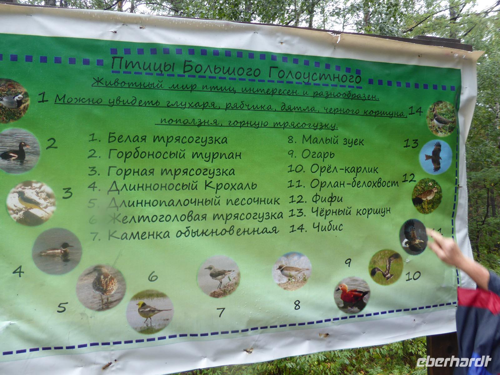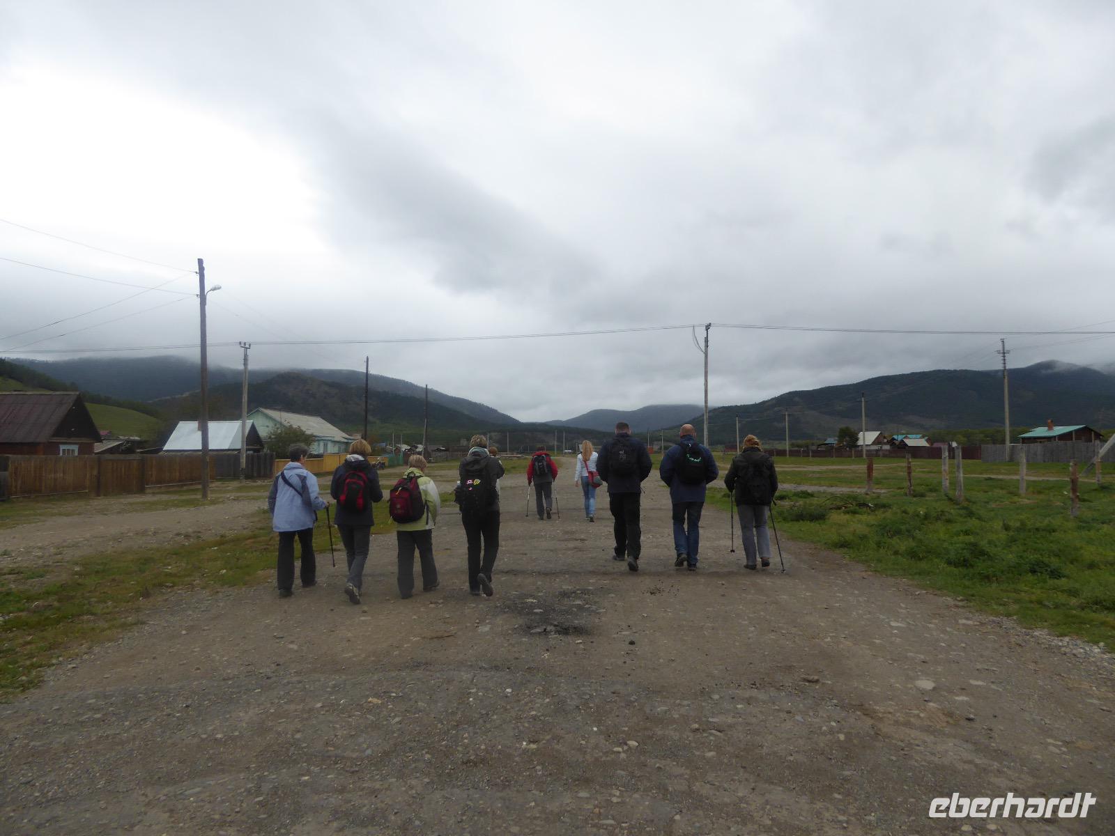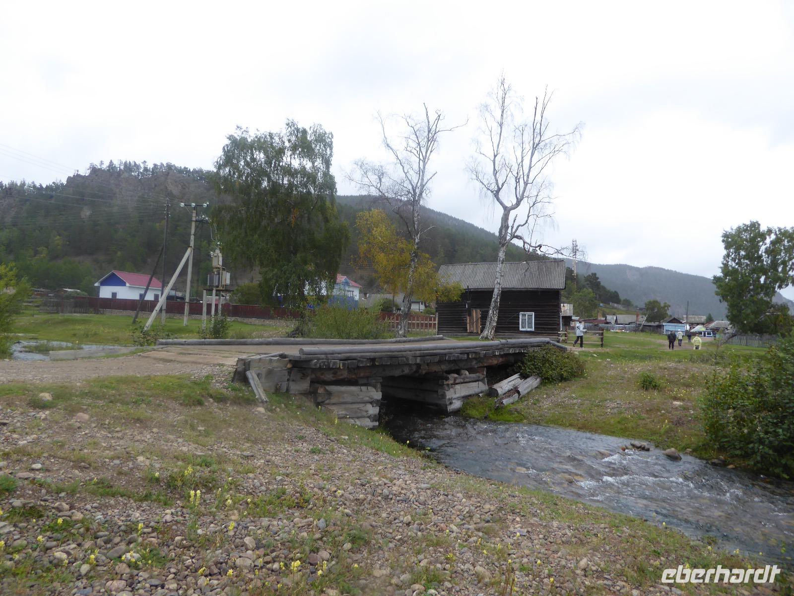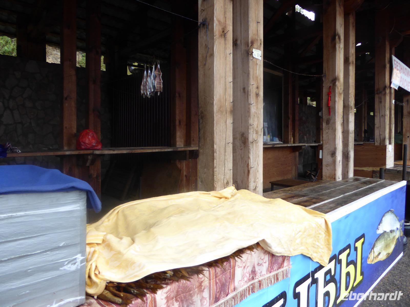 Wer will mit zum Fischmarkt? Fragt Tanja. Fast alle sind dabei. Erwartet wird ein kleiner Spaziergang endend in einem großen Erlebnis. Der Nieselregen ist fies. Bald sind wir durchnässt. Nach einer halben Stunde regt sich der erste Protest. Tanja, wie weit noch? Noch zehn Minuten... Tanjas zehn Minuten. Wir kommen am Fischmarkt an. Kaum jemand ist dort. Kein Wetter für Markt. Nur ein paar wenige Frau bieten Fisch an, ein Mann beschäftigt sich damit, einen eisernen Ofen anzufeuern. Tanja ruft Taxis für den Rückweg. Ein bisschen Zeit, sich frisch zu machen und unser Gepäck wird vom Zimmer abgeholt. Mit dem Taxi fahren wir zum Hafen. Über eine Leiter müssen wir unser Gepäck balancieren, die Männer übernehmen das bravourös. Die EISBERG, so heißt unser Schiff, wird uns in fünf Stunden über den Baikalsee nach Bolschoje Goloustnoje bringen. Kaum sind alle Passagiere und alle Koffer an Bord, beginnt unsere abenteuerliche Seefahrt. Die Wellen sind recht hoch und unser Schiffchen wackelt bedenklich. Jeder muss eine Rettungsweste anziehen, anschließend bekommen wir Decken, denn es ist doch recht kalt. Der Tisch wird gedeckt. Schwarzbrot und Brötchen, Butter und Käse, Wurst, Sardinen in Tomatensoße. Dazu Tee. Tanja kocht und deckt unermüdlich den Tisch. Wir lassen es uns schmecken. Den ersten Stopp legen wir an der Bucht der Großen Katze bzw. Fischfalle ein. Tanja erklärt uns die einheimische Tierwelt. Nach zehn Minuten Fußweg ist ein Dorf zu sehen. Zwischen uns und dem Dorf ein Fluss. Zu breit und zu kalt, um ihn ohne Brücke zu überqueren, denn die ist kaputt. Wir laufen am Flussbett entlang und finden eine richtige steinerne Brücke. So gelangen wir ins Dorf. Freilaufende Pferde erwecken unsere Aufmerksamkeit. Sie sind zutraulich und erwarten Futter. Im Konsum kaufen wir Brot und Wodka. Das Brot für die Pferde, den Wodka für uns. Zurück an Bord gibt es den warm geräucherten Omul, den Tanja für uns auf dem Fischmarkt eingekauft hat. Im Pribalski Naturreservat legen wir den zweiten Stopp ein. Eine Stunde haben wir Zeit, zu wandern, die Natur zu genießen und uns an den Blümchen zu erfreuen. Aber erst will der Rancher die Erlaubnis sehen, die wir haben, um den Park zu besuchen. Auf dem Rückweg fordert der Baikalsee uns alles ab. Das Wasser klatscht in hohem Bogen ins Schiff. Rucksäcke, Hosen und viele Füße sind nass. Es stürmt und unser Schiff ist dem Willen der Natur ausgeliefert und wir damit auch. Trotzdem wird niemand seekrank. Wir sind froh als wir pünktlich in Bolschoje Golustnoje ankommen. Soja erwartet uns mit einem Auto, in das das ganze Gepäck passen soll. Wir bezweifeln das, werden aber eines Besseren belehrt. Das Gepäck fährt, wir laufen. In zwanzig Minuten erreichen wir Gasthaus Nummer 1. Galina ist die Gastgeberin. Sechs Gäste und Tanja bleiben hier. Die anderen laufen zehn Minuten weiter zum Gasthaus Nummer 2. Dieses gehört Soja, das Nachbarhaus ihrer Tochter Anna. Die Banja ist geheizt. Wir nehmen uns die Zeit, uns mit Birkenzweigen zu malträtieren und lernen, wie entspannend das ist. Wolodja, der Sohn von Anna bringt die Gäste von Haus Nummer 2 nach Haus Nummer 1, denn dort gibt es Abendessen. Bei einem Stopp am Magasin kaufen wir Wodka, um uns den Abend zu versüßen. Zum Abendessen gibt es Krautsalat, Reisbrei und einen Fleischklops. Und viel Wodka. Später fährt Wolodja die Gäste von Haus Nummer 2 zurück. Gute Nacht.