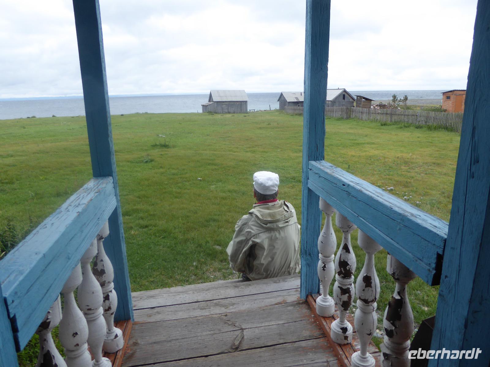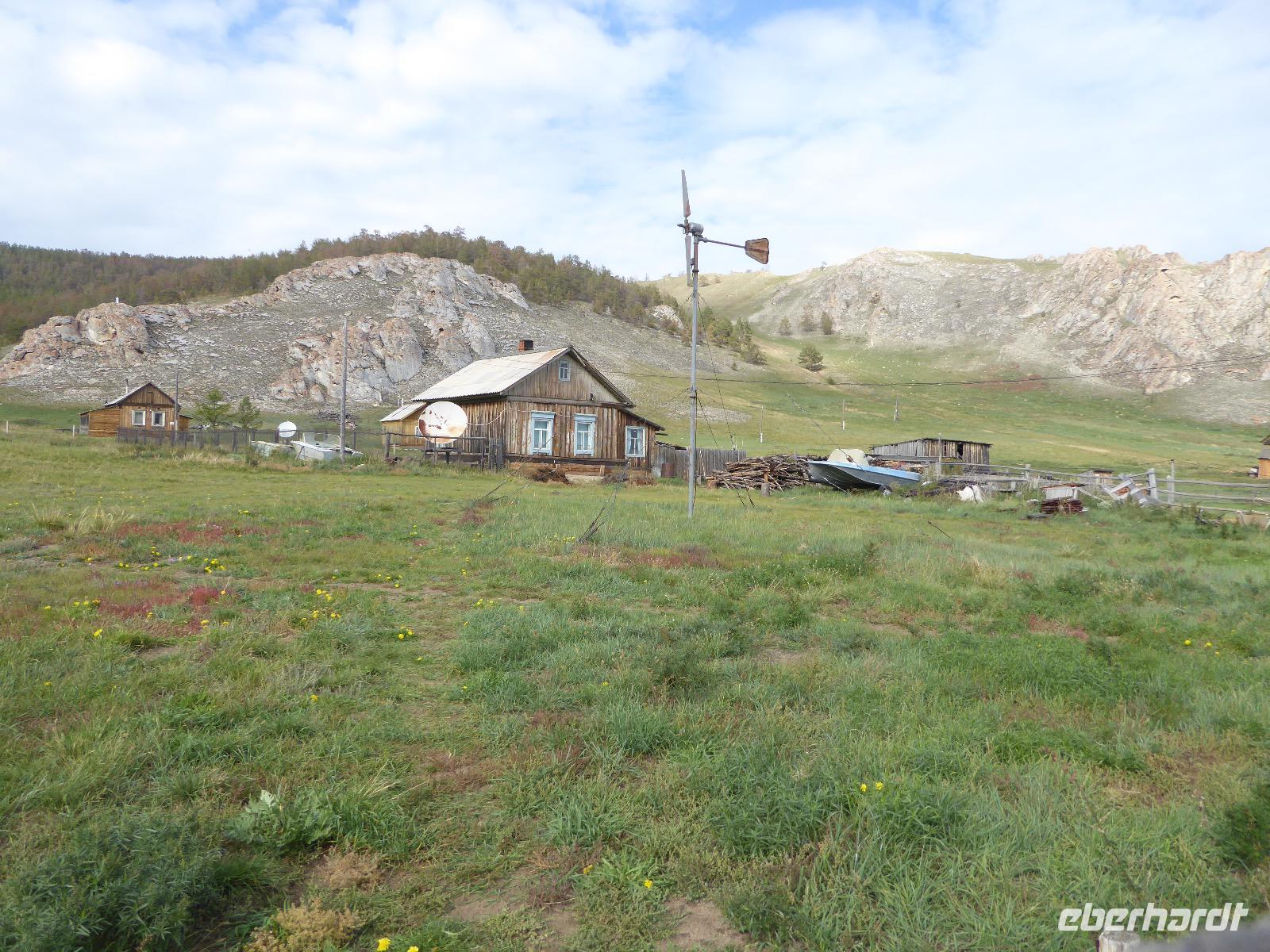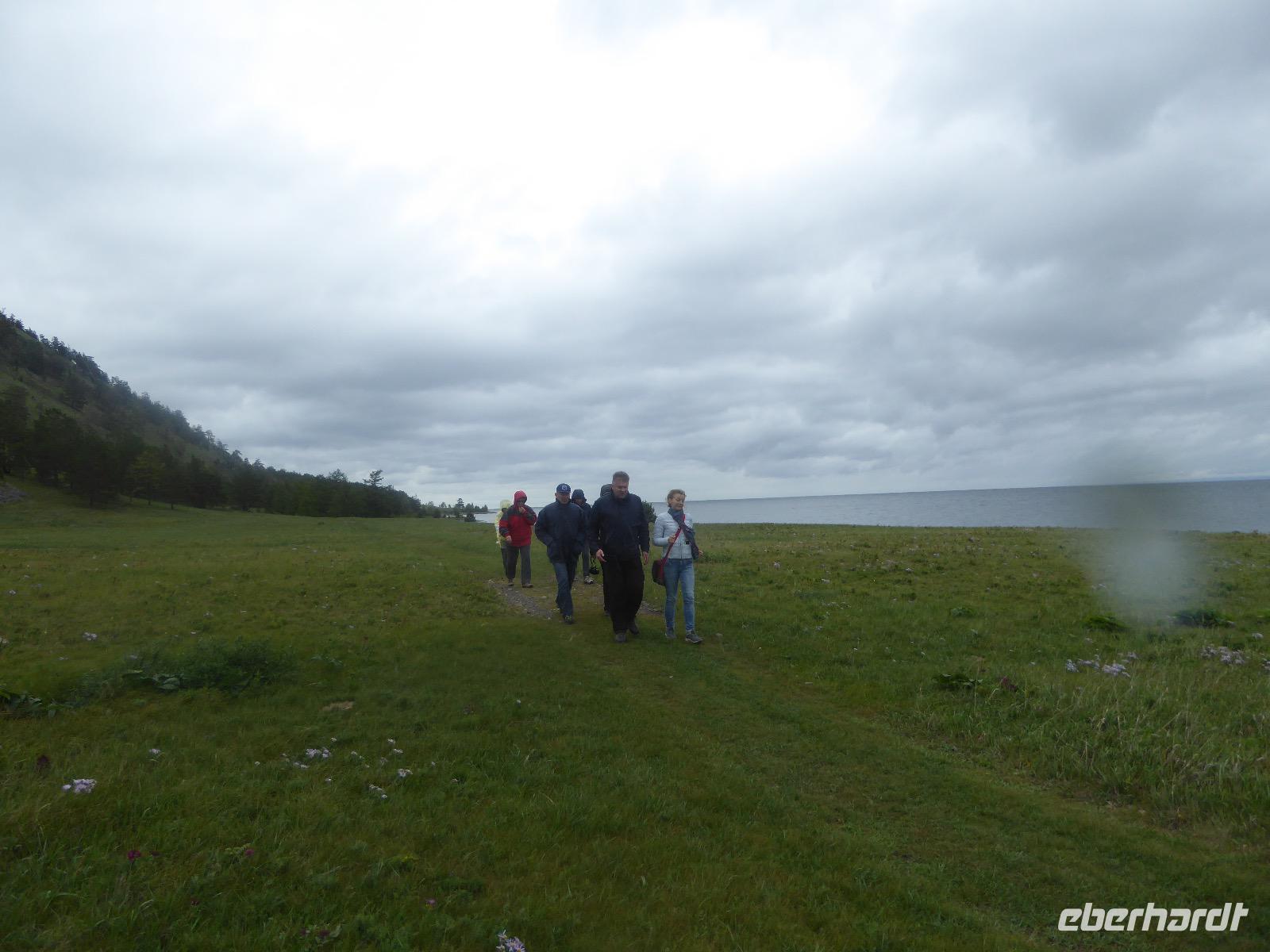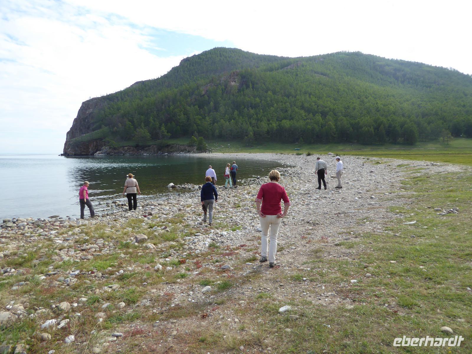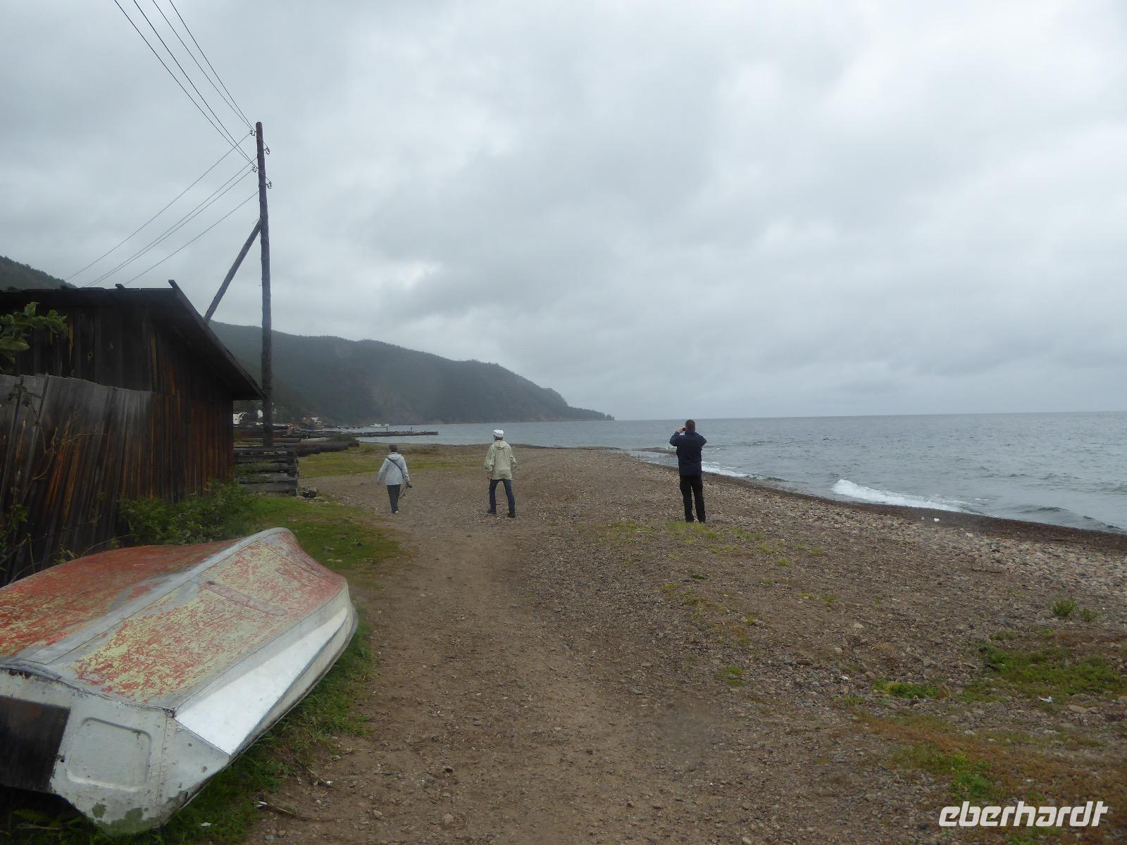 Am Abend haben wir festgelegt, wer wann das Bad benutzen darf. Das klappt prima. Frühstück gibt's um acht. Rührei mit Brokkoli, Brot, Honig mit Preiselbeeren. Um zehn treffen die Bewohner von Gasthaus 1 in Gasthaus 2 ein. Gemeinsam wandern wir zum Weisheitsfelsen. Eine Zeit lang geht es die Straße entlang, dann den Berg hinauf. Steil. Nach einer Stunde erreichen wir ein Fleckchen unterhalb des Gipfels. Weiter höher hinauf trauen sich nur Peter und Christine, es ist noch steiler und vor allem rutschig. Soja und Tanja erzählen Geschichten von der Entstehung des Dorfes. Dann geht es wieder bergab. Wir spazieren durch das Dorf, vorbei am Magasin und am Bäcker. Mittagessen gibt es in den Gasthäusern. Borstsch, Omul, Gurke und Tomate. Den Nachmittag verbringen wir mit einem Spaziergang am Baikalsee. Bei Michail kehren wir ein, hier gibt es WIFI und leckeren Kräutertee. Galina bereitet das Abendessen vor. Pelmeni, Omul und Wodka.