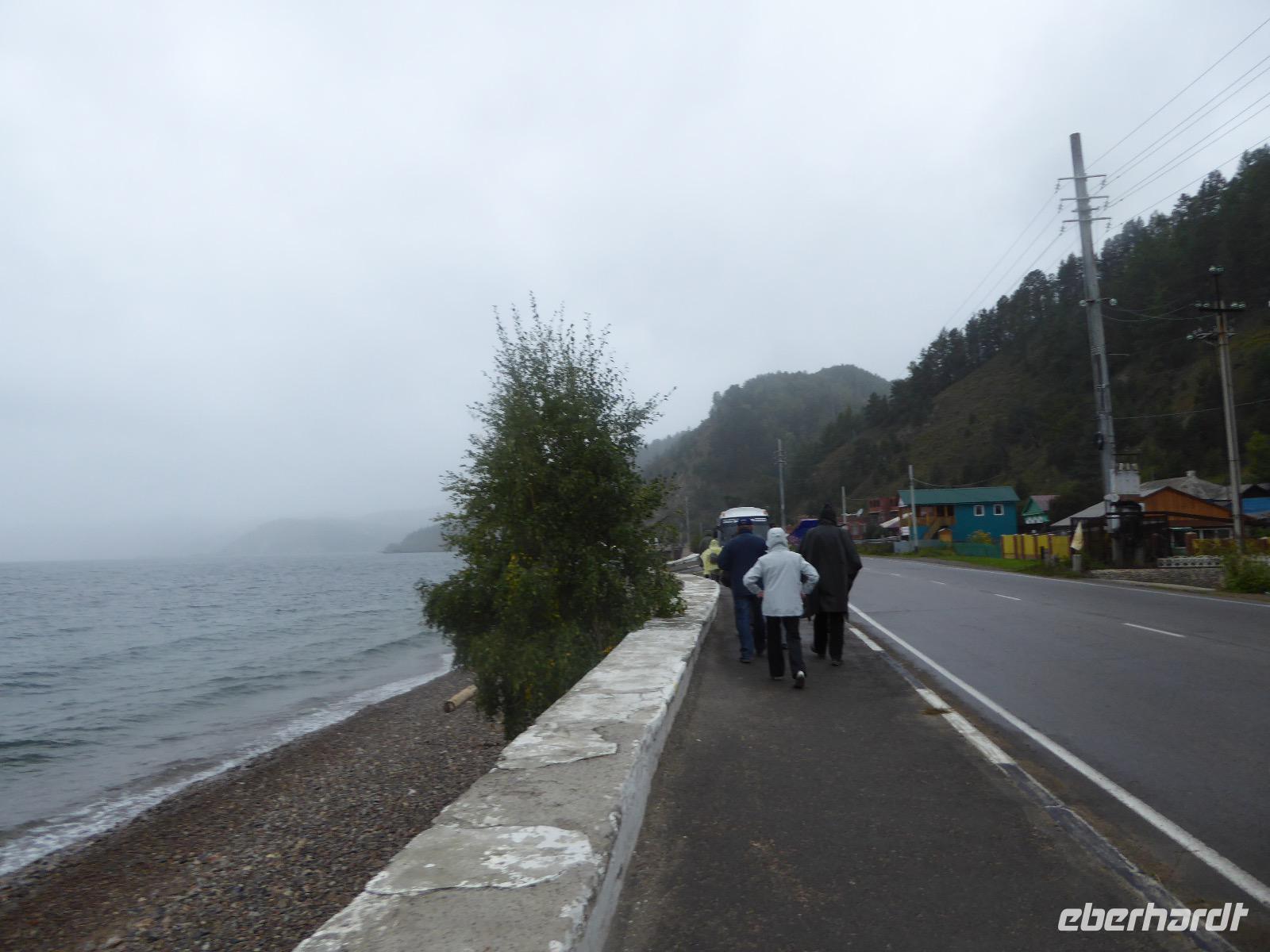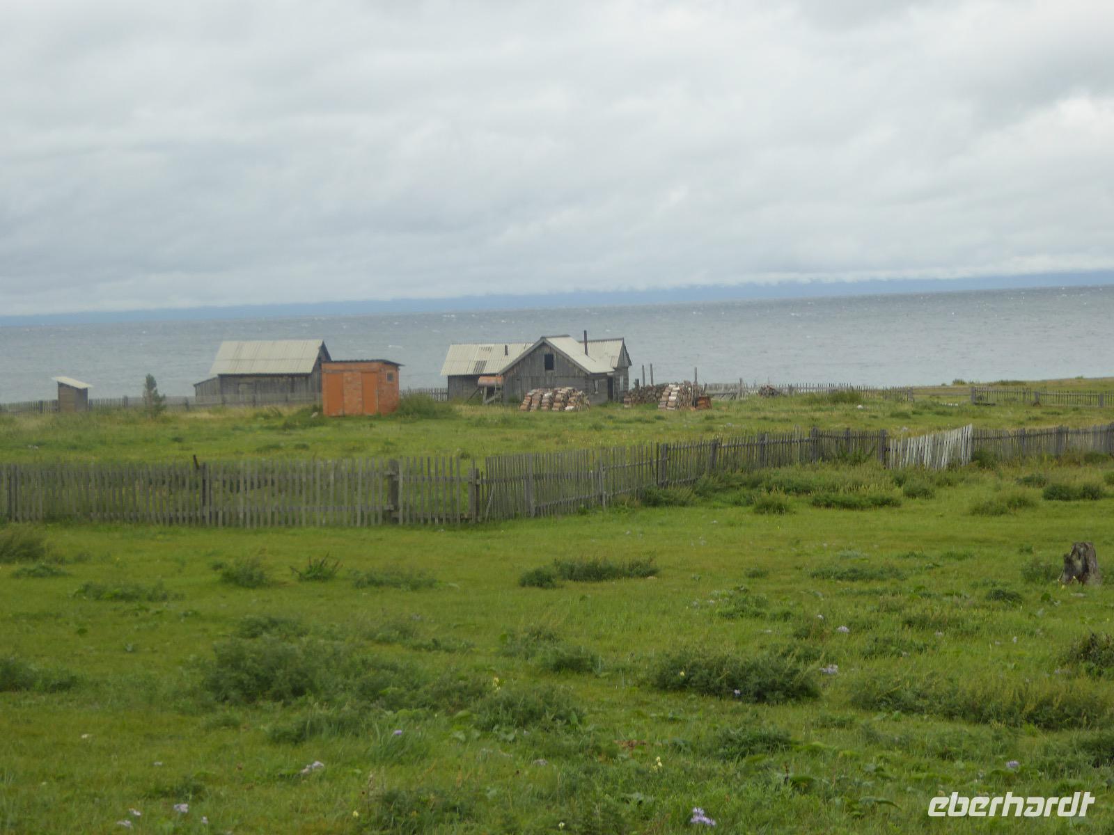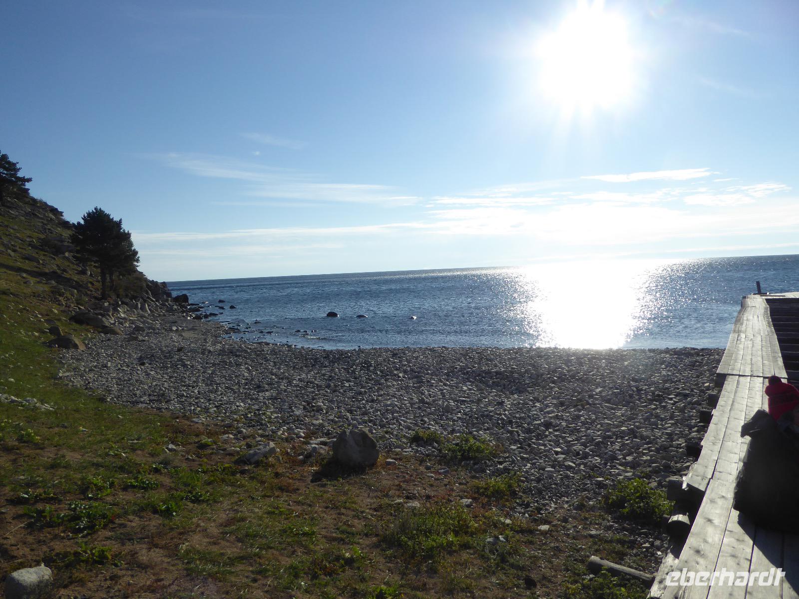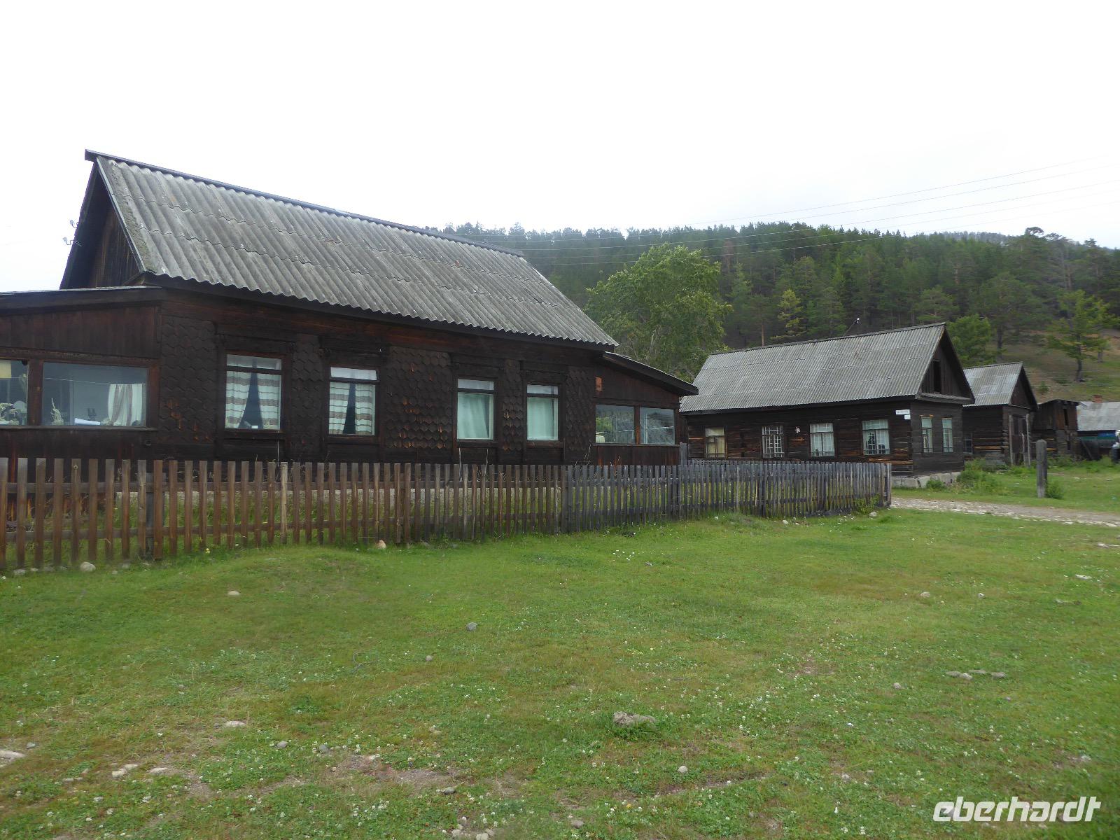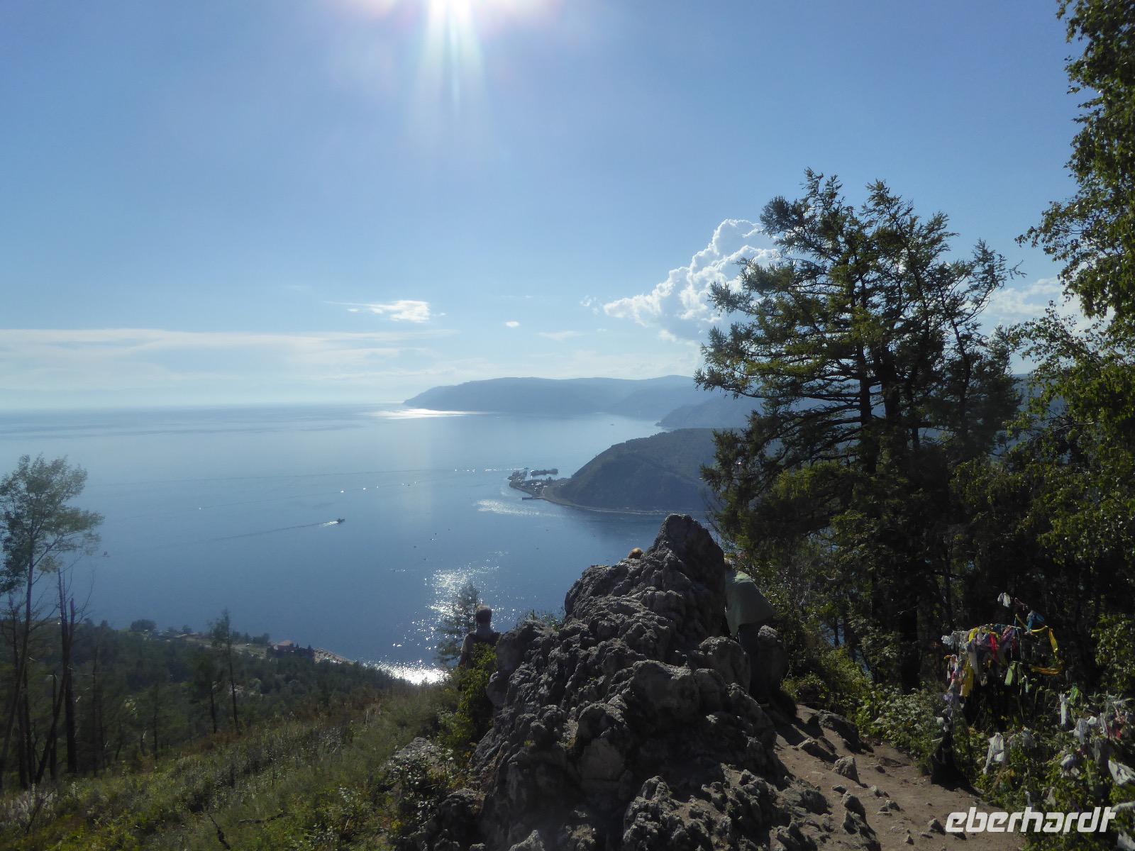 Am Abend haben wir festgelegt, wer wann das Bad benutzen darf. Das klappt prima. Frühstück gibt's um acht. Rührei mit Brokkoli, Brot, Honig mit Preiselbeeren. Um zehn treffen die Bewohner von Gasthaus 1 in Gasthaus 2 ein. Gemeinsam wandern wir zum Weisheitsfelsen. Eine Zeit lang geht es die Straße entlang, dann den Berg hinauf. Steil. Nach einer Stunde erreichen wir ein Fleckchen unterhalb des Gipfels. Weiter höher hinauf trauen sich nur Peter und Christine, es ist noch steiler und vor allem rutschig. Soja und Tanja erzählen Geschichten von der Entstehung des Dorfes. Dann geht es wieder bergab. Wir spazieren durch das Dorf, vorbei am Magasin und am Bäcker. Mittagessen gibt es in den Gasthäusern. Borstsch, Omul, Gurke und Tomate. Den Nachmittag verbringen wir mit einem Spaziergang am Baikalsee. Bei Michail kehren wir ein, hier gibt es WIFI und leckeren Kräutertee. Galina bereitet das Abendessen vor. Pelmeni, Omul und Wodka.