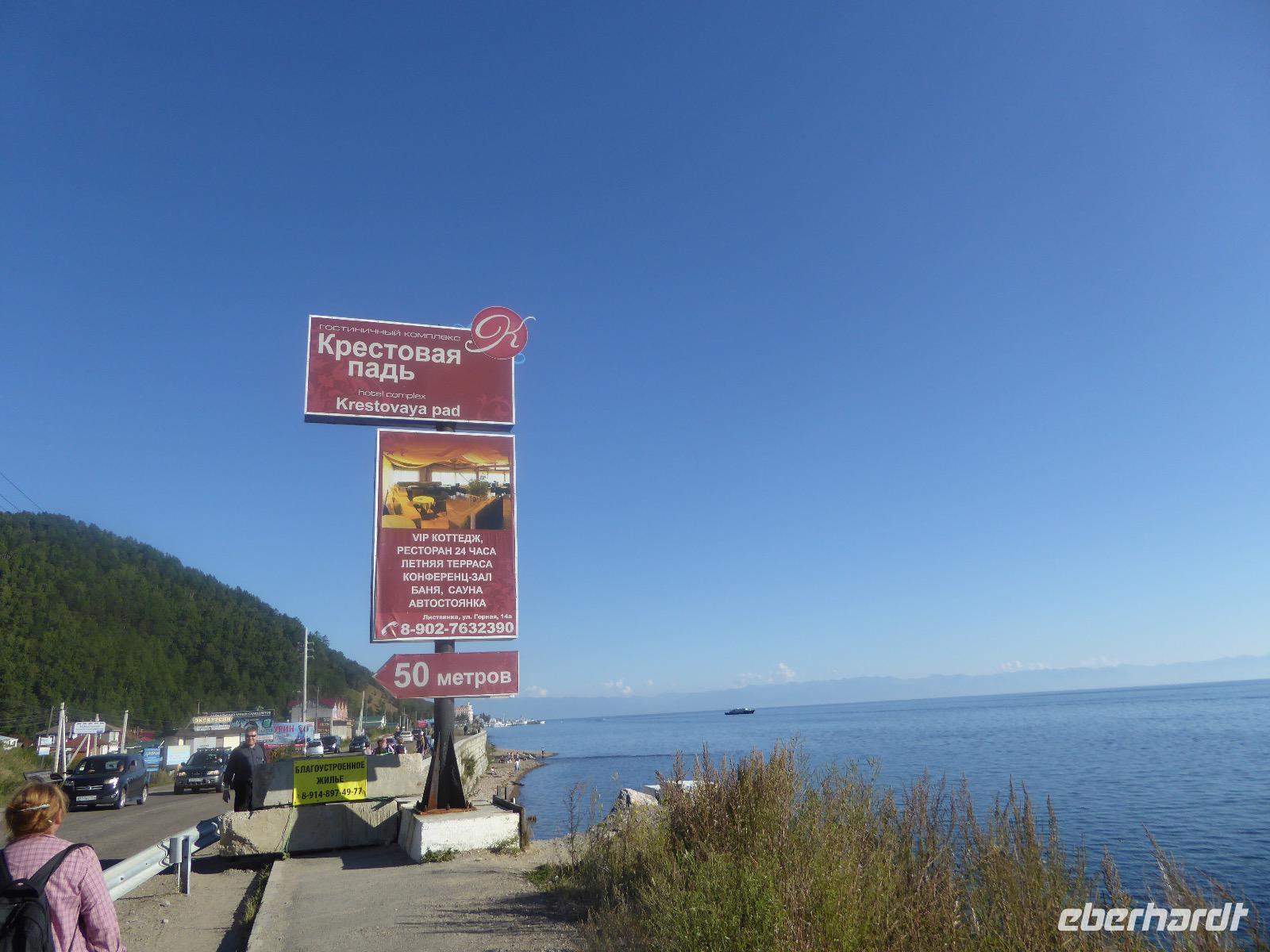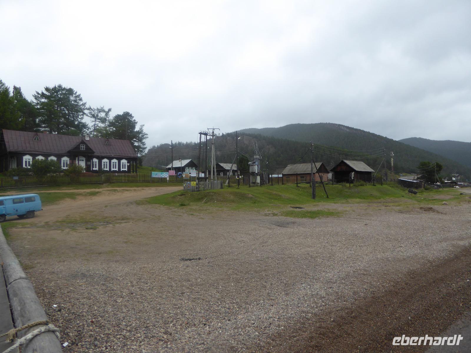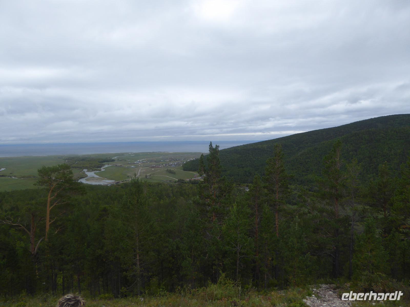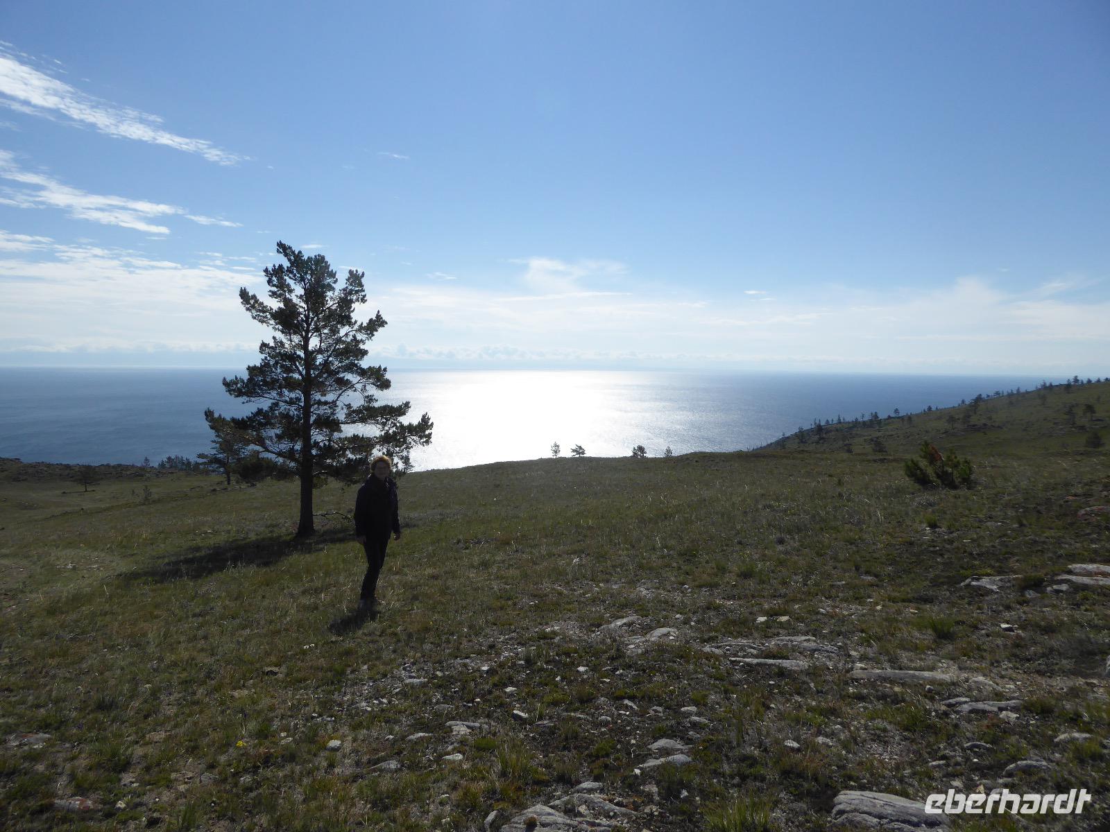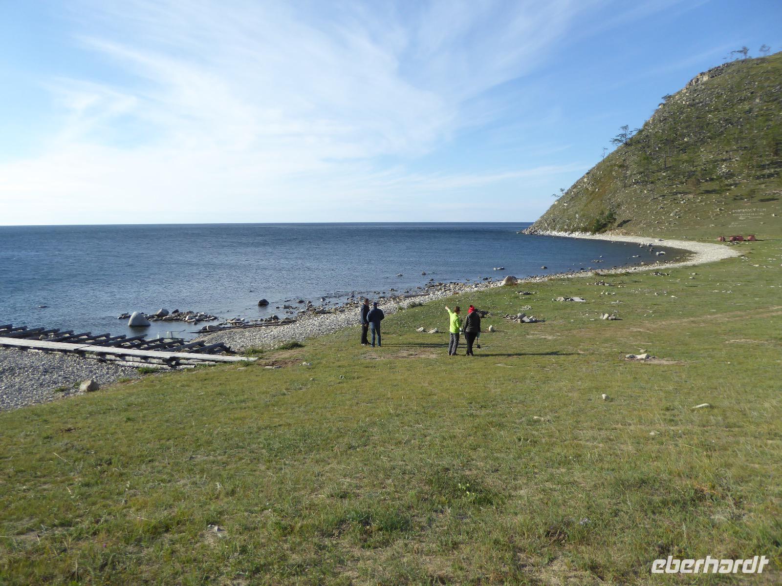 Am Abend haben wir festgelegt, wer wann das Bad benutzen darf. Das klappt prima. Frühstück gibt's um acht. Rührei mit Brokkoli, Brot, Honig mit Preiselbeeren. Um zehn treffen die Bewohner von Gasthaus 1 in Gasthaus 2 ein. Gemeinsam wandern wir zum Weisheitsfelsen. Eine Zeit lang geht es die Straße entlang, dann den Berg hinauf. Steil. Nach einer Stunde erreichen wir ein Fleckchen unterhalb des Gipfels. Weiter höher hinauf trauen sich nur Peter und Christine, es ist noch steiler und vor allem rutschig. Soja und Tanja erzählen Geschichten von der Entstehung des Dorfes. Dann geht es wieder bergab. Wir spazieren durch das Dorf, vorbei am Magasin und am Bäcker. Mittagessen gibt es in den Gasthäusern. Borstsch, Omul, Gurke und Tomate. Den Nachmittag verbringen wir mit einem Spaziergang am Baikalsee. Bei Michail kehren wir ein, hier gibt es WIFI und leckeren Kräutertee. Galina bereitet das Abendessen vor. Pelmeni, Omul und Wodka.