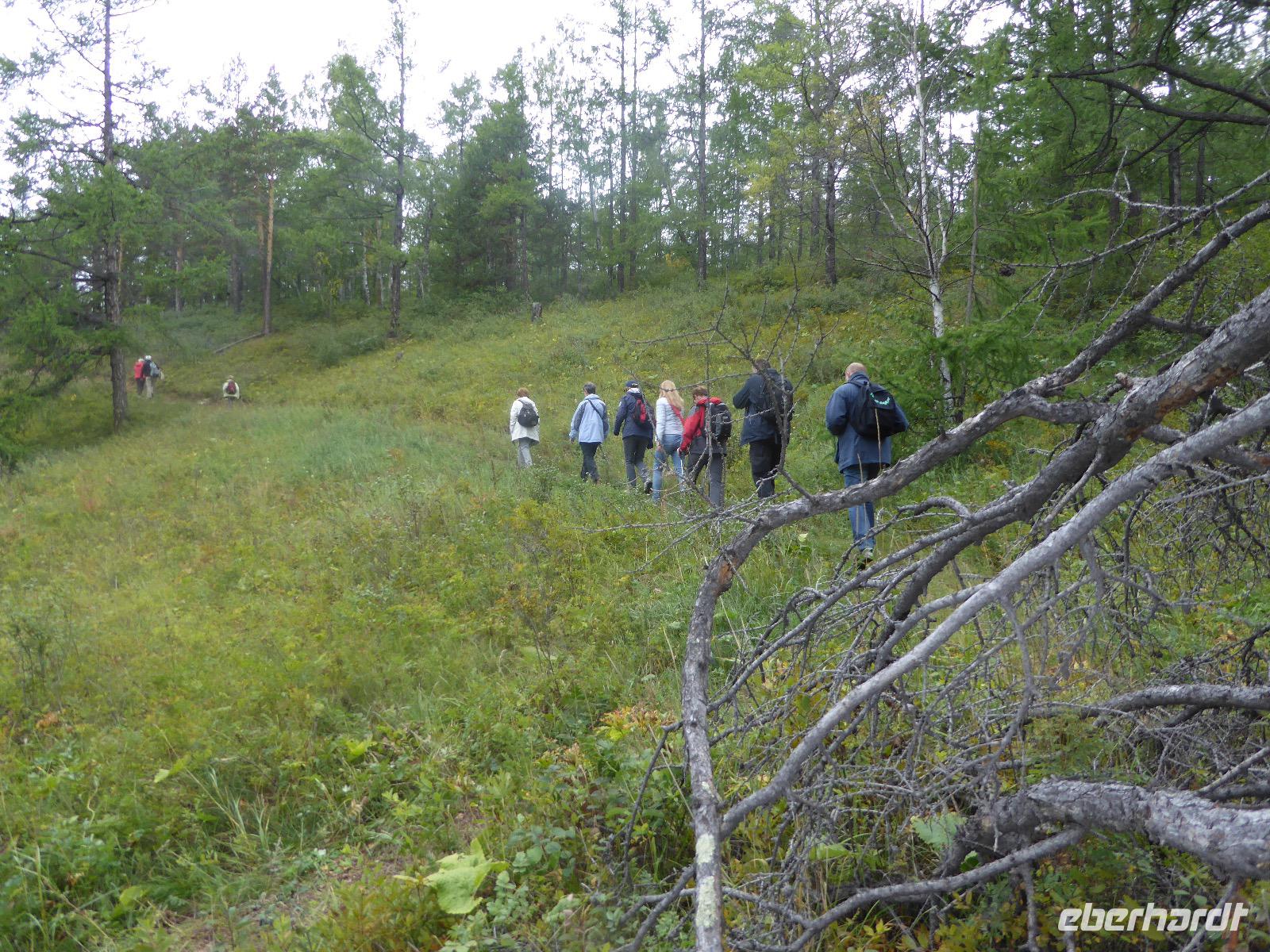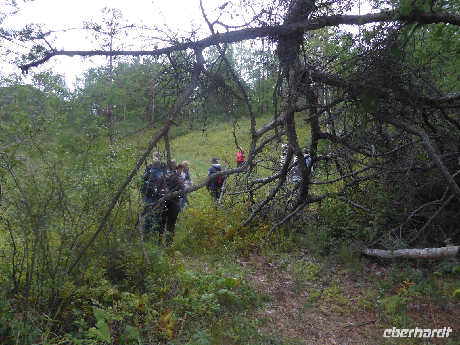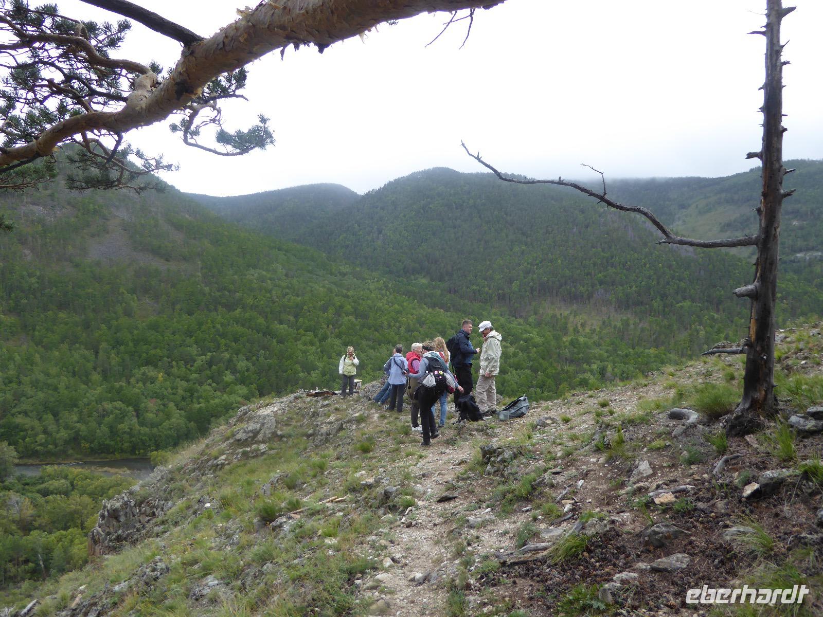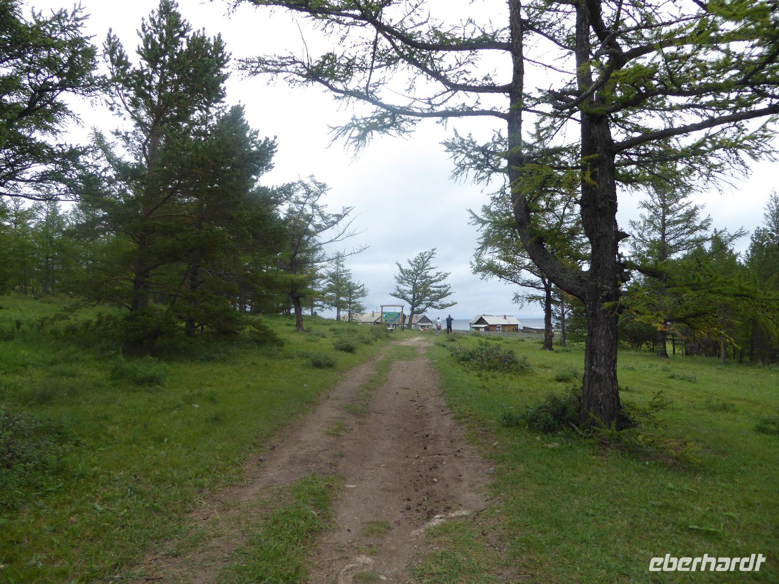 Am Abend haben wir festgelegt, wer wann das Bad benutzen darf. Das klappt prima. Frühstück gibt's um acht. Rührei mit Brokkoli, Brot, Honig mit Preiselbeeren. Um zehn treffen die Bewohner von Gasthaus 1 in Gasthaus 2 ein. Gemeinsam wandern wir zum Weisheitsfelsen. Eine Zeit lang geht es die Straße entlang, dann den Berg hinauf. Steil. Nach einer Stunde erreichen wir ein Fleckchen unterhalb des Gipfels. Weiter höher hinauf trauen sich nur Peter und Christine, es ist noch steiler und vor allem rutschig. Soja und Tanja erzählen Geschichten von der Entstehung des Dorfes. Dann geht es wieder bergab. Wir spazieren durch das Dorf, vorbei am Magasin und am Bäcker. Mittagessen gibt es in den Gasthäusern. Borstsch, Omul, Gurke und Tomate. Den Nachmittag verbringen wir mit einem Spaziergang am Baikalsee. Bei Michail kehren wir ein, hier gibt es WIFI und leckeren Kräutertee. Galina bereitet das Abendessen vor. Pelmeni, Omul und Wodka.
