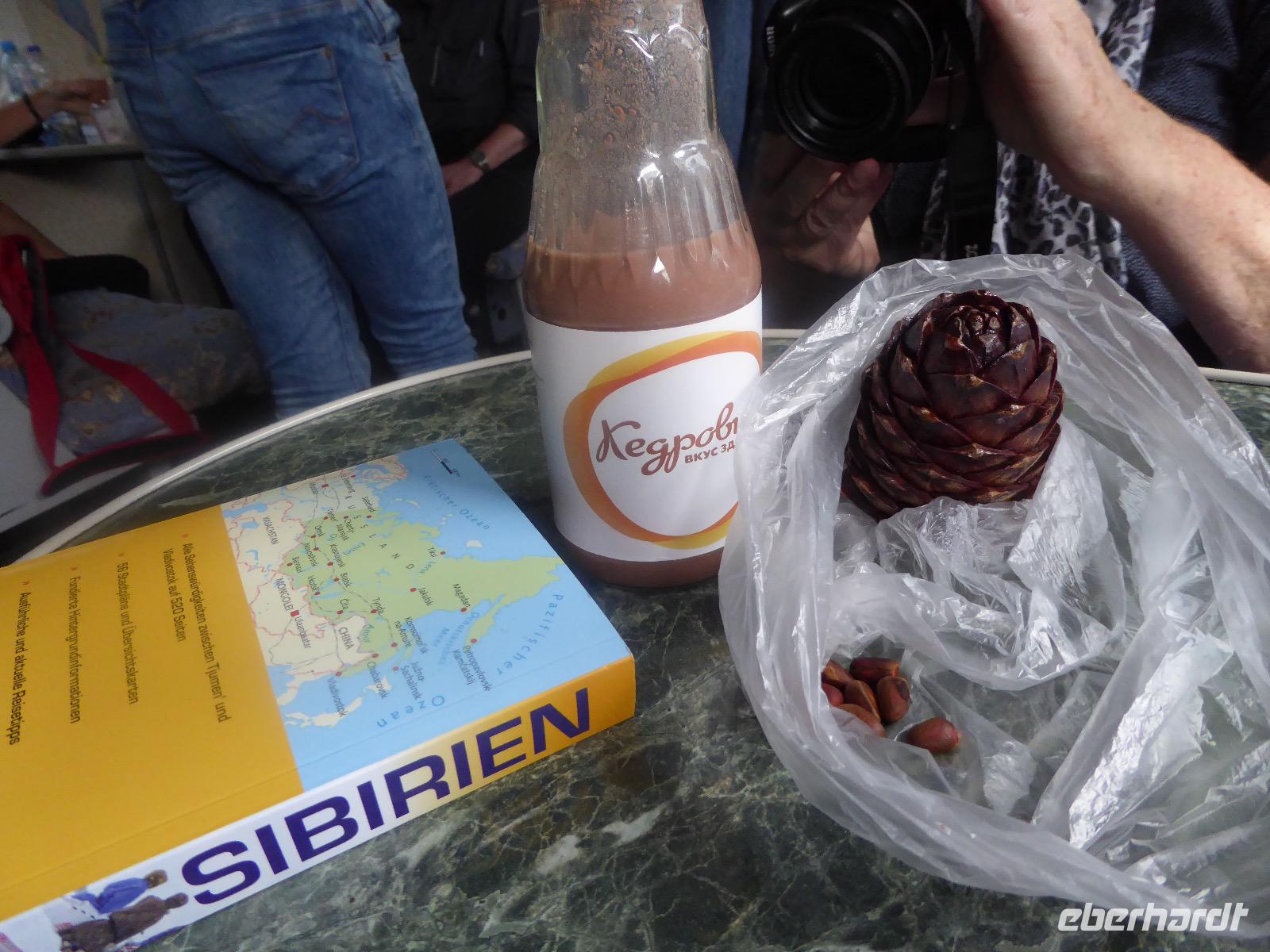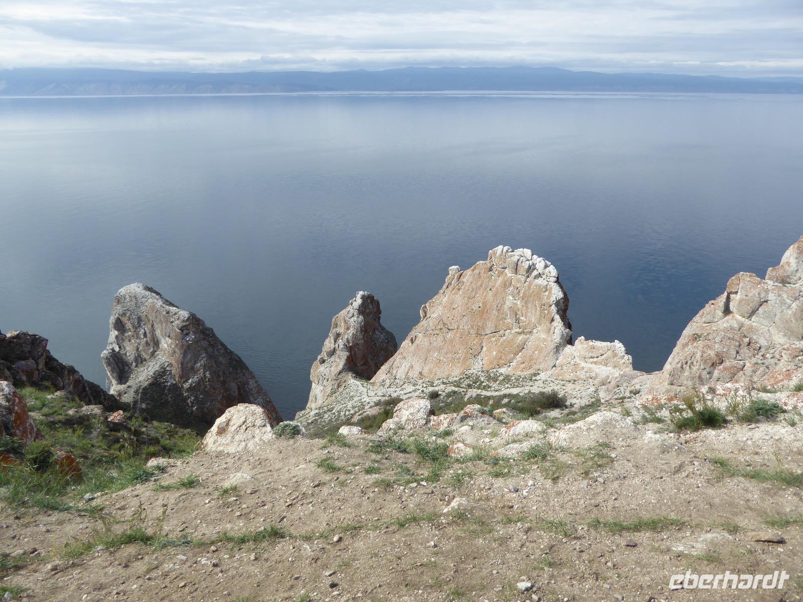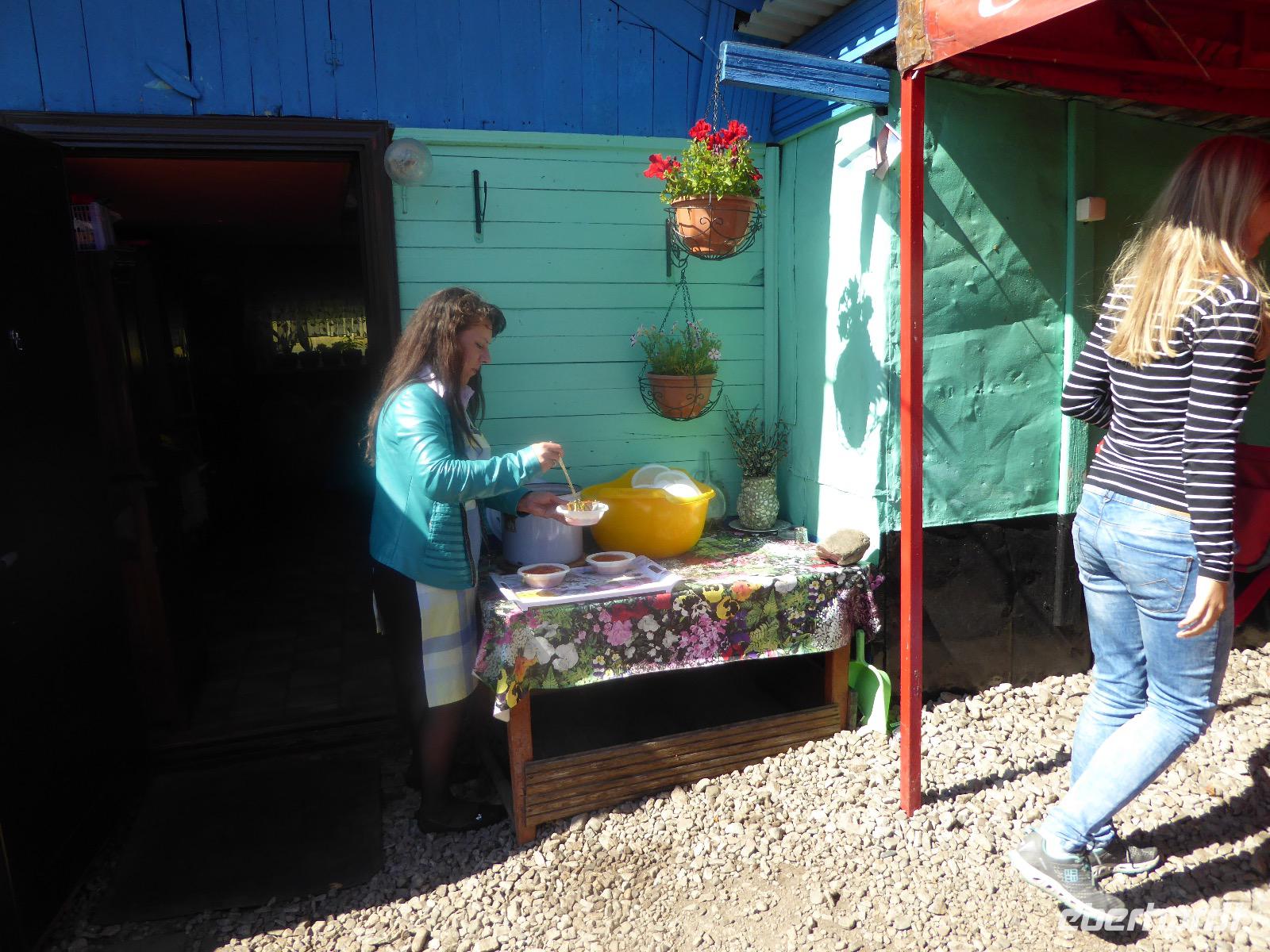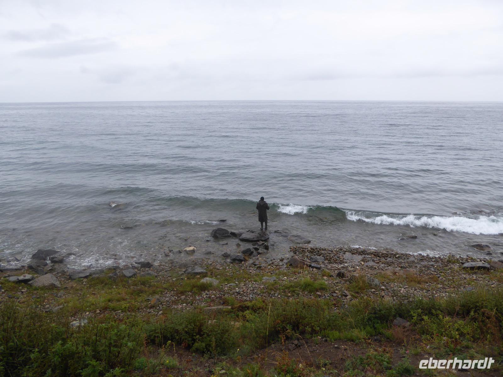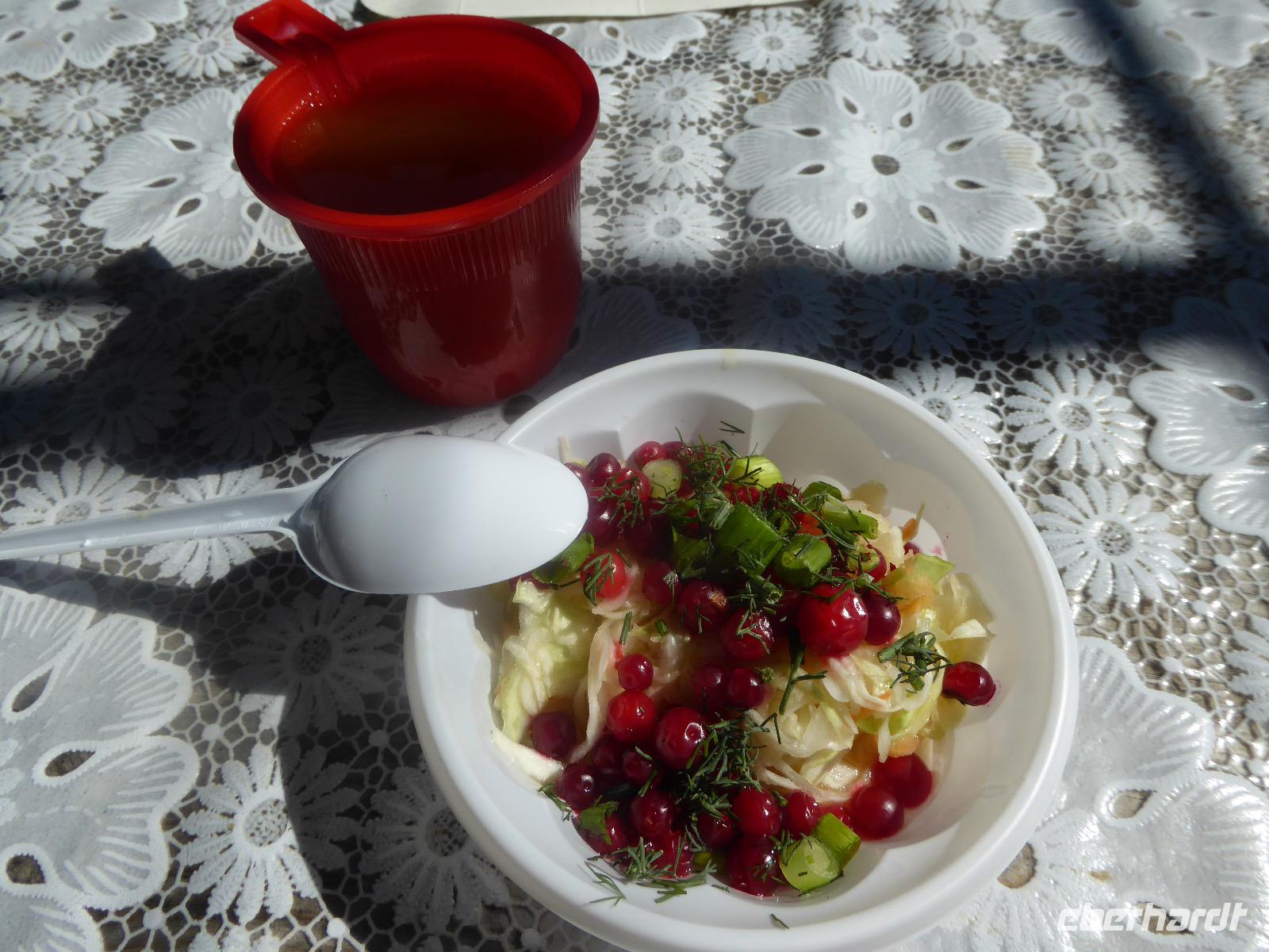 Am Abend haben wir festgelegt, wer wann das Bad benutzen darf. Das klappt prima. Frühstück gibt's um acht. Rührei mit Brokkoli, Brot, Honig mit Preiselbeeren. Um zehn treffen die Bewohner von Gasthaus 1 in Gasthaus 2 ein. Gemeinsam wandern wir zum Weisheitsfelsen. Eine Zeit lang geht es die Straße entlang, dann den Berg hinauf. Steil. Nach einer Stunde erreichen wir ein Fleckchen unterhalb des Gipfels. Weiter höher hinauf trauen sich nur Peter und Christine, es ist noch steiler und vor allem rutschig. Soja und Tanja erzählen Geschichten von der Entstehung des Dorfes. Dann geht es wieder bergab. Wir spazieren durch das Dorf, vorbei am Magasin und am Bäcker. Mittagessen gibt es in den Gasthäusern. Borstsch, Omul, Gurke und Tomate. Den Nachmittag verbringen wir mit einem Spaziergang am Baikalsee. Bei Michail kehren wir ein, hier gibt es WIFI und leckeren Kräutertee. Galina bereitet das Abendessen vor. Pelmeni, Omul und Wodka.