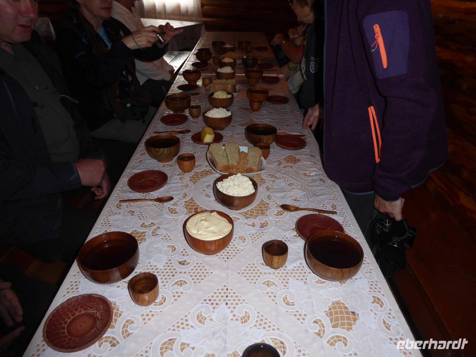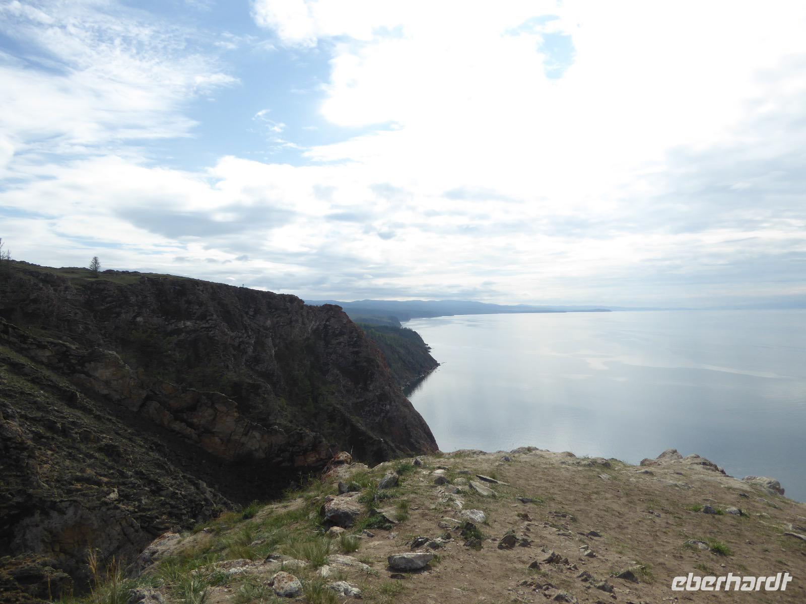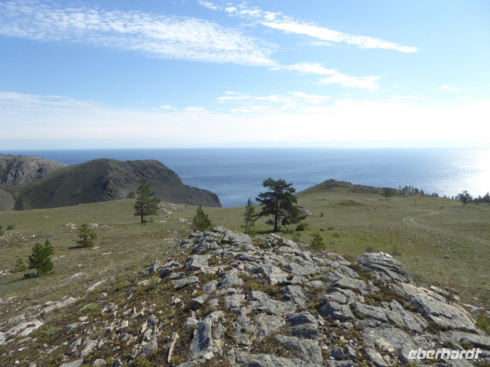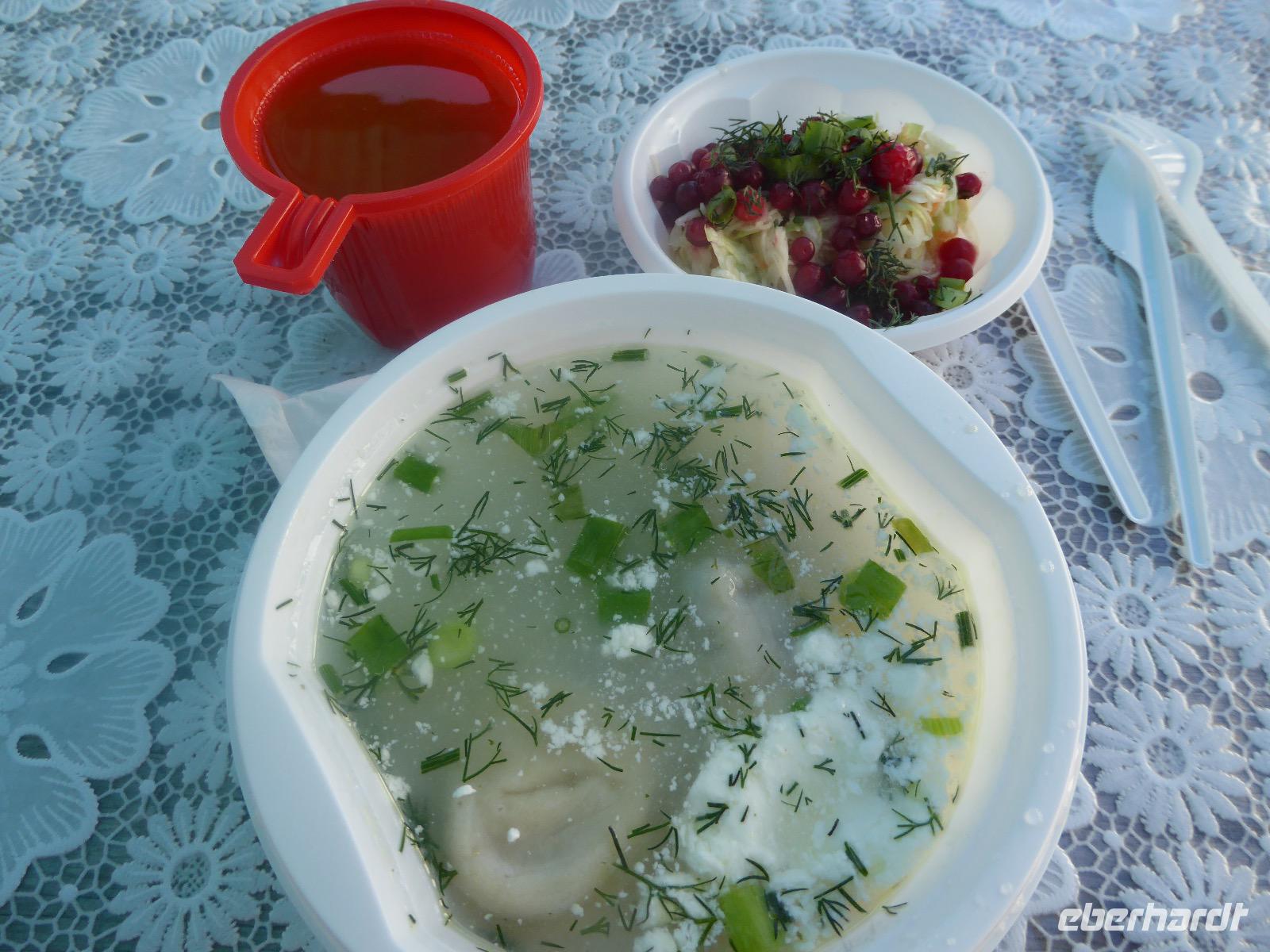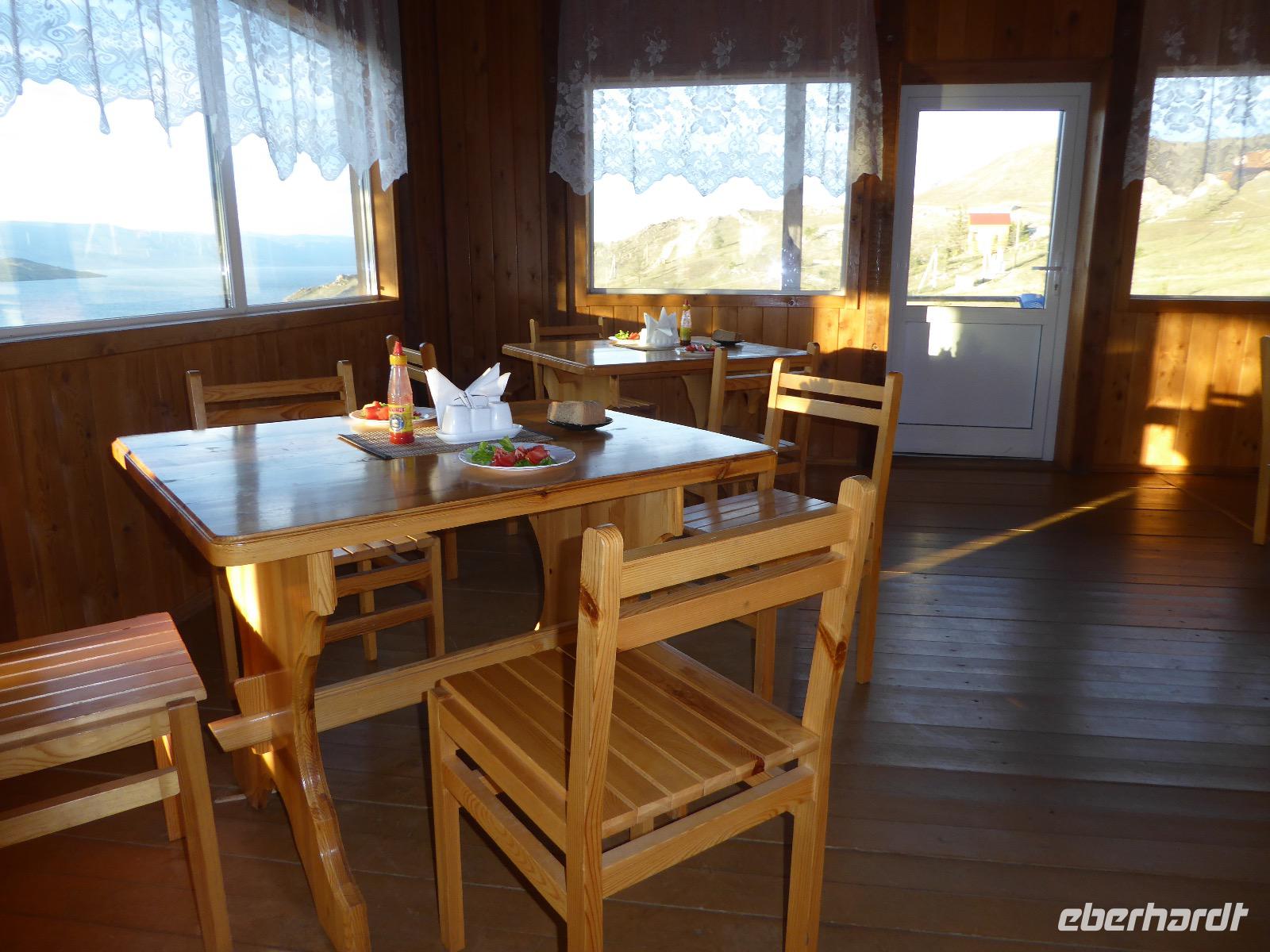 Am Abend haben wir festgelegt, wer wann das Bad benutzen darf. Das klappt prima. Frühstück gibt's um acht. Rührei mit Brokkoli, Brot, Honig mit Preiselbeeren. Um zehn treffen die Bewohner von Gasthaus 1 in Gasthaus 2 ein. Gemeinsam wandern wir zum Weisheitsfelsen. Eine Zeit lang geht es die Straße entlang, dann den Berg hinauf. Steil. Nach einer Stunde erreichen wir ein Fleckchen unterhalb des Gipfels. Weiter höher hinauf trauen sich nur Peter und Christine, es ist noch steiler und vor allem rutschig. Soja und Tanja erzählen Geschichten von der Entstehung des Dorfes. Dann geht es wieder bergab. Wir spazieren durch das Dorf, vorbei am Magasin und am Bäcker. Mittagessen gibt es in den Gasthäusern. Borstsch, Omul, Gurke und Tomate. Den Nachmittag verbringen wir mit einem Spaziergang am Baikalsee. Bei Michail kehren wir ein, hier gibt es WIFI und leckeren Kräutertee. Galina bereitet das Abendessen vor. Pelmeni, Omul und Wodka.