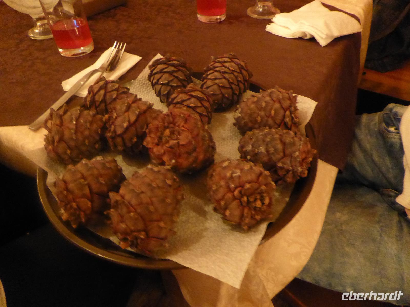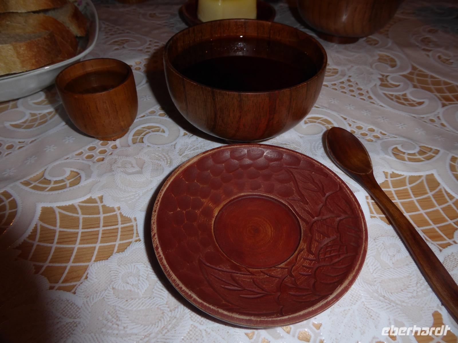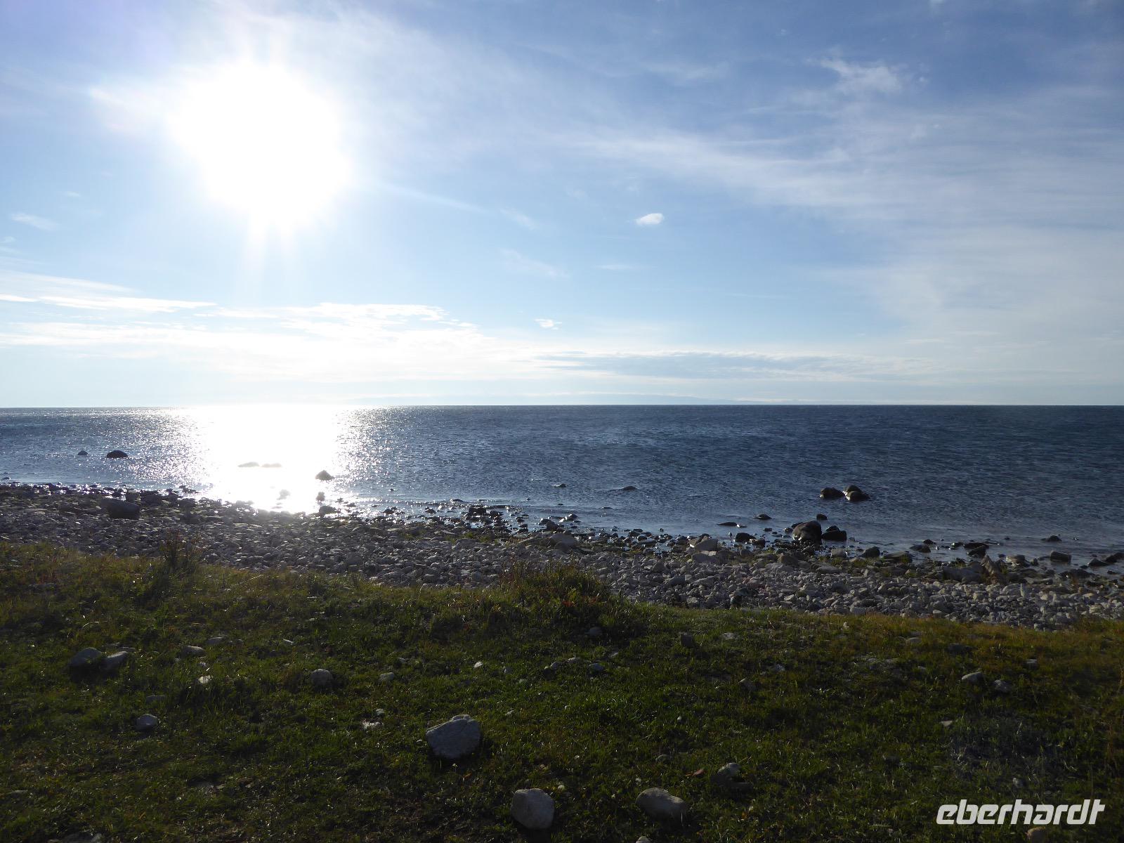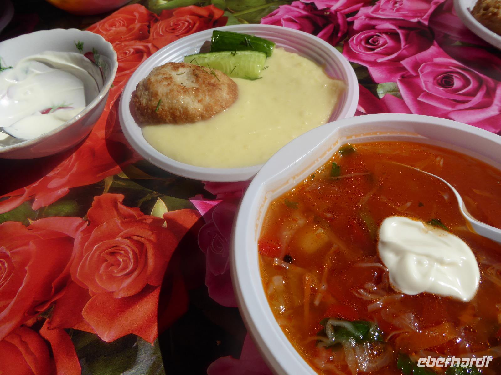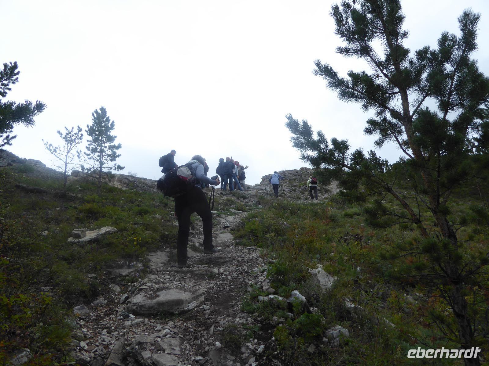 Am Abend haben wir festgelegt, wer wann das Bad benutzen darf. Das klappt prima. Frühstück gibt's um acht. Rührei mit Brokkoli, Brot, Honig mit Preiselbeeren. Um zehn treffen die Bewohner von Gasthaus 1 in Gasthaus 2 ein. Gemeinsam wandern wir zum Weisheitsfelsen. Eine Zeit lang geht es die Straße entlang, dann den Berg hinauf. Steil. Nach einer Stunde erreichen wir ein Fleckchen unterhalb des Gipfels. Weiter höher hinauf trauen sich nur Peter und Christine, es ist noch steiler und vor allem rutschig. Soja und Tanja erzählen Geschichten von der Entstehung des Dorfes. Dann geht es wieder bergab. Wir spazieren durch das Dorf, vorbei am Magasin und am Bäcker. Mittagessen gibt es in den Gasthäusern. Borstsch, Omul, Gurke und Tomate. Den Nachmittag verbringen wir mit einem Spaziergang am Baikalsee. Bei Michail kehren wir ein, hier gibt es WIFI und leckeren Kräutertee. Galina bereitet das Abendessen vor. Pelmeni, Omul und Wodka.