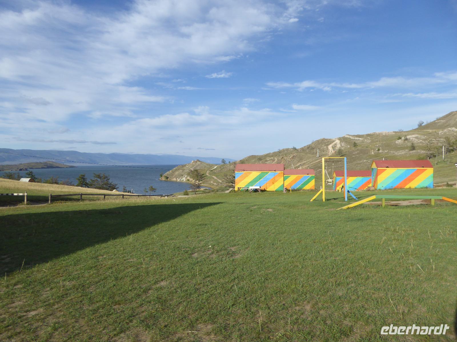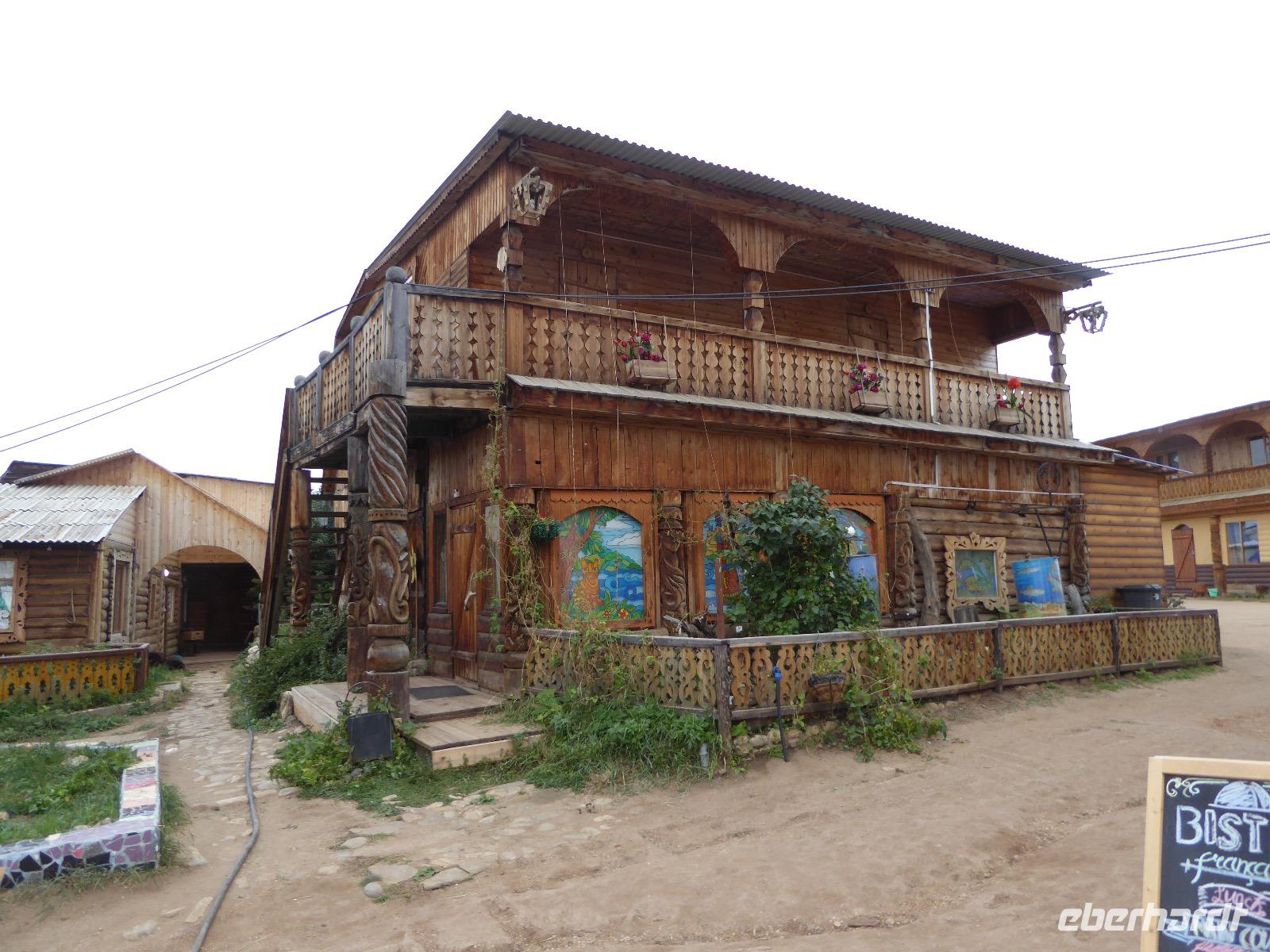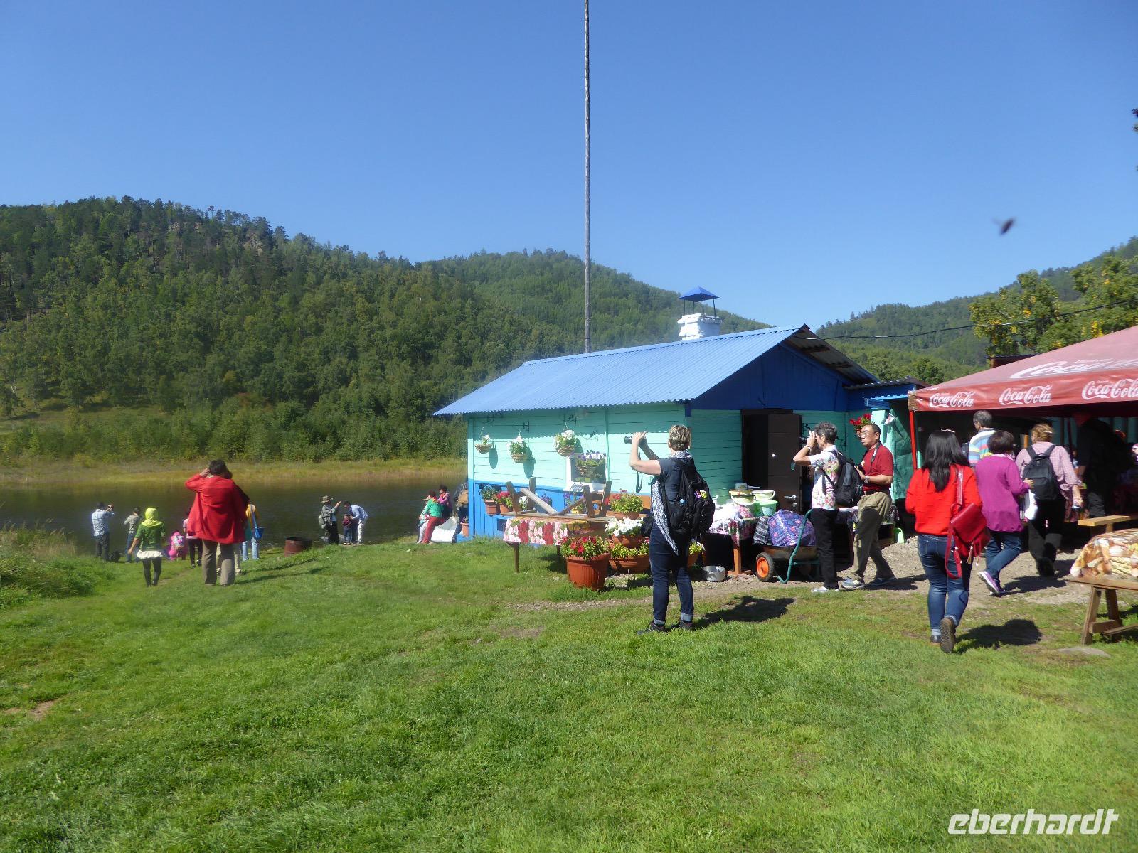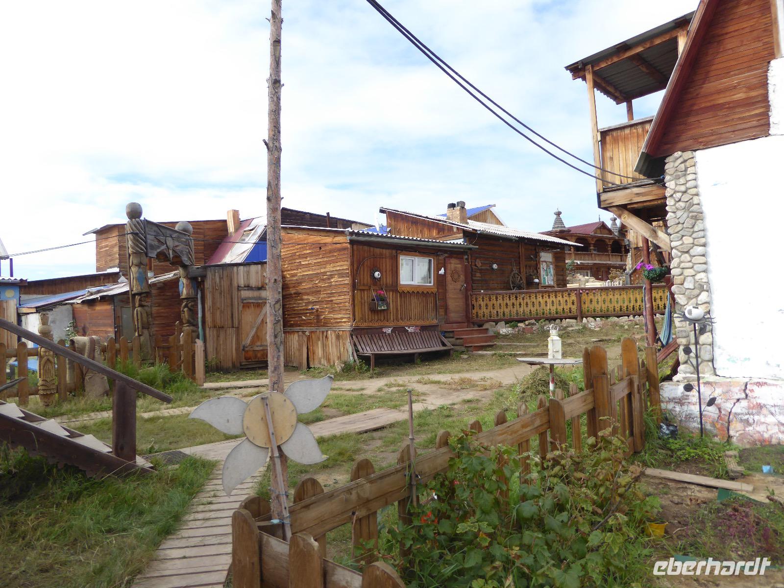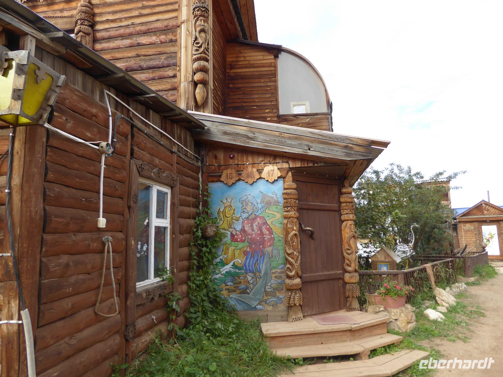 Wir können ausschlafen. Frühstück gibt es um neun. Im kleinen Magasin kaufen wir wieder für unser Picknick ein. Die Fähre zur Insel Olchon fährt um halb zwölf. In einer viertel Stunde sind wir schon da. Da es in den letzten Tagen auch hier geregnet hat, können wir nicht, wie geplant am Ostufer spazieren gehen. Wir suchen uns einen schönen Platz fürs Picknick und machen es uns gemütlich. Schnell haben die Männer Tisch und Stühle aufgebaut und Frauenhände das Obst, Gemüse und die Wurst aufgeschnitten. An frischer Luft schmeckts doch am besten. Nachmittags erreichen wir Nikita Bencharwos Camp, unsere Unterkunft für die nächsten Tage. Das Camp erinnert an ein Fort. Viele kleine Holzhäuser sind in bunter Reihenfolge auf einem Areal erbaut. Jedes hat eine andere Form und ist mit Bildern aus russischen Märchen geschmückt oder von verschiedenen Künstlern mit Blumenbildern verziert. Es gibt ein paar Räume, die sich Restaurant nennen, das französische Restaurant ist eher eine gemütliche Kneipe und die anderen eher Speiseräume, alles geschmückt mit russischen Utensilien. Nachdem die Zimmer verteilt sind, schnappt sich jeder ein Trinkgefäß, vom Zahnputzbecher über Gläser jeglicher Form bis zu russischen Teetassen ist alles dabei. Wir spazieren zum Schamanka, dem berühmten Schamanenfelsen, dessen Abbildung neben der Baikalrobbe auf keinem Souvenir fehlen darf. Die Felszeichnung wurden 2003 fast vollständig von Touristen übersprüht, die hier ihr eigenes Signum hinterlassen wollten. Ein halbnackter Pilger verkauft allerlei selbstgeschnitzten Schmuck aus Holz und neben ihm trällert ein russisches Mädchen unermüdlich Lieder zur Gitarre. Wir suchen uns einen Platz mit schöner Aussicht auf Schamanka und stoßen mit russichem Champagner auf Sibirien, den Baikalsee und das großartige Leben an.