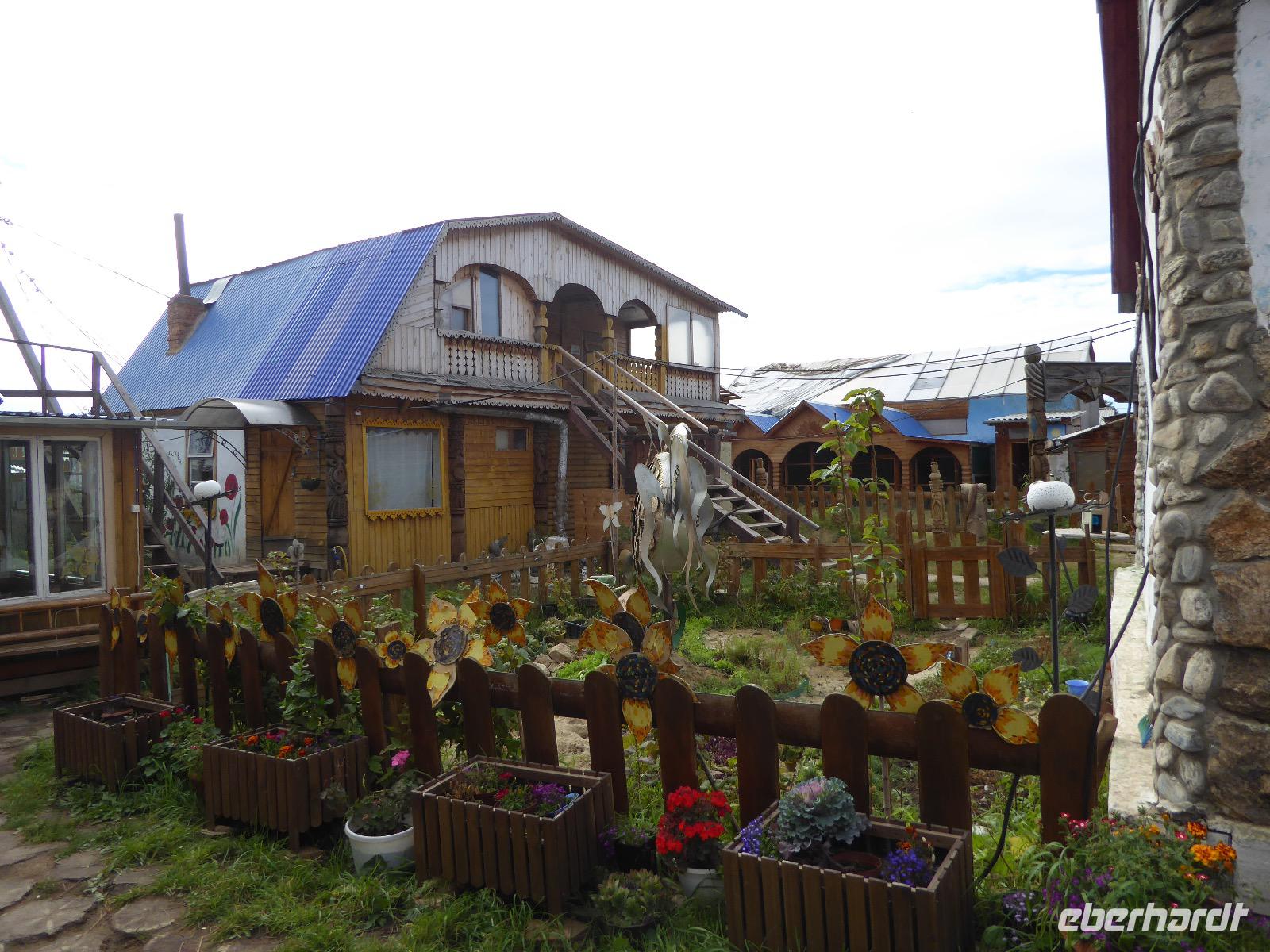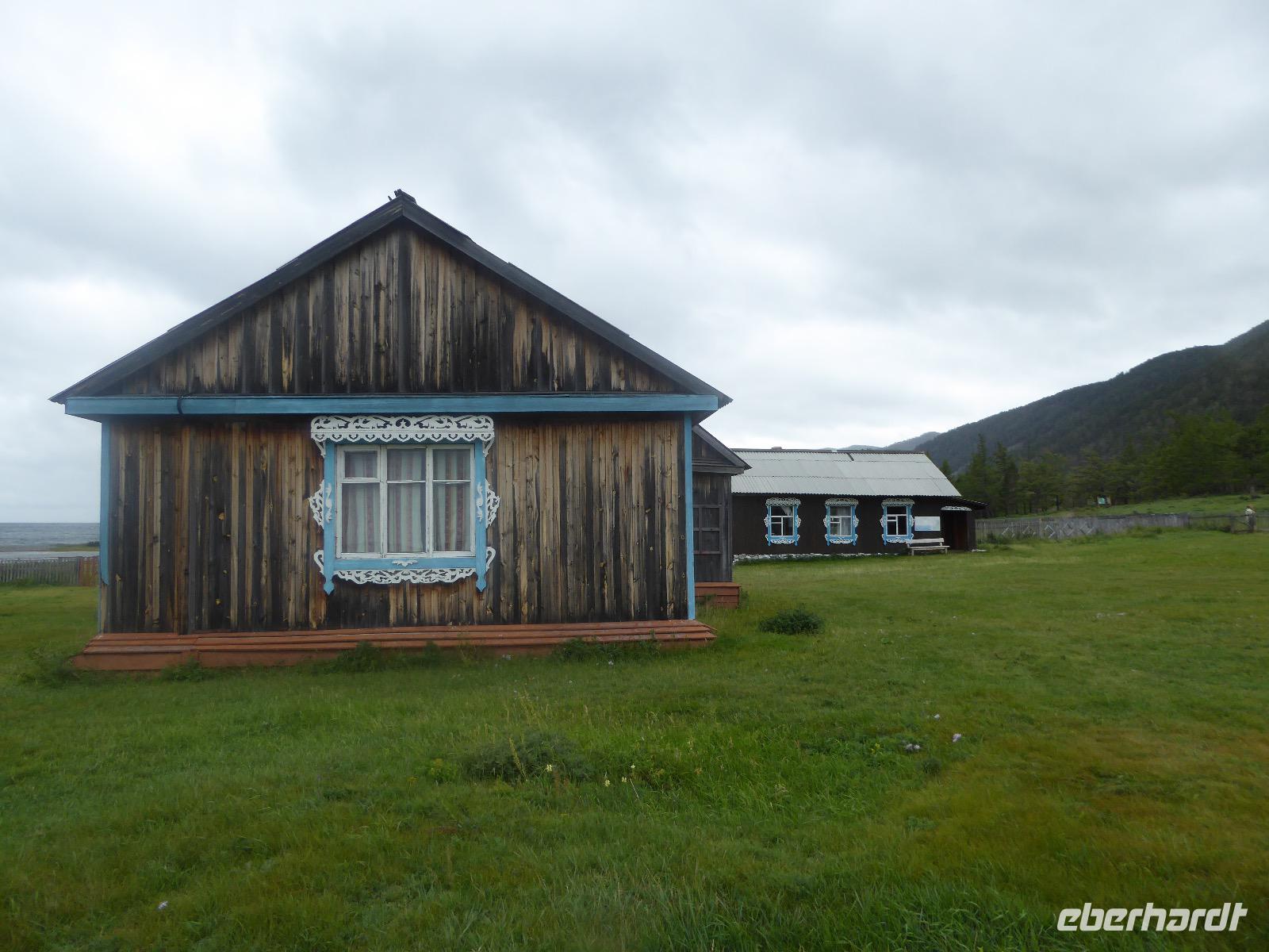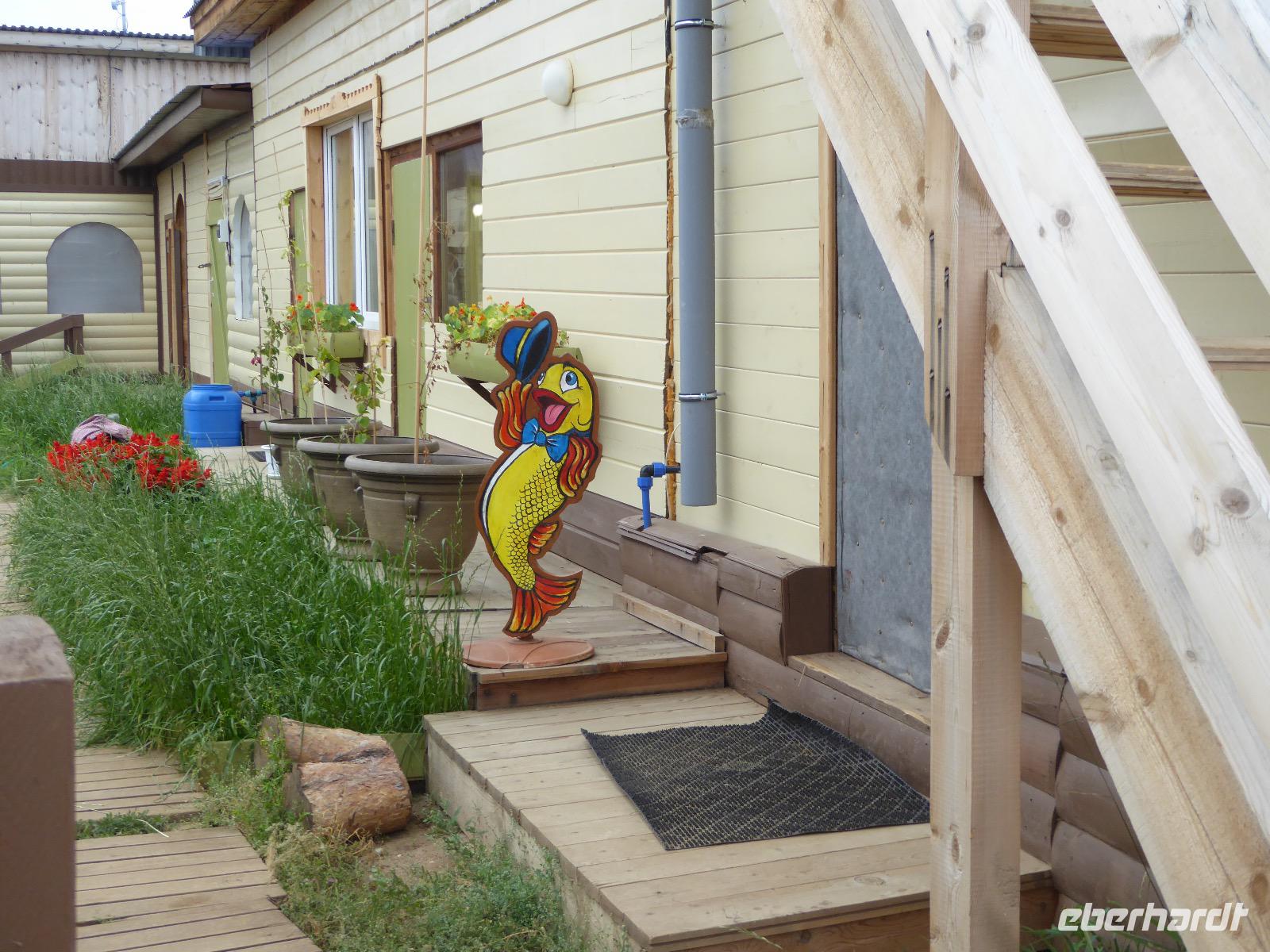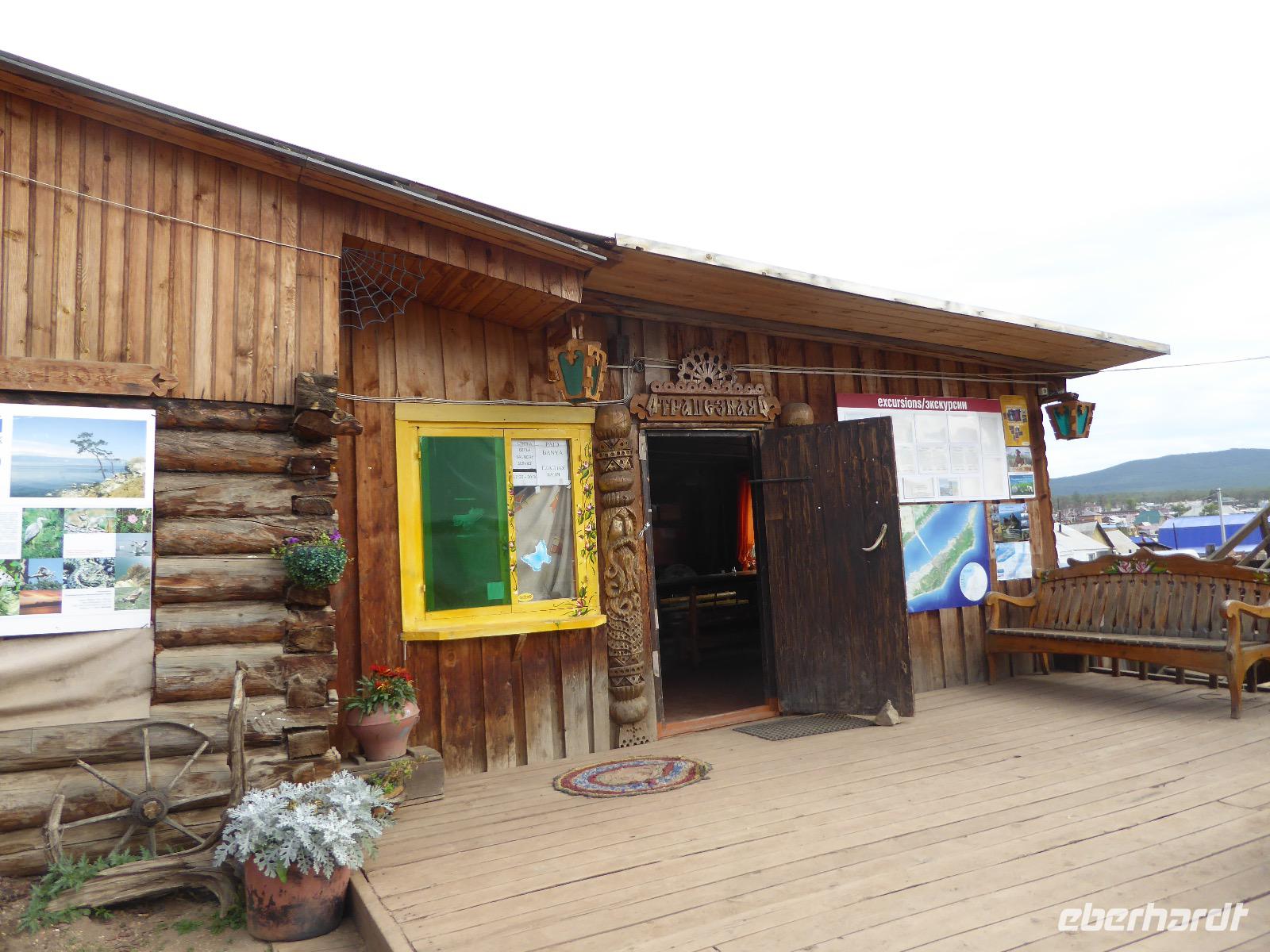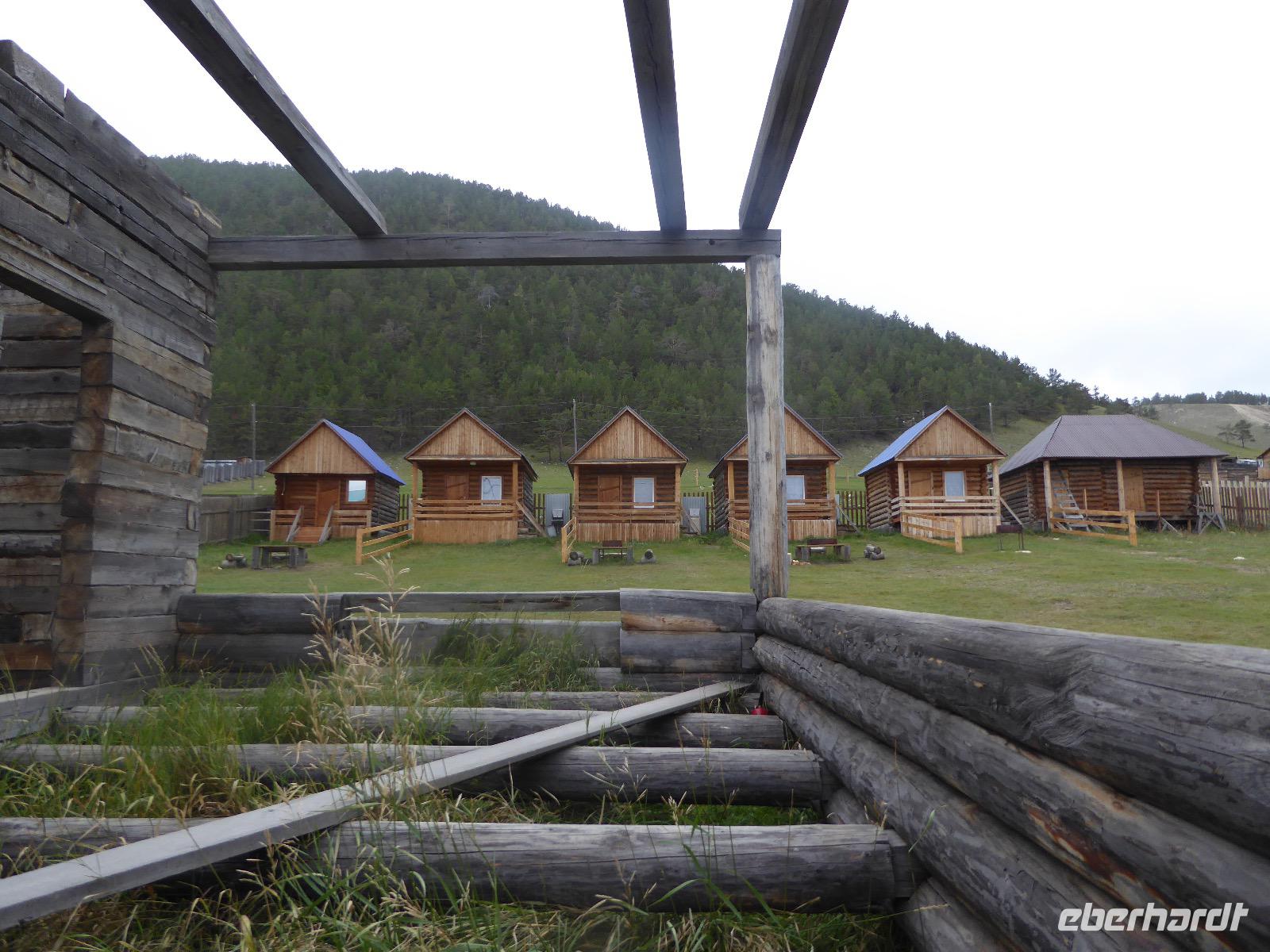 Wir können ausschlafen. Frühstück gibt es um neun. Im kleinen Magasin kaufen wir wieder für unser Picknick ein. Die Fähre zur Insel Olchon fährt um halb zwölf. In einer viertel Stunde sind wir schon da. Da es in den letzten Tagen auch hier geregnet hat, können wir nicht, wie geplant am Ostufer spazieren gehen. Wir suchen uns einen schönen Platz fürs Picknick und machen es uns gemütlich. Schnell haben die Männer Tisch und Stühle aufgebaut und Frauenhände das Obst, Gemüse und die Wurst aufgeschnitten. An frischer Luft schmeckts doch am besten. Nachmittags erreichen wir Nikita Bencharwos Camp, unsere Unterkunft für die nächsten Tage. Das Camp erinnert an ein Fort. Viele kleine Holzhäuser sind in bunter Reihenfolge auf einem Areal erbaut. Jedes hat eine andere Form und ist mit Bildern aus russischen Märchen geschmückt oder von verschiedenen Künstlern mit Blumenbildern verziert. Es gibt ein paar Räume, die sich Restaurant nennen, das französische Restaurant ist eher eine gemütliche Kneipe und die anderen eher Speiseräume, alles geschmückt mit russischen Utensilien. Nachdem die Zimmer verteilt sind, schnappt sich jeder ein Trinkgefäß, vom Zahnputzbecher über Gläser jeglicher Form bis zu russischen Teetassen ist alles dabei. Wir spazieren zum Schamanka, dem berühmten Schamanenfelsen, dessen Abbildung neben der Baikalrobbe auf keinem Souvenir fehlen darf. Die Felszeichnung wurden 2003 fast vollständig von Touristen übersprüht, die hier ihr eigenes Signum hinterlassen wollten. Ein halbnackter Pilger verkauft allerlei selbstgeschnitzten Schmuck aus Holz und neben ihm trällert ein russisches Mädchen unermüdlich Lieder zur Gitarre. Wir suchen uns einen Platz mit schöner Aussicht auf Schamanka und stoßen mit russichem Champagner auf Sibirien, den Baikalsee und das großartige Leben an.