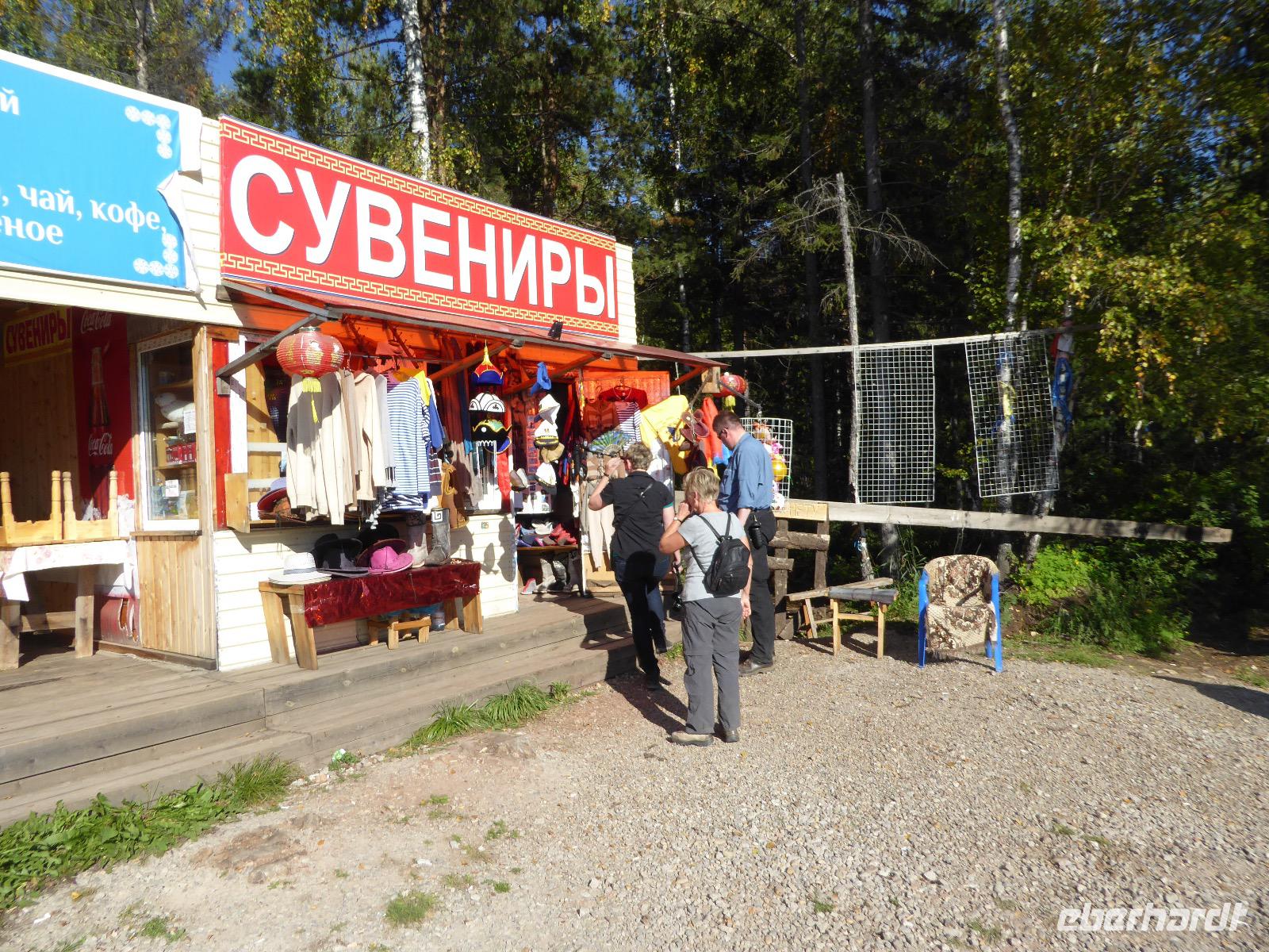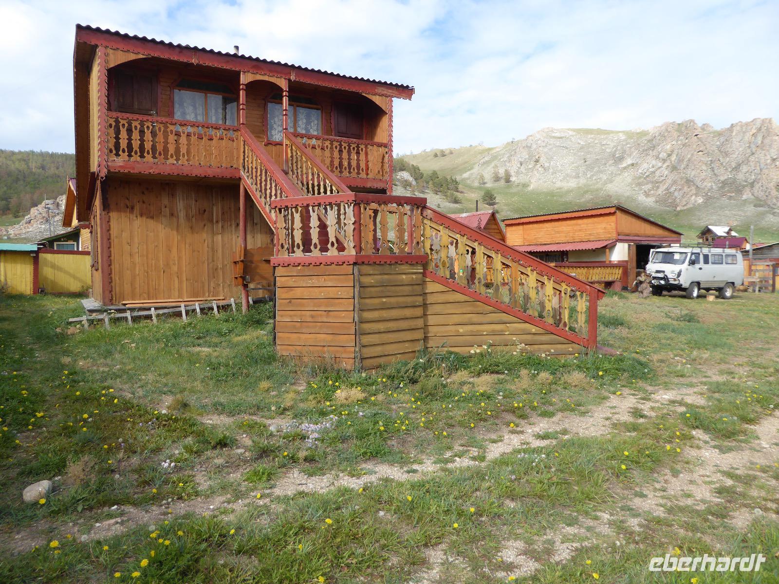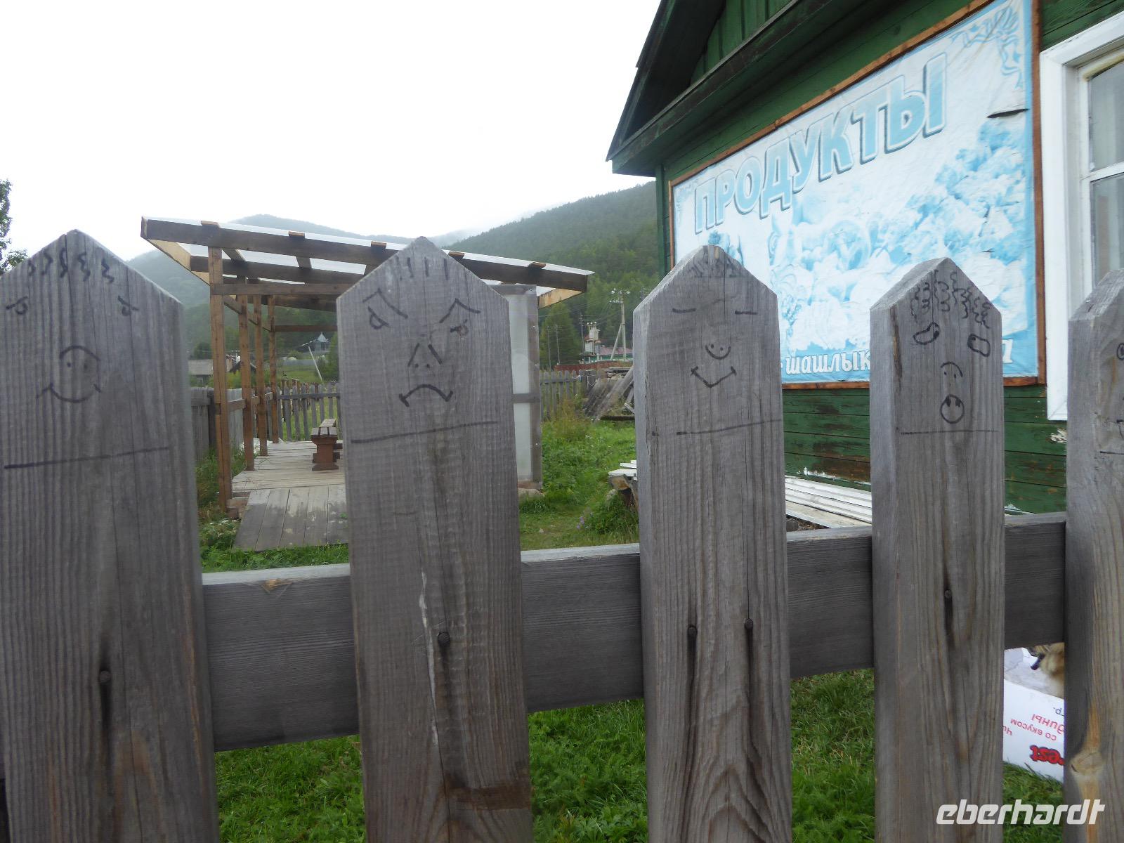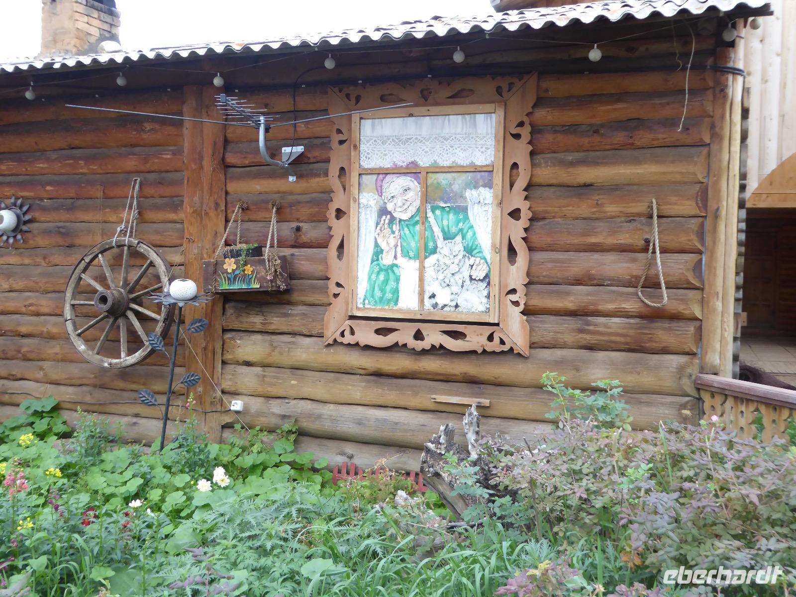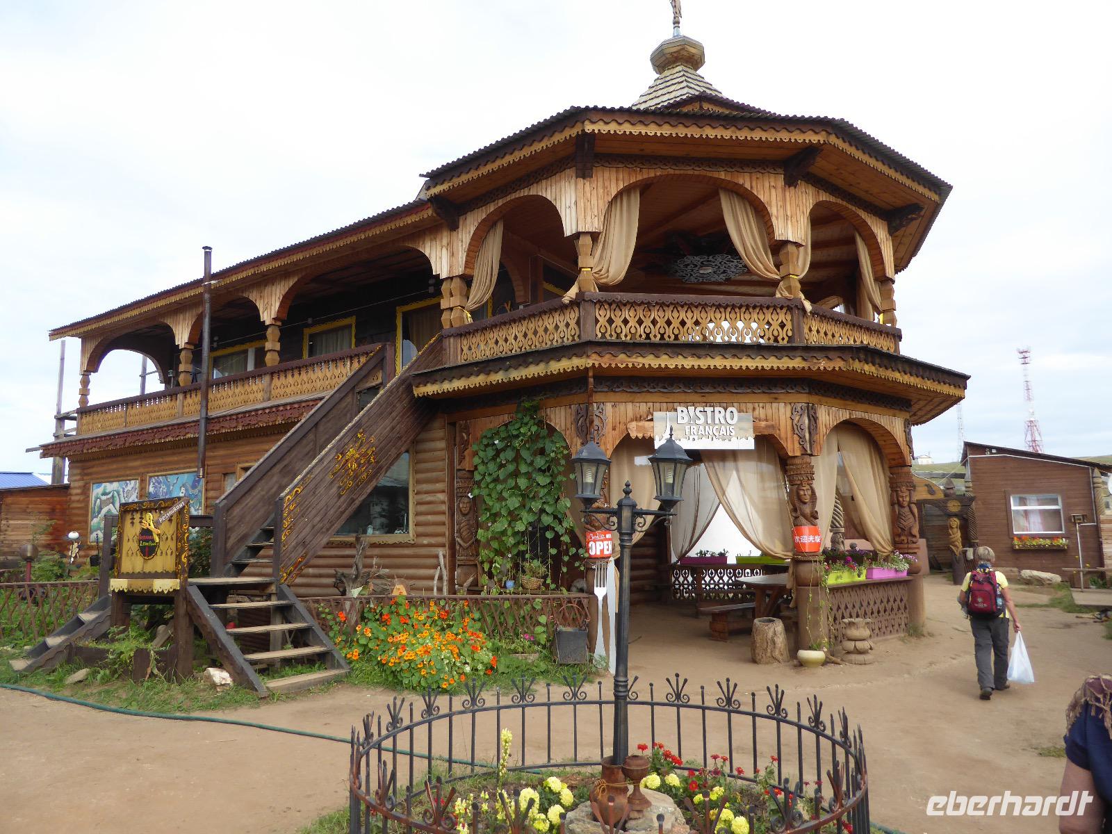 Wir können ausschlafen. Frühstück gibt es um neun. Im kleinen Magasin kaufen wir wieder für unser Picknick ein. Die Fähre zur Insel Olchon fährt um halb zwölf. In einer viertel Stunde sind wir schon da. Da es in den letzten Tagen auch hier geregnet hat, können wir nicht, wie geplant am Ostufer spazieren gehen. Wir suchen uns einen schönen Platz fürs Picknick und machen es uns gemütlich. Schnell haben die Männer Tisch und Stühle aufgebaut und Frauenhände das Obst, Gemüse und die Wurst aufgeschnitten. An frischer Luft schmeckts doch am besten. Nachmittags erreichen wir Nikita Bencharwos Camp, unsere Unterkunft für die nächsten Tage. Das Camp erinnert an ein Fort. Viele kleine Holzhäuser sind in bunter Reihenfolge auf einem Areal erbaut. Jedes hat eine andere Form und ist mit Bildern aus russischen Märchen geschmückt oder von verschiedenen Künstlern mit Blumenbildern verziert. Es gibt ein paar Räume, die sich Restaurant nennen, das französische Restaurant ist eher eine gemütliche Kneipe und die anderen eher Speiseräume, alles geschmückt mit russischen Utensilien. Nachdem die Zimmer verteilt sind, schnappt sich jeder ein Trinkgefäß, vom Zahnputzbecher über Gläser jeglicher Form bis zu russischen Teetassen ist alles dabei. Wir spazieren zum Schamanka, dem berühmten Schamanenfelsen, dessen Abbildung neben der Baikalrobbe auf keinem Souvenir fehlen darf. Die Felszeichnung wurden 2003 fast vollständig von Touristen übersprüht, die hier ihr eigenes Signum hinterlassen wollten. Ein halbnackter Pilger verkauft allerlei selbstgeschnitzten Schmuck aus Holz und neben ihm trällert ein russisches Mädchen unermüdlich Lieder zur Gitarre. Wir suchen uns einen Platz mit schöner Aussicht auf Schamanka und stoßen mit russichem Champagner auf Sibirien, den Baikalsee und das großartige Leben an.