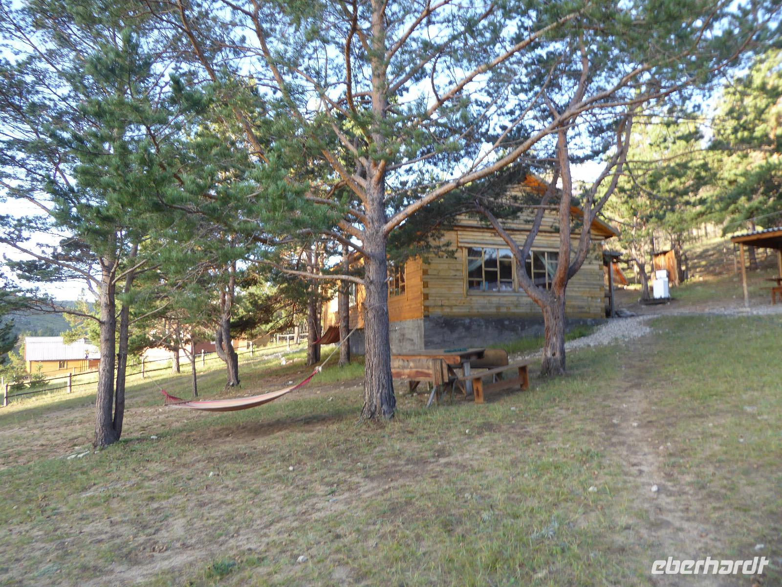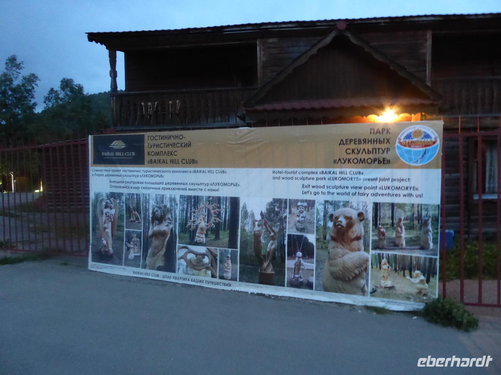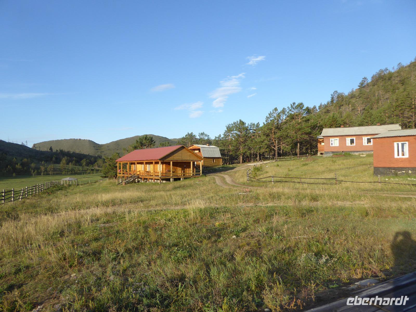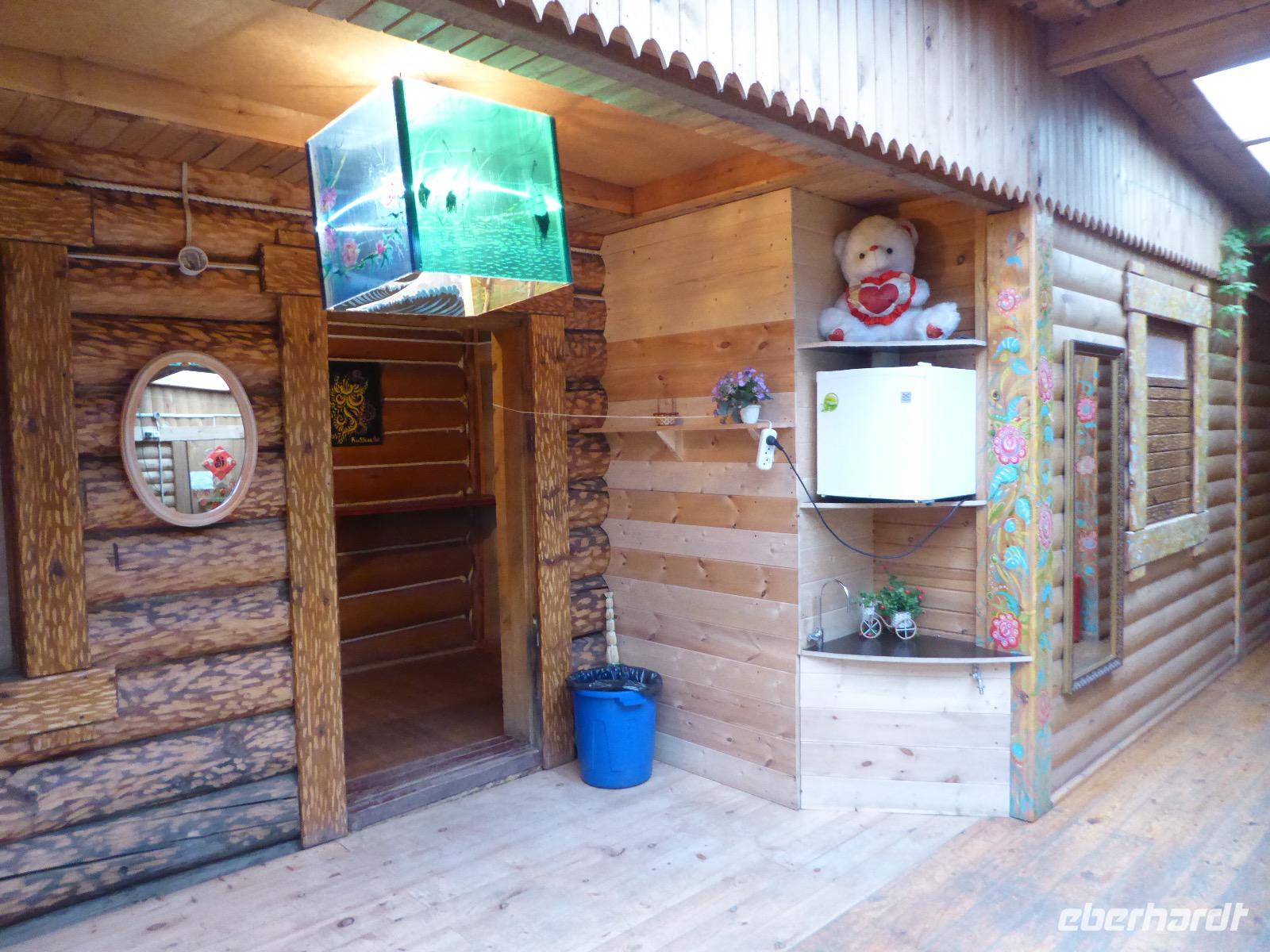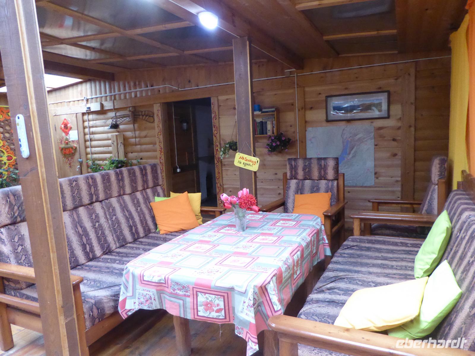Wir können ausschlafen. Frühstück gibt es um neun. Im kleinen Magasin kaufen wir wieder für unser Picknick ein. Die Fähre zur Insel Olchon fährt um halb zwölf. In einer viertel Stunde sind wir schon da. Da es in den letzten Tagen auch hier geregnet hat, können wir nicht, wie geplant am Ostufer spazieren gehen. Wir suchen uns einen schönen Platz fürs Picknick und machen es uns gemütlich. Schnell haben die Männer Tisch und Stühle aufgebaut und Frauenhände das Obst, Gemüse und die Wurst aufgeschnitten. An frischer Luft schmeckts doch am besten. Nachmittags erreichen wir Nikita Bencharwos Camp, unsere Unterkunft für die nächsten Tage. Das Camp erinnert an ein Fort. Viele kleine Holzhäuser sind in bunter Reihenfolge auf einem Areal erbaut. Jedes hat eine andere Form und ist mit Bildern aus russischen Märchen geschmückt oder von verschiedenen Künstlern mit Blumenbildern verziert. Es gibt ein paar Räume, die sich Restaurant nennen, das französische Restaurant ist eher eine gemütliche Kneipe und die anderen eher Speiseräume, alles geschmückt mit russischen Utensilien. Nachdem die Zimmer verteilt sind, schnappt sich jeder ein Trinkgefäß, vom Zahnputzbecher über Gläser jeglicher Form bis zu russischen Teetassen ist alles dabei. Wir spazieren zum Schamanka, dem berühmten Schamanenfelsen, dessen Abbildung neben der Baikalrobbe auf keinem Souvenir fehlen darf. Die Felszeichnung wurden 2003 fast vollständig von Touristen übersprüht, die hier ihr eigenes Signum hinterlassen wollten. Ein halbnackter Pilger verkauft allerlei selbstgeschnitzten Schmuck aus Holz und neben ihm trällert ein russisches Mädchen unermüdlich Lieder zur Gitarre. Wir suchen uns einen Platz mit schöner Aussicht auf Schamanka und stoßen mit russichem Champagner auf Sibirien, den Baikalsee und das großartige Leben an.