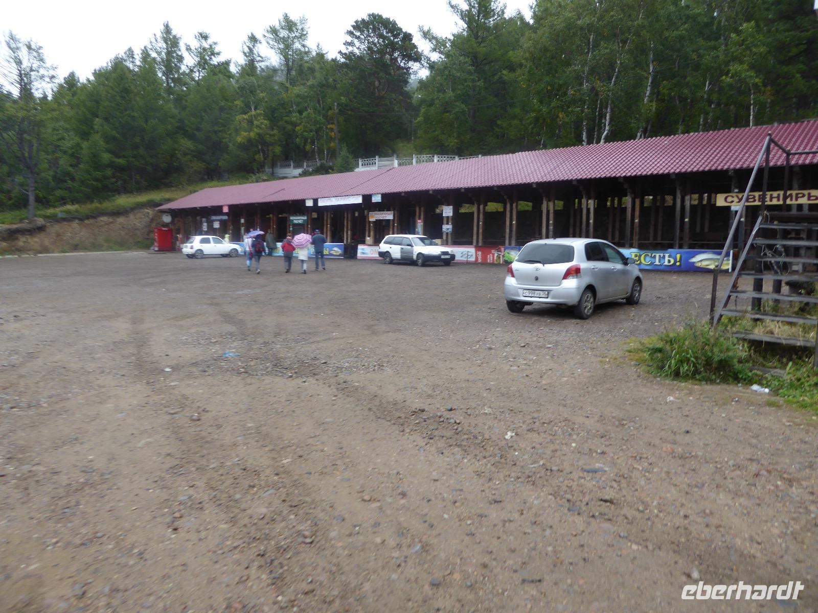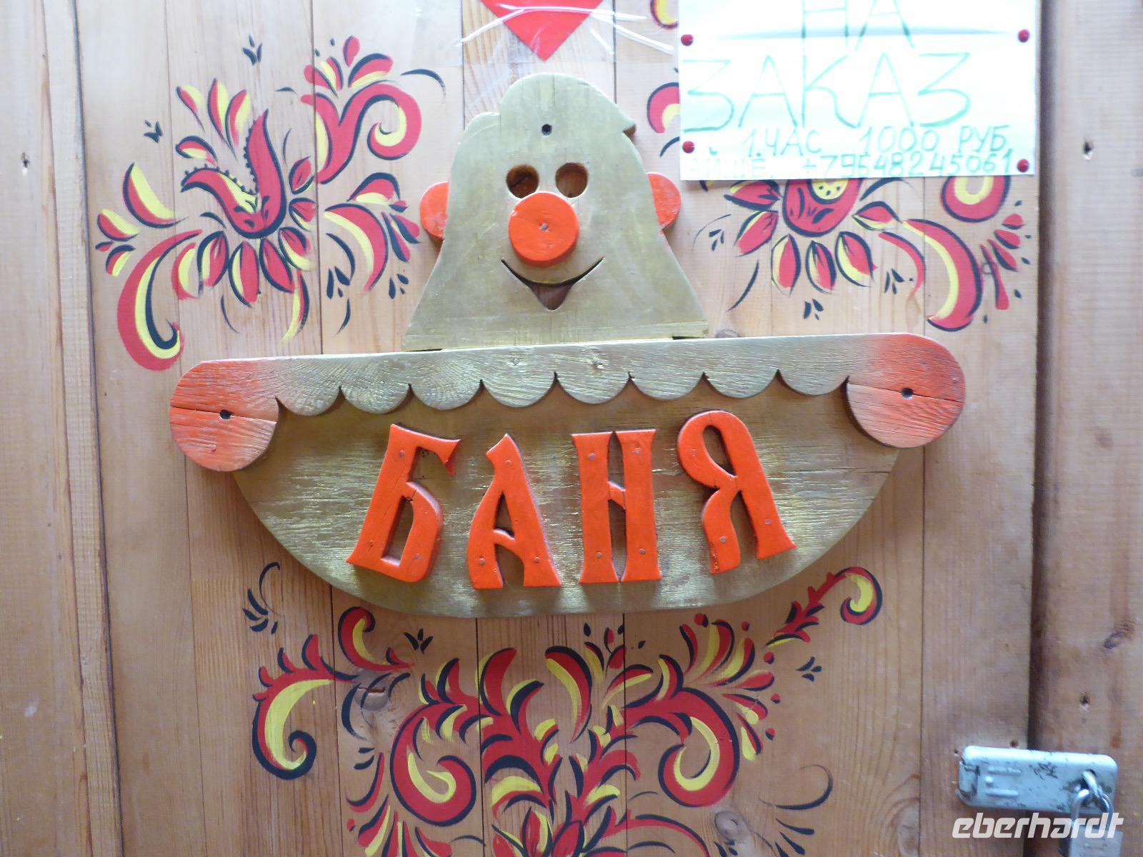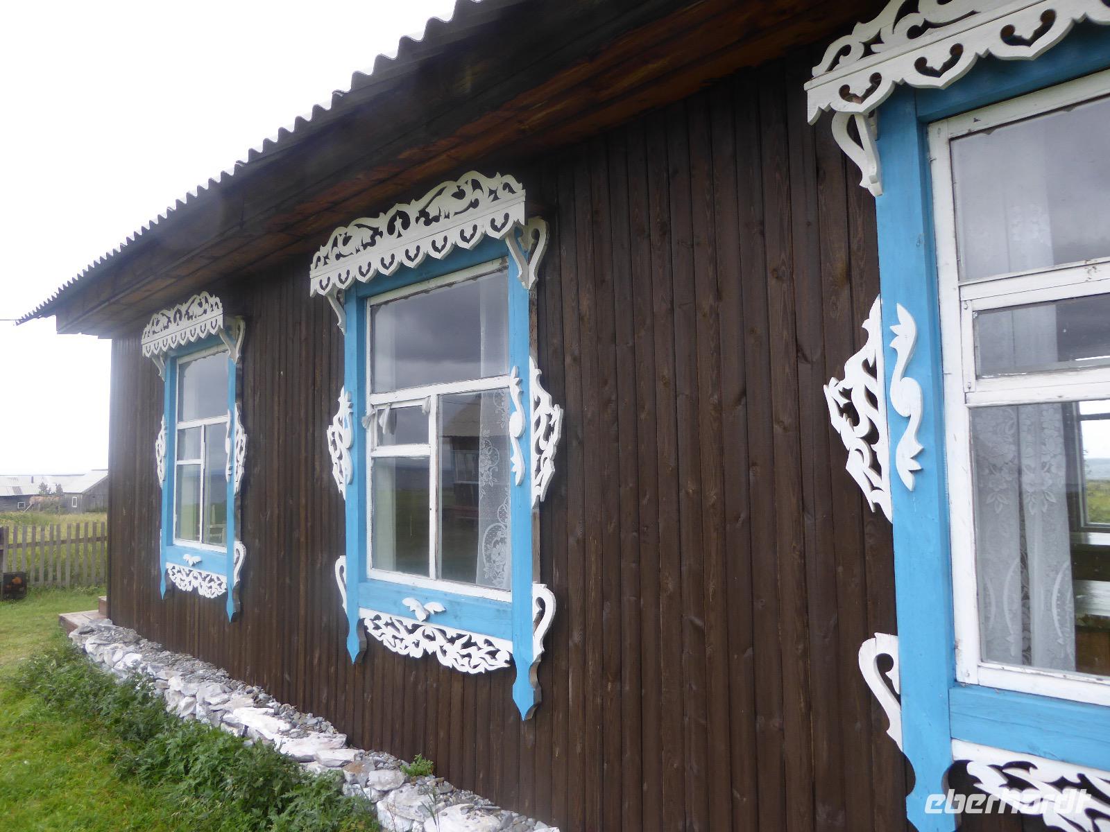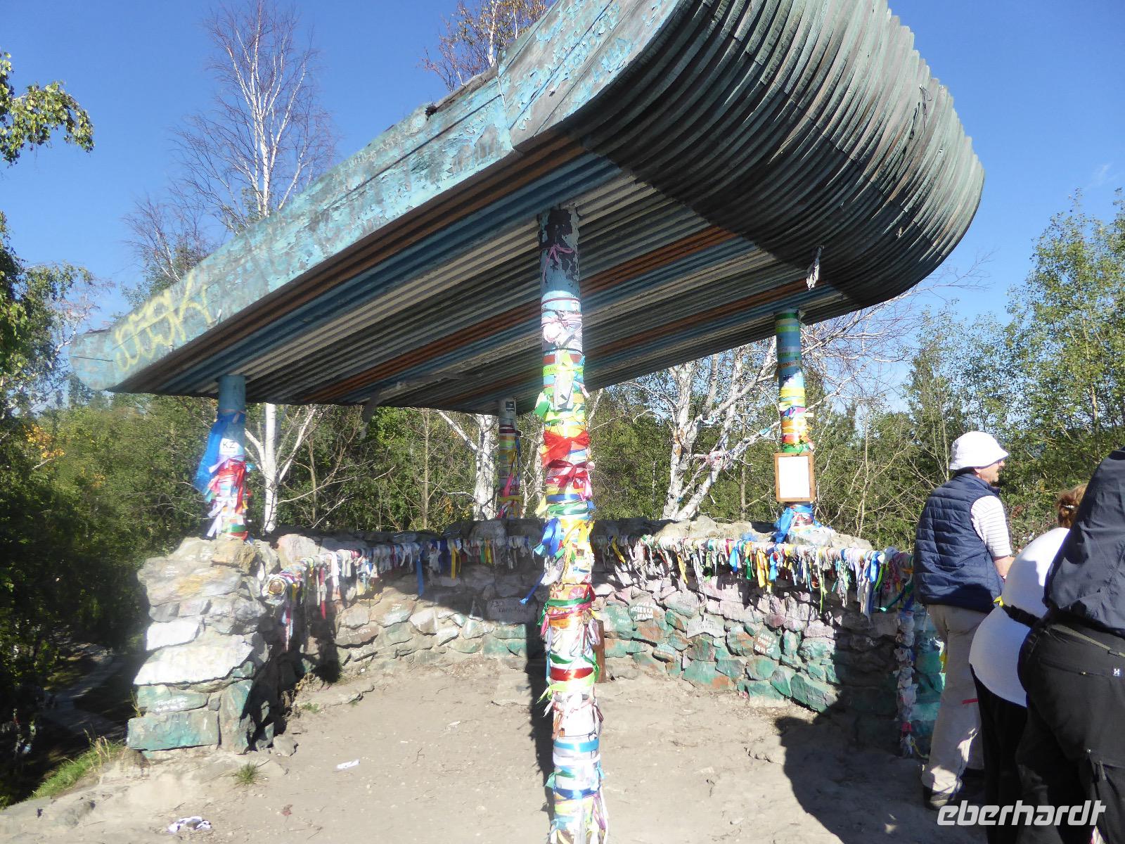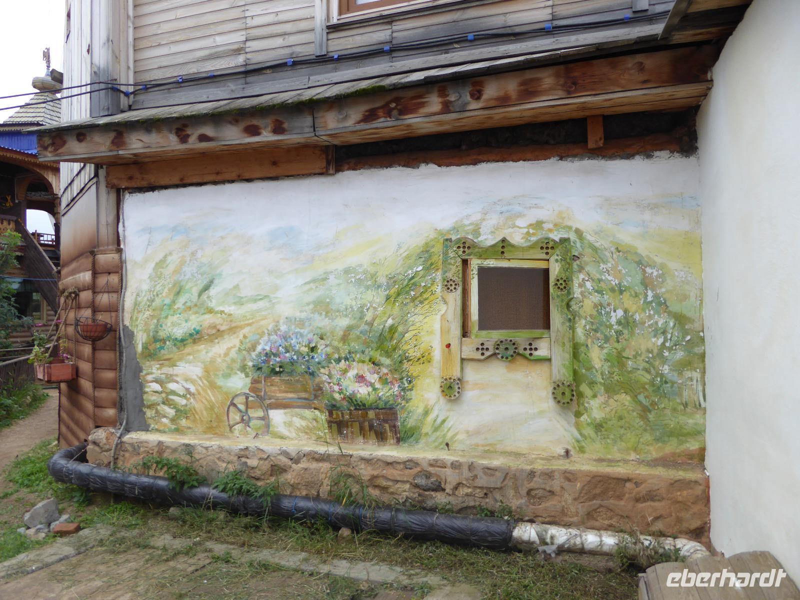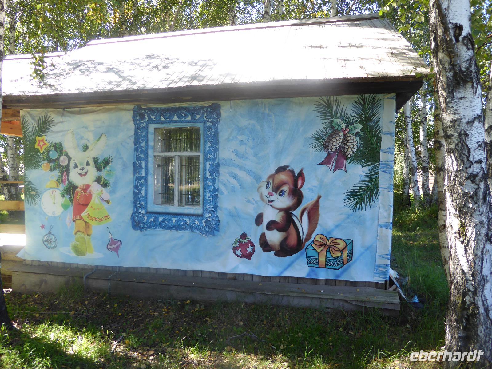 Wir können ausschlafen. Frühstück gibt es um neun. Im kleinen Magasin kaufen wir wieder für unser Picknick ein. Die Fähre zur Insel Olchon fährt um halb zwölf. In einer viertel Stunde sind wir schon da. Da es in den letzten Tagen auch hier geregnet hat, können wir nicht, wie geplant am Ostufer spazieren gehen. Wir suchen uns einen schönen Platz fürs Picknick und machen es uns gemütlich. Schnell haben die Männer Tisch und Stühle aufgebaut und Frauenhände das Obst, Gemüse und die Wurst aufgeschnitten. An frischer Luft schmeckts doch am besten. Nachmittags erreichen wir Nikita Bencharwos Camp, unsere Unterkunft für die nächsten Tage. Das Camp erinnert an ein Fort. Viele kleine Holzhäuser sind in bunter Reihenfolge auf einem Areal erbaut. Jedes hat eine andere Form und ist mit Bildern aus russischen Märchen geschmückt oder von verschiedenen Künstlern mit Blumenbildern verziert. Es gibt ein paar Räume, die sich Restaurant nennen, das französische Restaurant ist eher eine gemütliche Kneipe und die anderen eher Speiseräume, alles geschmückt mit russischen Utensilien. Nachdem die Zimmer verteilt sind, schnappt sich jeder ein Trinkgefäß, vom Zahnputzbecher über Gläser jeglicher Form bis zu russischen Teetassen ist alles dabei. Wir spazieren zum Schamanka, dem berühmten Schamanenfelsen, dessen Abbildung neben der Baikalrobbe auf keinem Souvenir fehlen darf. Die Felszeichnung wurden 2003 fast vollständig von Touristen übersprüht, die hier ihr eigenes Signum hinterlassen wollten. Ein halbnackter Pilger verkauft allerlei selbstgeschnitzten Schmuck aus Holz und neben ihm trällert ein russisches Mädchen unermüdlich Lieder zur Gitarre. Wir suchen uns einen Platz mit schöner Aussicht auf Schamanka und stoßen mit russichem Champagner auf Sibirien, den Baikalsee und das großartige Leben an.