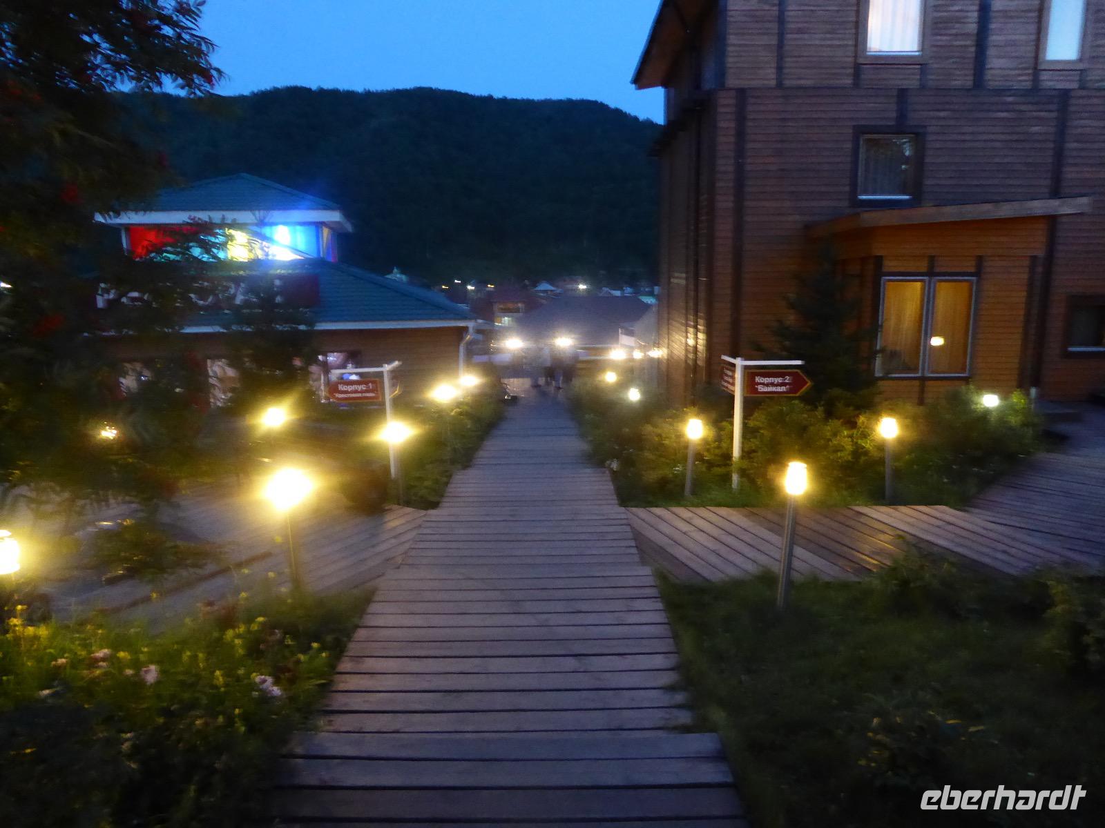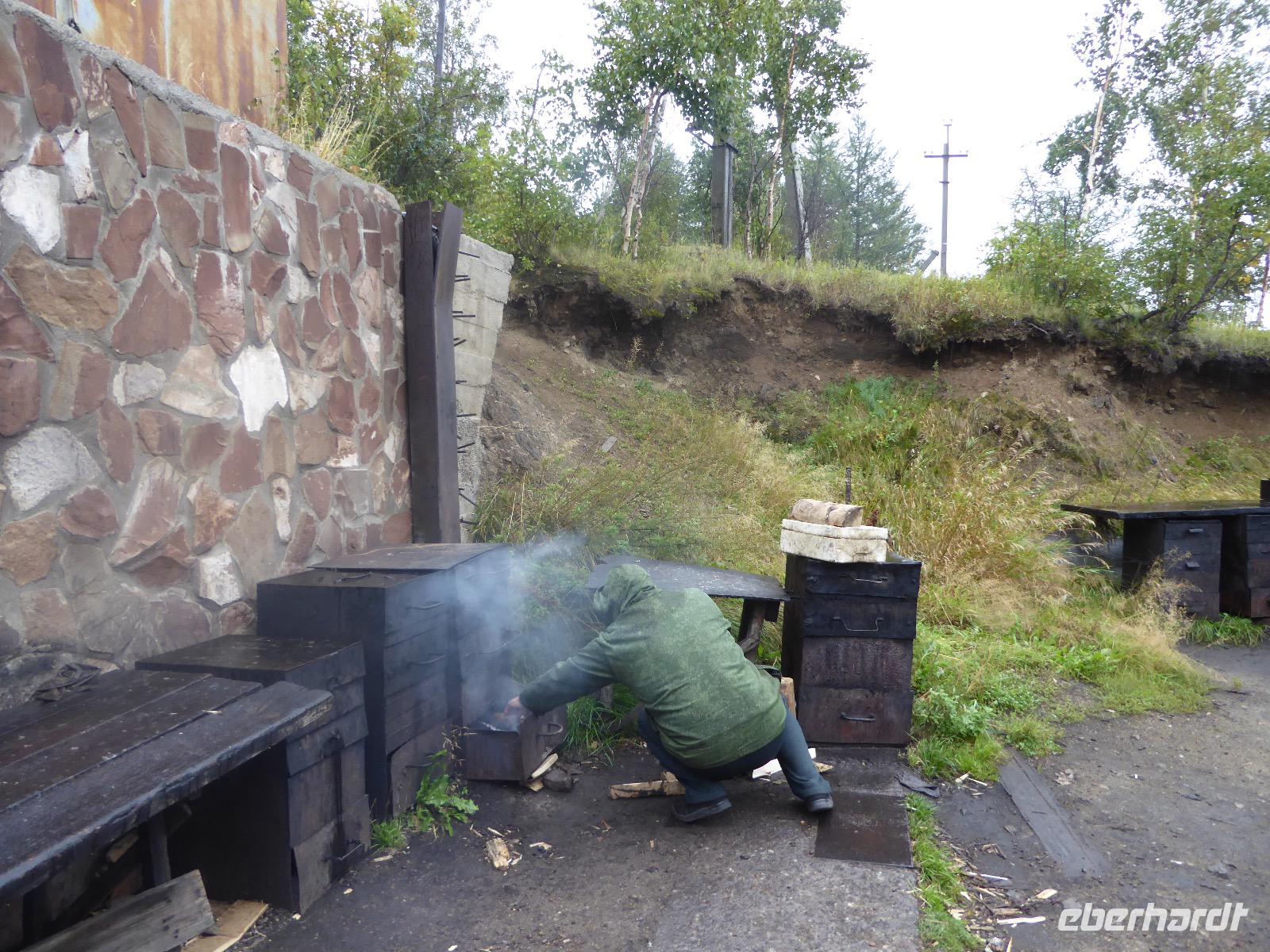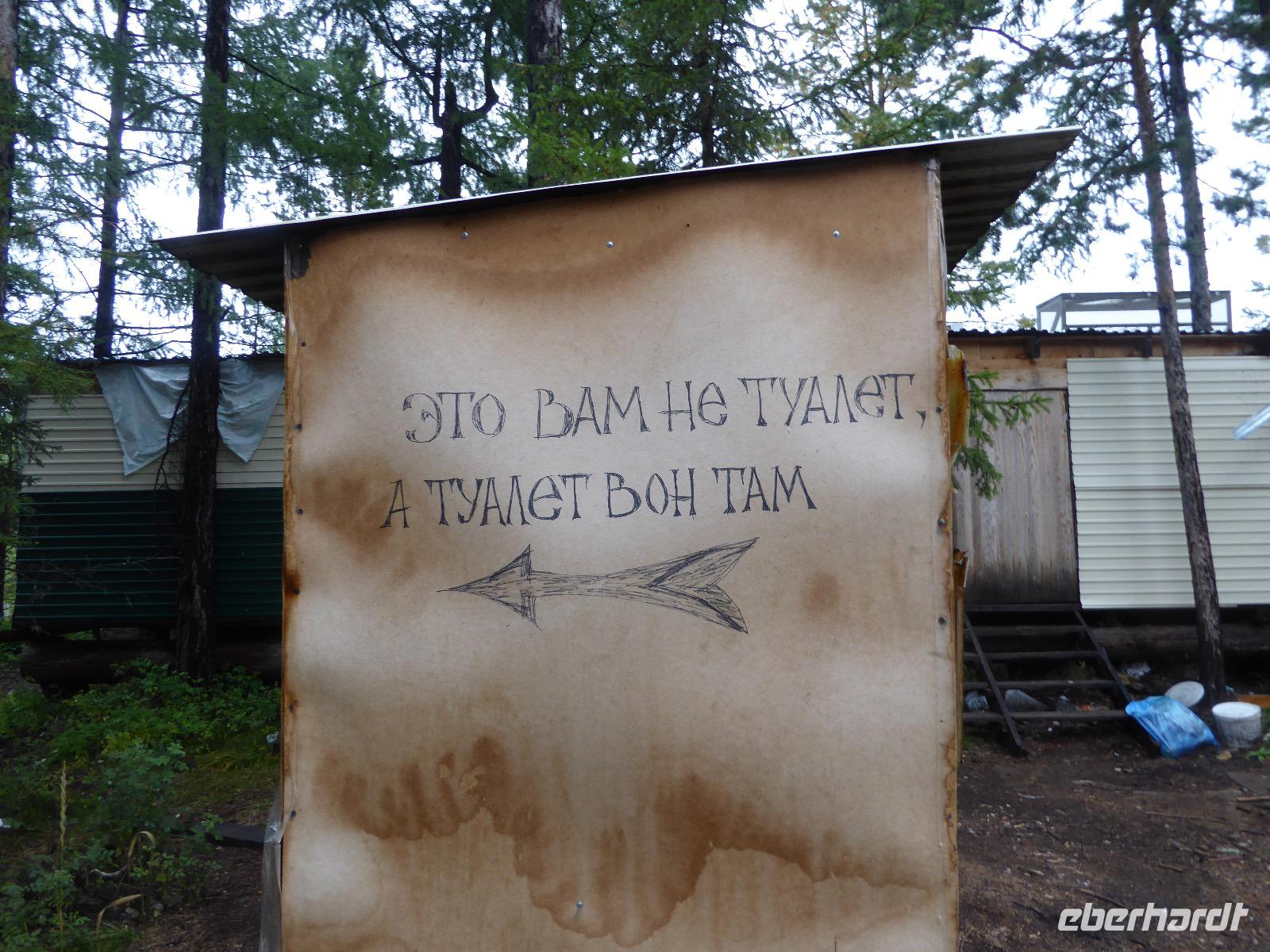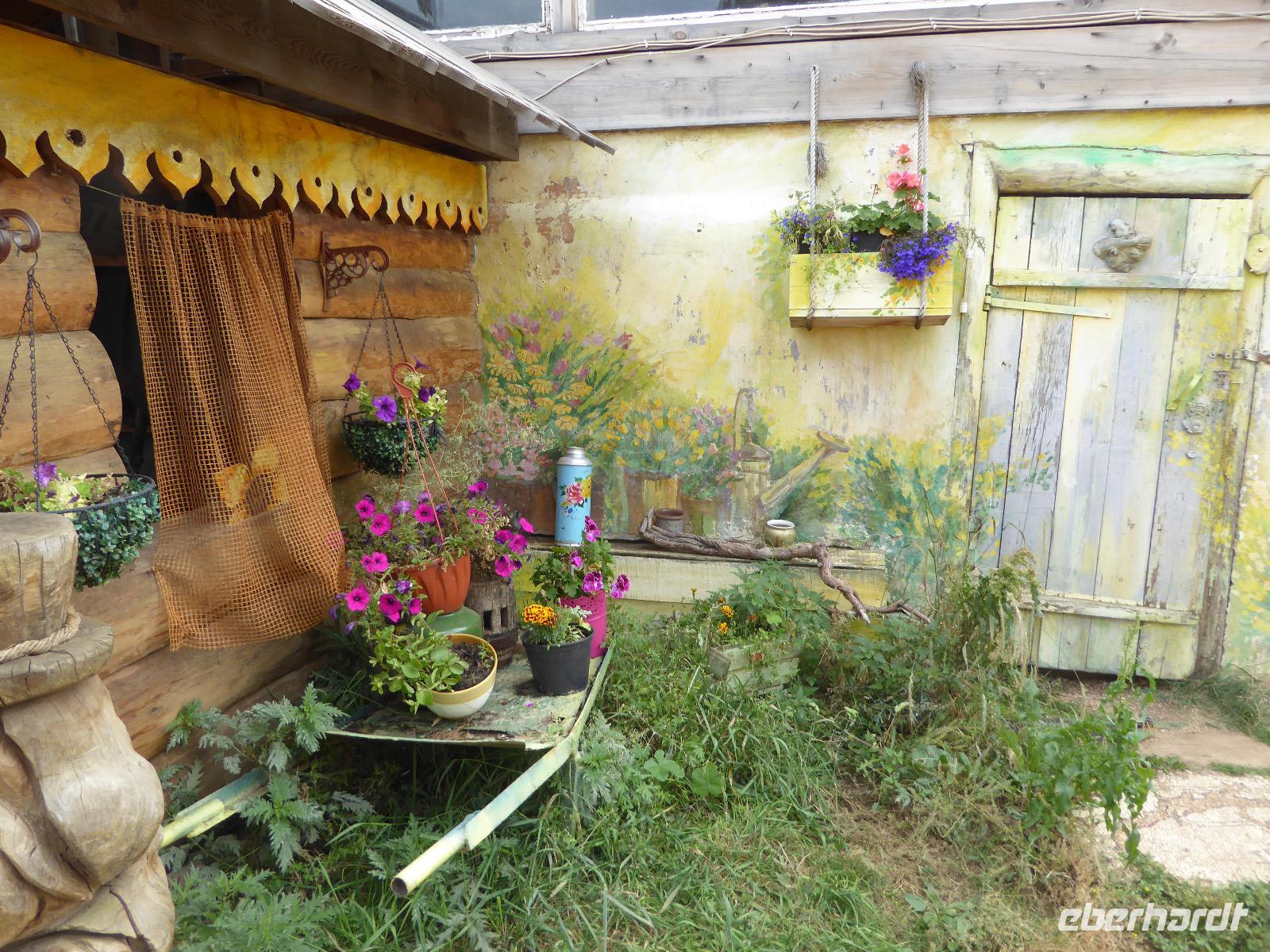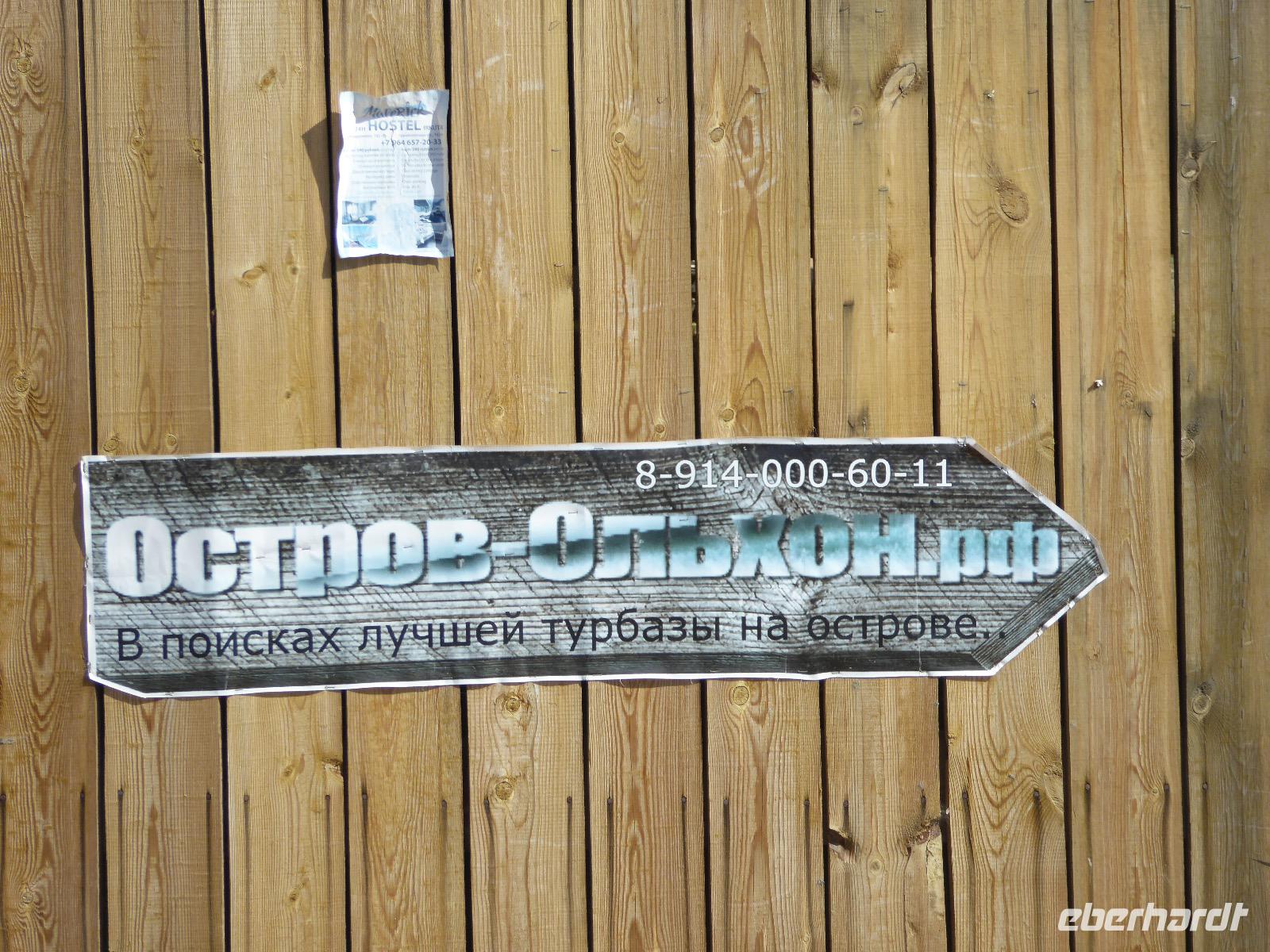 Wir können ausschlafen. Frühstück gibt es um neun. Im kleinen Magasin kaufen wir wieder für unser Picknick ein. Die Fähre zur Insel Olchon fährt um halb zwölf. In einer viertel Stunde sind wir schon da. Da es in den letzten Tagen auch hier geregnet hat, können wir nicht, wie geplant am Ostufer spazieren gehen. Wir suchen uns einen schönen Platz fürs Picknick und machen es uns gemütlich. Schnell haben die Männer Tisch und Stühle aufgebaut und Frauenhände das Obst, Gemüse und die Wurst aufgeschnitten. An frischer Luft schmeckts doch am besten. Nachmittags erreichen wir Nikita Bencharwos Camp, unsere Unterkunft für die nächsten Tage. Das Camp erinnert an ein Fort. Viele kleine Holzhäuser sind in bunter Reihenfolge auf einem Areal erbaut. Jedes hat eine andere Form und ist mit Bildern aus russischen Märchen geschmückt oder von verschiedenen Künstlern mit Blumenbildern verziert. Es gibt ein paar Räume, die sich Restaurant nennen, das französische Restaurant ist eher eine gemütliche Kneipe und die anderen eher Speiseräume, alles geschmückt mit russischen Utensilien. Nachdem die Zimmer verteilt sind, schnappt sich jeder ein Trinkgefäß, vom Zahnputzbecher über Gläser jeglicher Form bis zu russischen Teetassen ist alles dabei. Wir spazieren zum Schamanka, dem berühmten Schamanenfelsen, dessen Abbildung neben der Baikalrobbe auf keinem Souvenir fehlen darf. Die Felszeichnung wurden 2003 fast vollständig von Touristen übersprüht, die hier ihr eigenes Signum hinterlassen wollten. Ein halbnackter Pilger verkauft allerlei selbstgeschnitzten Schmuck aus Holz und neben ihm trällert ein russisches Mädchen unermüdlich Lieder zur Gitarre. Wir suchen uns einen Platz mit schöner Aussicht auf Schamanka und stoßen mit russichem Champagner auf Sibirien, den Baikalsee und das großartige Leben an.