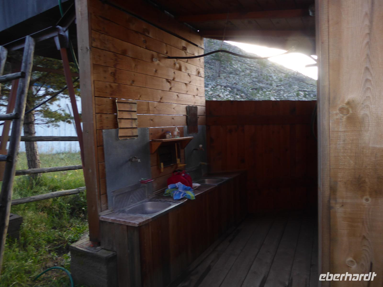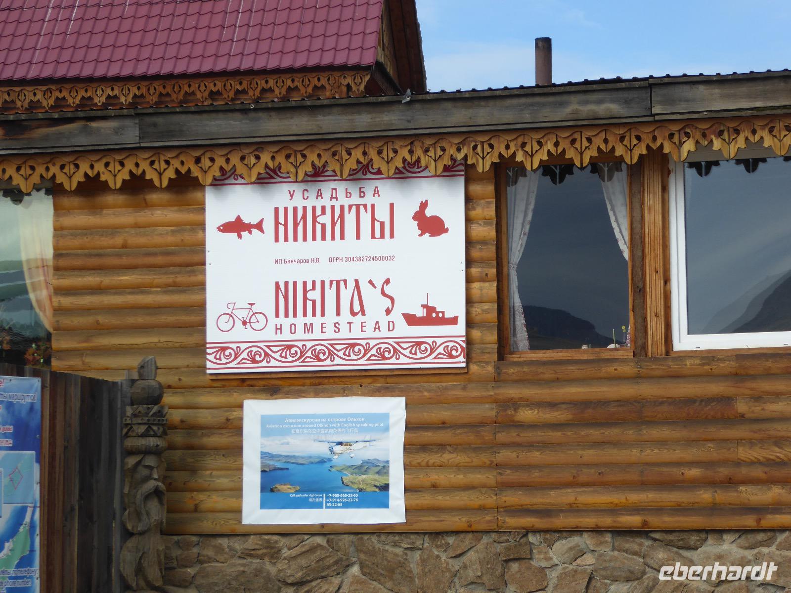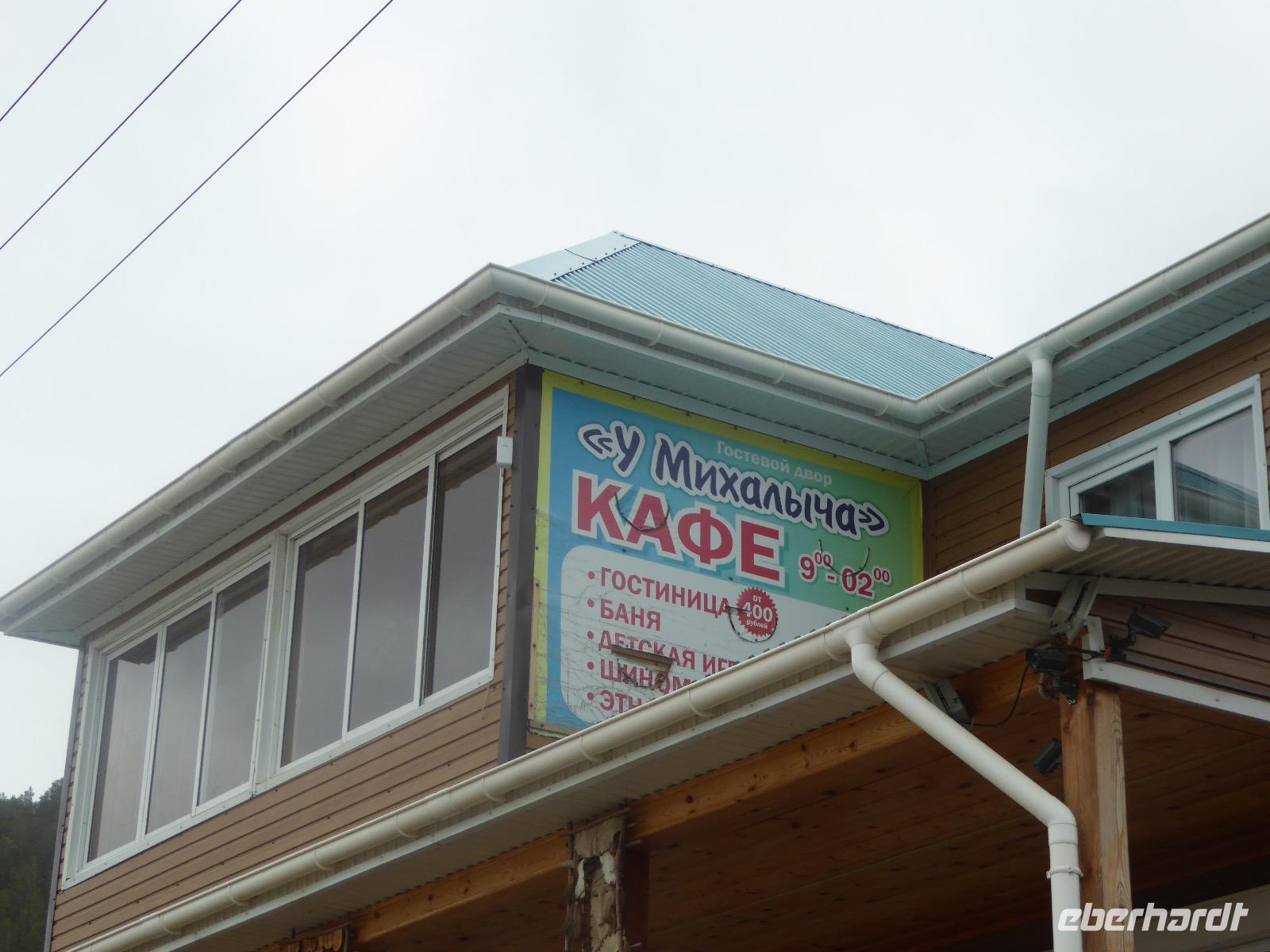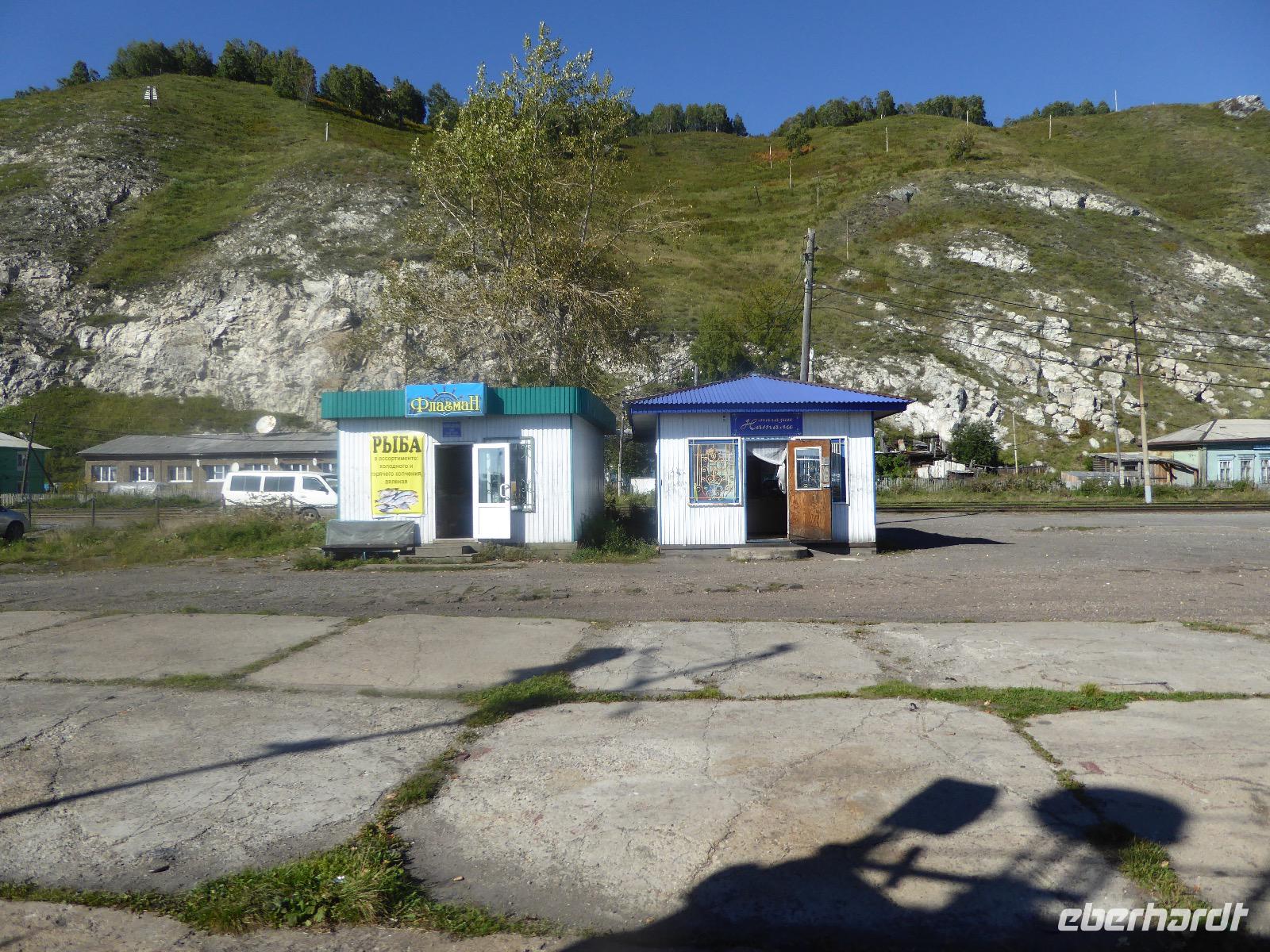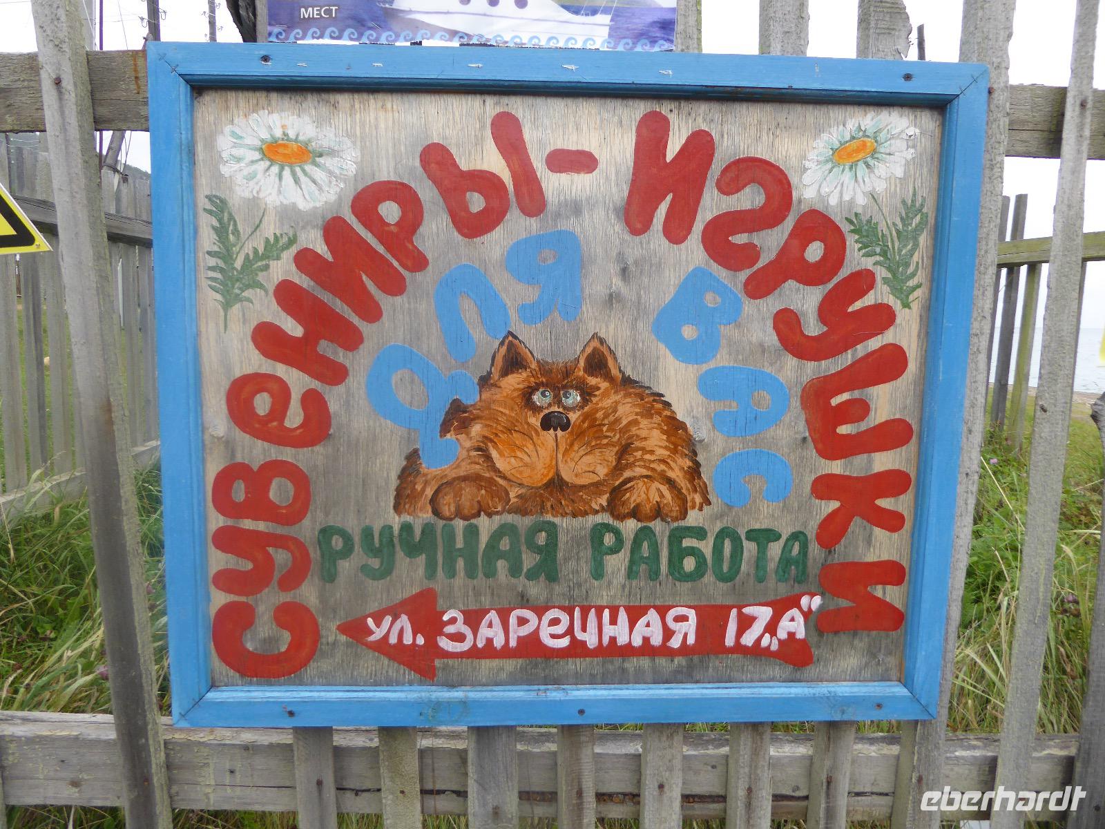 Wir können ausschlafen. Frühstück gibt es um neun. Im kleinen Magasin kaufen wir wieder für unser Picknick ein. Die Fähre zur Insel Olchon fährt um halb zwölf. In einer viertel Stunde sind wir schon da. Da es in den letzten Tagen auch hier geregnet hat, können wir nicht, wie geplant am Ostufer spazieren gehen. Wir suchen uns einen schönen Platz fürs Picknick und machen es uns gemütlich. Schnell haben die Männer Tisch und Stühle aufgebaut und Frauenhände das Obst, Gemüse und die Wurst aufgeschnitten. An frischer Luft schmeckts doch am besten. Nachmittags erreichen wir Nikita Bencharwos Camp, unsere Unterkunft für die nächsten Tage. Das Camp erinnert an ein Fort. Viele kleine Holzhäuser sind in bunter Reihenfolge auf einem Areal erbaut. Jedes hat eine andere Form und ist mit Bildern aus russischen Märchen geschmückt oder von verschiedenen Künstlern mit Blumenbildern verziert. Es gibt ein paar Räume, die sich Restaurant nennen, das französische Restaurant ist eher eine gemütliche Kneipe und die anderen eher Speiseräume, alles geschmückt mit russischen Utensilien. Nachdem die Zimmer verteilt sind, schnappt sich jeder ein Trinkgefäß, vom Zahnputzbecher über Gläser jeglicher Form bis zu russischen Teetassen ist alles dabei. Wir spazieren zum Schamanka, dem berühmten Schamanenfelsen, dessen Abbildung neben der Baikalrobbe auf keinem Souvenir fehlen darf. Die Felszeichnung wurden 2003 fast vollständig von Touristen übersprüht, die hier ihr eigenes Signum hinterlassen wollten. Ein halbnackter Pilger verkauft allerlei selbstgeschnitzten Schmuck aus Holz und neben ihm trällert ein russisches Mädchen unermüdlich Lieder zur Gitarre. Wir suchen uns einen Platz mit schöner Aussicht auf Schamanka und stoßen mit russichem Champagner auf Sibirien, den Baikalsee und das großartige Leben an.