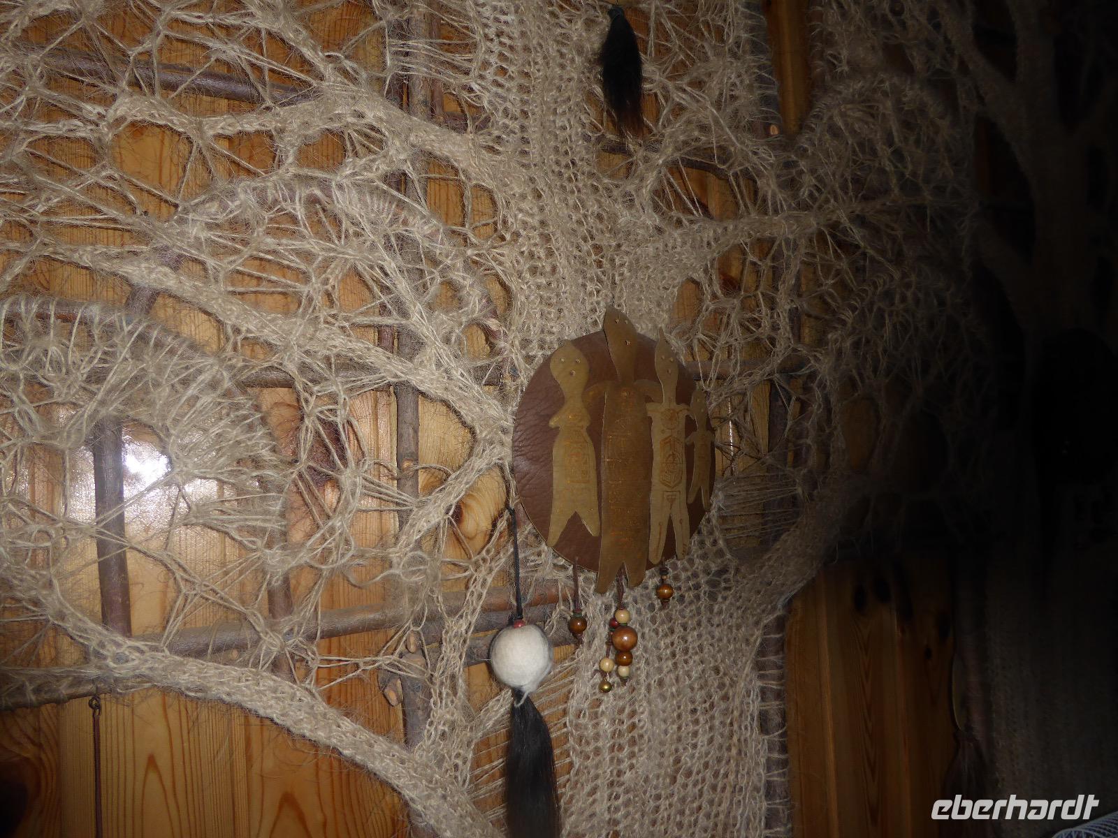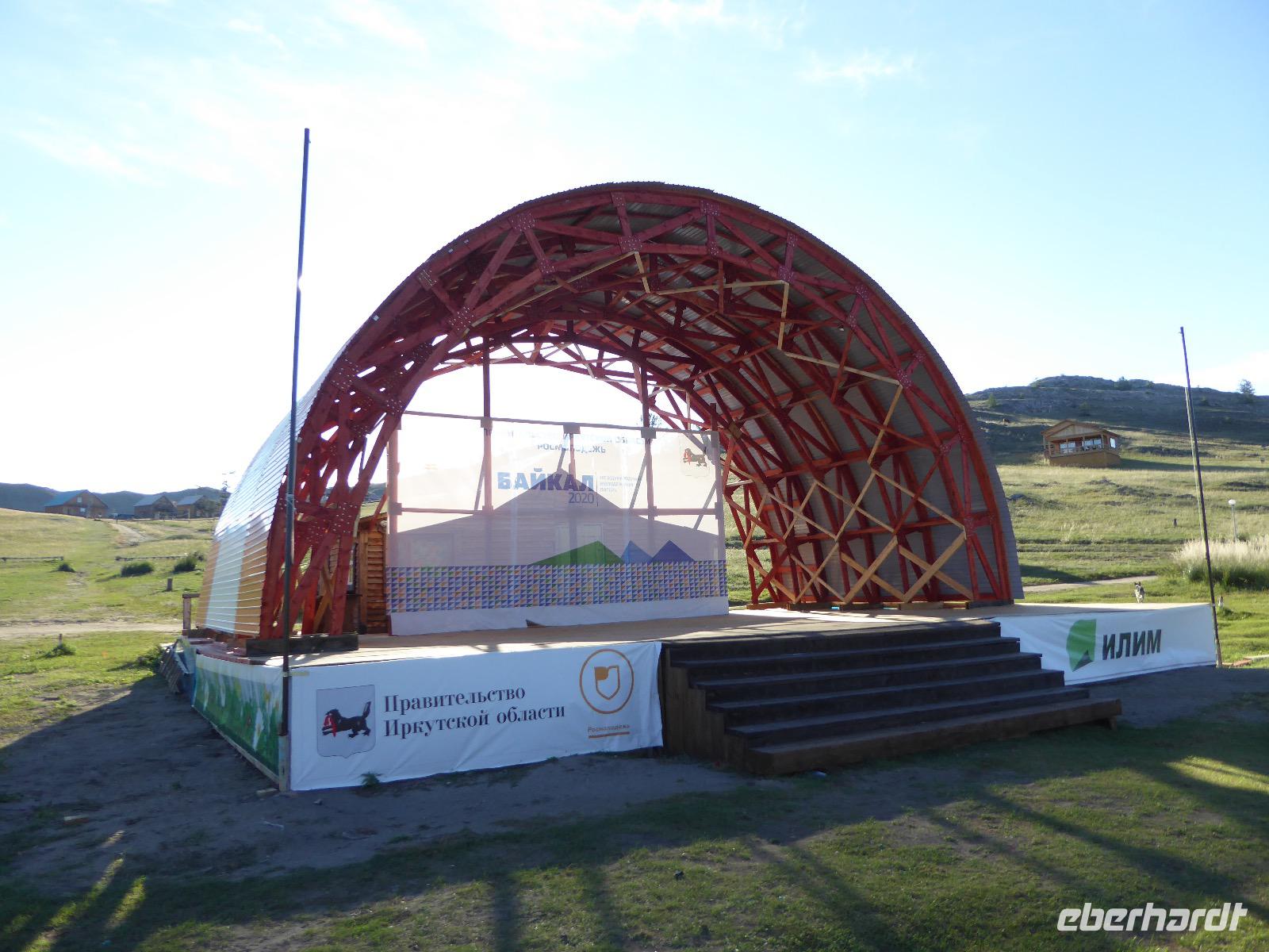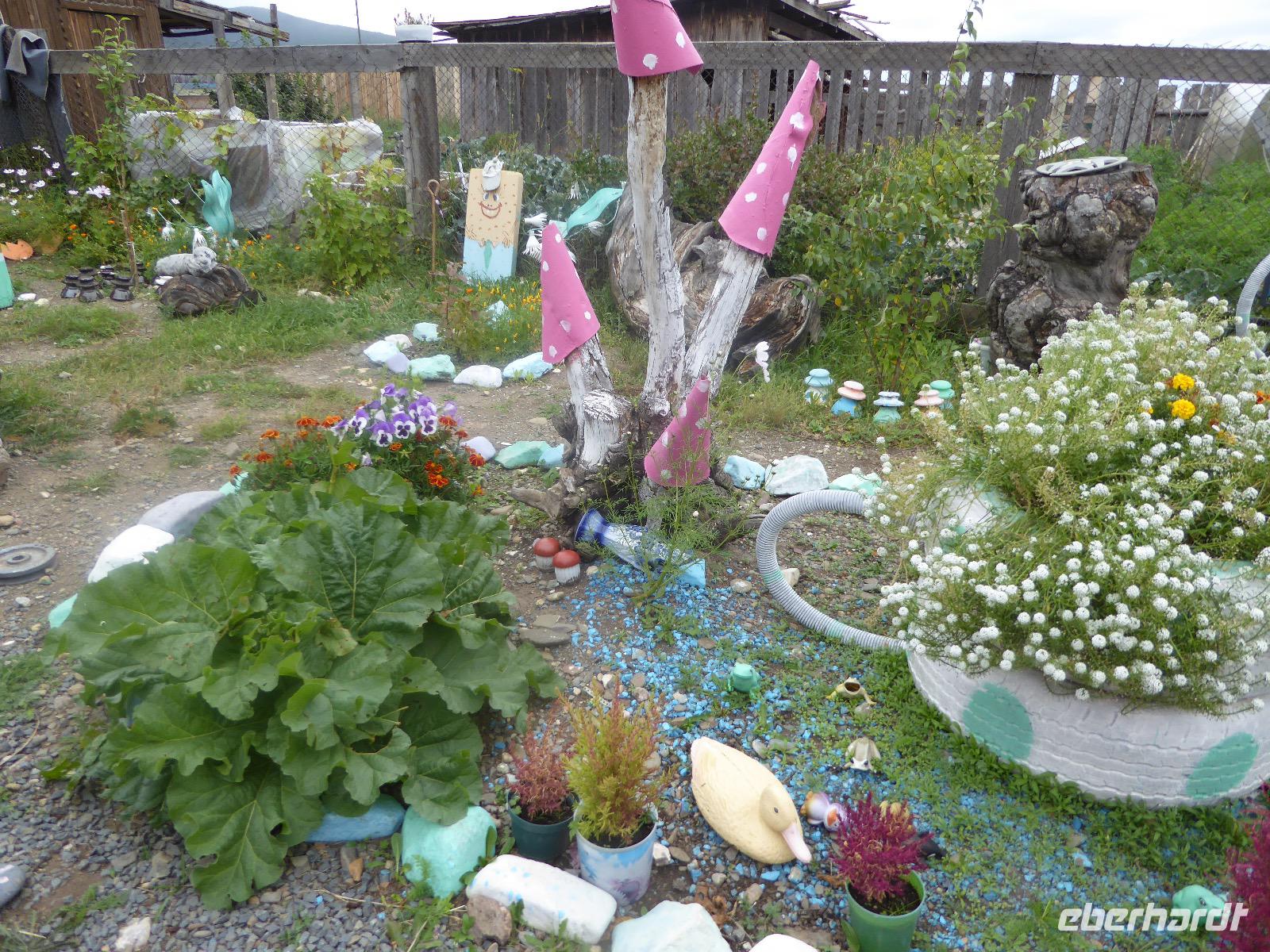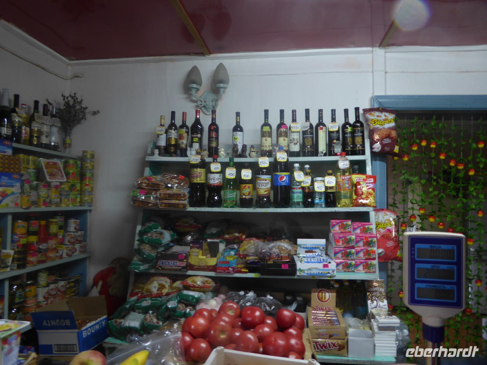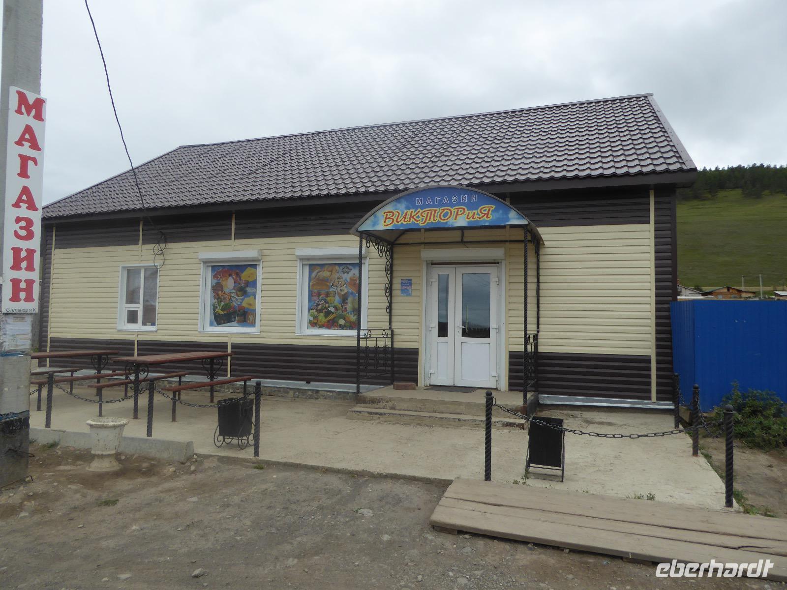 Wir können ausschlafen. Frühstück gibt es um neun. Im kleinen Magasin kaufen wir wieder für unser Picknick ein. Die Fähre zur Insel Olchon fährt um halb zwölf. In einer viertel Stunde sind wir schon da. Da es in den letzten Tagen auch hier geregnet hat, können wir nicht, wie geplant am Ostufer spazieren gehen. Wir suchen uns einen schönen Platz fürs Picknick und machen es uns gemütlich. Schnell haben die Männer Tisch und Stühle aufgebaut und Frauenhände das Obst, Gemüse und die Wurst aufgeschnitten. An frischer Luft schmeckts doch am besten. Nachmittags erreichen wir Nikita Bencharwos Camp, unsere Unterkunft für die nächsten Tage. Das Camp erinnert an ein Fort. Viele kleine Holzhäuser sind in bunter Reihenfolge auf einem Areal erbaut. Jedes hat eine andere Form und ist mit Bildern aus russischen Märchen geschmückt oder von verschiedenen Künstlern mit Blumenbildern verziert. Es gibt ein paar Räume, die sich Restaurant nennen, das französische Restaurant ist eher eine gemütliche Kneipe und die anderen eher Speiseräume, alles geschmückt mit russischen Utensilien. Nachdem die Zimmer verteilt sind, schnappt sich jeder ein Trinkgefäß, vom Zahnputzbecher über Gläser jeglicher Form bis zu russischen Teetassen ist alles dabei. Wir spazieren zum Schamanka, dem berühmten Schamanenfelsen, dessen Abbildung neben der Baikalrobbe auf keinem Souvenir fehlen darf. Die Felszeichnung wurden 2003 fast vollständig von Touristen übersprüht, die hier ihr eigenes Signum hinterlassen wollten. Ein halbnackter Pilger verkauft allerlei selbstgeschnitzten Schmuck aus Holz und neben ihm trällert ein russisches Mädchen unermüdlich Lieder zur Gitarre. Wir suchen uns einen Platz mit schöner Aussicht auf Schamanka und stoßen mit russichem Champagner auf Sibirien, den Baikalsee und das großartige Leben an.