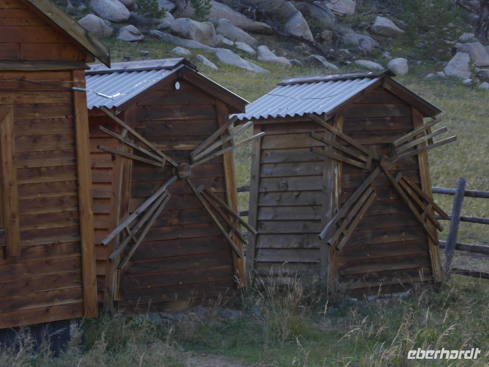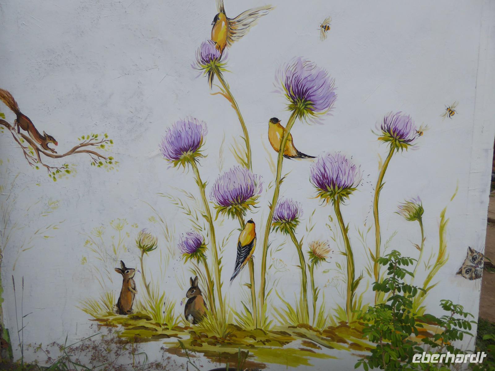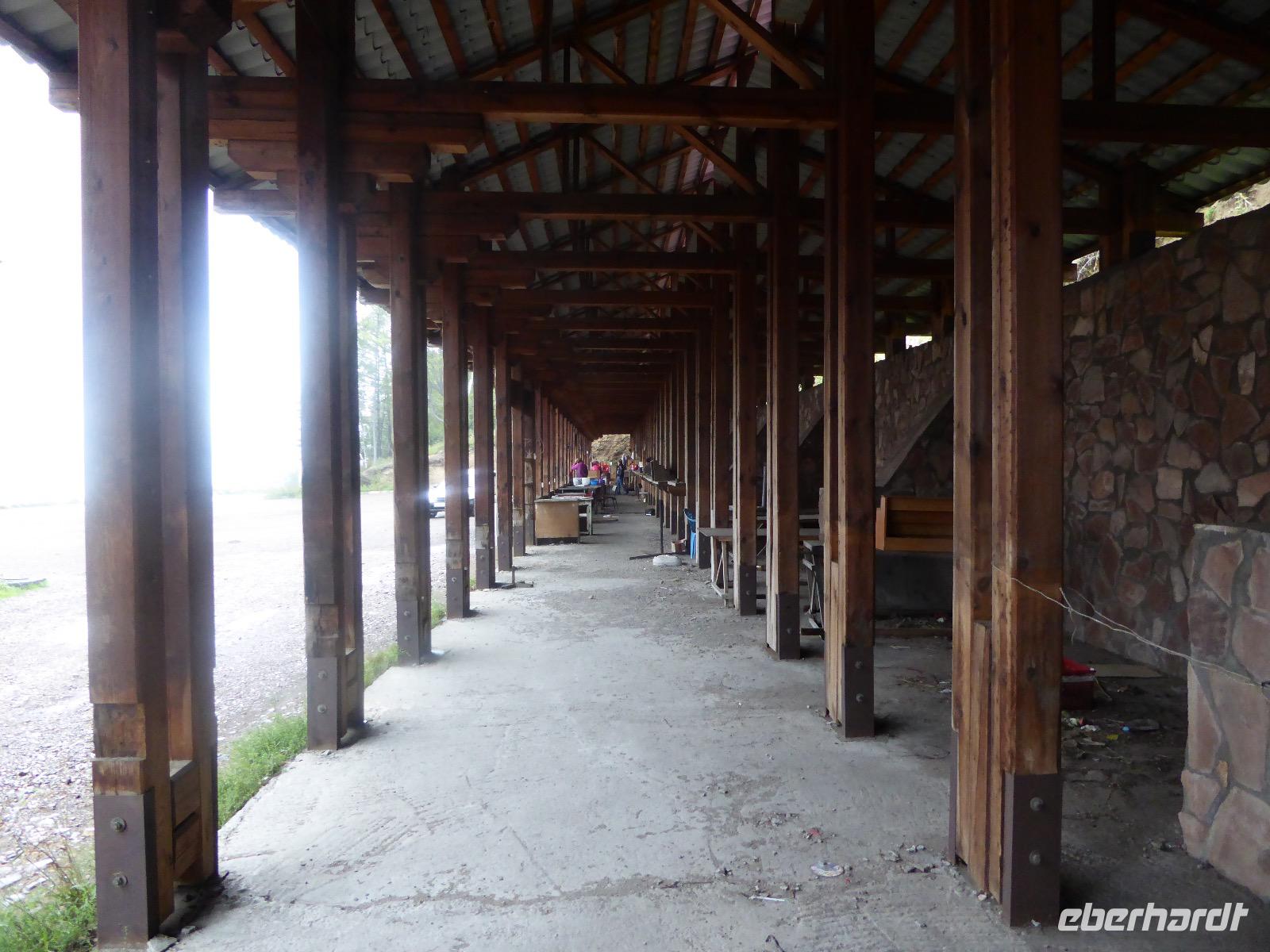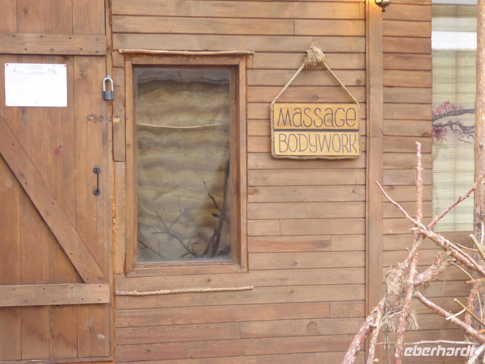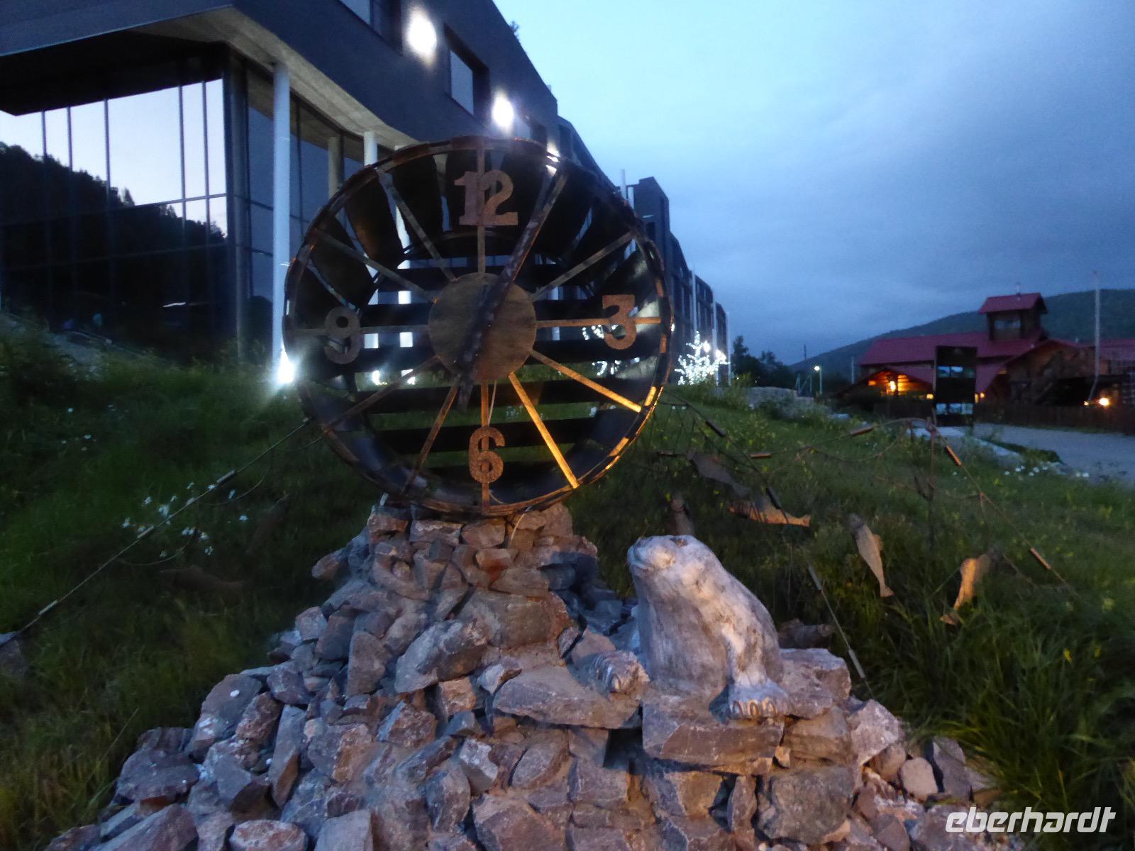 Wir können ausschlafen. Frühstück gibt es um neun. Im kleinen Magasin kaufen wir wieder für unser Picknick ein. Die Fähre zur Insel Olchon fährt um halb zwölf. In einer viertel Stunde sind wir schon da. Da es in den letzten Tagen auch hier geregnet hat, können wir nicht, wie geplant am Ostufer spazieren gehen. Wir suchen uns einen schönen Platz fürs Picknick und machen es uns gemütlich. Schnell haben die Männer Tisch und Stühle aufgebaut und Frauenhände das Obst, Gemüse und die Wurst aufgeschnitten. An frischer Luft schmeckts doch am besten. Nachmittags erreichen wir Nikita Bencharwos Camp, unsere Unterkunft für die nächsten Tage. Das Camp erinnert an ein Fort. Viele kleine Holzhäuser sind in bunter Reihenfolge auf einem Areal erbaut. Jedes hat eine andere Form und ist mit Bildern aus russischen Märchen geschmückt oder von verschiedenen Künstlern mit Blumenbildern verziert. Es gibt ein paar Räume, die sich Restaurant nennen, das französische Restaurant ist eher eine gemütliche Kneipe und die anderen eher Speiseräume, alles geschmückt mit russischen Utensilien. Nachdem die Zimmer verteilt sind, schnappt sich jeder ein Trinkgefäß, vom Zahnputzbecher über Gläser jeglicher Form bis zu russischen Teetassen ist alles dabei. Wir spazieren zum Schamanka, dem berühmten Schamanenfelsen, dessen Abbildung neben der Baikalrobbe auf keinem Souvenir fehlen darf. Die Felszeichnung wurden 2003 fast vollständig von Touristen übersprüht, die hier ihr eigenes Signum hinterlassen wollten. Ein halbnackter Pilger verkauft allerlei selbstgeschnitzten Schmuck aus Holz und neben ihm trällert ein russisches Mädchen unermüdlich Lieder zur Gitarre. Wir suchen uns einen Platz mit schöner Aussicht auf Schamanka und stoßen mit russichem Champagner auf Sibirien, den Baikalsee und das großartige Leben an.
