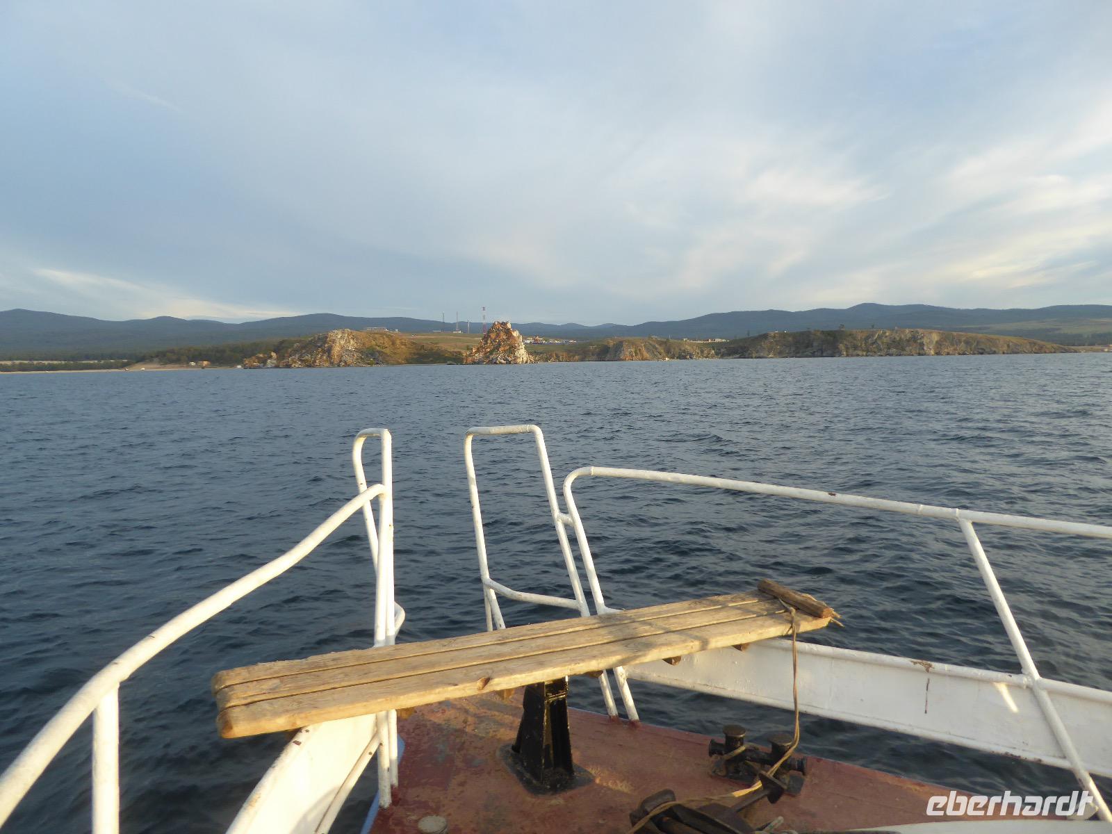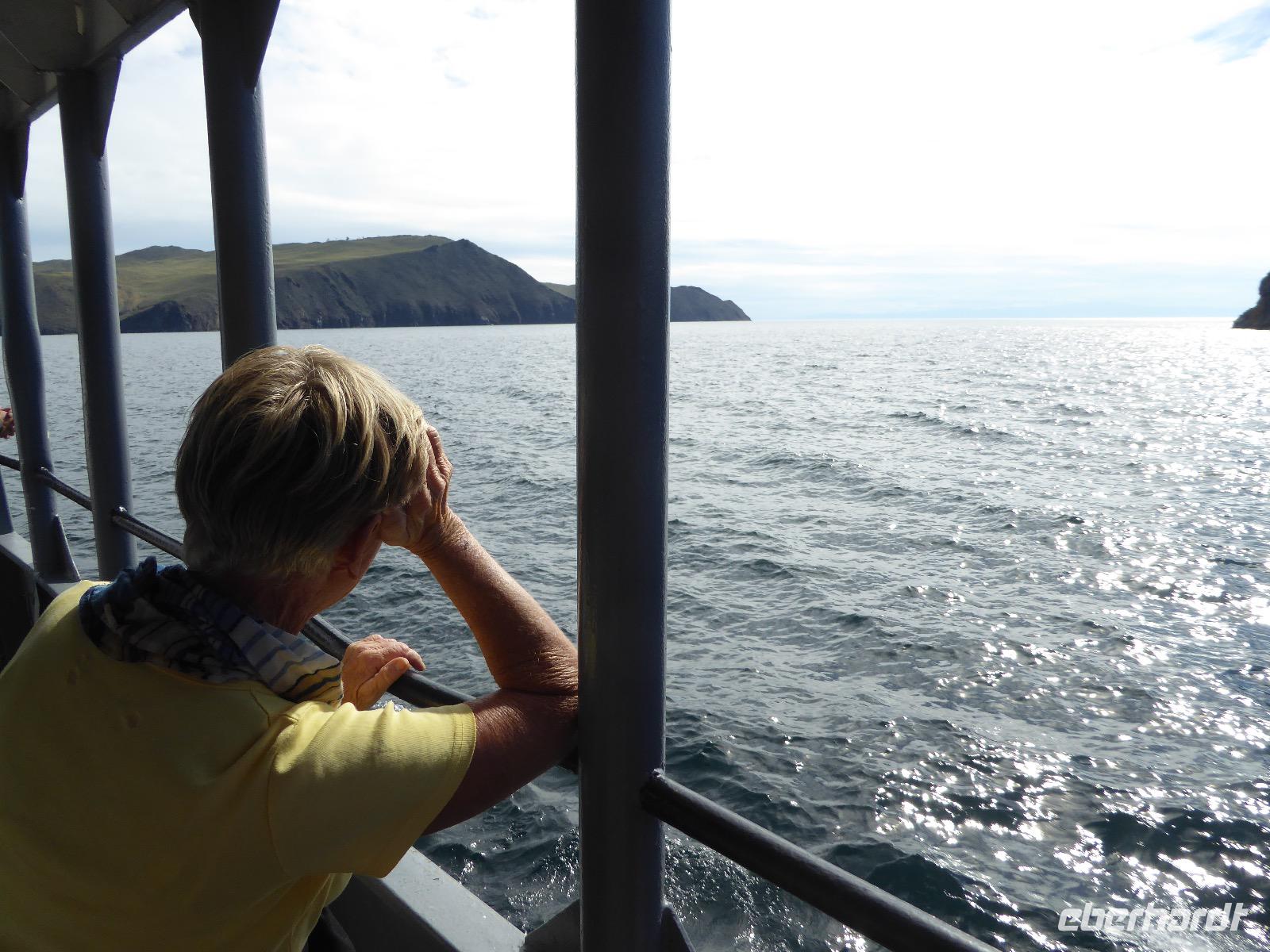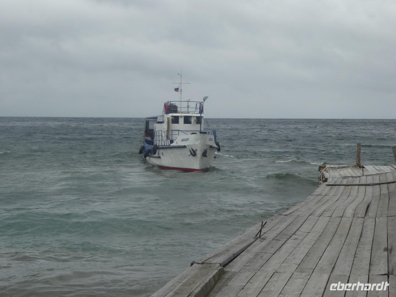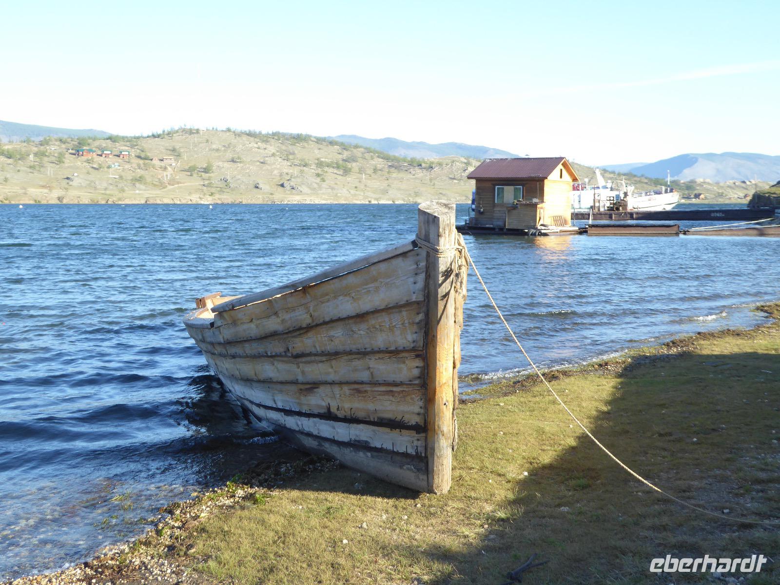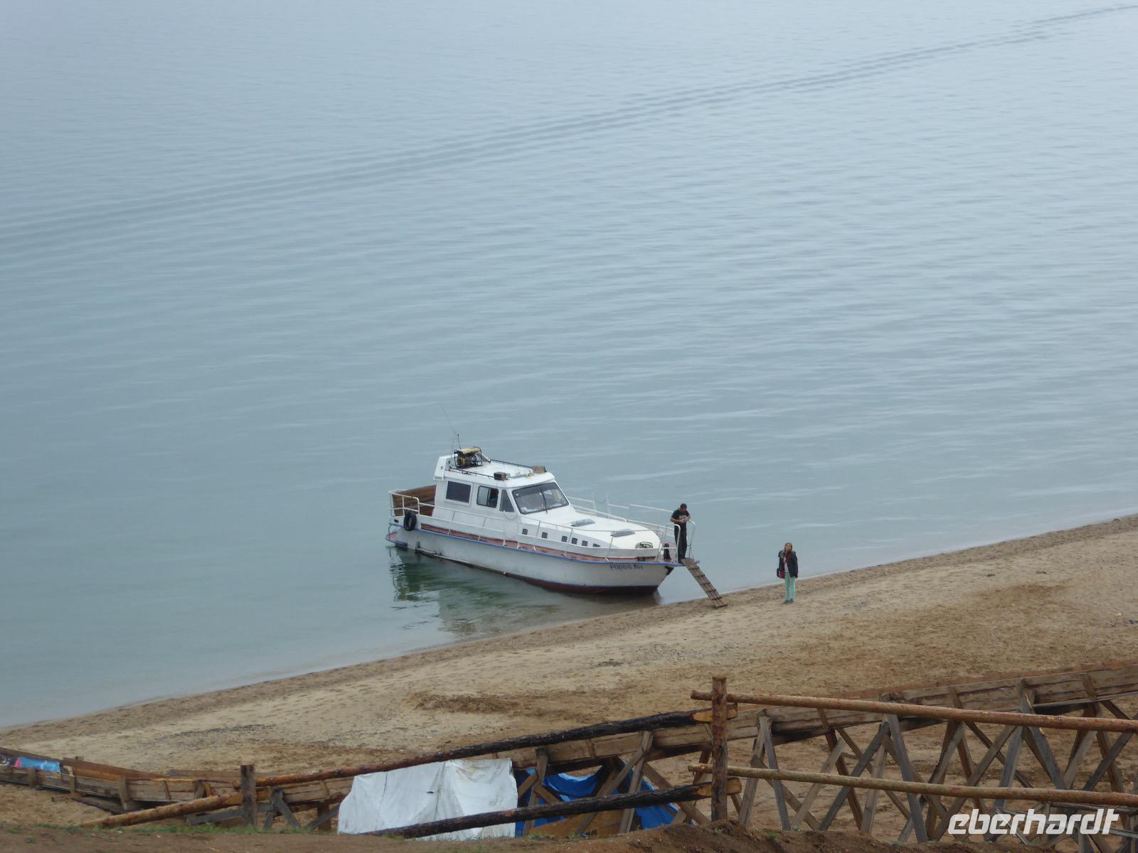 Fröhlich begrüßt uns Nikita beim Frühstück. Gut gesättigt begeben wir uns zum Strand am Baikalsee, wo ein kleines Boot mit einer seltsamen Mannschaft auf uns wartet. Der Kapitän sieht aus als wäre er hundert Jahre alt (Chris bekommt später heraus, dass er erst 64 ist), der eine Bootsmann ist total betrunken und für das leibliche Wohl sorgt eine russische Frau, die ihre 16jährige Tochter dabei hat. Wir erklimmen das Schiff und versuchen, es uns gemütlich zu machen. Das ist nicht so einfach, denn hinten sind nur 4 Plätze, vorne zieht es wie verrückt und drinnen ist es zwar warm, aber stickig, es riecht nach Kerosin, Nikotin und Fisch. Irgendwann haben wir uns eingerichtet und schippern über den Baikalsee. Nach ein paar Stunden erreichen wir die unbewohnte Insel Ogoj, wo wir aussteigen und zur tibetischen Stupa laufen. Diese barfuß zu umrunden, befreit von allen Sünden. Allerdings muss man es mindestens drei mal oder sieben mal oder über einhundert mal machen, für letzteres reicht die Zeit nicht. Zum Schiff zurück gekehrt, erwartet uns der gedeckte Tisch. Es gibt Suppe aus der uns ein lustiger Fischkopf angrinst. Hm... Die Suppe schmeckt, man muss ja den Fischkopf nicht mit essen. Jetzt hat unser Kapitän seine Musikanlage entdeckt. Fröhlich klingen russiche Lieder scheppernd aus dem Lautsprecher. Zum Ententanz und Letkiss hält es uns nicht mehr auf den Bänken und wir legen ein wackeres Tänzchen hin. Noch einmal legt unser Schiffchen an. Inzwischen haben sich dicke Wolken am Himmel breit gemacht und unser Kapitän hält uns an, uns zu beeilen, da er unruhige See erwartet. Wir wandern zu berühmten Heilquellen querfeldein und einen steilen Berg hinauf. In matschiger Modderpampe läuft aus zwei nicht sehr Vertrauen erweckenden Rohren Wasser auf den Waldboden. Es ist nicht ganz klar, ob die rechte Leitung für Frauen ist und die linke für Männer oder umgekehrt. Nach müßiger Diskussion kehren wir zum Schiff zurück. Die Wolken haben sich verzogen und es ist noch Zeit für einen leckeren Posy. Bier ist aus. Die nächste Lieferung kommt erst in einer halben Stunde, da sind wir schon weg. Unser Rückweg wird weiterhin von lauter Musik begleitet. Zum Abendessen sind wir wieder zurück. Nikita lädt uns zu einem Musikabend ein, aber wir sind zu erschöpft und können uns nicht dazu aufraffen.