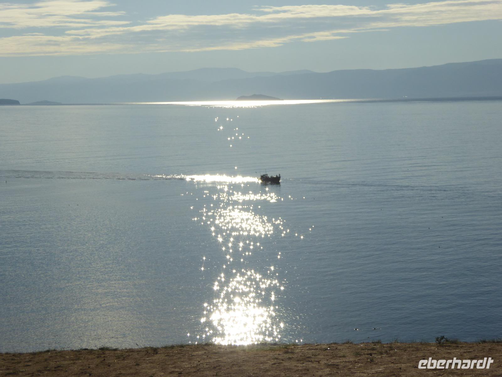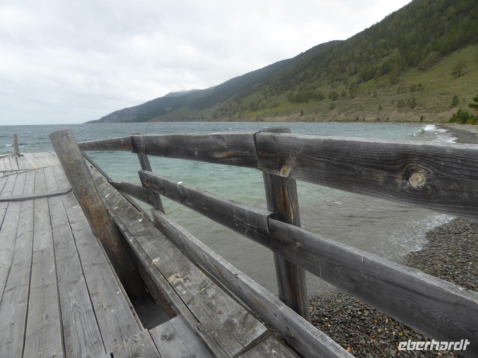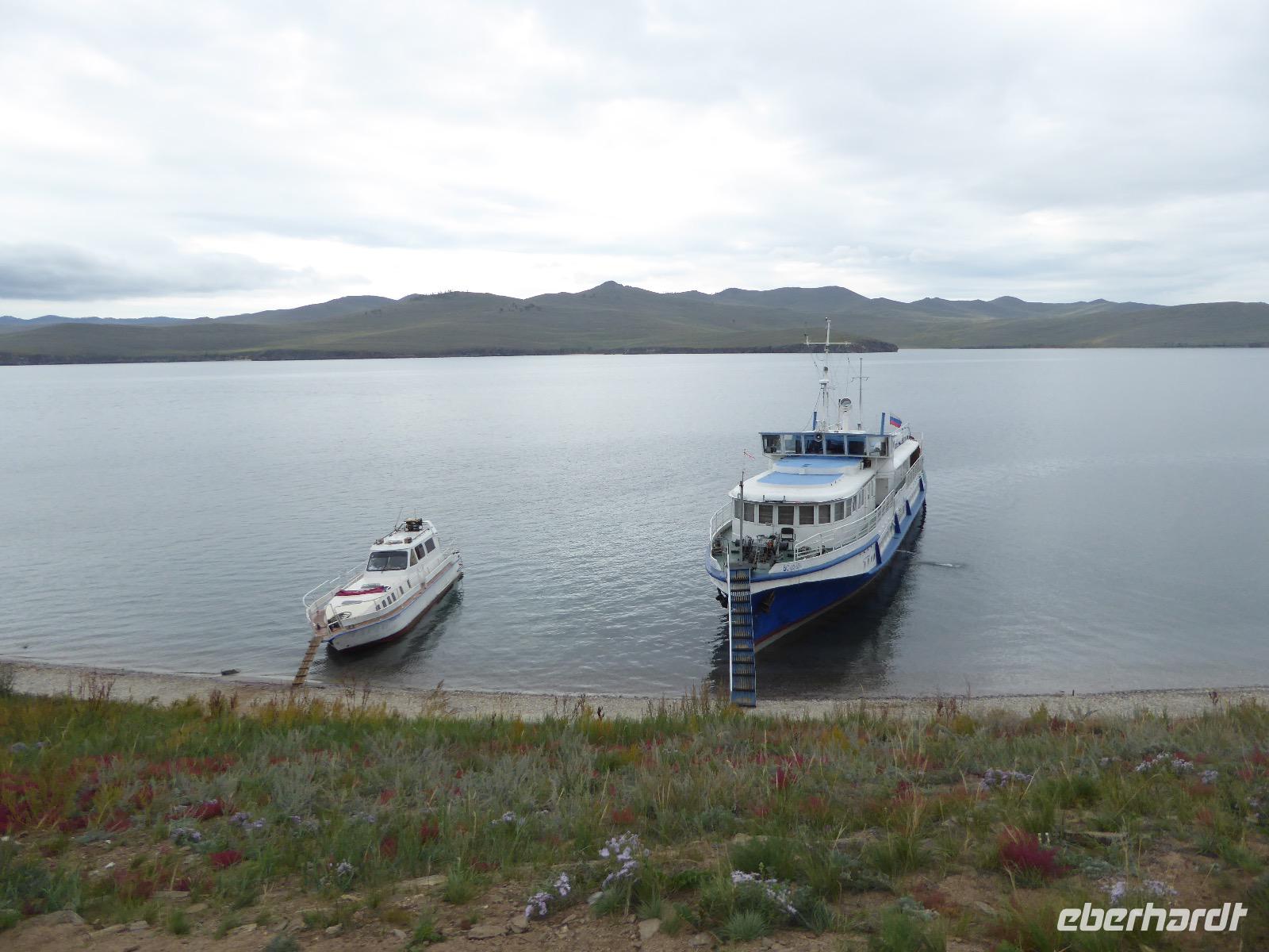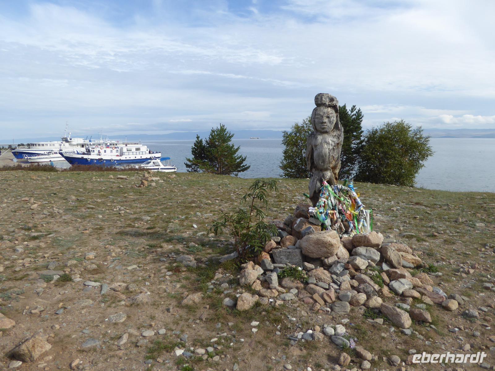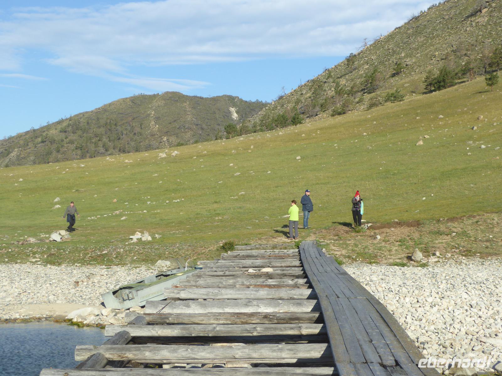 Fröhlich begrüßt uns Nikita beim Frühstück. Gut gesättigt begeben wir uns zum Strand am Baikalsee, wo ein kleines Boot mit einer seltsamen Mannschaft auf uns wartet. Der Kapitän sieht aus als wäre er hundert Jahre alt (Chris bekommt später heraus, dass er erst 64 ist), der eine Bootsmann ist total betrunken und für das leibliche Wohl sorgt eine russische Frau, die ihre 16jährige Tochter dabei hat. Wir erklimmen das Schiff und versuchen, es uns gemütlich zu machen. Das ist nicht so einfach, denn hinten sind nur 4 Plätze, vorne zieht es wie verrückt und drinnen ist es zwar warm, aber stickig, es riecht nach Kerosin, Nikotin und Fisch. Irgendwann haben wir uns eingerichtet und schippern über den Baikalsee. Nach ein paar Stunden erreichen wir die unbewohnte Insel Ogoj, wo wir aussteigen und zur tibetischen Stupa laufen. Diese barfuß zu umrunden, befreit von allen Sünden. Allerdings muss man es mindestens drei mal oder sieben mal oder über einhundert mal machen, für letzteres reicht die Zeit nicht. Zum Schiff zurück gekehrt, erwartet uns der gedeckte Tisch. Es gibt Suppe aus der uns ein lustiger Fischkopf angrinst. Hm... Die Suppe schmeckt, man muss ja den Fischkopf nicht mit essen. Jetzt hat unser Kapitän seine Musikanlage entdeckt. Fröhlich klingen russiche Lieder scheppernd aus dem Lautsprecher. Zum Ententanz und Letkiss hält es uns nicht mehr auf den Bänken und wir legen ein wackeres Tänzchen hin. Noch einmal legt unser Schiffchen an. Inzwischen haben sich dicke Wolken am Himmel breit gemacht und unser Kapitän hält uns an, uns zu beeilen, da er unruhige See erwartet. Wir wandern zu berühmten Heilquellen querfeldein und einen steilen Berg hinauf. In matschiger Modderpampe läuft aus zwei nicht sehr Vertrauen erweckenden Rohren Wasser auf den Waldboden. Es ist nicht ganz klar, ob die rechte Leitung für Frauen ist und die linke für Männer oder umgekehrt. Nach müßiger Diskussion kehren wir zum Schiff zurück. Die Wolken haben sich verzogen und es ist noch Zeit für einen leckeren Posy. Bier ist aus. Die nächste Lieferung kommt erst in einer halben Stunde, da sind wir schon weg. Unser Rückweg wird weiterhin von lauter Musik begleitet. Zum Abendessen sind wir wieder zurück. Nikita lädt uns zu einem Musikabend ein, aber wir sind zu erschöpft und können uns nicht dazu aufraffen.