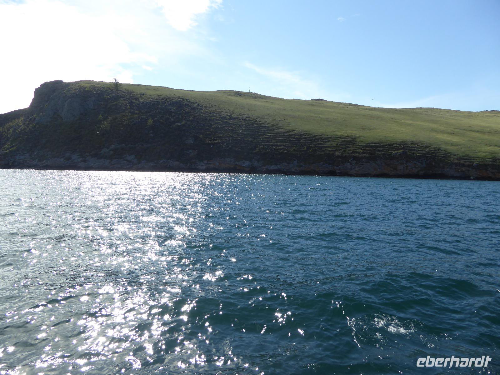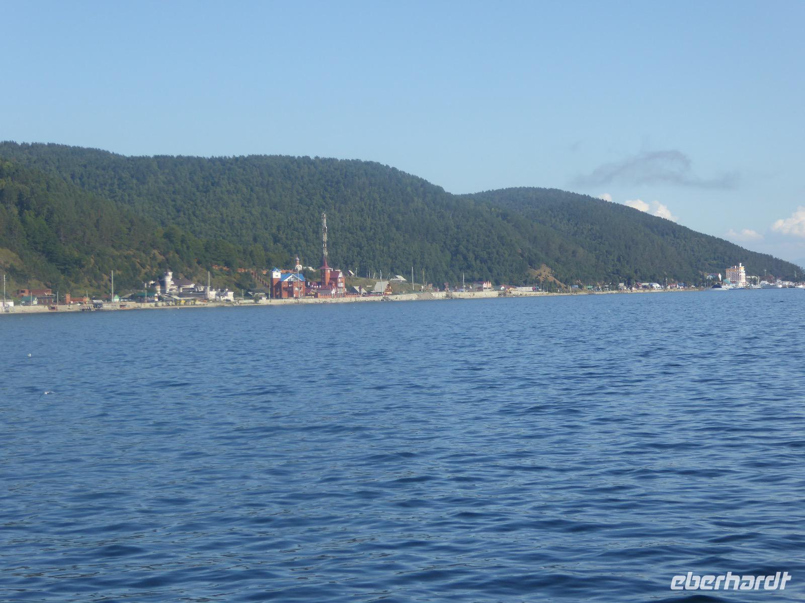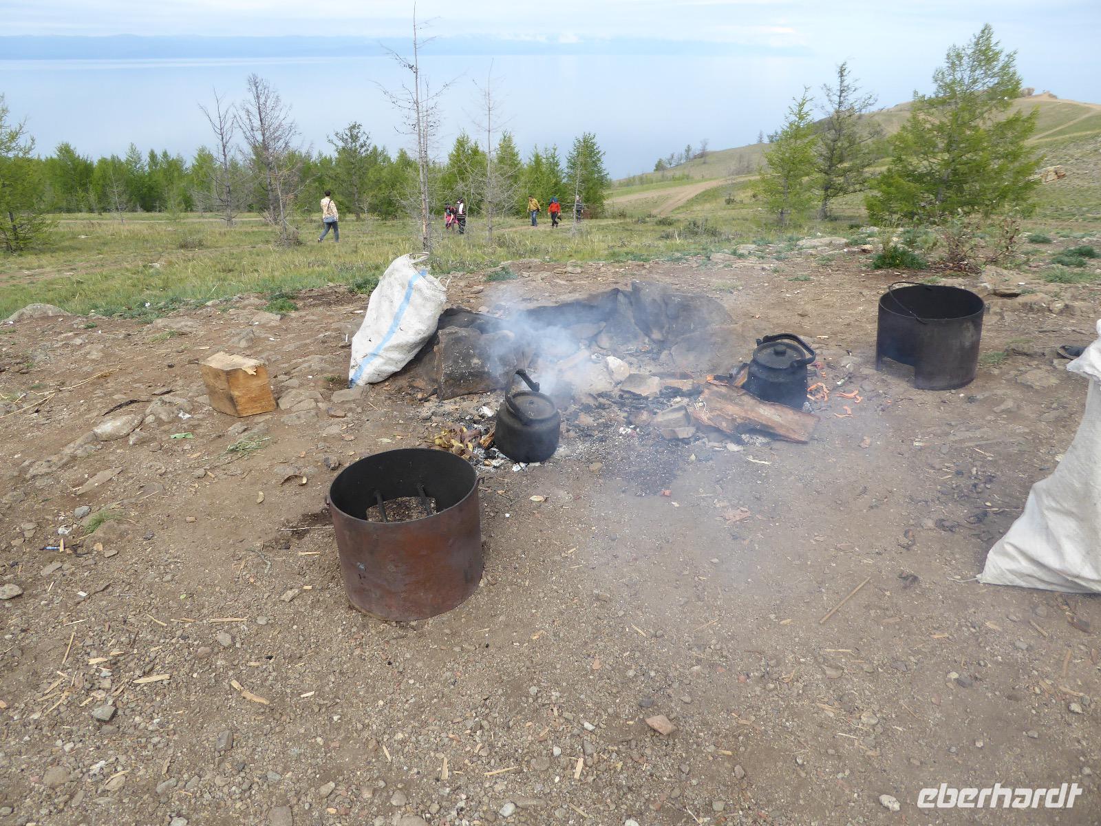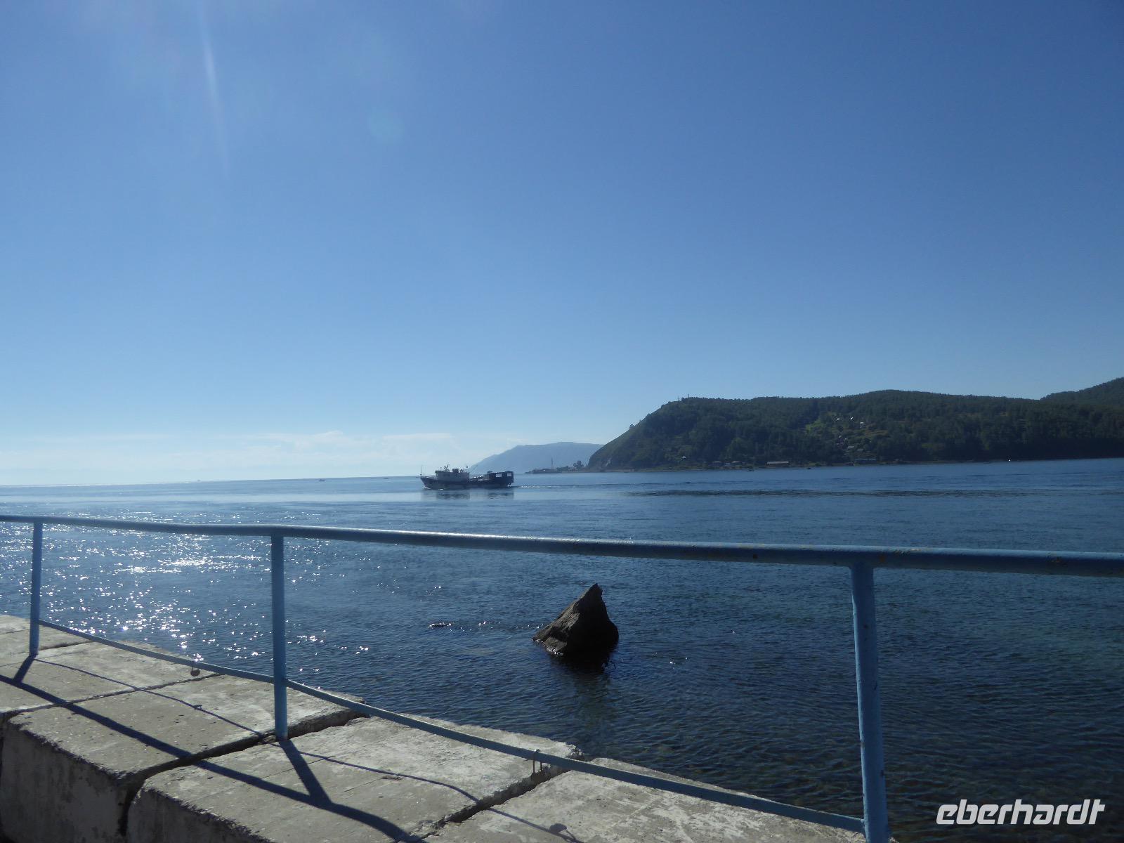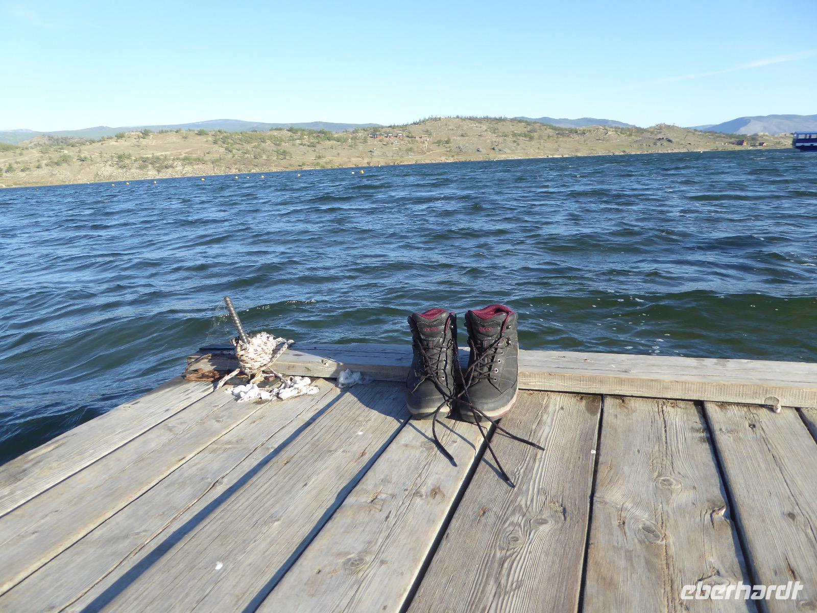 Fröhlich begrüßt uns Nikita beim Frühstück. Gut gesättigt begeben wir uns zum Strand am Baikalsee, wo ein kleines Boot mit einer seltsamen Mannschaft auf uns wartet. Der Kapitän sieht aus als wäre er hundert Jahre alt (Chris bekommt später heraus, dass er erst 64 ist), der eine Bootsmann ist total betrunken und für das leibliche Wohl sorgt eine russische Frau, die ihre 16jährige Tochter dabei hat. Wir erklimmen das Schiff und versuchen, es uns gemütlich zu machen. Das ist nicht so einfach, denn hinten sind nur 4 Plätze, vorne zieht es wie verrückt und drinnen ist es zwar warm, aber stickig, es riecht nach Kerosin, Nikotin und Fisch. Irgendwann haben wir uns eingerichtet und schippern über den Baikalsee. Nach ein paar Stunden erreichen wir die unbewohnte Insel Ogoj, wo wir aussteigen und zur tibetischen Stupa laufen. Diese barfuß zu umrunden, befreit von allen Sünden. Allerdings muss man es mindestens drei mal oder sieben mal oder über einhundert mal machen, für letzteres reicht die Zeit nicht. Zum Schiff zurück gekehrt, erwartet uns der gedeckte Tisch. Es gibt Suppe aus der uns ein lustiger Fischkopf angrinst. Hm... Die Suppe schmeckt, man muss ja den Fischkopf nicht mit essen. Jetzt hat unser Kapitän seine Musikanlage entdeckt. Fröhlich klingen russiche Lieder scheppernd aus dem Lautsprecher. Zum Ententanz und Letkiss hält es uns nicht mehr auf den Bänken und wir legen ein wackeres Tänzchen hin. Noch einmal legt unser Schiffchen an. Inzwischen haben sich dicke Wolken am Himmel breit gemacht und unser Kapitän hält uns an, uns zu beeilen, da er unruhige See erwartet. Wir wandern zu berühmten Heilquellen querfeldein und einen steilen Berg hinauf. In matschiger Modderpampe läuft aus zwei nicht sehr Vertrauen erweckenden Rohren Wasser auf den Waldboden. Es ist nicht ganz klar, ob die rechte Leitung für Frauen ist und die linke für Männer oder umgekehrt. Nach müßiger Diskussion kehren wir zum Schiff zurück. Die Wolken haben sich verzogen und es ist noch Zeit für einen leckeren Posy. Bier ist aus. Die nächste Lieferung kommt erst in einer halben Stunde, da sind wir schon weg. Unser Rückweg wird weiterhin von lauter Musik begleitet. Zum Abendessen sind wir wieder zurück. Nikita lädt uns zu einem Musikabend ein, aber wir sind zu erschöpft und können uns nicht dazu aufraffen.