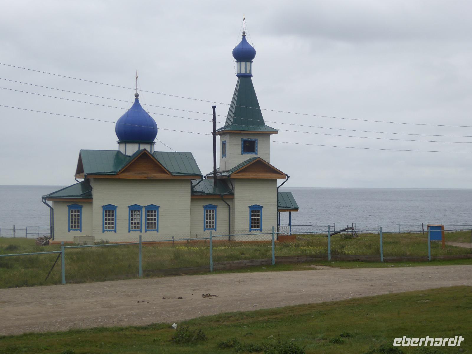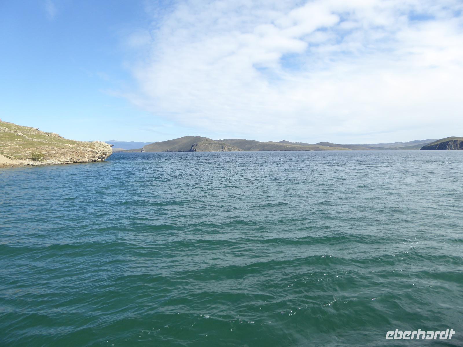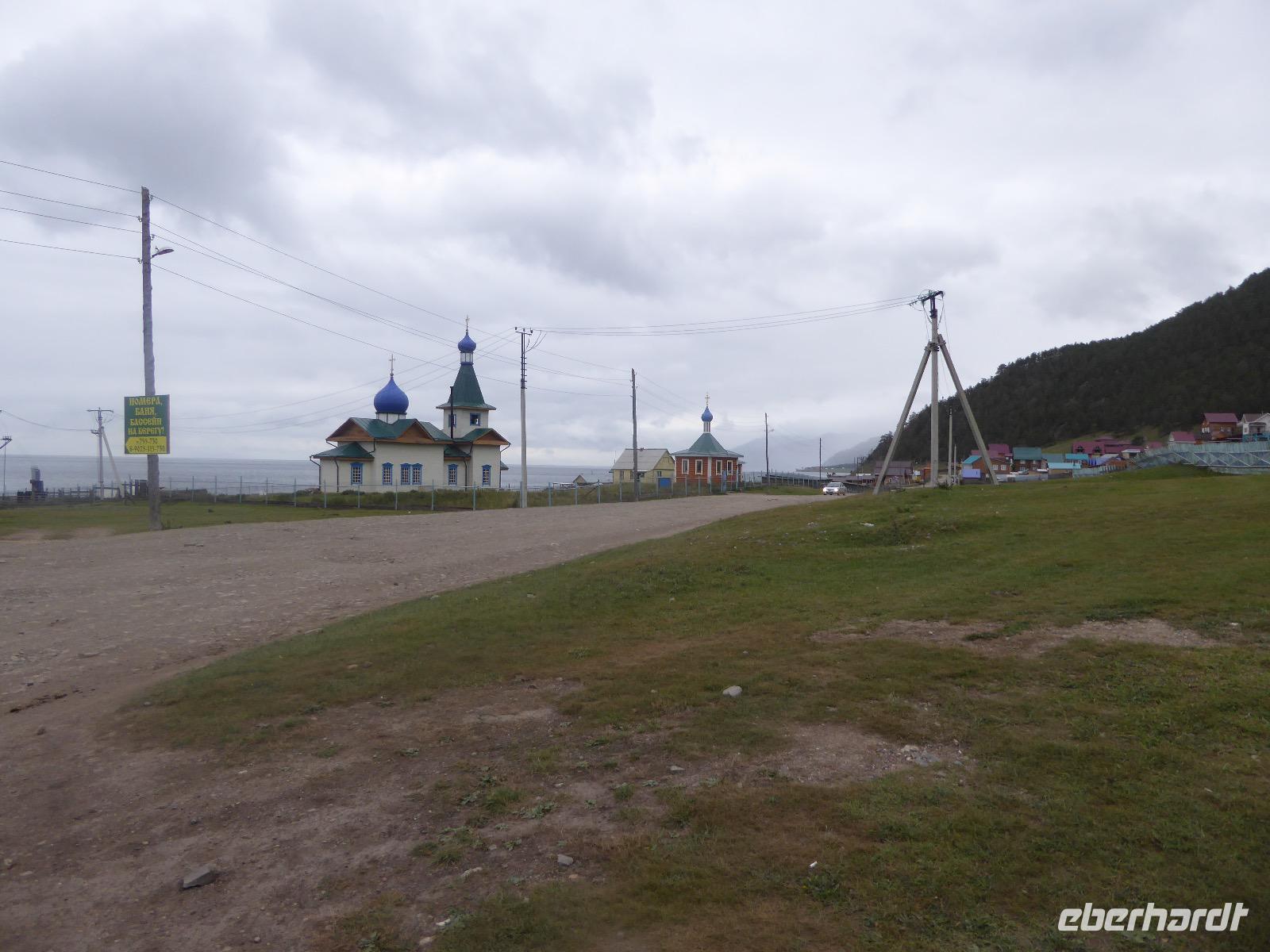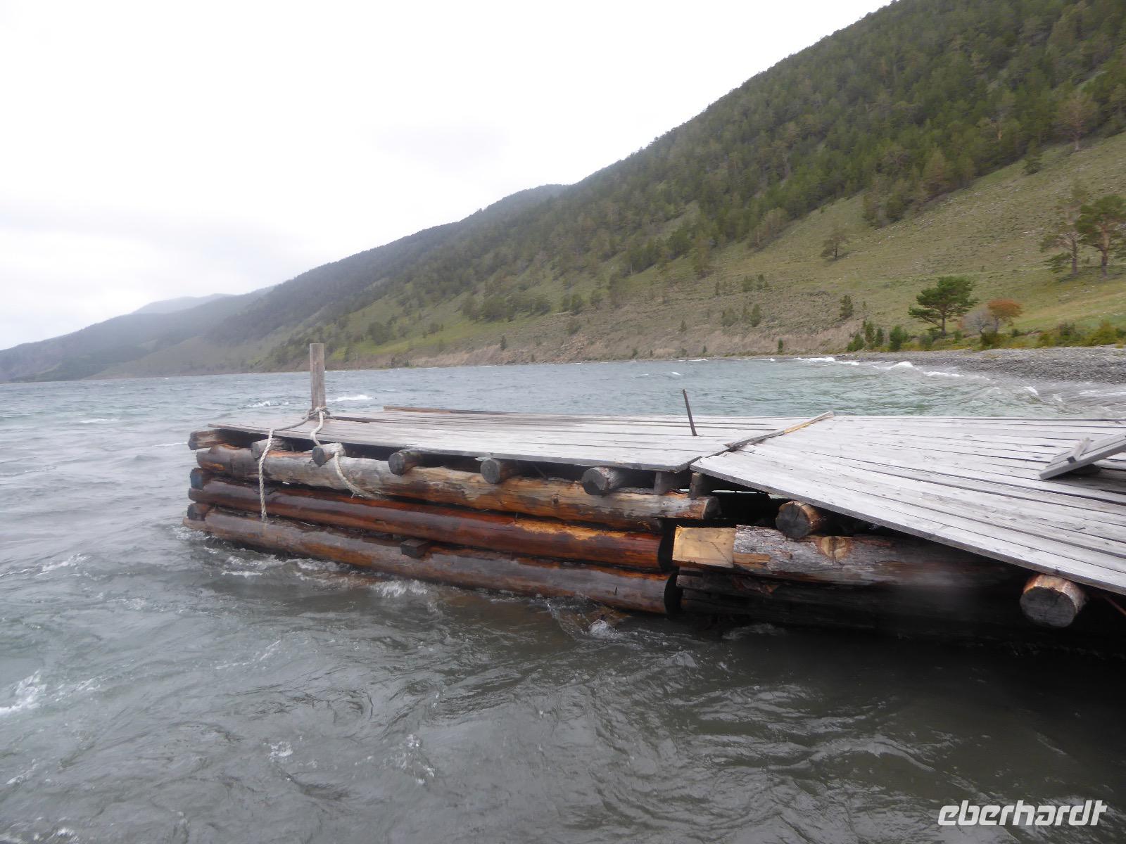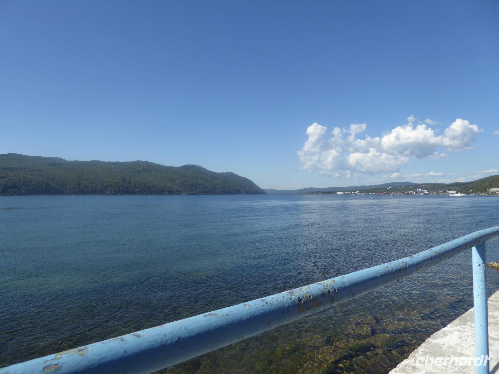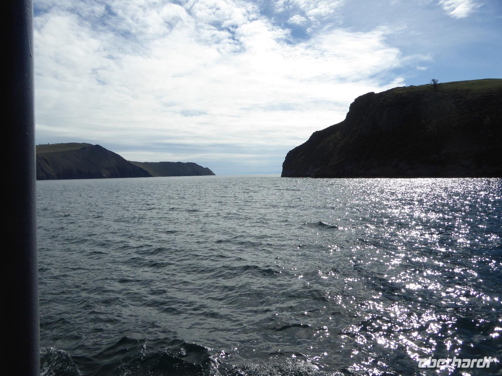 Fröhlich begrüßt uns Nikita beim Frühstück. Gut gesättigt begeben wir uns zum Strand am Baikalsee, wo ein kleines Boot mit einer seltsamen Mannschaft auf uns wartet. Der Kapitän sieht aus als wäre er hundert Jahre alt (Chris bekommt später heraus, dass er erst 64 ist), der eine Bootsmann ist total betrunken und für das leibliche Wohl sorgt eine russische Frau, die ihre 16jährige Tochter dabei hat. Wir erklimmen das Schiff und versuchen, es uns gemütlich zu machen. Das ist nicht so einfach, denn hinten sind nur 4 Plätze, vorne zieht es wie verrückt und drinnen ist es zwar warm, aber stickig, es riecht nach Kerosin, Nikotin und Fisch. Irgendwann haben wir uns eingerichtet und schippern über den Baikalsee. Nach ein paar Stunden erreichen wir die unbewohnte Insel Ogoj, wo wir aussteigen und zur tibetischen Stupa laufen. Diese barfuß zu umrunden, befreit von allen Sünden. Allerdings muss man es mindestens drei mal oder sieben mal oder über einhundert mal machen, für letzteres reicht die Zeit nicht. Zum Schiff zurück gekehrt, erwartet uns der gedeckte Tisch. Es gibt Suppe aus der uns ein lustiger Fischkopf angrinst. Hm... Die Suppe schmeckt, man muss ja den Fischkopf nicht mit essen. Jetzt hat unser Kapitän seine Musikanlage entdeckt. Fröhlich klingen russiche Lieder scheppernd aus dem Lautsprecher. Zum Ententanz und Letkiss hält es uns nicht mehr auf den Bänken und wir legen ein wackeres Tänzchen hin. Noch einmal legt unser Schiffchen an. Inzwischen haben sich dicke Wolken am Himmel breit gemacht und unser Kapitän hält uns an, uns zu beeilen, da er unruhige See erwartet. Wir wandern zu berühmten Heilquellen querfeldein und einen steilen Berg hinauf. In matschiger Modderpampe läuft aus zwei nicht sehr Vertrauen erweckenden Rohren Wasser auf den Waldboden. Es ist nicht ganz klar, ob die rechte Leitung für Frauen ist und die linke für Männer oder umgekehrt. Nach müßiger Diskussion kehren wir zum Schiff zurück. Die Wolken haben sich verzogen und es ist noch Zeit für einen leckeren Posy. Bier ist aus. Die nächste Lieferung kommt erst in einer halben Stunde, da sind wir schon weg. Unser Rückweg wird weiterhin von lauter Musik begleitet. Zum Abendessen sind wir wieder zurück. Nikita lädt uns zu einem Musikabend ein, aber wir sind zu erschöpft und können uns nicht dazu aufraffen.
