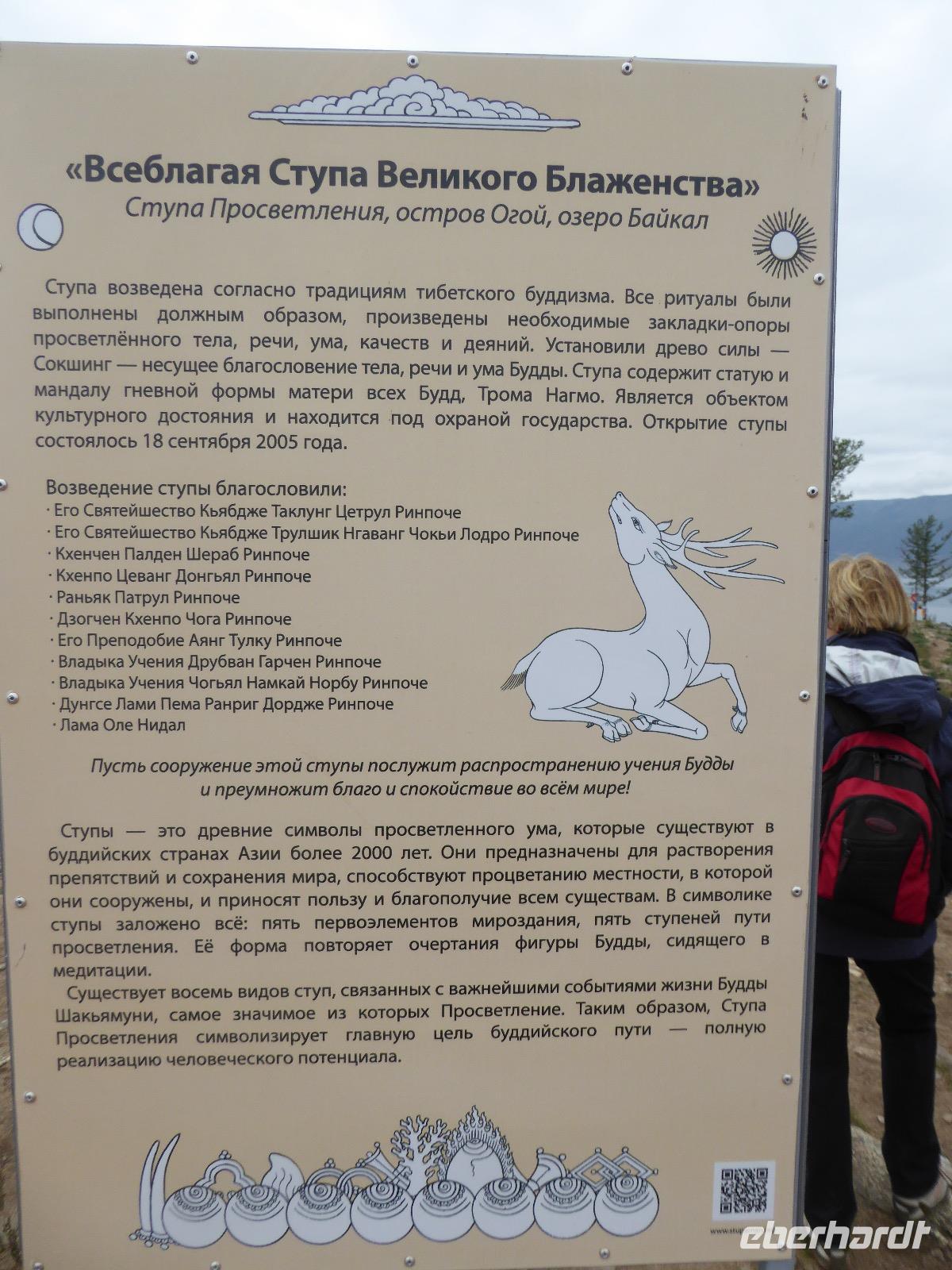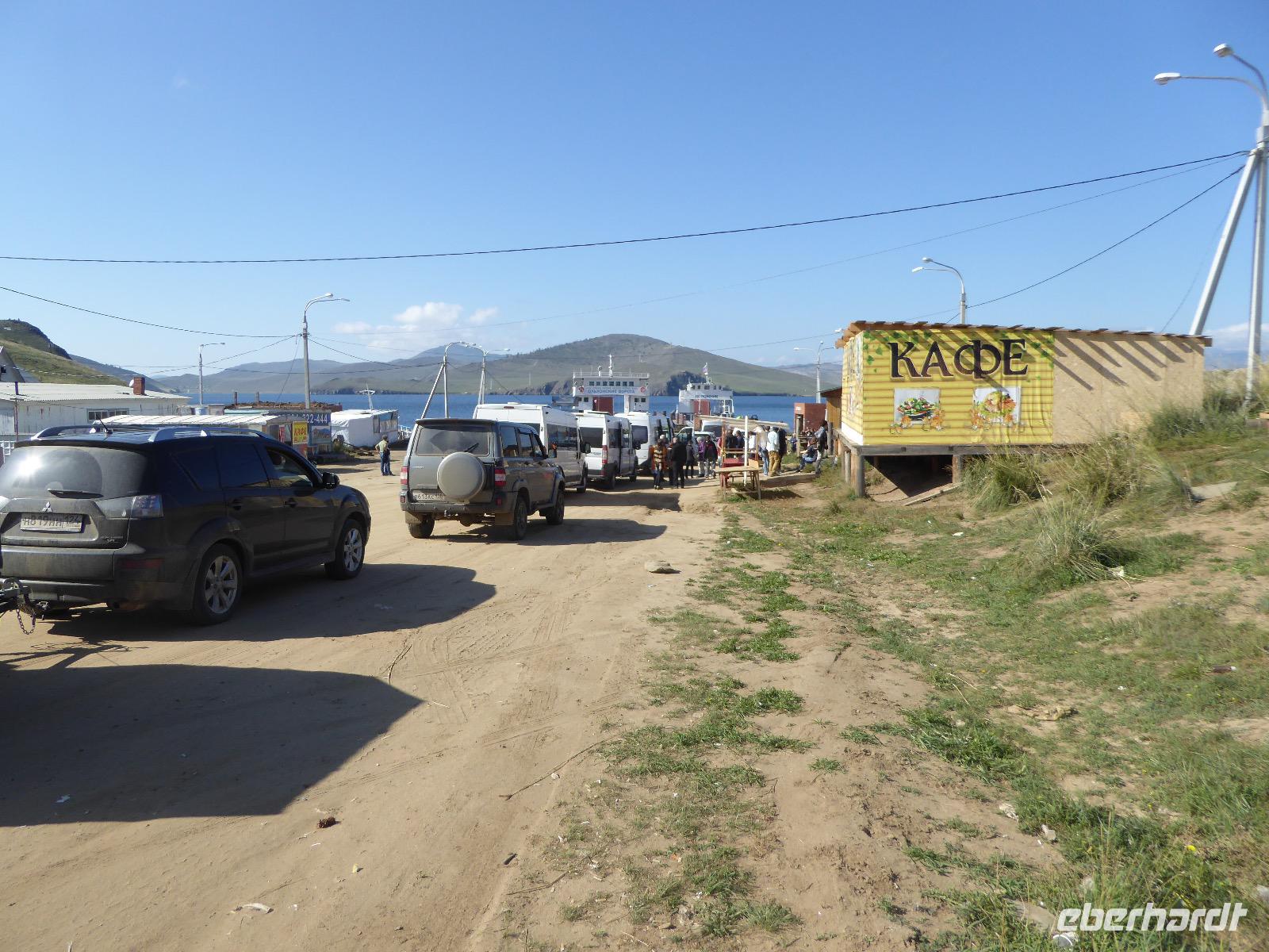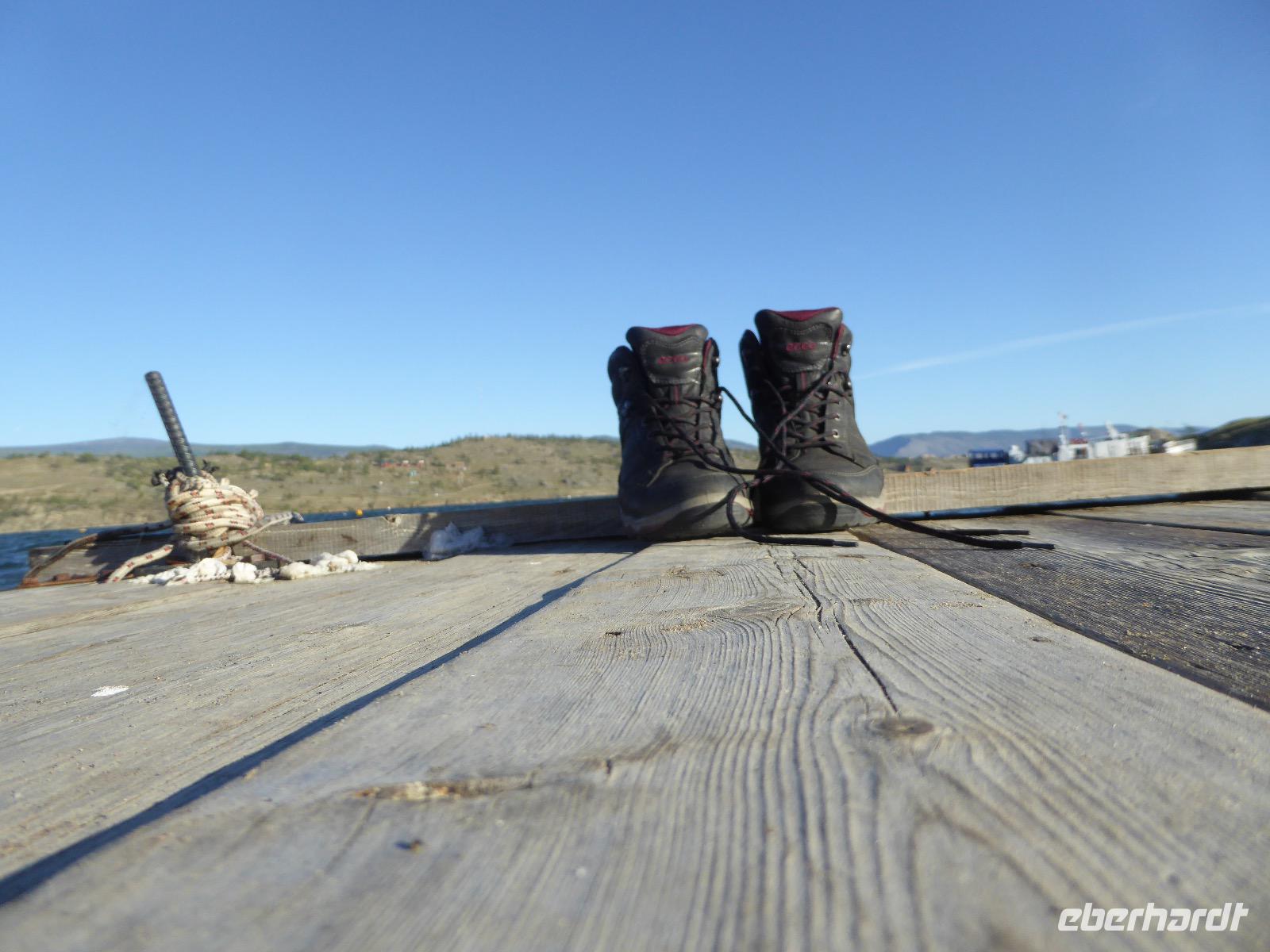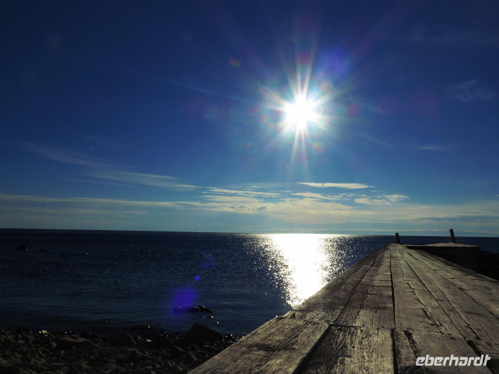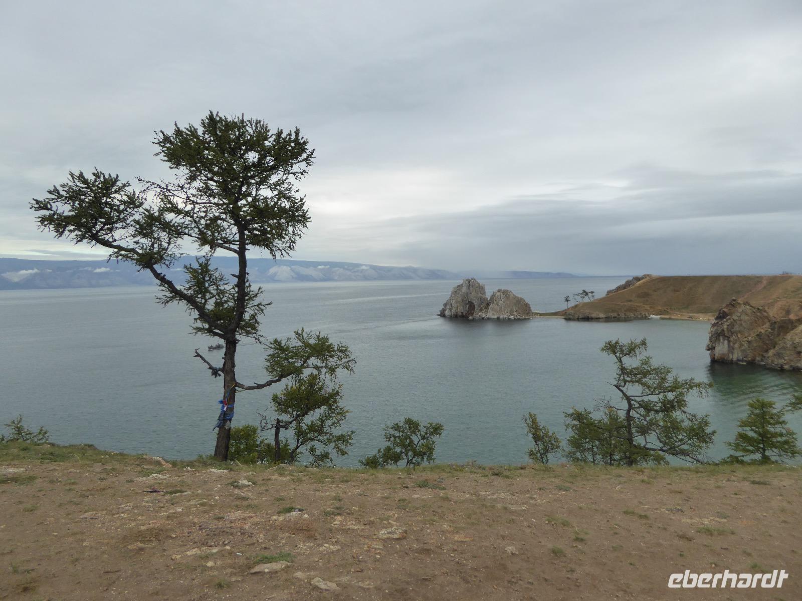 Fröhlich begrüßt uns Nikita beim Frühstück. Gut gesättigt begeben wir uns zum Strand am Baikalsee, wo ein kleines Boot mit einer seltsamen Mannschaft auf uns wartet. Der Kapitän sieht aus als wäre er hundert Jahre alt (Chris bekommt später heraus, dass er erst 64 ist), der eine Bootsmann ist total betrunken und für das leibliche Wohl sorgt eine russische Frau, die ihre 16jährige Tochter dabei hat. Wir erklimmen das Schiff und versuchen, es uns gemütlich zu machen. Das ist nicht so einfach, denn hinten sind nur 4 Plätze, vorne zieht es wie verrückt und drinnen ist es zwar warm, aber stickig, es riecht nach Kerosin, Nikotin und Fisch. Irgendwann haben wir uns eingerichtet und schippern über den Baikalsee. Nach ein paar Stunden erreichen wir die unbewohnte Insel Ogoj, wo wir aussteigen und zur tibetischen Stupa laufen. Diese barfuß zu umrunden, befreit von allen Sünden. Allerdings muss man es mindestens drei mal oder sieben mal oder über einhundert mal machen, für letzteres reicht die Zeit nicht. Zum Schiff zurück gekehrt, erwartet uns der gedeckte Tisch. Es gibt Suppe aus der uns ein lustiger Fischkopf angrinst. Hm... Die Suppe schmeckt, man muss ja den Fischkopf nicht mit essen. Jetzt hat unser Kapitän seine Musikanlage entdeckt. Fröhlich klingen russiche Lieder scheppernd aus dem Lautsprecher. Zum Ententanz und Letkiss hält es uns nicht mehr auf den Bänken und wir legen ein wackeres Tänzchen hin. Noch einmal legt unser Schiffchen an. Inzwischen haben sich dicke Wolken am Himmel breit gemacht und unser Kapitän hält uns an, uns zu beeilen, da er unruhige See erwartet. Wir wandern zu berühmten Heilquellen querfeldein und einen steilen Berg hinauf. In matschiger Modderpampe läuft aus zwei nicht sehr Vertrauen erweckenden Rohren Wasser auf den Waldboden. Es ist nicht ganz klar, ob die rechte Leitung für Frauen ist und die linke für Männer oder umgekehrt. Nach müßiger Diskussion kehren wir zum Schiff zurück. Die Wolken haben sich verzogen und es ist noch Zeit für einen leckeren Posy. Bier ist aus. Die nächste Lieferung kommt erst in einer halben Stunde, da sind wir schon weg. Unser Rückweg wird weiterhin von lauter Musik begleitet. Zum Abendessen sind wir wieder zurück. Nikita lädt uns zu einem Musikabend ein, aber wir sind zu erschöpft und können uns nicht dazu aufraffen.