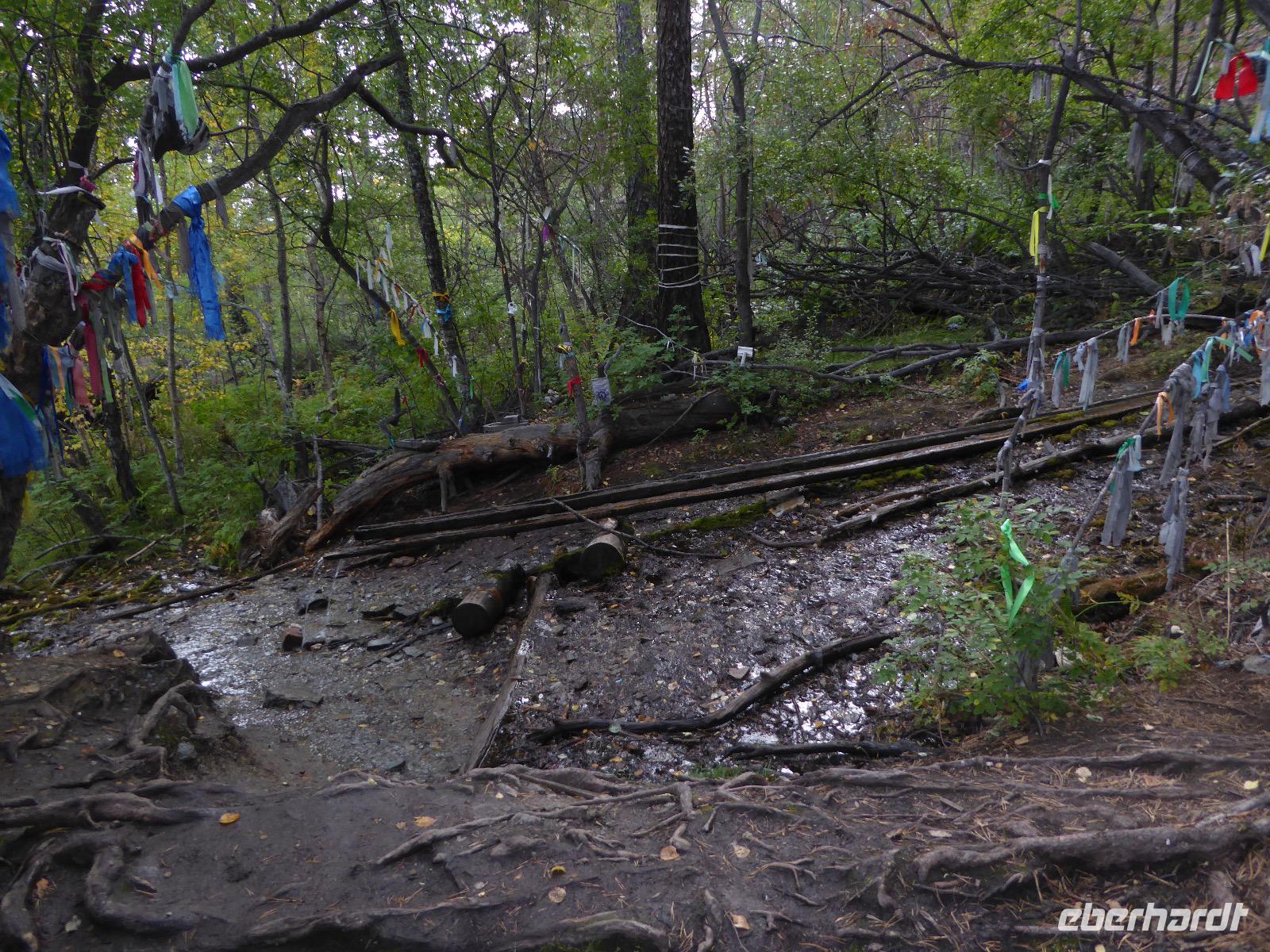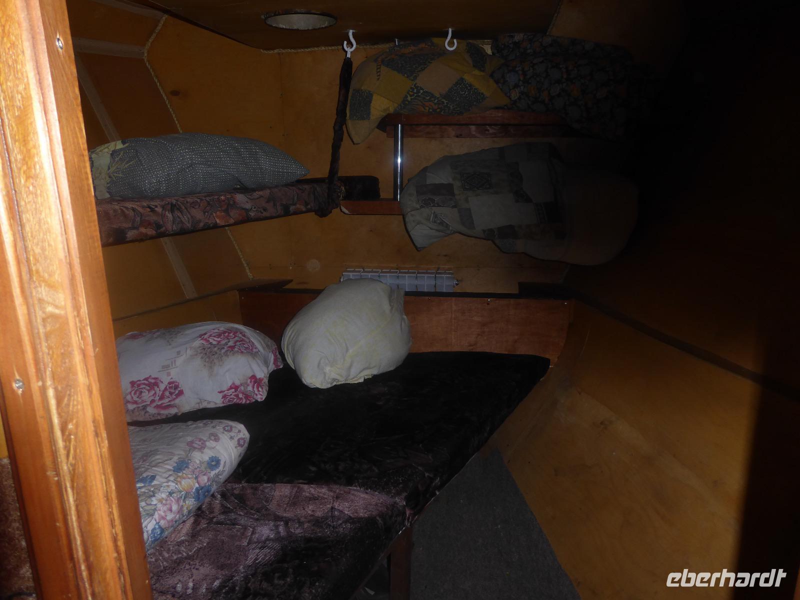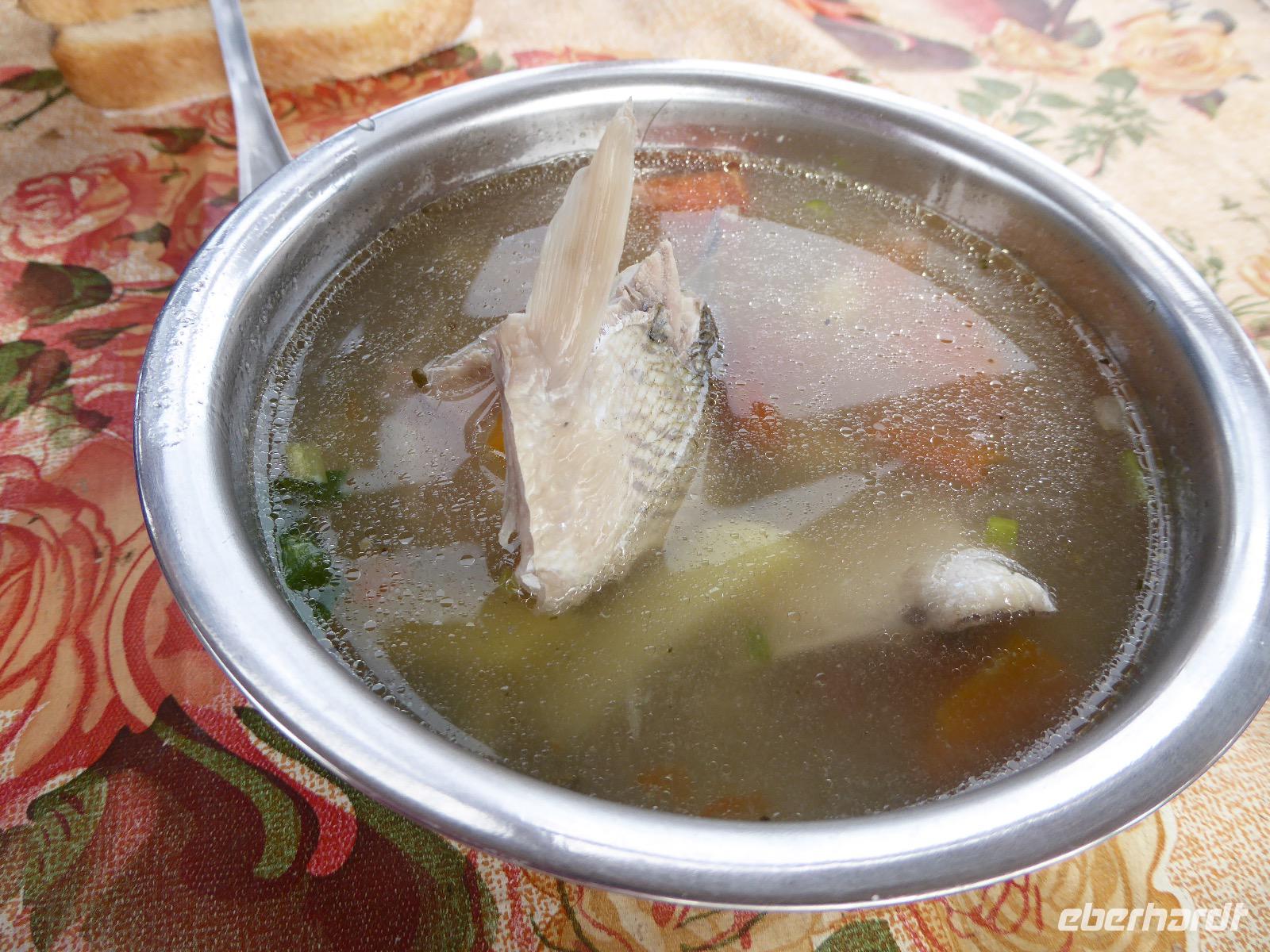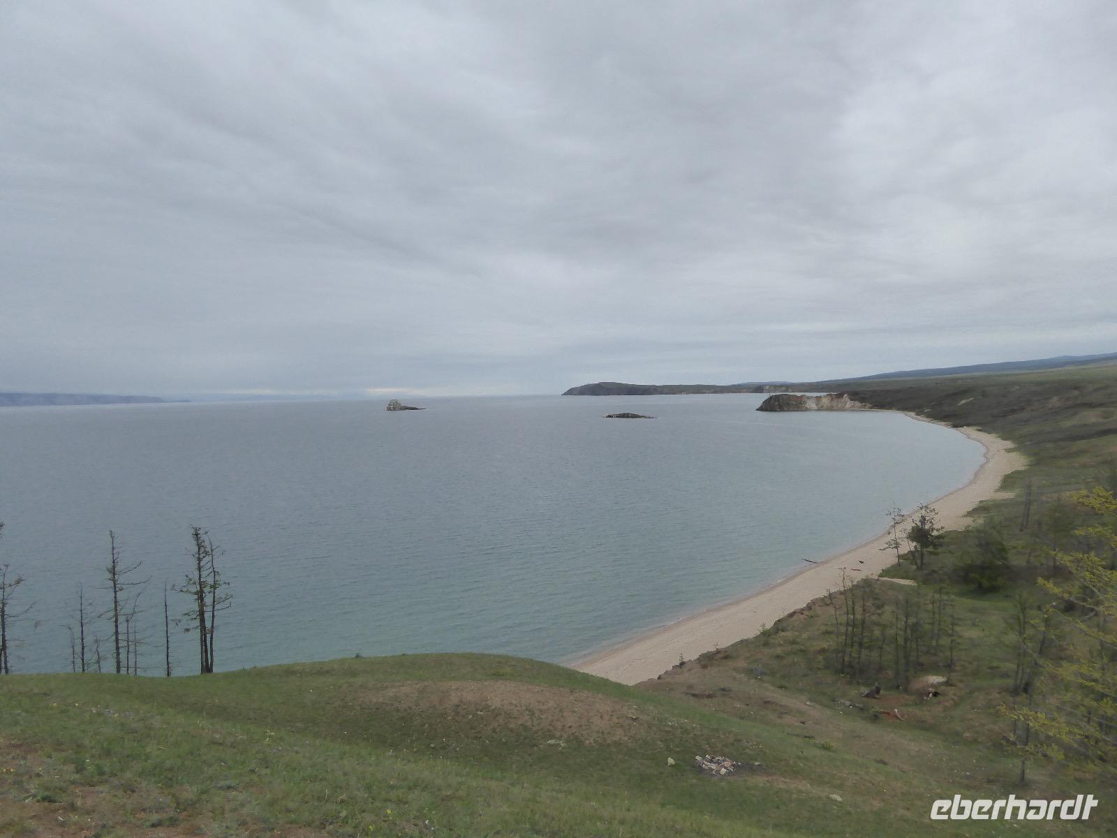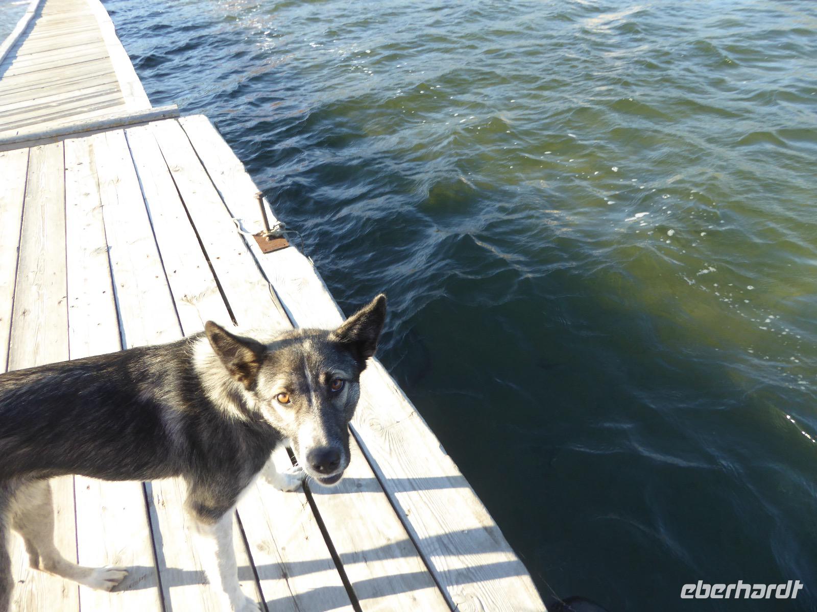 Fröhlich begrüßt uns Nikita beim Frühstück. Gut gesättigt begeben wir uns zum Strand am Baikalsee, wo ein kleines Boot mit einer seltsamen Mannschaft auf uns wartet. Der Kapitän sieht aus als wäre er hundert Jahre alt (Chris bekommt später heraus, dass er erst 64 ist), der eine Bootsmann ist total betrunken und für das leibliche Wohl sorgt eine russische Frau, die ihre 16jährige Tochter dabei hat. Wir erklimmen das Schiff und versuchen, es uns gemütlich zu machen. Das ist nicht so einfach, denn hinten sind nur 4 Plätze, vorne zieht es wie verrückt und drinnen ist es zwar warm, aber stickig, es riecht nach Kerosin, Nikotin und Fisch. Irgendwann haben wir uns eingerichtet und schippern über den Baikalsee. Nach ein paar Stunden erreichen wir die unbewohnte Insel Ogoj, wo wir aussteigen und zur tibetischen Stupa laufen. Diese barfuß zu umrunden, befreit von allen Sünden. Allerdings muss man es mindestens drei mal oder sieben mal oder über einhundert mal machen, für letzteres reicht die Zeit nicht. Zum Schiff zurück gekehrt, erwartet uns der gedeckte Tisch. Es gibt Suppe aus der uns ein lustiger Fischkopf angrinst. Hm... Die Suppe schmeckt, man muss ja den Fischkopf nicht mit essen. Jetzt hat unser Kapitän seine Musikanlage entdeckt. Fröhlich klingen russiche Lieder scheppernd aus dem Lautsprecher. Zum Ententanz und Letkiss hält es uns nicht mehr auf den Bänken und wir legen ein wackeres Tänzchen hin. Noch einmal legt unser Schiffchen an. Inzwischen haben sich dicke Wolken am Himmel breit gemacht und unser Kapitän hält uns an, uns zu beeilen, da er unruhige See erwartet. Wir wandern zu berühmten Heilquellen querfeldein und einen steilen Berg hinauf. In matschiger Modderpampe läuft aus zwei nicht sehr Vertrauen erweckenden Rohren Wasser auf den Waldboden. Es ist nicht ganz klar, ob die rechte Leitung für Frauen ist und die linke für Männer oder umgekehrt. Nach müßiger Diskussion kehren wir zum Schiff zurück. Die Wolken haben sich verzogen und es ist noch Zeit für einen leckeren Posy. Bier ist aus. Die nächste Lieferung kommt erst in einer halben Stunde, da sind wir schon weg. Unser Rückweg wird weiterhin von lauter Musik begleitet. Zum Abendessen sind wir wieder zurück. Nikita lädt uns zu einem Musikabend ein, aber wir sind zu erschöpft und können uns nicht dazu aufraffen.