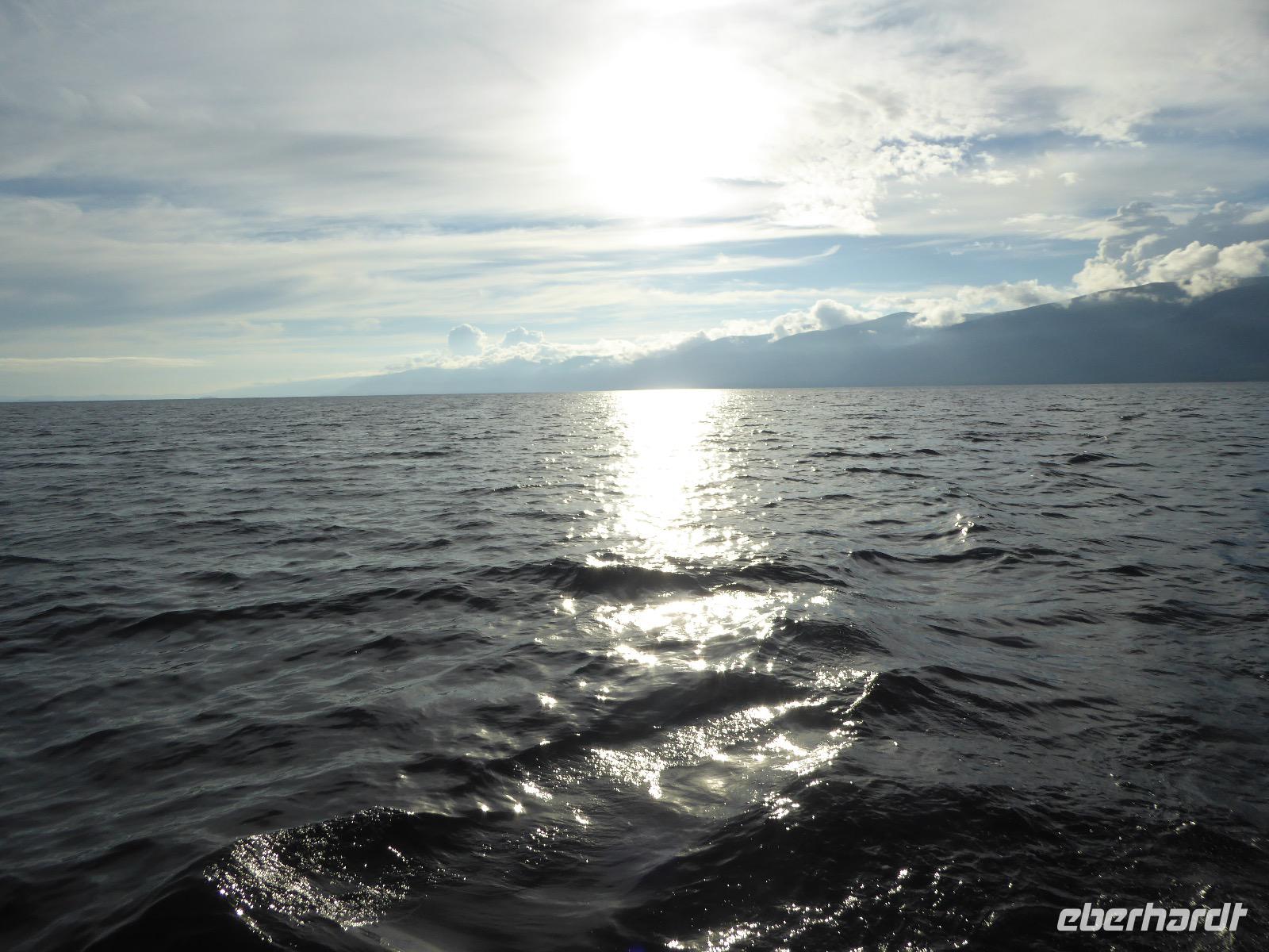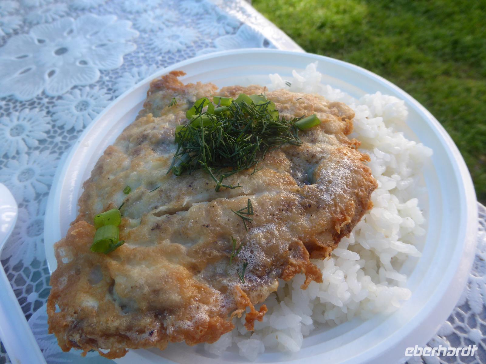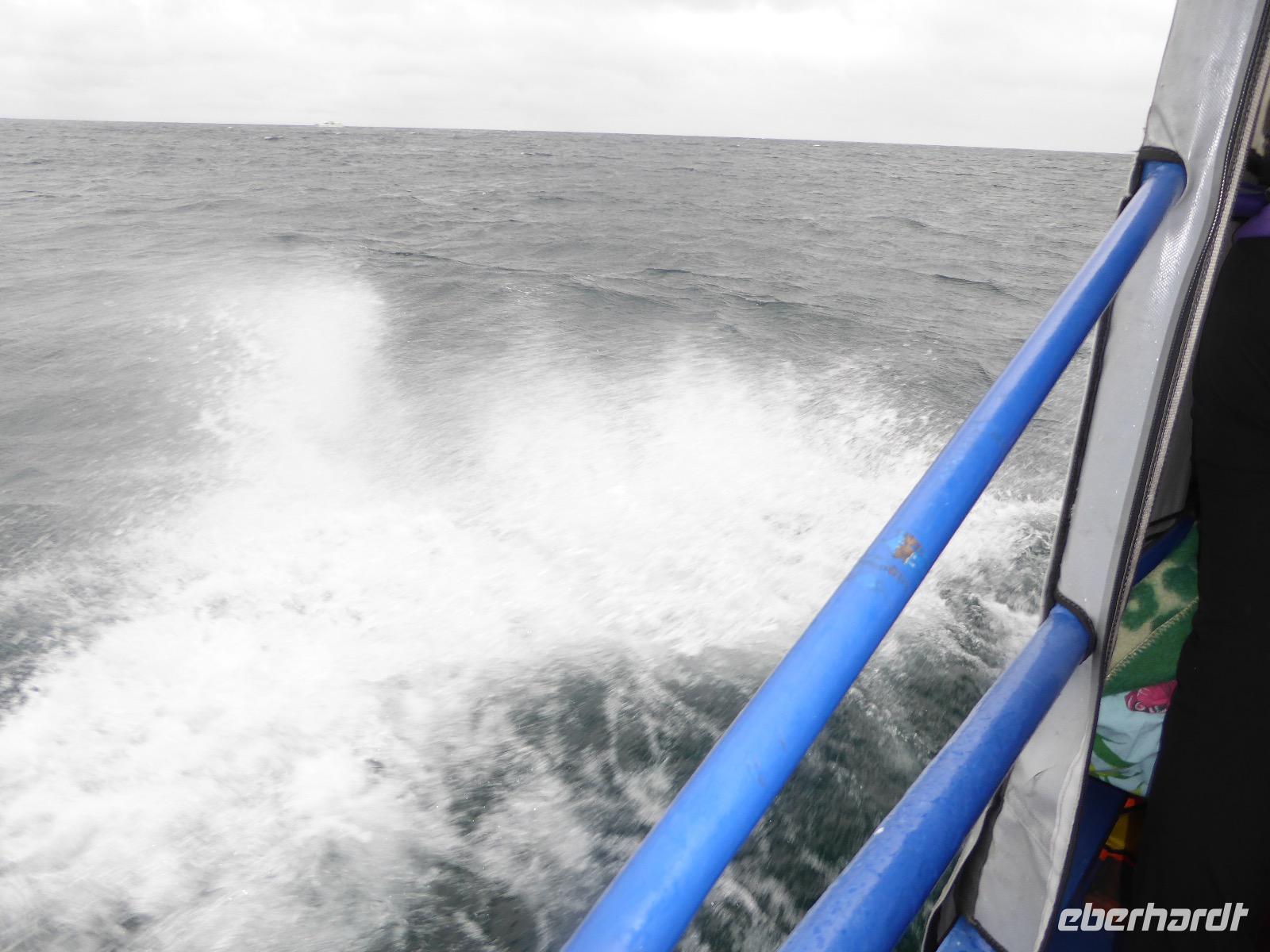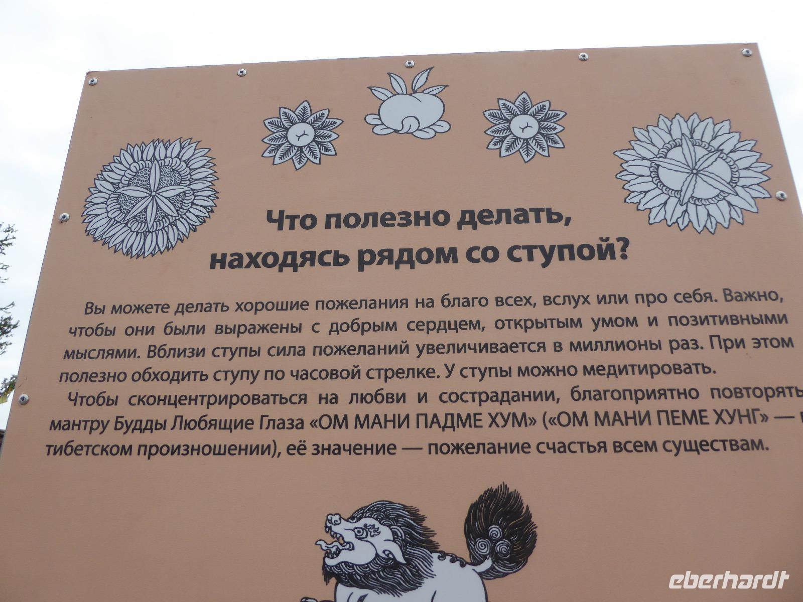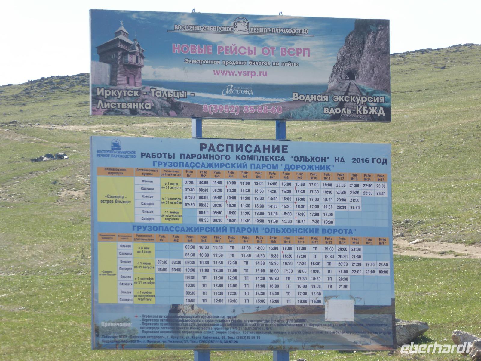 Fröhlich begrüßt uns Nikita beim Frühstück. Gut gesättigt begeben wir uns zum Strand am Baikalsee, wo ein kleines Boot mit einer seltsamen Mannschaft auf uns wartet. Der Kapitän sieht aus als wäre er hundert Jahre alt (Chris bekommt später heraus, dass er erst 64 ist), der eine Bootsmann ist total betrunken und für das leibliche Wohl sorgt eine russische Frau, die ihre 16jährige Tochter dabei hat. Wir erklimmen das Schiff und versuchen, es uns gemütlich zu machen. Das ist nicht so einfach, denn hinten sind nur 4 Plätze, vorne zieht es wie verrückt und drinnen ist es zwar warm, aber stickig, es riecht nach Kerosin, Nikotin und Fisch. Irgendwann haben wir uns eingerichtet und schippern über den Baikalsee. Nach ein paar Stunden erreichen wir die unbewohnte Insel Ogoj, wo wir aussteigen und zur tibetischen Stupa laufen. Diese barfuß zu umrunden, befreit von allen Sünden. Allerdings muss man es mindestens drei mal oder sieben mal oder über einhundert mal machen, für letzteres reicht die Zeit nicht. Zum Schiff zurück gekehrt, erwartet uns der gedeckte Tisch. Es gibt Suppe aus der uns ein lustiger Fischkopf angrinst. Hm... Die Suppe schmeckt, man muss ja den Fischkopf nicht mit essen. Jetzt hat unser Kapitän seine Musikanlage entdeckt. Fröhlich klingen russiche Lieder scheppernd aus dem Lautsprecher. Zum Ententanz und Letkiss hält es uns nicht mehr auf den Bänken und wir legen ein wackeres Tänzchen hin. Noch einmal legt unser Schiffchen an. Inzwischen haben sich dicke Wolken am Himmel breit gemacht und unser Kapitän hält uns an, uns zu beeilen, da er unruhige See erwartet. Wir wandern zu berühmten Heilquellen querfeldein und einen steilen Berg hinauf. In matschiger Modderpampe läuft aus zwei nicht sehr Vertrauen erweckenden Rohren Wasser auf den Waldboden. Es ist nicht ganz klar, ob die rechte Leitung für Frauen ist und die linke für Männer oder umgekehrt. Nach müßiger Diskussion kehren wir zum Schiff zurück. Die Wolken haben sich verzogen und es ist noch Zeit für einen leckeren Posy. Bier ist aus. Die nächste Lieferung kommt erst in einer halben Stunde, da sind wir schon weg. Unser Rückweg wird weiterhin von lauter Musik begleitet. Zum Abendessen sind wir wieder zurück. Nikita lädt uns zu einem Musikabend ein, aber wir sind zu erschöpft und können uns nicht dazu aufraffen.