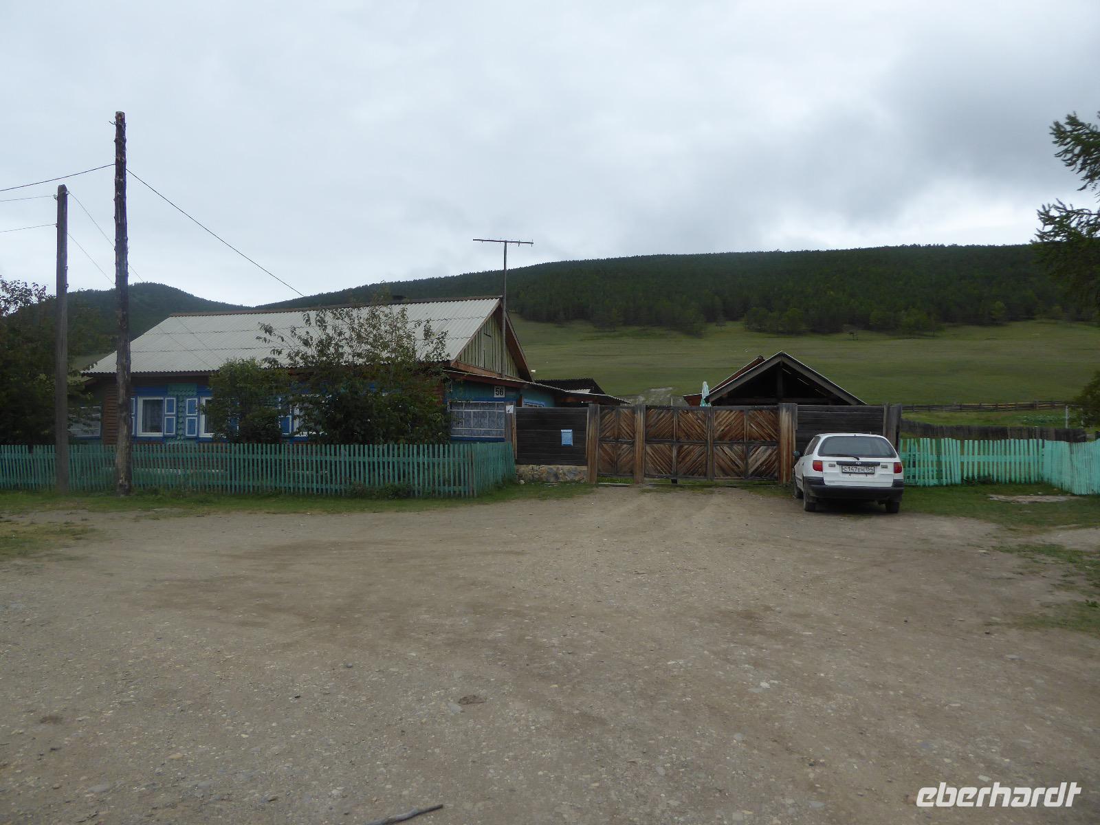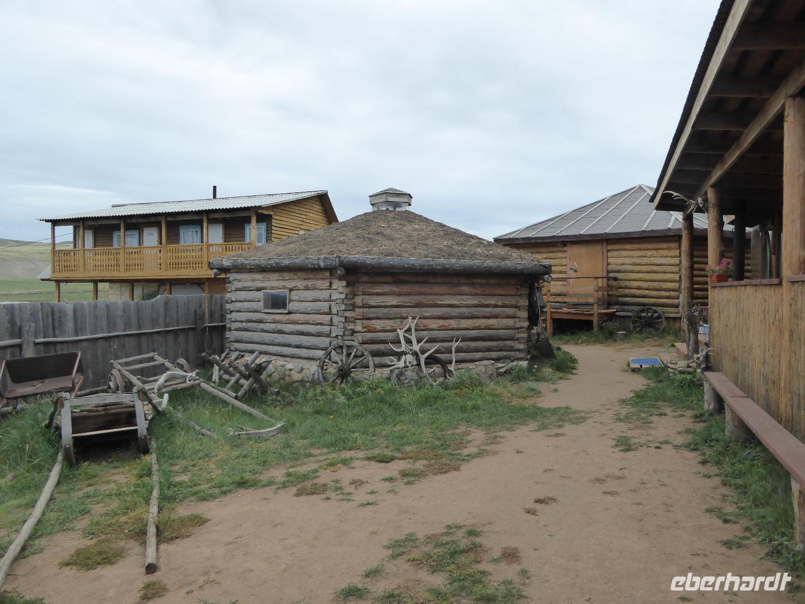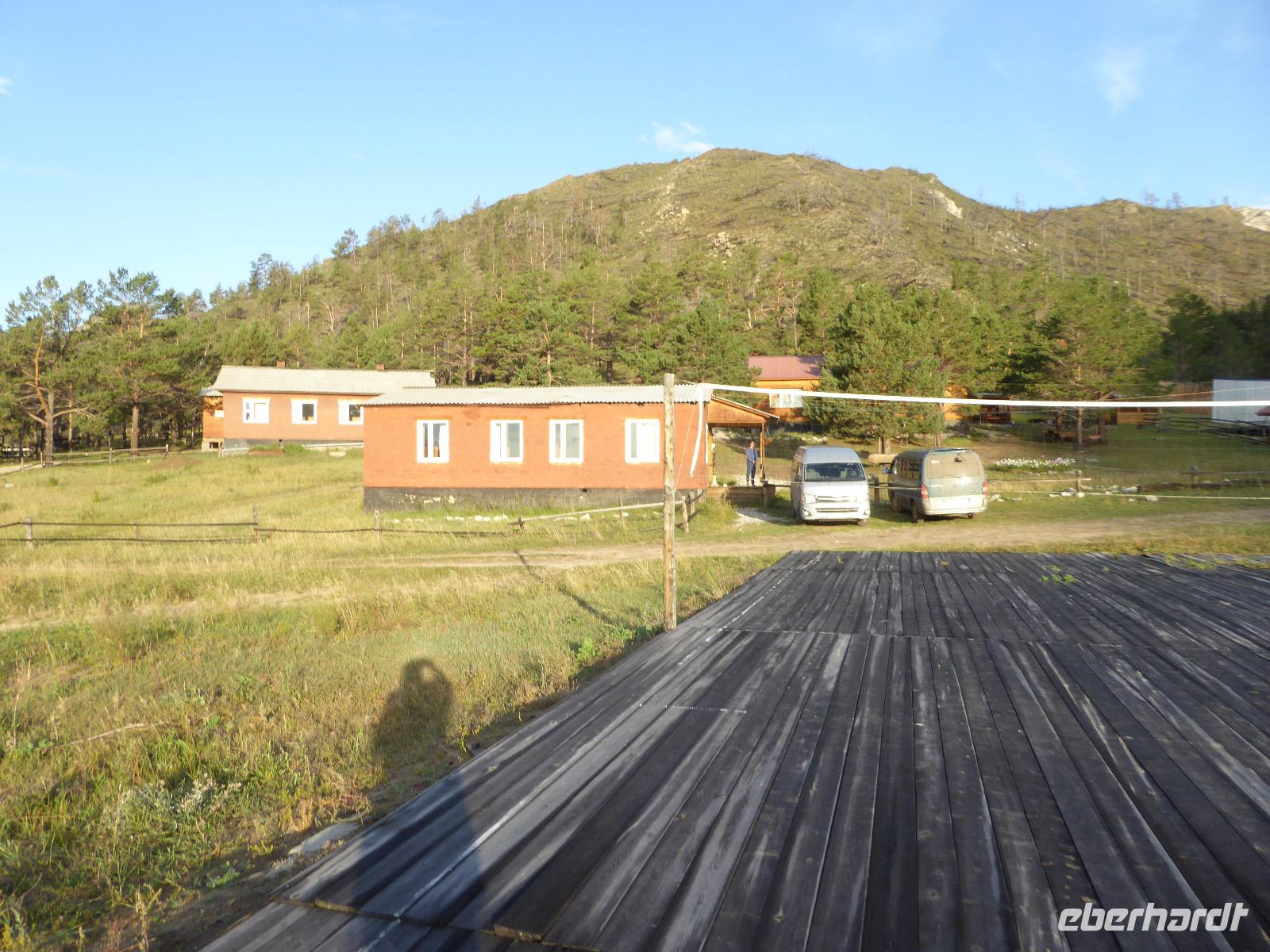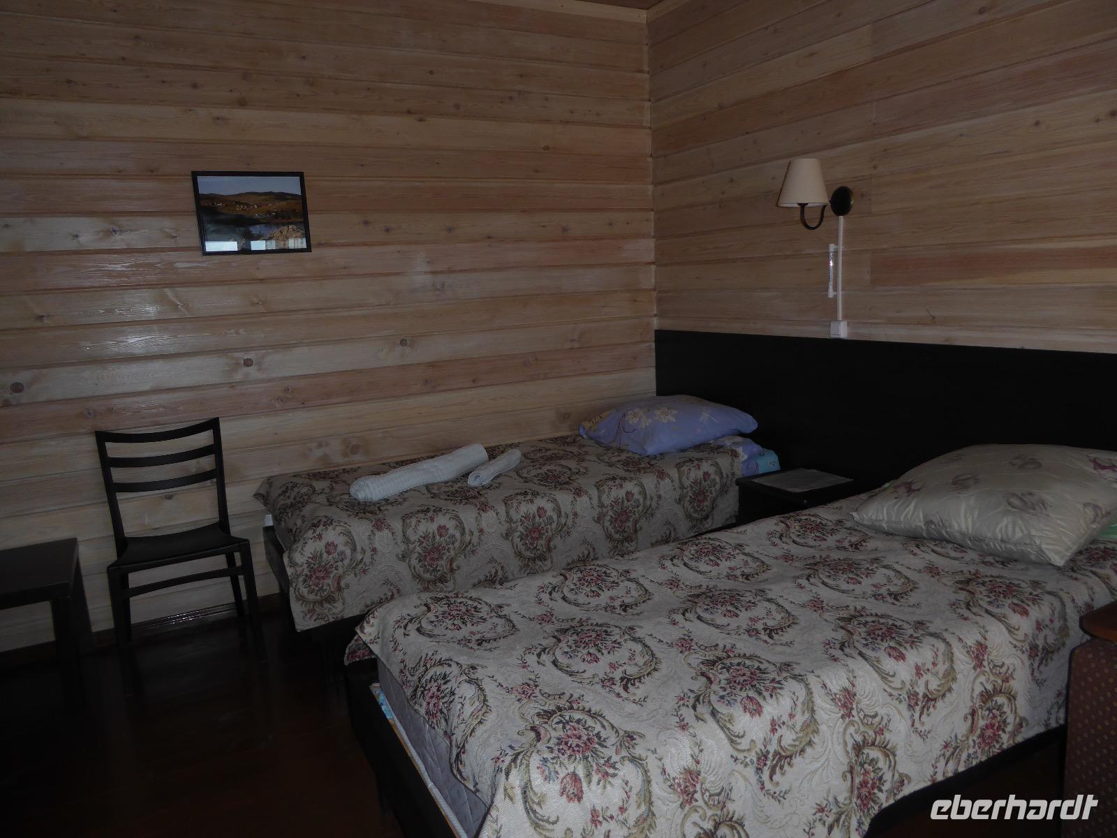 Warme Worte und viele Umarmungen werden gewechselt. Dann stehen die Autos vor der Tür. Irgendjemand hat beschlossen, dass wir nicht zusammen in einem Auto fahren, sondern uns auf beide Autos aufteilen. Gesagt, getan. Die Gruppen von Haus 1 und Haus 2 fahren jetzt also getrennt weiter. Drei Stunden sind es bis Irkutsk. Davon ca. vierzig Kilometer Huckelpiste, also unbefestigte Straße. Wir werden ordentlich durchgerüttelt. In Irkutsk wird ein Auto ausgetauscht. Tanja lässt uns wieder alle zusammen in ein Auto einsteigen. Nun aber haben wir uns schon an die Bequemlichkeit des anderen Autos gewöhnt, außerdem sitzt es sich auf der letzten Reihe wirklich schlecht. Nach kurzer Rücksprache, teilen wir uns wieder auf beide Autos auf. An einer Bank muss Tanja Geld abholen. Das dauert sehr lange, weil es nur einen Automaten gibt. Anschließend starten wir einen Großeinkauf. Morgen wollen wir Picknick machen und wir müssen alles mitnehmen. Der russische Supermarkt macht einen hervorragenden Umsatz an zusätzlich gekauftem Wodka und Süßigkeiten. Noch zwei Stunden Autofahrt und wir kommen am Restaurant an. In einem gemütlichen burjatischen Ambiente gibt es Nudelsuppe, Posy und Kuchen. Bald darauf erreichen wir das Museum in Ust Orda. Wir gehen hinein und kurz darauf wieder hinaus. Unsere Gastgeber sind noch nicht so weit. Ein Mann und eine Frau in burjatischer Tracht zünden vor dem Museum ein kleines Feuer an. Mit einem traditionellen burjatischem Lied werden wir begrüßt. Die Männer müssen ihre Beine und die Frauen ihre Arme über dem Feuer kreisen lassen. Das bringt Glück. Die burjatische Frau hat auch eine Schüssel mit Milch in der Hand. So weiß wie die Milch soll der weitere Weg unserer Reise sein. Das wünscht sie uns. Danke schön. Wir werden durch das Museum geführt. Es besteht schon seit 1938 und wurde während der Sowjetzeit mit Orden ausgezeichnet. Da es ein Geschichtsmuseum ist, beginnt die Ausstellung mit einem 2500jahre altem Jägerzelt und Mammutknochen. Wir erfahren einiges über das harte burjatische Leben, über Handwerkskunst und Schamanen. Nach der Besichtigung erwartet uns das einzige staatliche Folkloreensemble des Burjatischen Bezirke "Steppen-Melodie". Eine Gruppe von zwanzig Sängern und Tänzern, die für uns eine großartige Vorstellung bringen. Der Chef der Gruppe stellt uns seine Mannschaft und die Musikinstrumente vor. Er erklärt vor jedem Lied und vor jedem Tanz, worum es geht. Er fragt auch nach unserem woher und wohin. Da die Männer im burjatischem Leben das Sagen haben, dürfen unsere Männer auch zum Tanz antreten. Auch zu einem Ringkampf werden sie aufgefordert. Hier stellt sich heraus, dass Toni ein ehemaliger Ringer ist. Und er schlägt sich tatsächlich nicht schlecht. Der junge Burjate hat kaum eine Chance. Alles natürlich nur Spiel und Spaß. Zum Abschluss tanzen wir alle den Reigen der Freundschaft. Wir lernen wie man sich burjatisch begrüßt und werden dann verabschiedet. Das war ein einmaliges Erlebnis und definitiv ein Höhepunkt dieser Reise. Wir haben noch drei Stunden Fahrt vor uns. Ziel ist die Krestovaja Bucht. Noch gibt es eine glatte Straße, die zwar bergauf bergab führt, aber eben eine Straße ist. Zwanzig Kilometer vor unserem Ziel biegen wir von der Straße ab. Jetzt sind wir auf einem modrigen Waldboden unterwegs. Immer wieder müssen die Fahrer aussteigen und abschätzen, ob sie durch diese oder jene Pfütze durchfahren können. Langsam wird es dunkel und Tanja mahnt zur Eile. Auf dieser Piste will niemand im Dunkeln unterwegs sein. Aber wir schaffen es. Nur noch ein Stückchen und wir sind am Krestovaja Resort, unserer heutigen Unterkunft. Unsere Gastgeberin begrüßt uns freundlich und kommt unserer dringenden Bitte nach, uns Zimmer mit Dusche und Toilette zur Verfügung zu stellen. Davon gibt es nur vier. Zwei davon mit Innen-WC, bei den anderen beiden befindet sich die Nasszelle direkt neben dem Zimmer. Trotzdem, für hiesige Verhältnisse äußerst komfortabel. Die Glücklichen, die diese Zimmer erwischt haben, laden die anderen ein, Dusche und WC mit zu benutzen. Danke, Ihr Lieben! Denn ansonsten gibt es nur ein Plumpsklo (was entsprechend riecht) und Duschen mit eisigkaltem Wasser. Das Abendessen ist fertig. Aufgetischt werden warmer Kartoffelstampf, kalte Frikadellen, Gemüsesalate mit viel Knoblauch und geröstete Brotkrumen zum Knabbern. Irgendjemand entdeckt, dass die Fahrer Suppe essen und bekommt Appetit darauf. Eine Nachfrage ergibt, dass die Suppe das Abendessen der Familie ist und nur noch wenig übrig ist. Dieses Wenige würden sie uns aber gerne geben, was sie auch tun. Der Dank gilt unseren herzlichen Gastgebern. Nach dem Abendessen sitzen wir in gemütlicher Wodka-Runde mit unseren Fahrern Sergej und Alexander zusammen und erfahren nun auch persönliches von ihnen. Sogar unser spröder Alexander taut auf und kommuniziert mit uns. Gegen halb elf löst sich die Runde auf, denn um elf wird der Generator abgestellt und es gibt keinen Strom und kein Licht mehr.