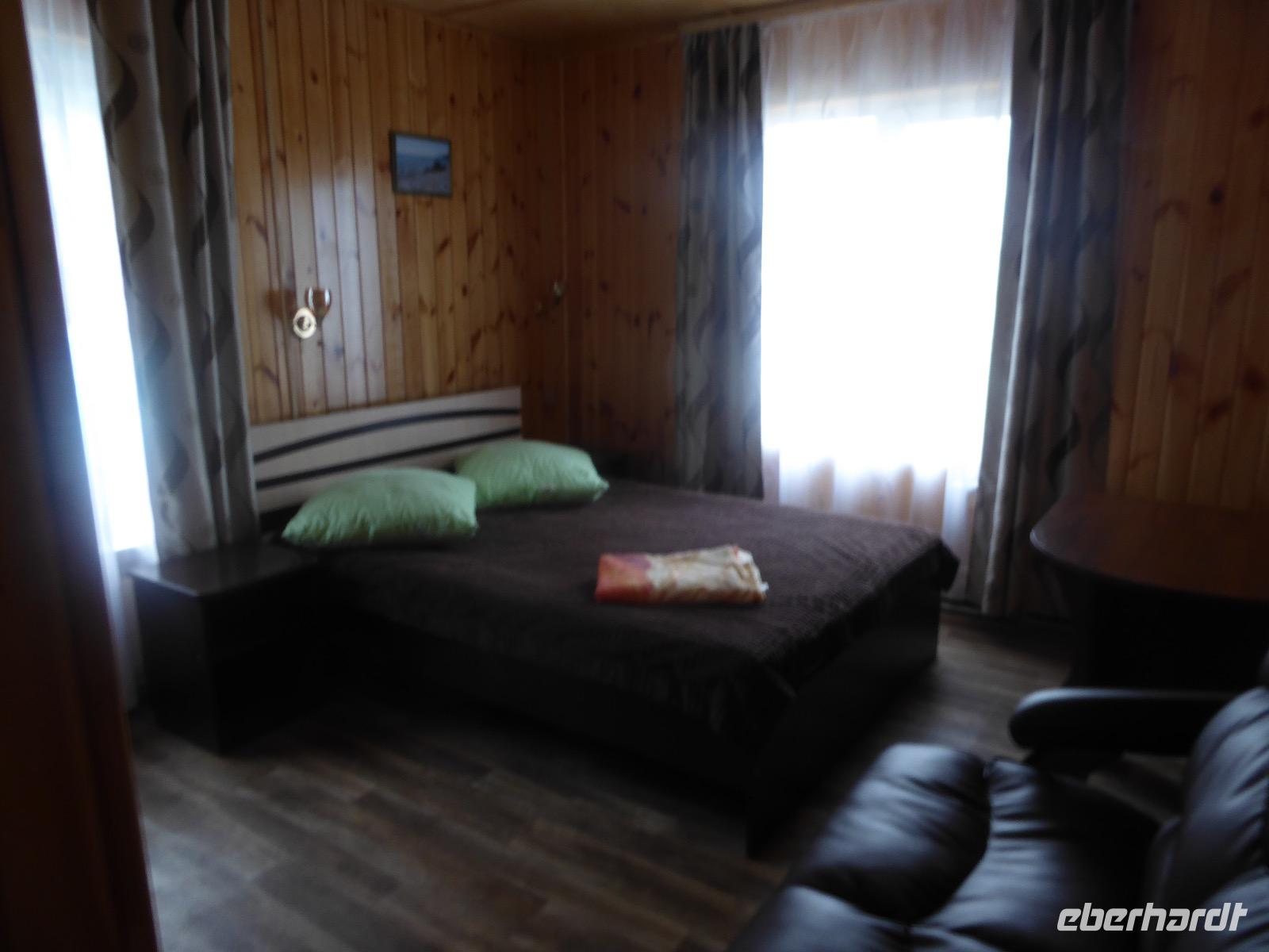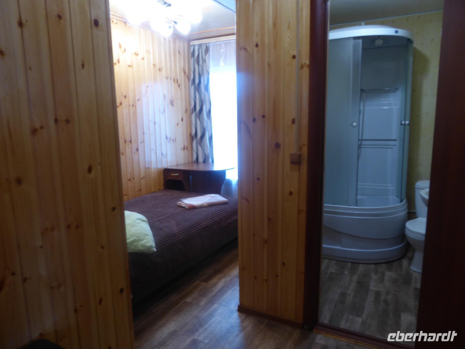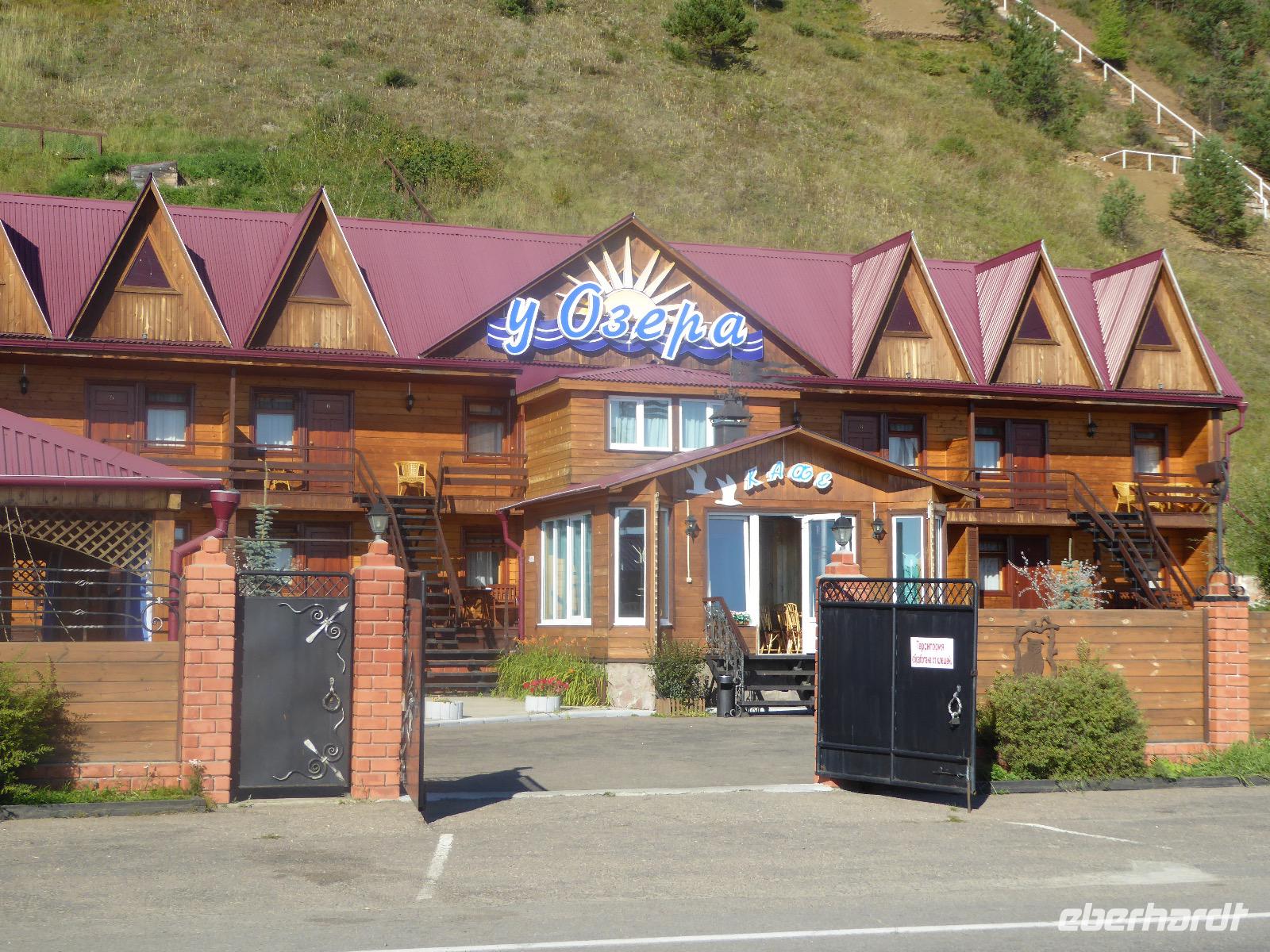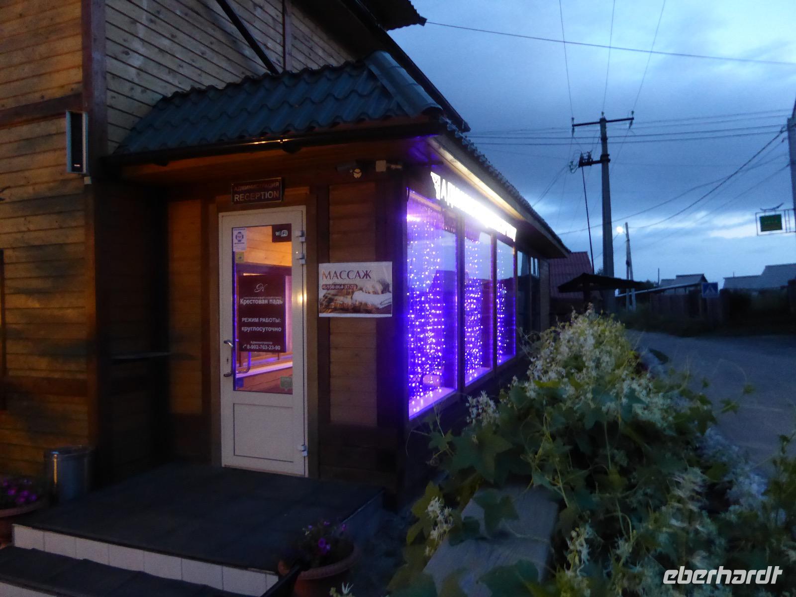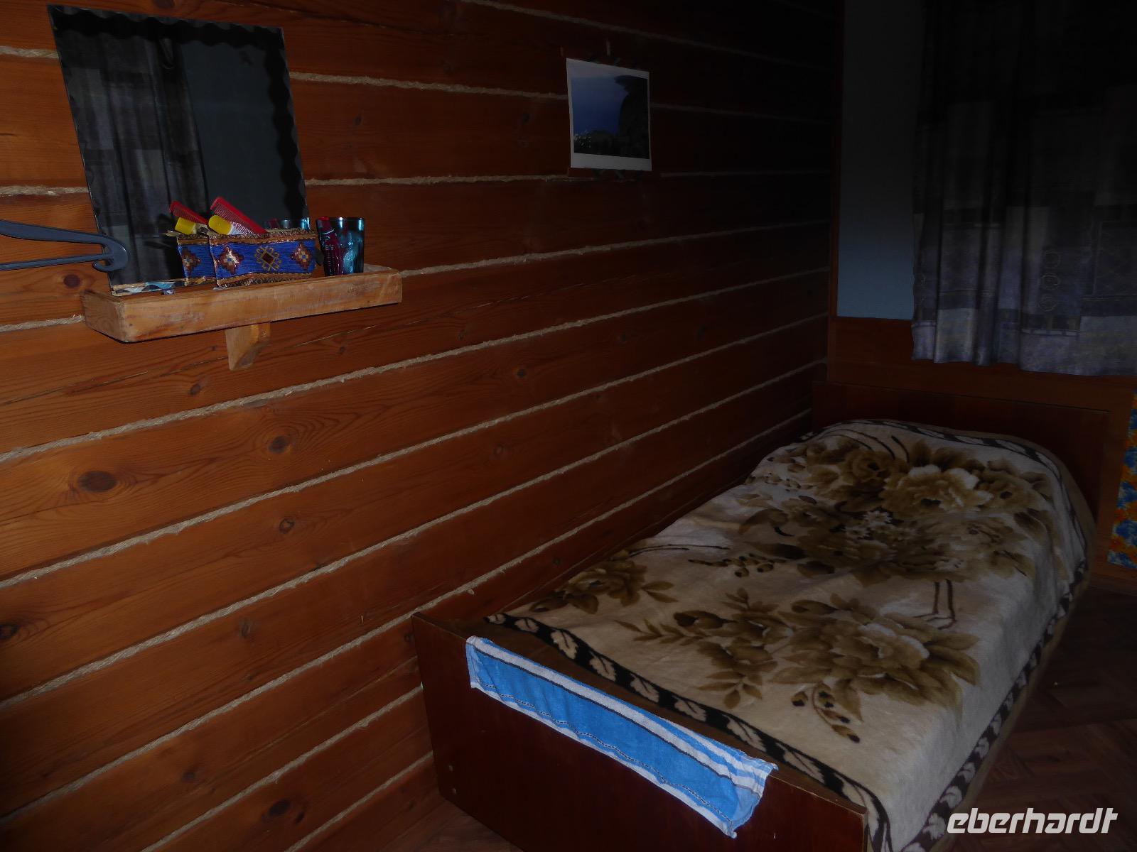 Warme Worte und viele Umarmungen werden gewechselt. Dann stehen die Autos vor der Tür. Irgendjemand hat beschlossen, dass wir nicht zusammen in einem Auto fahren, sondern uns auf beide Autos aufteilen. Gesagt, getan. Die Gruppen von Haus 1 und Haus 2 fahren jetzt also getrennt weiter. Drei Stunden sind es bis Irkutsk. Davon ca. vierzig Kilometer Huckelpiste, also unbefestigte Straße. Wir werden ordentlich durchgerüttelt. In Irkutsk wird ein Auto ausgetauscht. Tanja lässt uns wieder alle zusammen in ein Auto einsteigen. Nun aber haben wir uns schon an die Bequemlichkeit des anderen Autos gewöhnt, außerdem sitzt es sich auf der letzten Reihe wirklich schlecht. Nach kurzer Rücksprache, teilen wir uns wieder auf beide Autos auf. An einer Bank muss Tanja Geld abholen. Das dauert sehr lange, weil es nur einen Automaten gibt. Anschließend starten wir einen Großeinkauf. Morgen wollen wir Picknick machen und wir müssen alles mitnehmen. Der russische Supermarkt macht einen hervorragenden Umsatz an zusätzlich gekauftem Wodka und Süßigkeiten. Noch zwei Stunden Autofahrt und wir kommen am Restaurant an. In einem gemütlichen burjatischen Ambiente gibt es Nudelsuppe, Posy und Kuchen. Bald darauf erreichen wir das Museum in Ust Orda. Wir gehen hinein und kurz darauf wieder hinaus. Unsere Gastgeber sind noch nicht so weit. Ein Mann und eine Frau in burjatischer Tracht zünden vor dem Museum ein kleines Feuer an. Mit einem traditionellen burjatischem Lied werden wir begrüßt. Die Männer müssen ihre Beine und die Frauen ihre Arme über dem Feuer kreisen lassen. Das bringt Glück. Die burjatische Frau hat auch eine Schüssel mit Milch in der Hand. So weiß wie die Milch soll der weitere Weg unserer Reise sein. Das wünscht sie uns. Danke schön. Wir werden durch das Museum geführt. Es besteht schon seit 1938 und wurde während der Sowjetzeit mit Orden ausgezeichnet. Da es ein Geschichtsmuseum ist, beginnt die Ausstellung mit einem 2500jahre altem Jägerzelt und Mammutknochen. Wir erfahren einiges über das harte burjatische Leben, über Handwerkskunst und Schamanen. Nach der Besichtigung erwartet uns das einzige staatliche Folkloreensemble des Burjatischen Bezirke "Steppen-Melodie". Eine Gruppe von zwanzig Sängern und Tänzern, die für uns eine großartige Vorstellung bringen. Der Chef der Gruppe stellt uns seine Mannschaft und die Musikinstrumente vor. Er erklärt vor jedem Lied und vor jedem Tanz, worum es geht. Er fragt auch nach unserem woher und wohin. Da die Männer im burjatischem Leben das Sagen haben, dürfen unsere Männer auch zum Tanz antreten. Auch zu einem Ringkampf werden sie aufgefordert. Hier stellt sich heraus, dass Toni ein ehemaliger Ringer ist. Und er schlägt sich tatsächlich nicht schlecht. Der junge Burjate hat kaum eine Chance. Alles natürlich nur Spiel und Spaß. Zum Abschluss tanzen wir alle den Reigen der Freundschaft. Wir lernen wie man sich burjatisch begrüßt und werden dann verabschiedet. Das war ein einmaliges Erlebnis und definitiv ein Höhepunkt dieser Reise. Wir haben noch drei Stunden Fahrt vor uns. Ziel ist die Krestovaja Bucht. Noch gibt es eine glatte Straße, die zwar bergauf bergab führt, aber eben eine Straße ist. Zwanzig Kilometer vor unserem Ziel biegen wir von der Straße ab. Jetzt sind wir auf einem modrigen Waldboden unterwegs. Immer wieder müssen die Fahrer aussteigen und abschätzen, ob sie durch diese oder jene Pfütze durchfahren können. Langsam wird es dunkel und Tanja mahnt zur Eile. Auf dieser Piste will niemand im Dunkeln unterwegs sein. Aber wir schaffen es. Nur noch ein Stückchen und wir sind am Krestovaja Resort, unserer heutigen Unterkunft. Unsere Gastgeberin begrüßt uns freundlich und kommt unserer dringenden Bitte nach, uns Zimmer mit Dusche und Toilette zur Verfügung zu stellen. Davon gibt es nur vier. Zwei davon mit Innen-WC, bei den anderen beiden befindet sich die Nasszelle direkt neben dem Zimmer. Trotzdem, für hiesige Verhältnisse äußerst komfortabel. Die Glücklichen, die diese Zimmer erwischt haben, laden die anderen ein, Dusche und WC mit zu benutzen. Danke, Ihr Lieben! Denn ansonsten gibt es nur ein Plumpsklo (was entsprechend riecht) und Duschen mit eisigkaltem Wasser. Das Abendessen ist fertig. Aufgetischt werden warmer Kartoffelstampf, kalte Frikadellen, Gemüsesalate mit viel Knoblauch und geröstete Brotkrumen zum Knabbern. Irgendjemand entdeckt, dass die Fahrer Suppe essen und bekommt Appetit darauf. Eine Nachfrage ergibt, dass die Suppe das Abendessen der Familie ist und nur noch wenig übrig ist. Dieses Wenige würden sie uns aber gerne geben, was sie auch tun. Der Dank gilt unseren herzlichen Gastgebern. Nach dem Abendessen sitzen wir in gemütlicher Wodka-Runde mit unseren Fahrern Sergej und Alexander zusammen und erfahren nun auch persönliches von ihnen. Sogar unser spröder Alexander taut auf und kommuniziert mit uns. Gegen halb elf löst sich die Runde auf, denn um elf wird der Generator abgestellt und es gibt keinen Strom und kein Licht mehr.