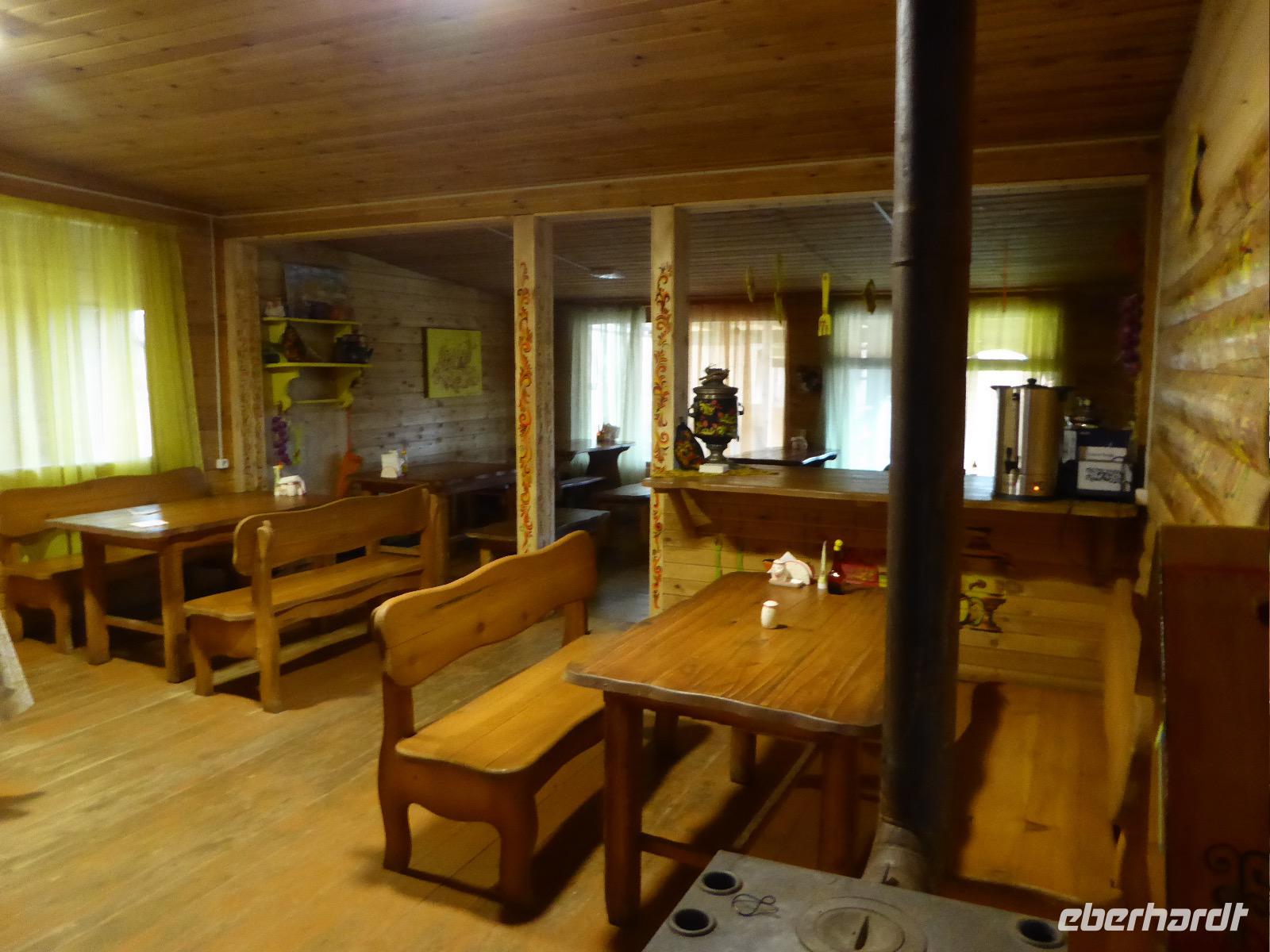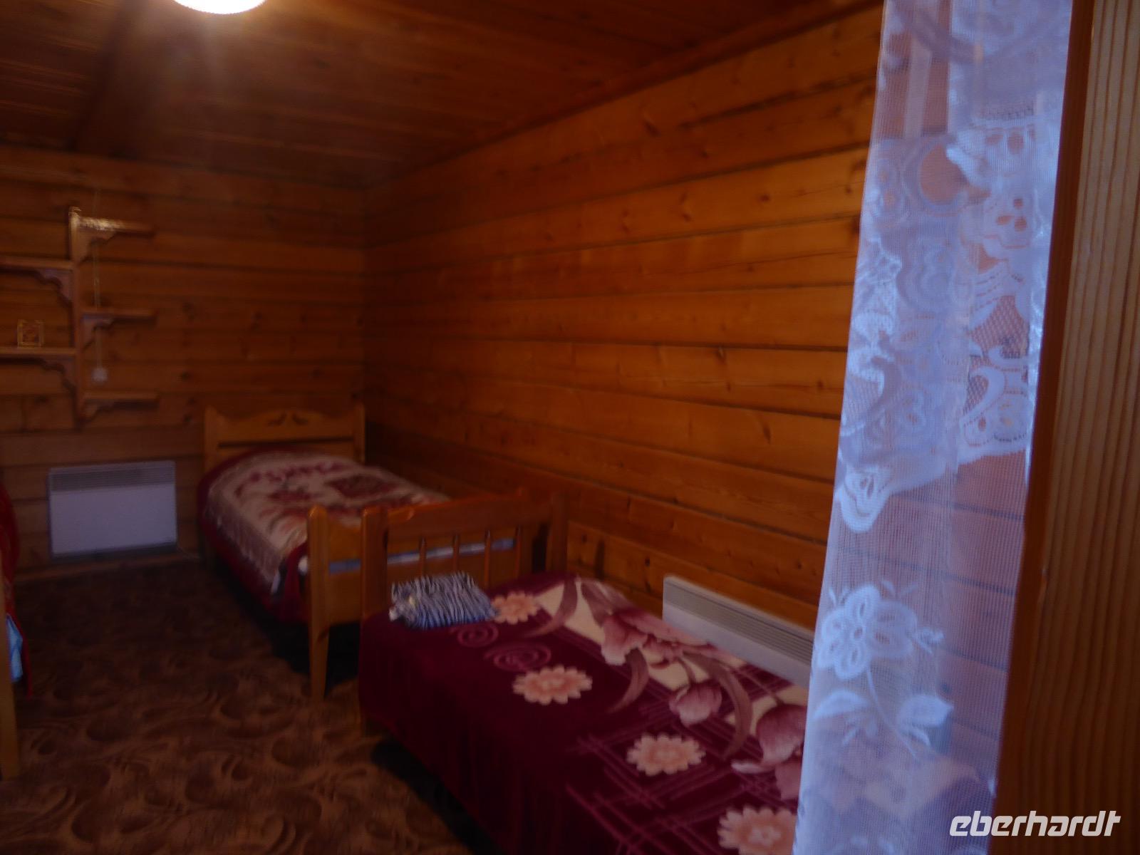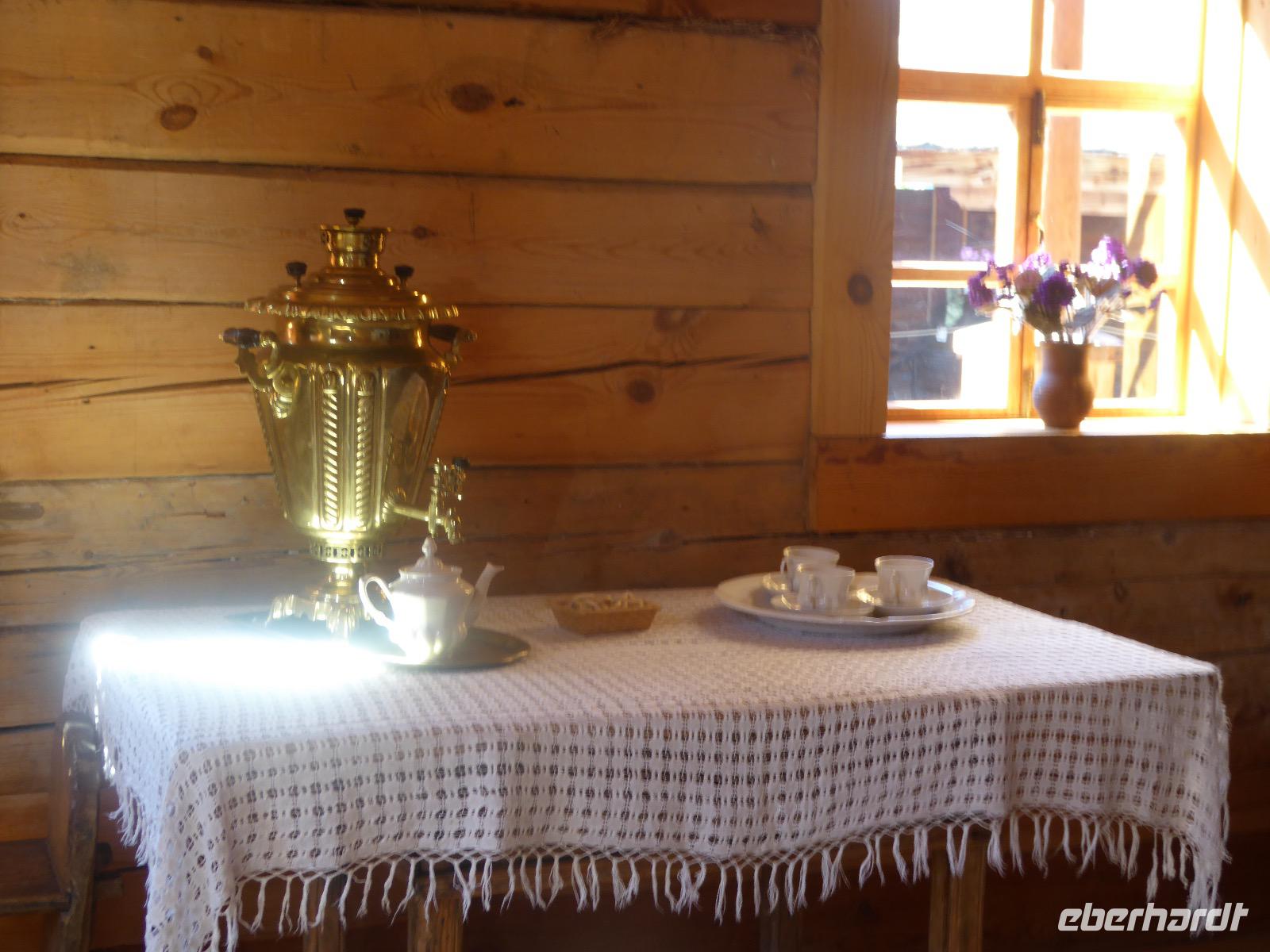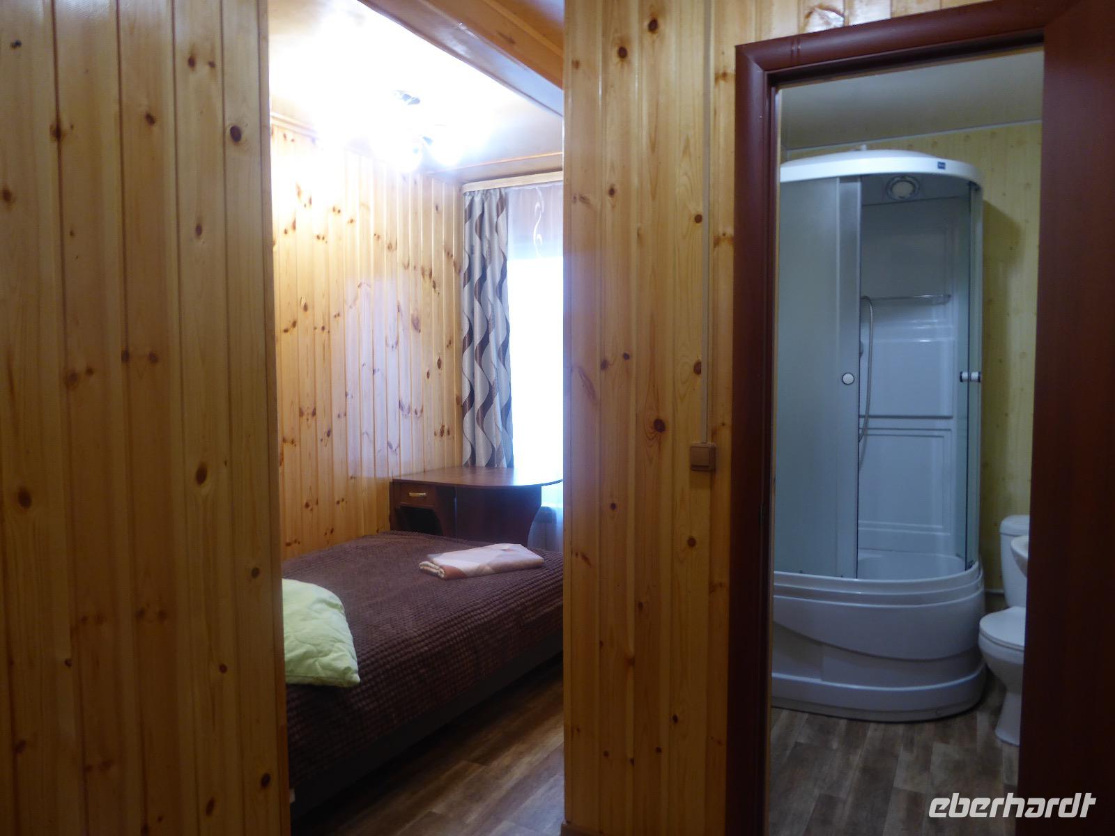 Warme Worte und viele Umarmungen werden gewechselt. Dann stehen die Autos vor der Tür. Irgendjemand hat beschlossen, dass wir nicht zusammen in einem Auto fahren, sondern uns auf beide Autos aufteilen. Gesagt, getan. Die Gruppen von Haus 1 und Haus 2 fahren jetzt also getrennt weiter. Drei Stunden sind es bis Irkutsk. Davon ca. vierzig Kilometer Huckelpiste, also unbefestigte Straße. Wir werden ordentlich durchgerüttelt. In Irkutsk wird ein Auto ausgetauscht. Tanja lässt uns wieder alle zusammen in ein Auto einsteigen. Nun aber haben wir uns schon an die Bequemlichkeit des anderen Autos gewöhnt, außerdem sitzt es sich auf der letzten Reihe wirklich schlecht. Nach kurzer Rücksprache, teilen wir uns wieder auf beide Autos auf. An einer Bank muss Tanja Geld abholen. Das dauert sehr lange, weil es nur einen Automaten gibt. Anschließend starten wir einen Großeinkauf. Morgen wollen wir Picknick machen und wir müssen alles mitnehmen. Der russische Supermarkt macht einen hervorragenden Umsatz an zusätzlich gekauftem Wodka und Süßigkeiten. Noch zwei Stunden Autofahrt und wir kommen am Restaurant an. In einem gemütlichen burjatischen Ambiente gibt es Nudelsuppe, Posy und Kuchen. Bald darauf erreichen wir das Museum in Ust Orda. Wir gehen hinein und kurz darauf wieder hinaus. Unsere Gastgeber sind noch nicht so weit. Ein Mann und eine Frau in burjatischer Tracht zünden vor dem Museum ein kleines Feuer an. Mit einem traditionellen burjatischem Lied werden wir begrüßt. Die Männer müssen ihre Beine und die Frauen ihre Arme über dem Feuer kreisen lassen. Das bringt Glück. Die burjatische Frau hat auch eine Schüssel mit Milch in der Hand. So weiß wie die Milch soll der weitere Weg unserer Reise sein. Das wünscht sie uns. Danke schön. Wir werden durch das Museum geführt. Es besteht schon seit 1938 und wurde während der Sowjetzeit mit Orden ausgezeichnet. Da es ein Geschichtsmuseum ist, beginnt die Ausstellung mit einem 2500jahre altem Jägerzelt und Mammutknochen. Wir erfahren einiges über das harte burjatische Leben, über Handwerkskunst und Schamanen. Nach der Besichtigung erwartet uns das einzige staatliche Folkloreensemble des Burjatischen Bezirke "Steppen-Melodie". Eine Gruppe von zwanzig Sängern und Tänzern, die für uns eine großartige Vorstellung bringen. Der Chef der Gruppe stellt uns seine Mannschaft und die Musikinstrumente vor. Er erklärt vor jedem Lied und vor jedem Tanz, worum es geht. Er fragt auch nach unserem woher und wohin. Da die Männer im burjatischem Leben das Sagen haben, dürfen unsere Männer auch zum Tanz antreten. Auch zu einem Ringkampf werden sie aufgefordert. Hier stellt sich heraus, dass Toni ein ehemaliger Ringer ist. Und er schlägt sich tatsächlich nicht schlecht. Der junge Burjate hat kaum eine Chance. Alles natürlich nur Spiel und Spaß. Zum Abschluss tanzen wir alle den Reigen der Freundschaft. Wir lernen wie man sich burjatisch begrüßt und werden dann verabschiedet. Das war ein einmaliges Erlebnis und definitiv ein Höhepunkt dieser Reise. Wir haben noch drei Stunden Fahrt vor uns. Ziel ist die Krestovaja Bucht. Noch gibt es eine glatte Straße, die zwar bergauf bergab führt, aber eben eine Straße ist. Zwanzig Kilometer vor unserem Ziel biegen wir von der Straße ab. Jetzt sind wir auf einem modrigen Waldboden unterwegs. Immer wieder müssen die Fahrer aussteigen und abschätzen, ob sie durch diese oder jene Pfütze durchfahren können. Langsam wird es dunkel und Tanja mahnt zur Eile. Auf dieser Piste will niemand im Dunkeln unterwegs sein. Aber wir schaffen es. Nur noch ein Stückchen und wir sind am Krestovaja Resort, unserer heutigen Unterkunft. Unsere Gastgeberin begrüßt uns freundlich und kommt unserer dringenden Bitte nach, uns Zimmer mit Dusche und Toilette zur Verfügung zu stellen. Davon gibt es nur vier. Zwei davon mit Innen-WC, bei den anderen beiden befindet sich die Nasszelle direkt neben dem Zimmer. Trotzdem, für hiesige Verhältnisse äußerst komfortabel. Die Glücklichen, die diese Zimmer erwischt haben, laden die anderen ein, Dusche und WC mit zu benutzen. Danke, Ihr Lieben! Denn ansonsten gibt es nur ein Plumpsklo (was entsprechend riecht) und Duschen mit eisigkaltem Wasser. Das Abendessen ist fertig. Aufgetischt werden warmer Kartoffelstampf, kalte Frikadellen, Gemüsesalate mit viel Knoblauch und geröstete Brotkrumen zum Knabbern. Irgendjemand entdeckt, dass die Fahrer Suppe essen und bekommt Appetit darauf. Eine Nachfrage ergibt, dass die Suppe das Abendessen der Familie ist und nur noch wenig übrig ist. Dieses Wenige würden sie uns aber gerne geben, was sie auch tun. Der Dank gilt unseren herzlichen Gastgebern. Nach dem Abendessen sitzen wir in gemütlicher Wodka-Runde mit unseren Fahrern Sergej und Alexander zusammen und erfahren nun auch persönliches von ihnen. Sogar unser spröder Alexander taut auf und kommuniziert mit uns. Gegen halb elf löst sich die Runde auf, denn um elf wird der Generator abgestellt und es gibt keinen Strom und kein Licht mehr.