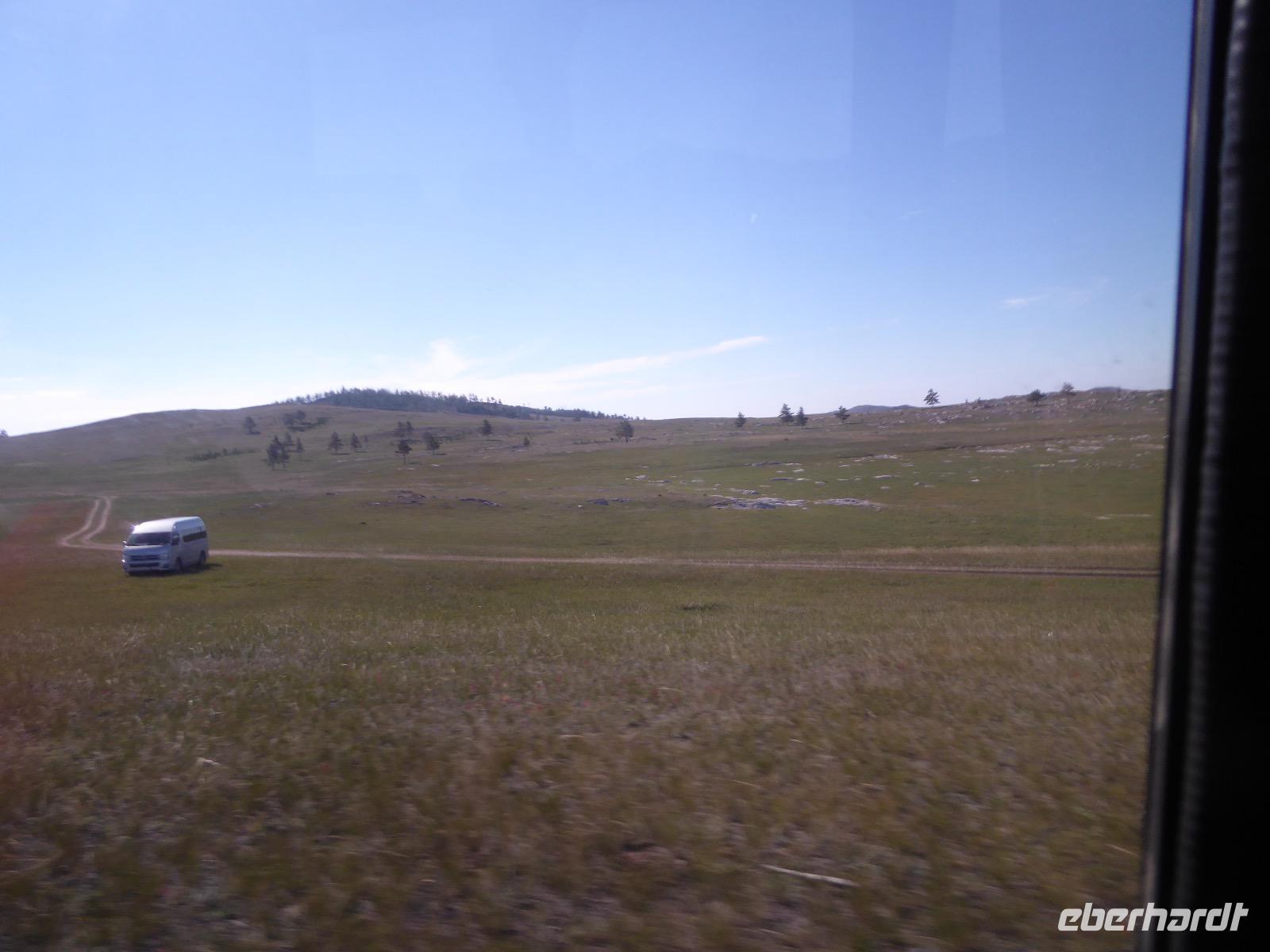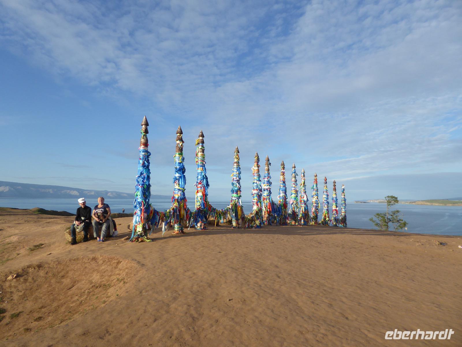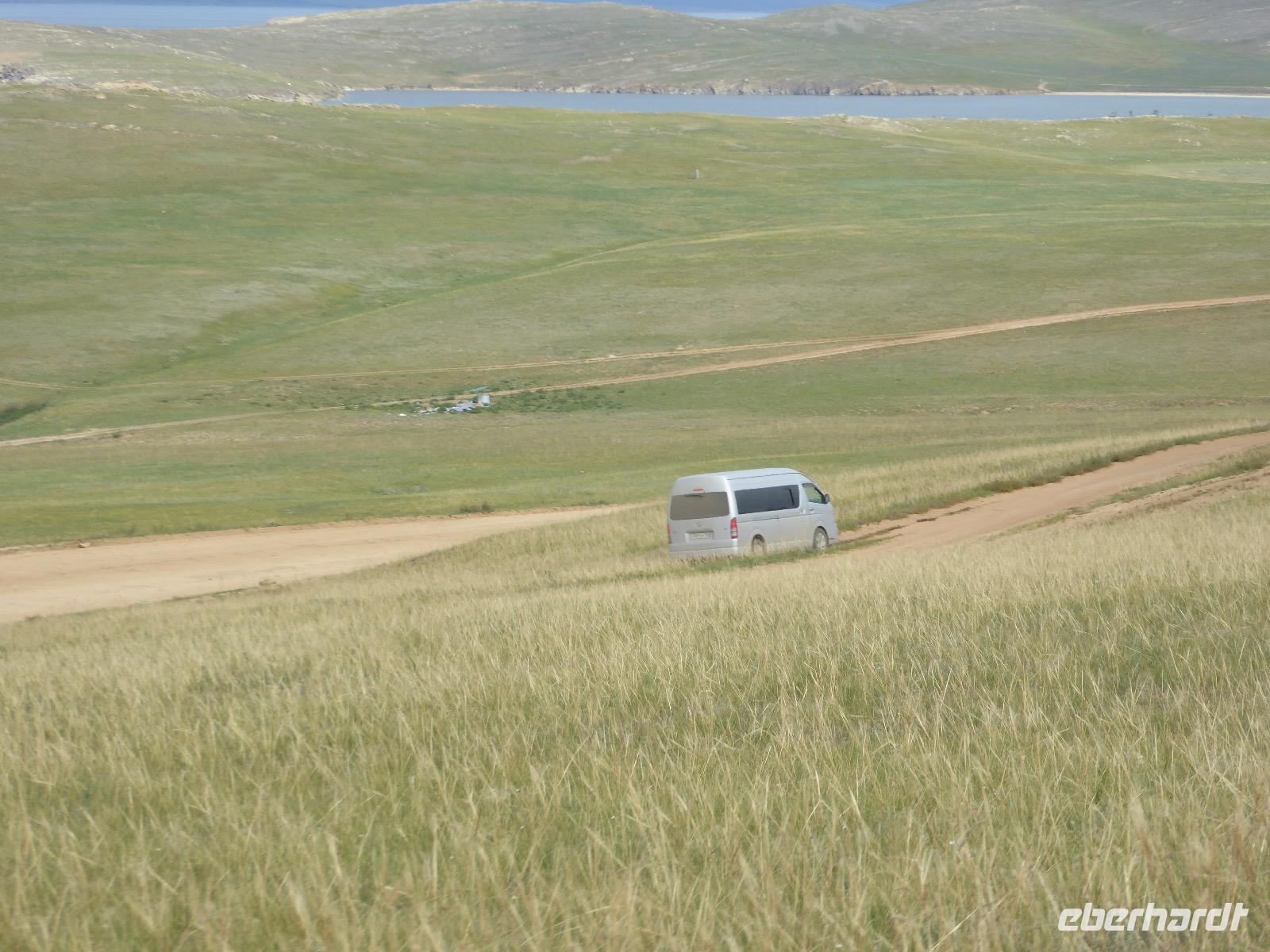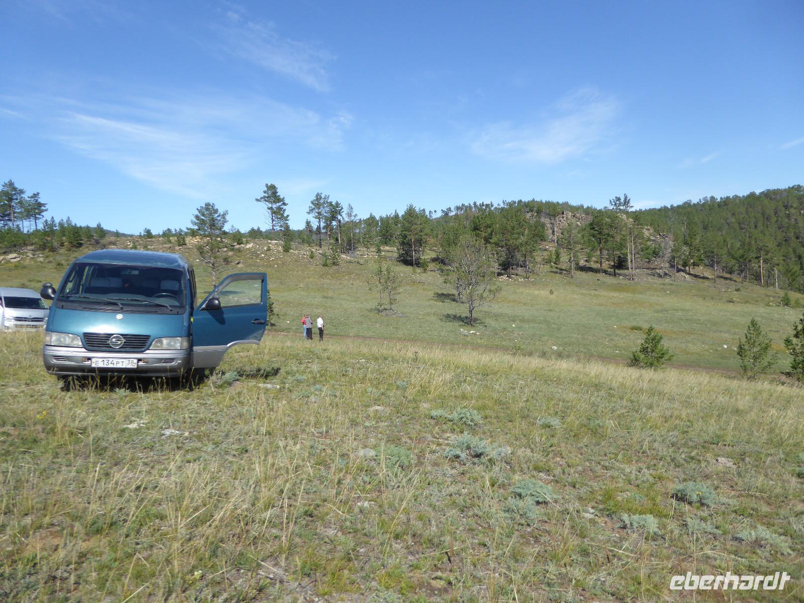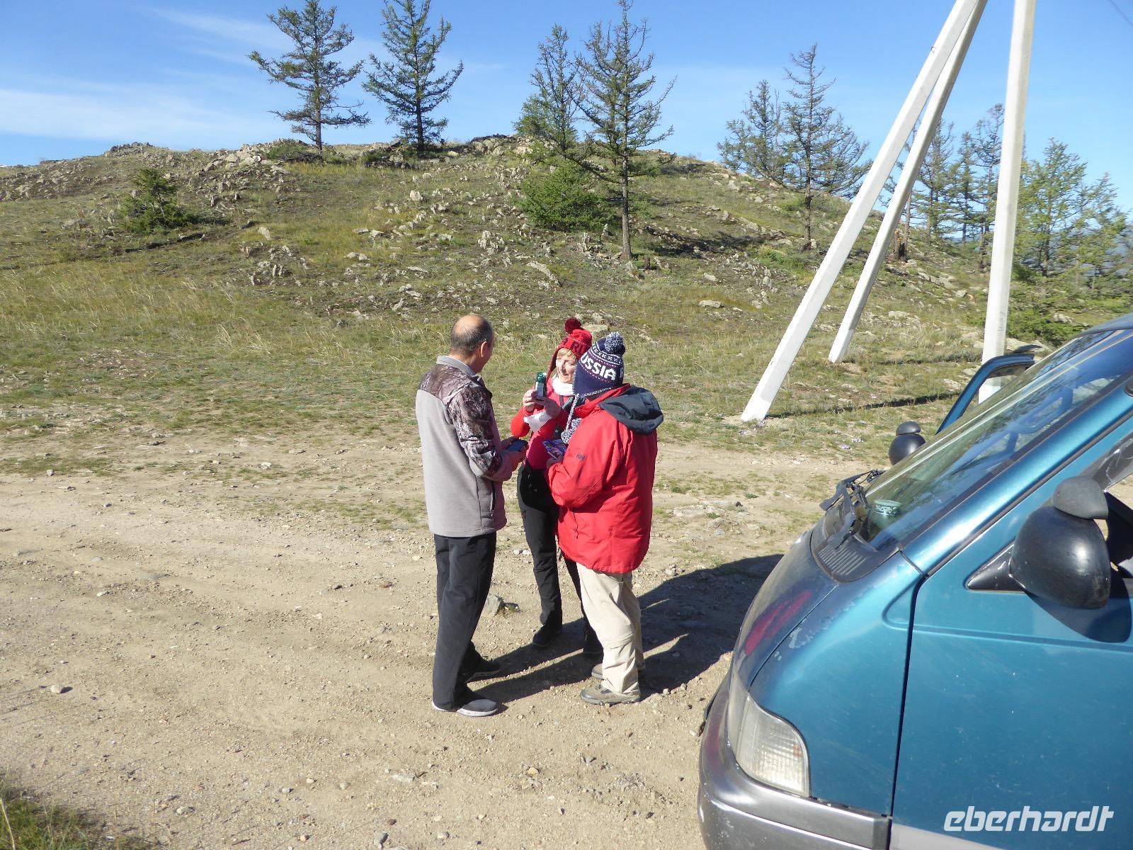 Früh ist es hell, wir brauchen keinen Strom für das Licht. Ein Morgenspaziergang am Baikalsee weckt die müden Glieder. Frühstück gibt es ab um neun. Hm, wie die Quarkkeulchen duften! Dazu Spiegelei auf sibirische Art, Brot, Marmelade, Tee. Kurz vor zehn laden wir die Koffer ein und verabschieden uns von Adel, unserer Gastgeberin. Wieder geht es auf und ab, wieder werden wir ordentlich durchgerüttelt. Doch es ist nicht so matschig wie gestern. Der Weg führt uns durch die traumhafte Landschaft der Tageransteppe. Wir halten an schönen Aussichtspunkten und um nach dem Weg zu schauen. Die Straße, die wir nehmen wollen, ist von Geröll überschüttet. Wir fahren zum Sagan-Saba und legen dort unser Picknick ein. Die Zutaten haben wir gestern im Magasin gekauft. Nun soll es zum Jeche-Jordo gehen. Unsere Tanja vertut sich etwas und hält am falschen Berg. Dafür bekommen wir hier ein Schauspiel der besonderen Art. Eine Gruppe Kühe und Bullen ist gerade dabei, Nachwuchs zu zeugen. Unseren nächsten Stopp legen wir am Adler-Totem ein - auch ein schamanischer Ort.