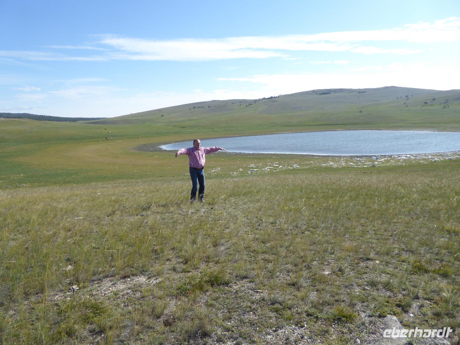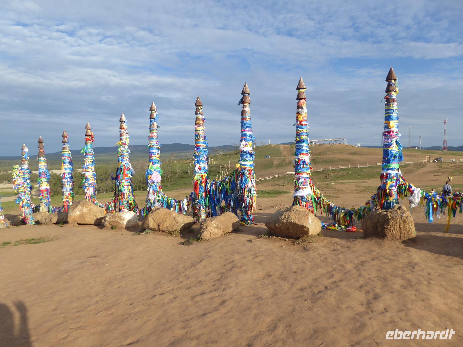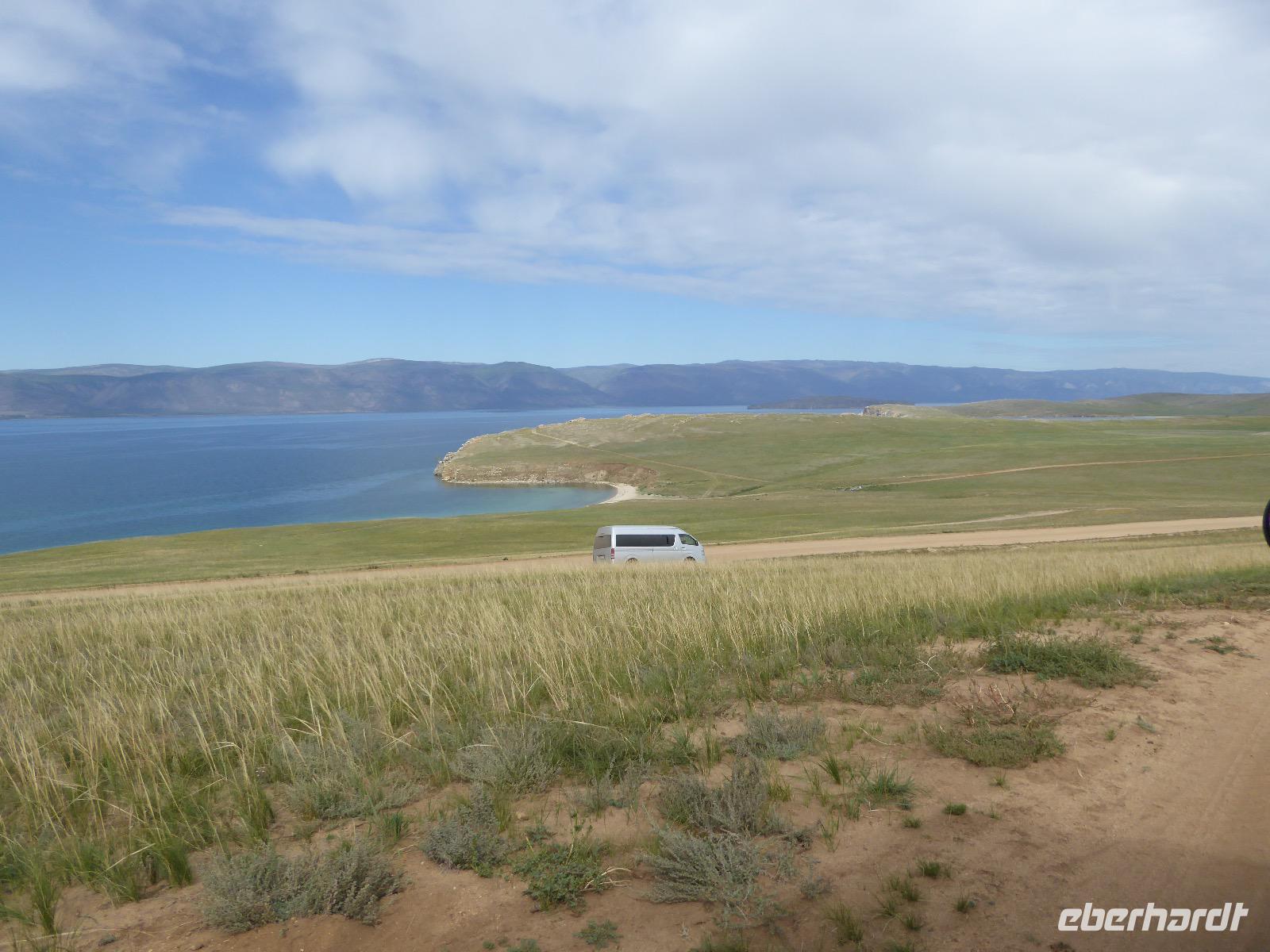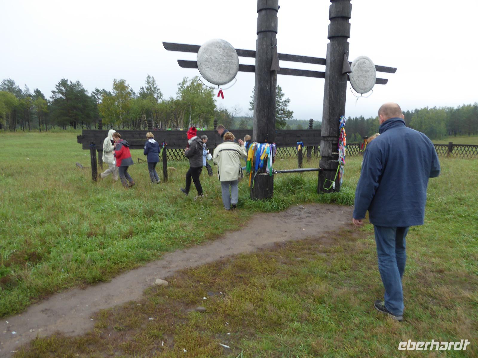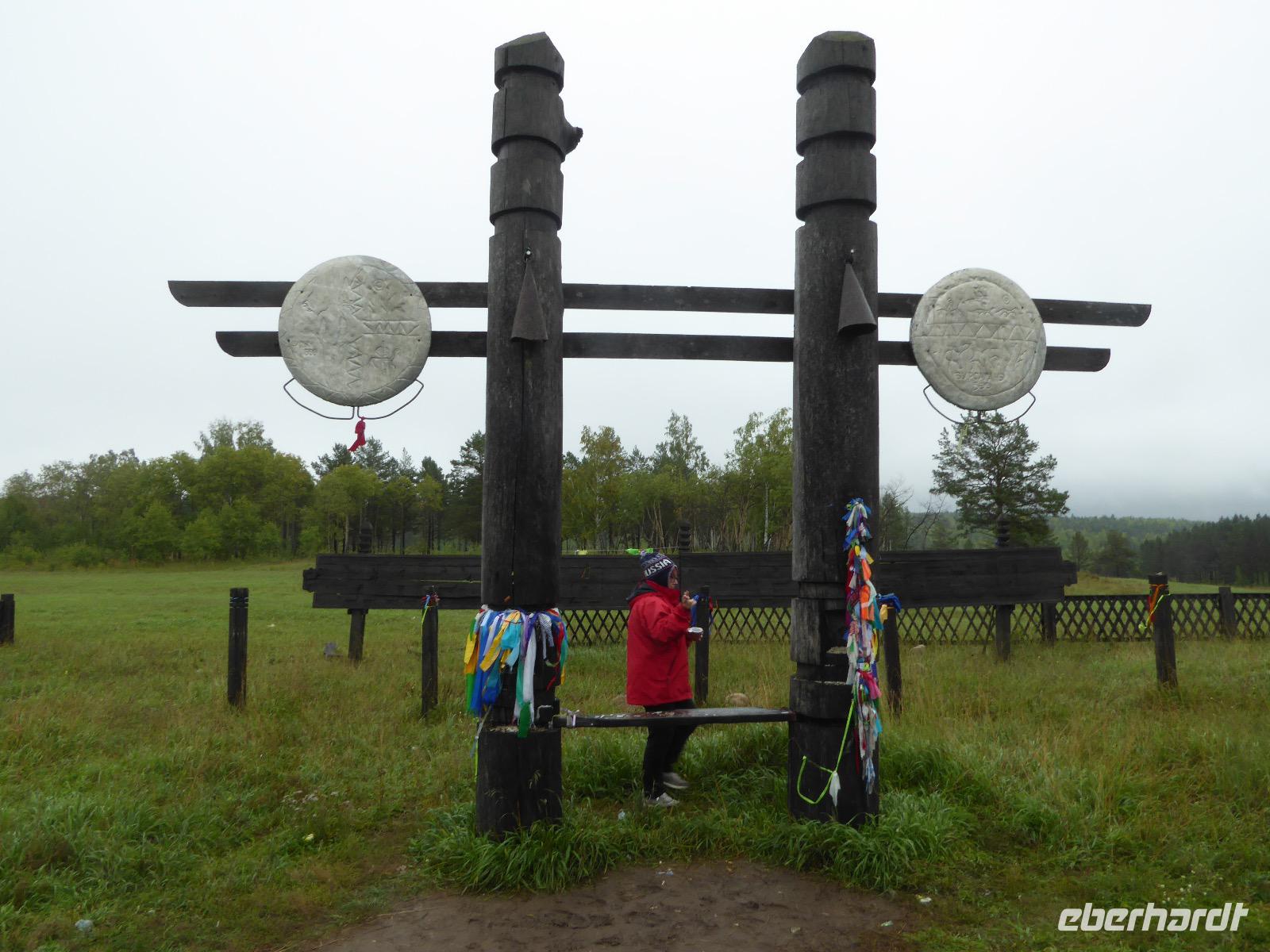 Früh ist es hell, wir brauchen keinen Strom für das Licht. Ein Morgenspaziergang am Baikalsee weckt die müden Glieder. Frühstück gibt es ab um neun. Hm, wie die Quarkkeulchen duften! Dazu Spiegelei auf sibirische Art, Brot, Marmelade, Tee. Kurz vor zehn laden wir die Koffer ein und verabschieden uns von Adel, unserer Gastgeberin. Wieder geht es auf und ab, wieder werden wir ordentlich durchgerüttelt. Doch es ist nicht so matschig wie gestern. Der Weg führt uns durch die traumhafte Landschaft der Tageransteppe. Wir halten an schönen Aussichtspunkten und um nach dem Weg zu schauen. Die Straße, die wir nehmen wollen, ist von Geröll überschüttet. Wir fahren zum Sagan-Saba und legen dort unser Picknick ein. Die Zutaten haben wir gestern im Magasin gekauft. Nun soll es zum Jeche-Jordo gehen. Unsere Tanja vertut sich etwas und hält am falschen Berg. Dafür bekommen wir hier ein Schauspiel der besonderen Art. Eine Gruppe Kühe und Bullen ist gerade dabei, Nachwuchs zu zeugen. Unseren nächsten Stopp legen wir am Adler-Totem ein - auch ein schamanischer Ort.