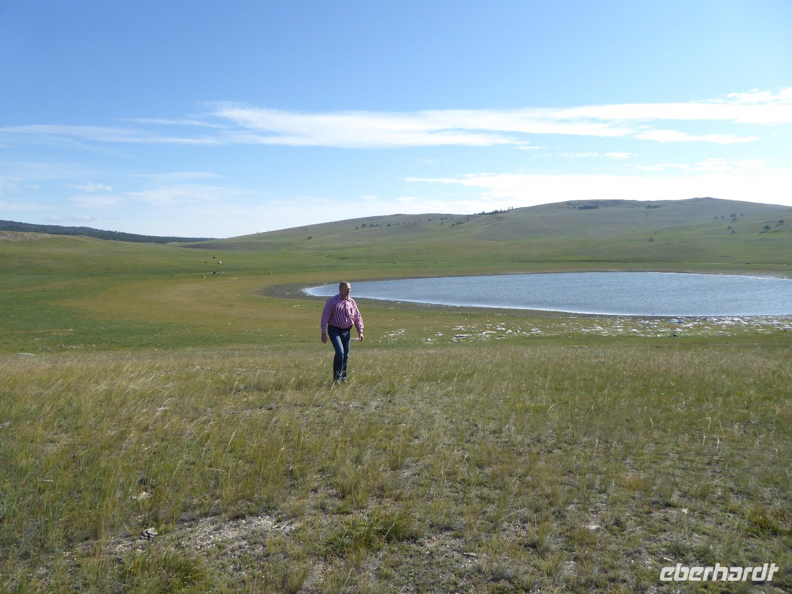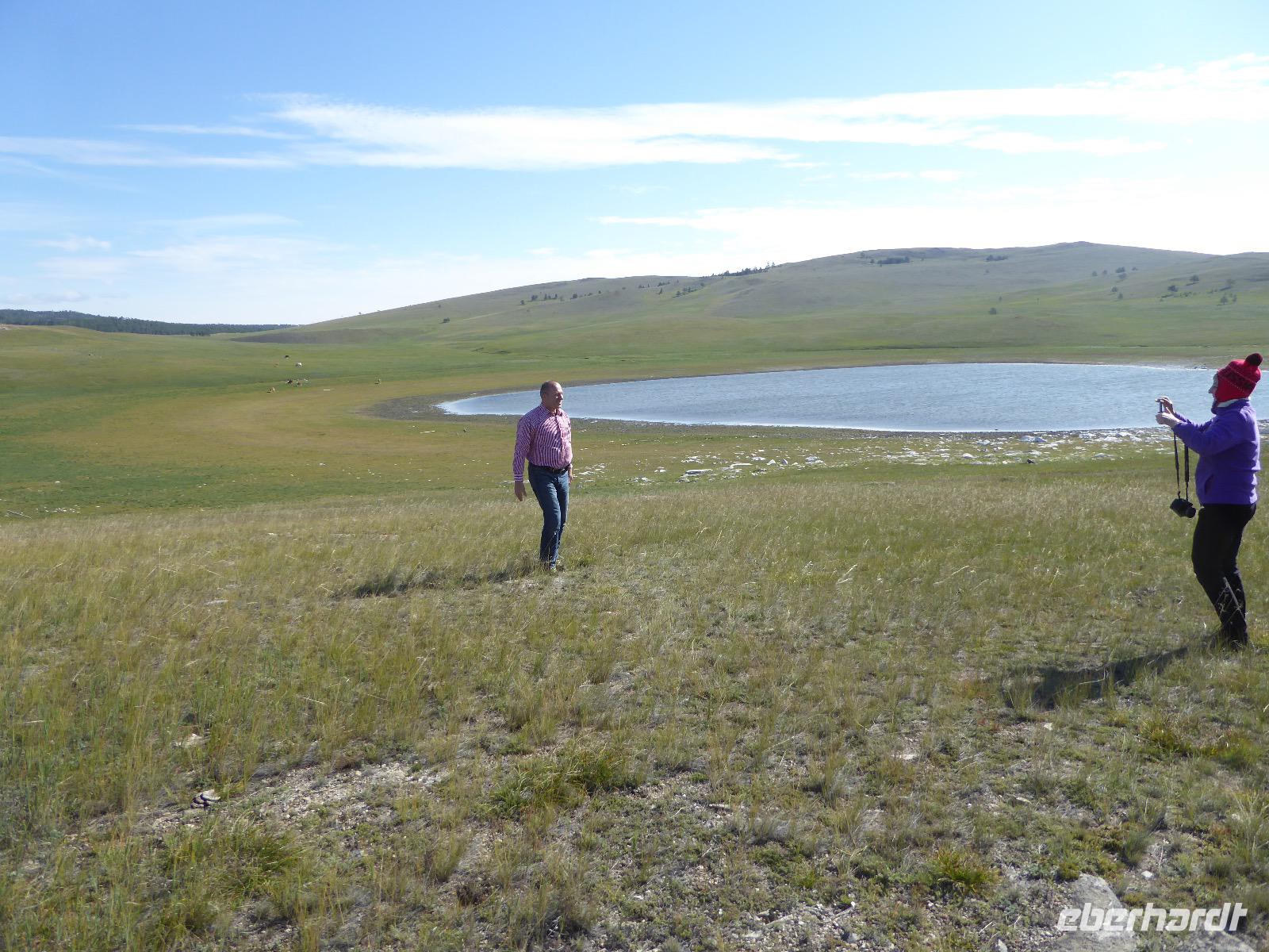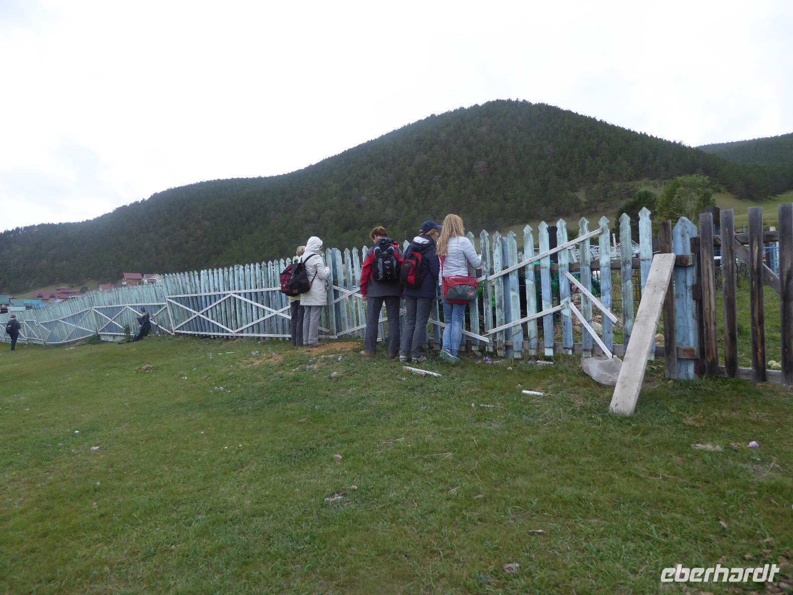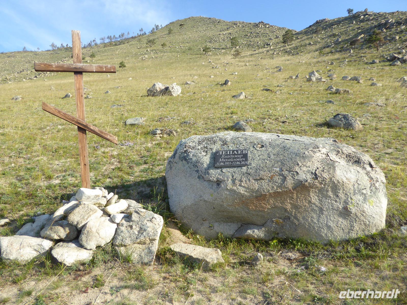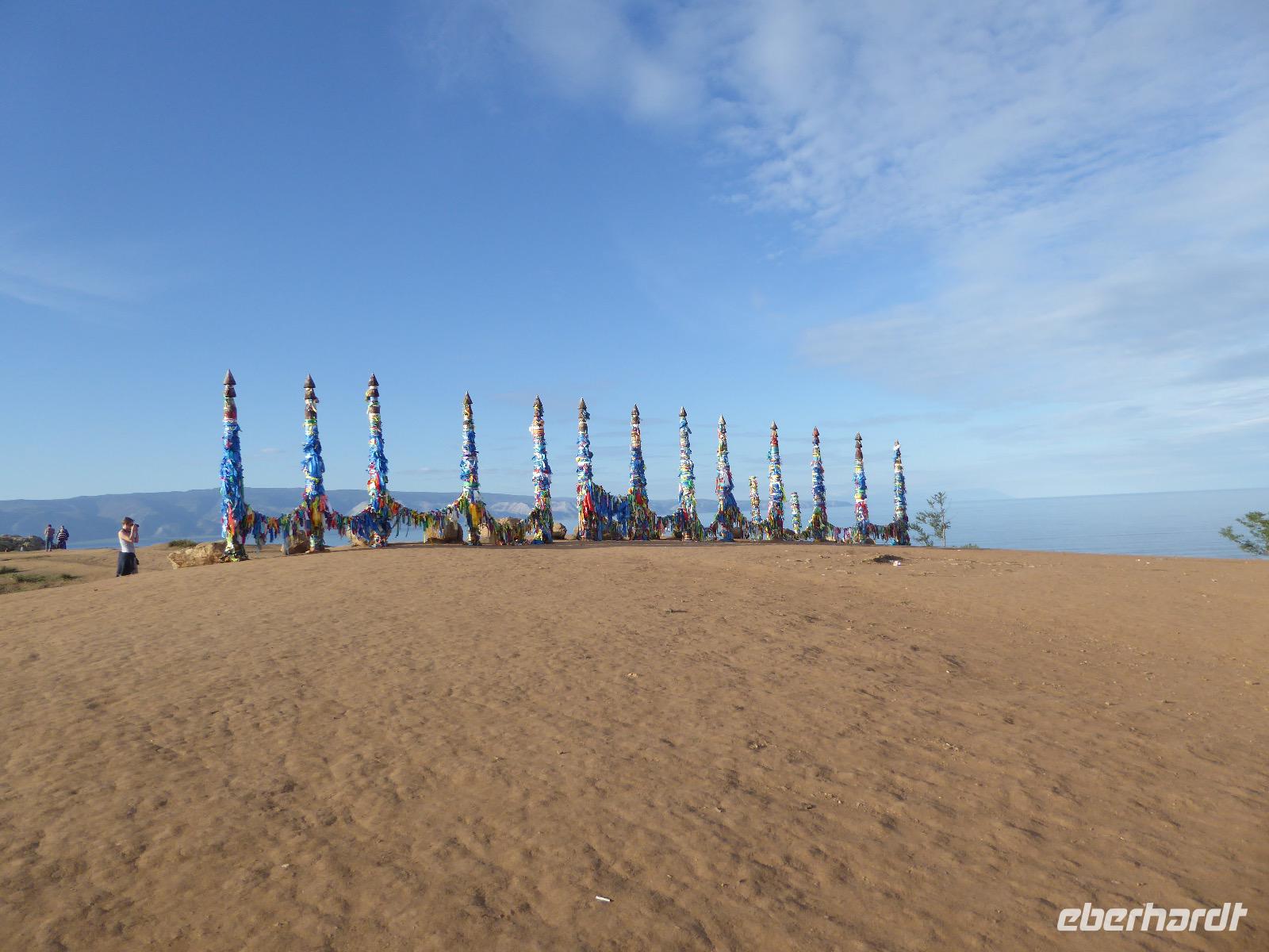 Früh ist es hell, wir brauchen keinen Strom für das Licht. Ein Morgenspaziergang am Baikalsee weckt die müden Glieder. Frühstück gibt es ab um neun. Hm, wie die Quarkkeulchen duften! Dazu Spiegelei auf sibirische Art, Brot, Marmelade, Tee. Kurz vor zehn laden wir die Koffer ein und verabschieden uns von Adel, unserer Gastgeberin. Wieder geht es auf und ab, wieder werden wir ordentlich durchgerüttelt. Doch es ist nicht so matschig wie gestern. Der Weg führt uns durch die traumhafte Landschaft der Tageransteppe. Wir halten an schönen Aussichtspunkten und um nach dem Weg zu schauen. Die Straße, die wir nehmen wollen, ist von Geröll überschüttet. Wir fahren zum Sagan-Saba und legen dort unser Picknick ein. Die Zutaten haben wir gestern im Magasin gekauft. Nun soll es zum Jeche-Jordo gehen. Unsere Tanja vertut sich etwas und hält am falschen Berg. Dafür bekommen wir hier ein Schauspiel der besonderen Art. Eine Gruppe Kühe und Bullen ist gerade dabei, Nachwuchs zu zeugen. Unseren nächsten Stopp legen wir am Adler-Totem ein - auch ein schamanischer Ort.