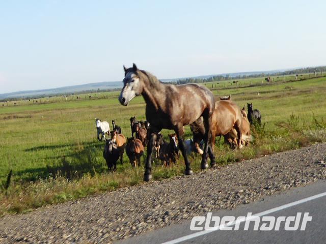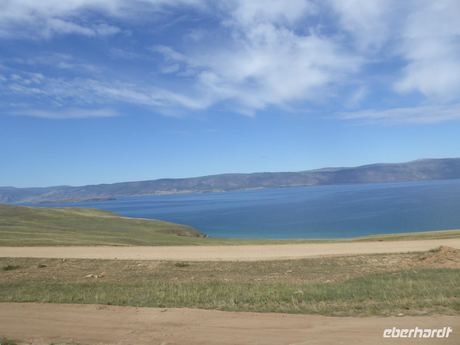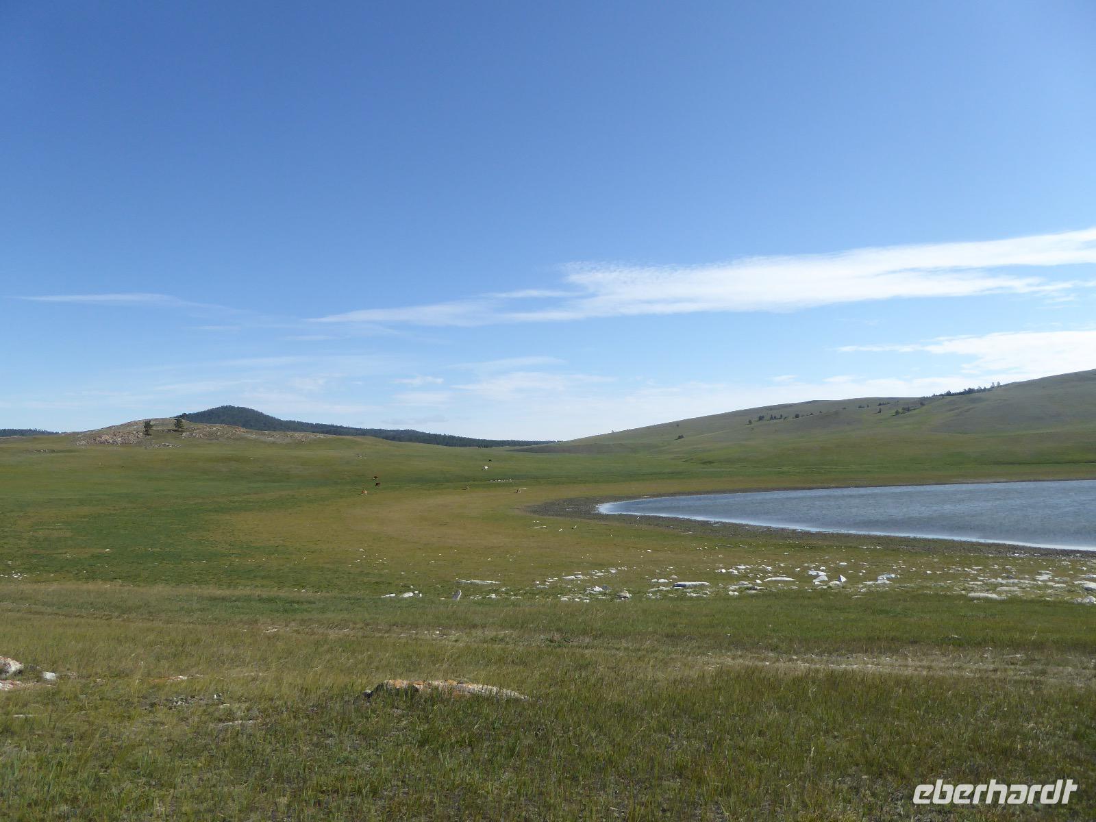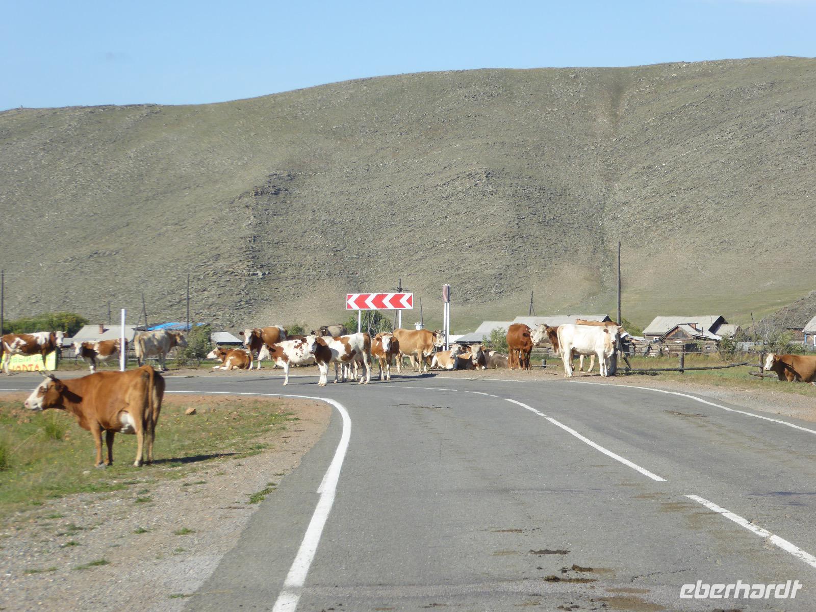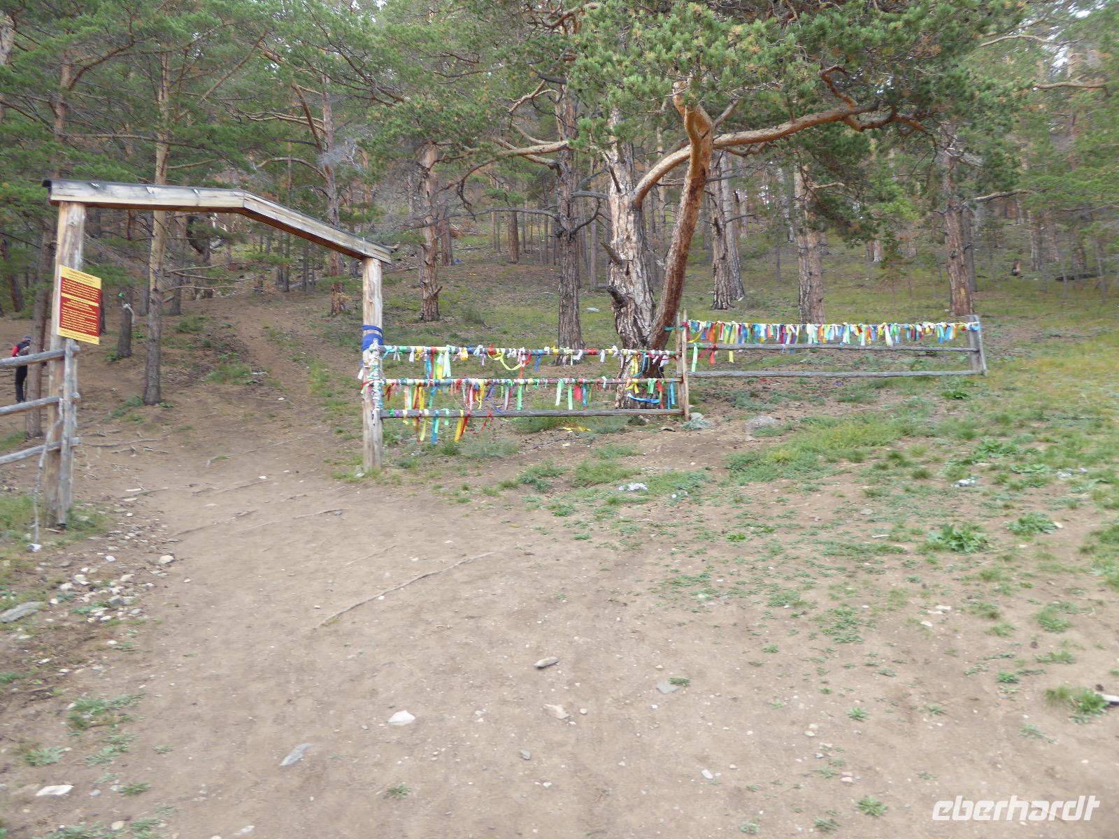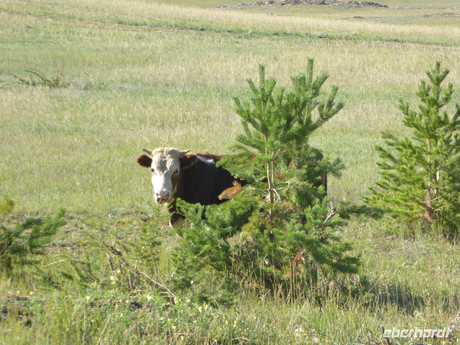 Früh ist es hell, wir brauchen keinen Strom für das Licht. Ein Morgenspaziergang am Baikalsee weckt die müden Glieder. Frühstück gibt es ab um neun. Hm, wie die Quarkkeulchen duften! Dazu Spiegelei auf sibirische Art, Brot, Marmelade, Tee. Kurz vor zehn laden wir die Koffer ein und verabschieden uns von Adel, unserer Gastgeberin. Wieder geht es auf und ab, wieder werden wir ordentlich durchgerüttelt. Doch es ist nicht so matschig wie gestern. Der Weg führt uns durch die traumhafte Landschaft der Tageransteppe. Wir halten an schönen Aussichtspunkten und um nach dem Weg zu schauen. Die Straße, die wir nehmen wollen, ist von Geröll überschüttet. Wir fahren zum Sagan-Saba und legen dort unser Picknick ein. Die Zutaten haben wir gestern im Magasin gekauft. Nun soll es zum Jeche-Jordo gehen. Unsere Tanja vertut sich etwas und hält am falschen Berg. Dafür bekommen wir hier ein Schauspiel der besonderen Art. Eine Gruppe Kühe und Bullen ist gerade dabei, Nachwuchs zu zeugen. Unseren nächsten Stopp legen wir am Adler-Totem ein - auch ein schamanischer Ort.