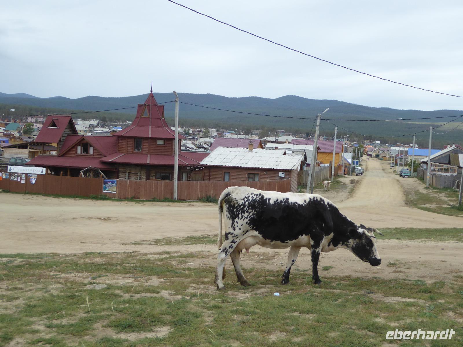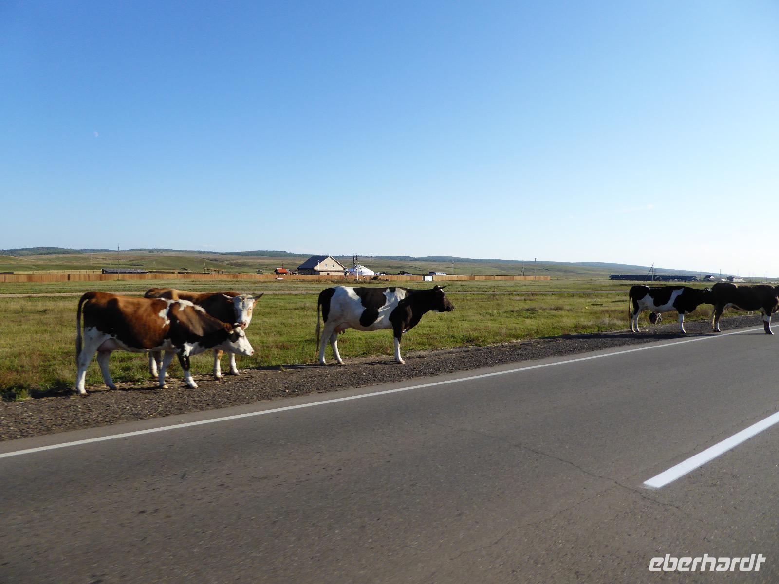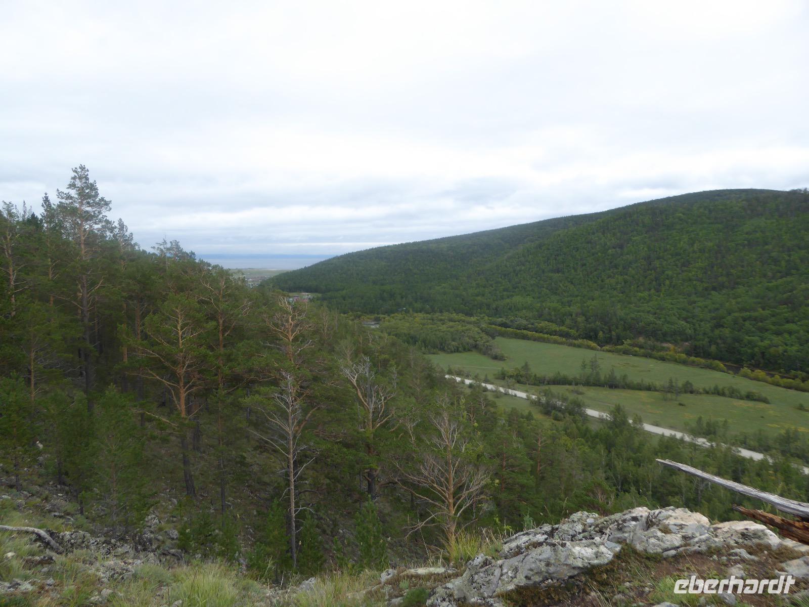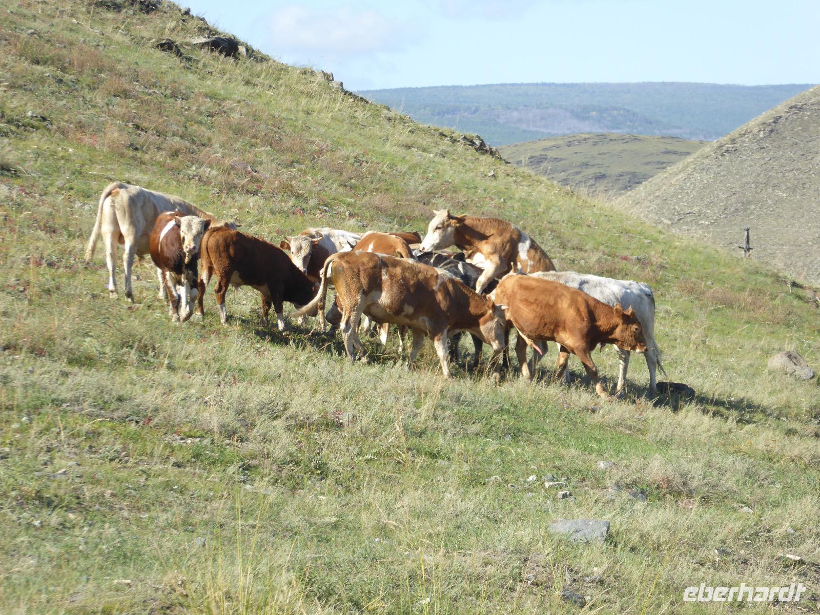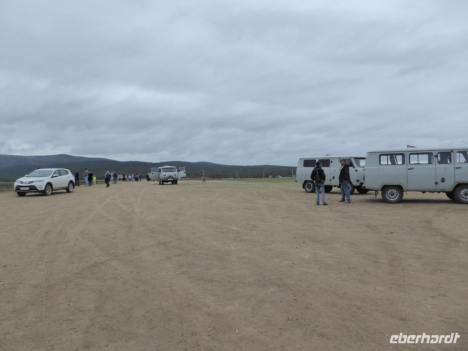 Früh ist es hell, wir brauchen keinen Strom für das Licht. Ein Morgenspaziergang am Baikalsee weckt die müden Glieder. Frühstück gibt es ab um neun. Hm, wie die Quarkkeulchen duften! Dazu Spiegelei auf sibirische Art, Brot, Marmelade, Tee. Kurz vor zehn laden wir die Koffer ein und verabschieden uns von Adel, unserer Gastgeberin. Wieder geht es auf und ab, wieder werden wir ordentlich durchgerüttelt. Doch es ist nicht so matschig wie gestern. Der Weg führt uns durch die traumhafte Landschaft der Tageransteppe. Wir halten an schönen Aussichtspunkten und um nach dem Weg zu schauen. Die Straße, die wir nehmen wollen, ist von Geröll überschüttet. Wir fahren zum Sagan-Saba und legen dort unser Picknick ein. Die Zutaten haben wir gestern im Magasin gekauft. Nun soll es zum Jeche-Jordo gehen. Unsere Tanja vertut sich etwas und hält am falschen Berg. Dafür bekommen wir hier ein Schauspiel der besonderen Art. Eine Gruppe Kühe und Bullen ist gerade dabei, Nachwuchs zu zeugen. Unseren nächsten Stopp legen wir am Adler-Totem ein - auch ein schamanischer Ort.
