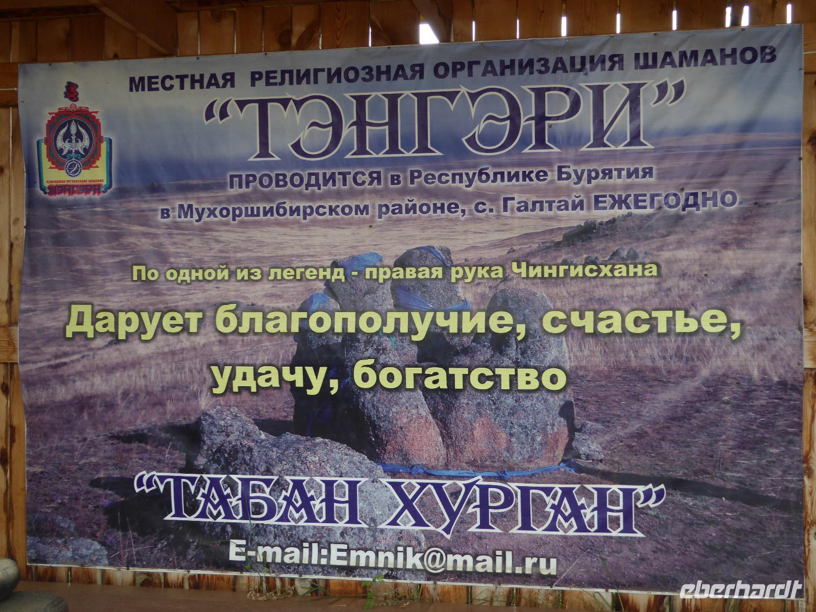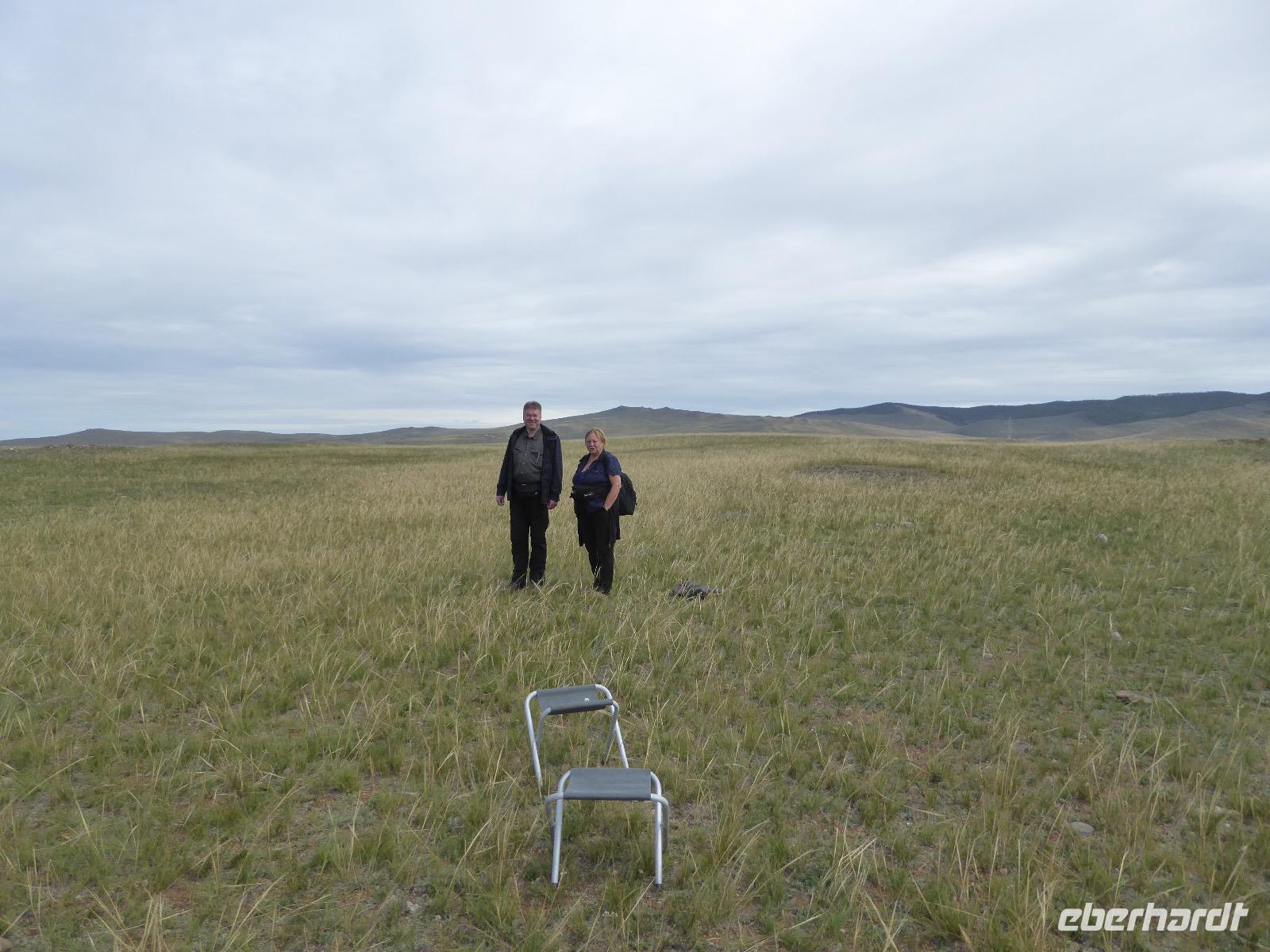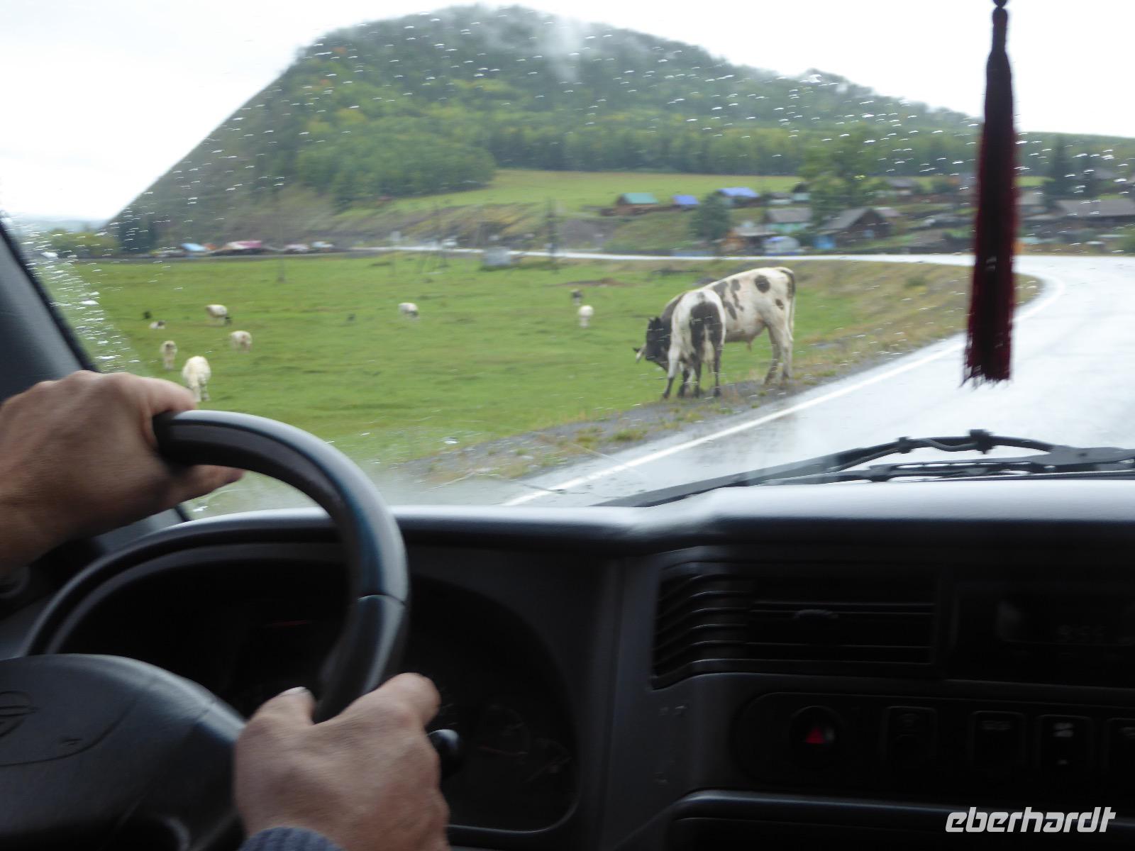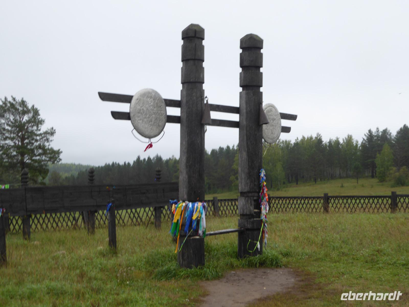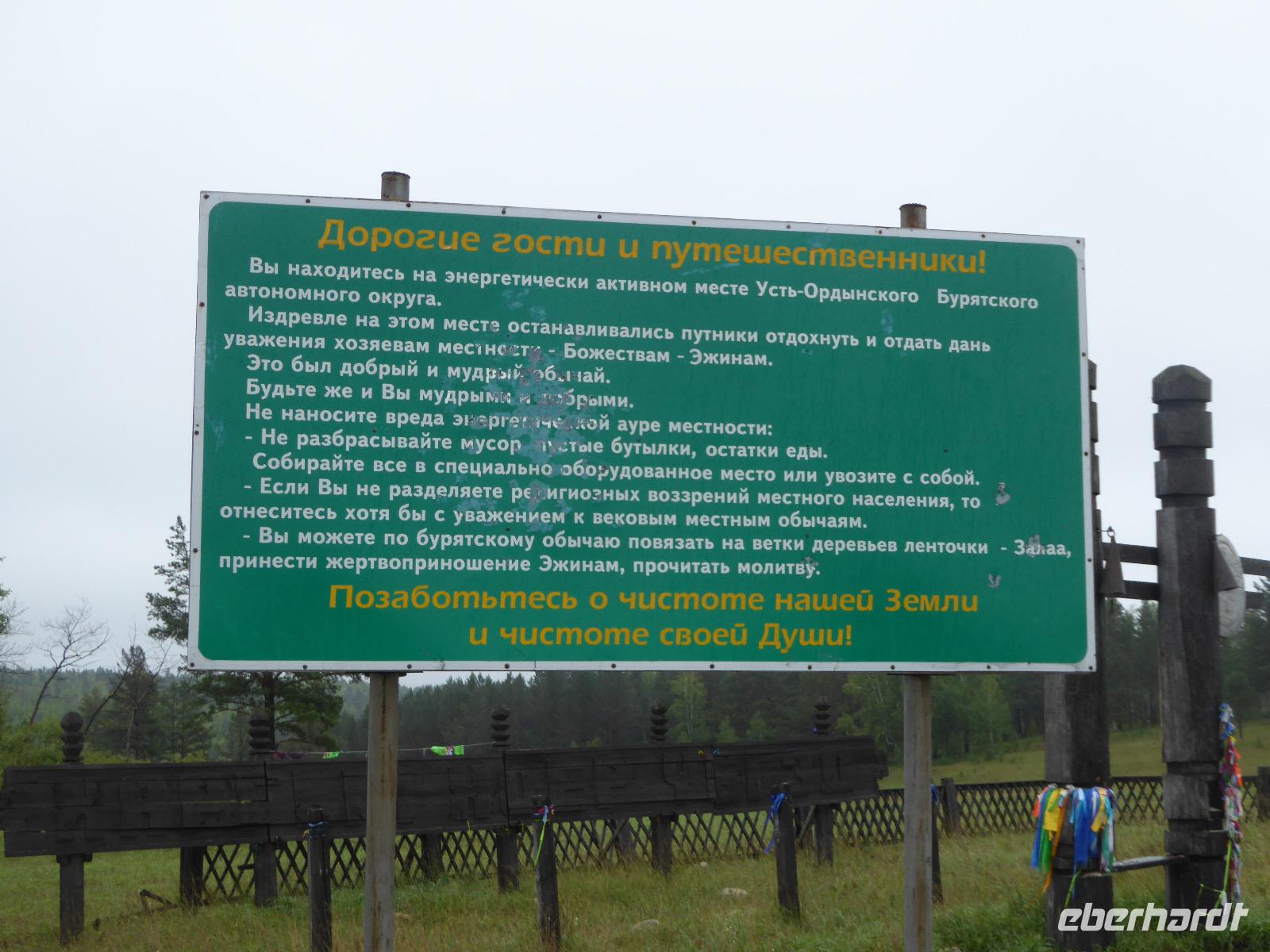 Früh ist es hell, wir brauchen keinen Strom für das Licht. Ein Morgenspaziergang am Baikalsee weckt die müden Glieder. Frühstück gibt es ab um neun. Hm, wie die Quarkkeulchen duften! Dazu Spiegelei auf sibirische Art, Brot, Marmelade, Tee. Kurz vor zehn laden wir die Koffer ein und verabschieden uns von Adel, unserer Gastgeberin. Wieder geht es auf und ab, wieder werden wir ordentlich durchgerüttelt. Doch es ist nicht so matschig wie gestern. Der Weg führt uns durch die traumhafte Landschaft der Tageransteppe. Wir halten an schönen Aussichtspunkten und um nach dem Weg zu schauen. Die Straße, die wir nehmen wollen, ist von Geröll überschüttet. Wir fahren zum Sagan-Saba und legen dort unser Picknick ein. Die Zutaten haben wir gestern im Magasin gekauft. Nun soll es zum Jeche-Jordo gehen. Unsere Tanja vertut sich etwas und hält am falschen Berg. Dafür bekommen wir hier ein Schauspiel der besonderen Art. Eine Gruppe Kühe und Bullen ist gerade dabei, Nachwuchs zu zeugen. Unseren nächsten Stopp legen wir am Adler-Totem ein - auch ein schamanischer Ort.