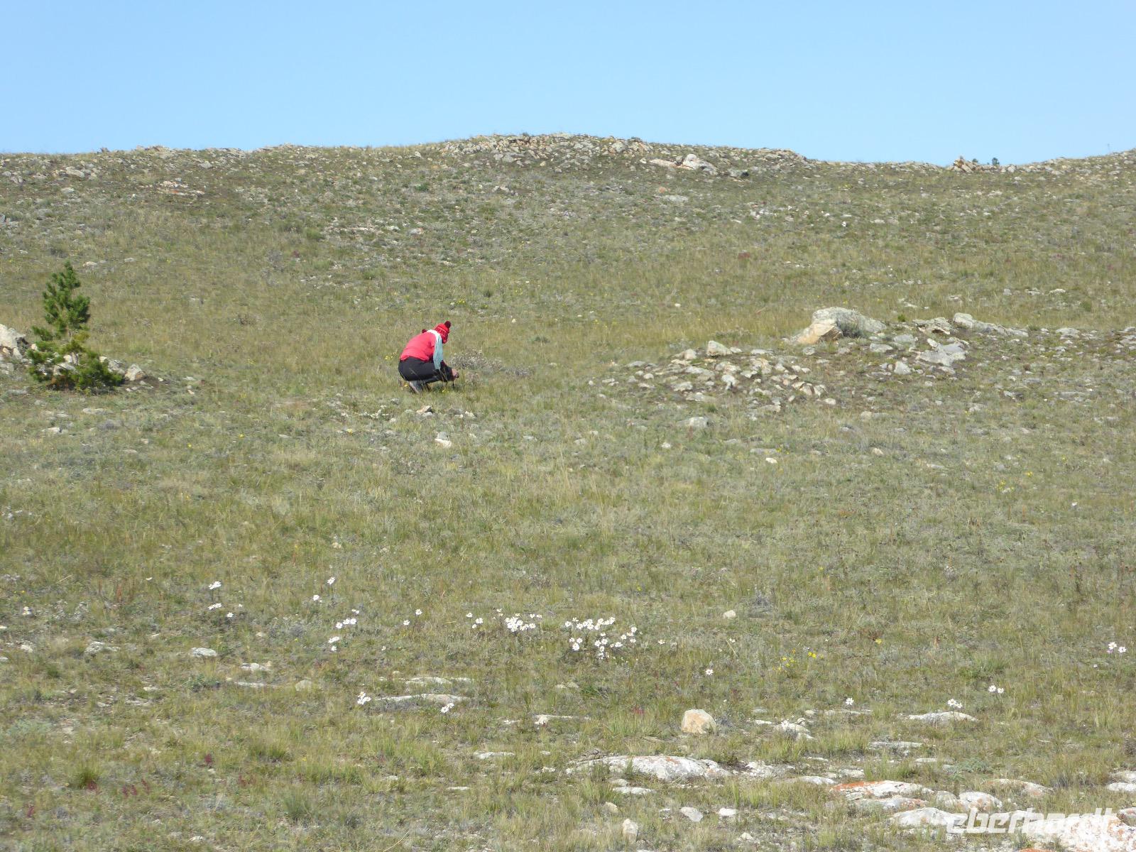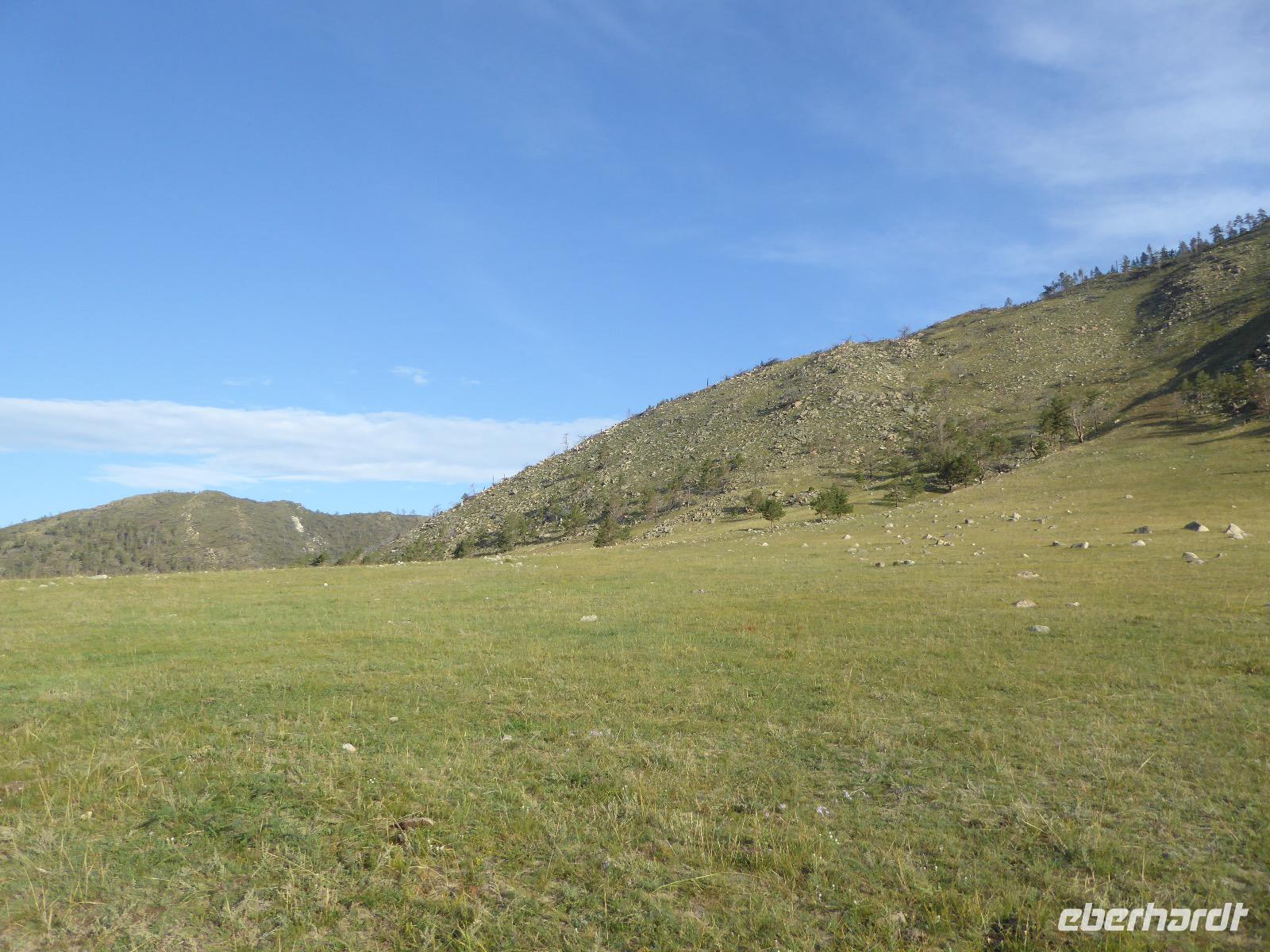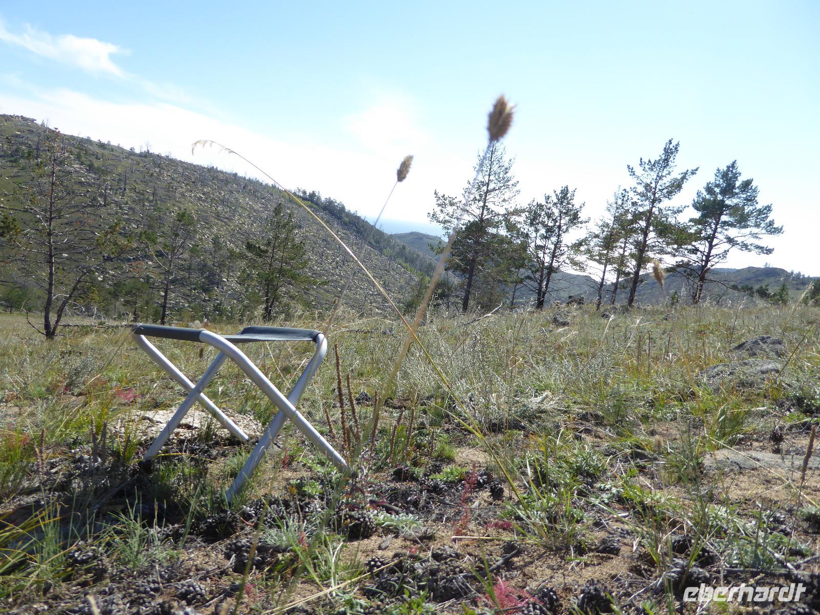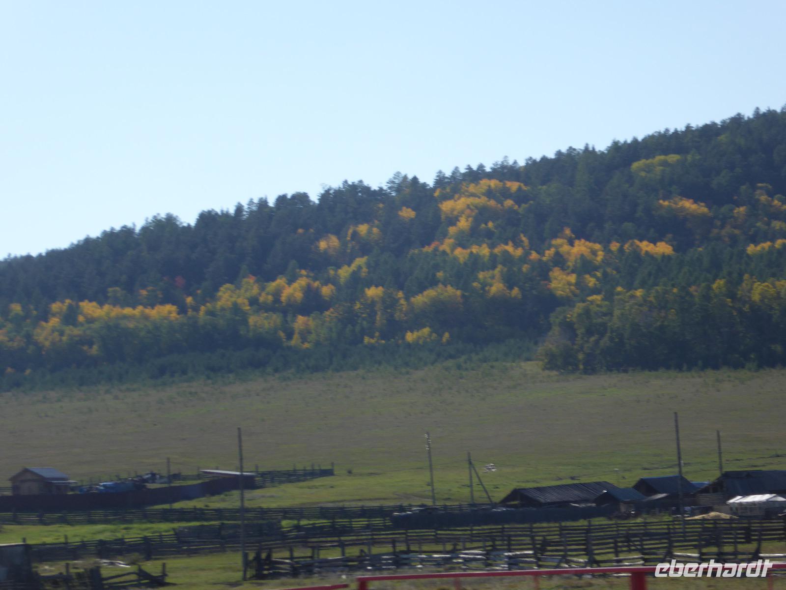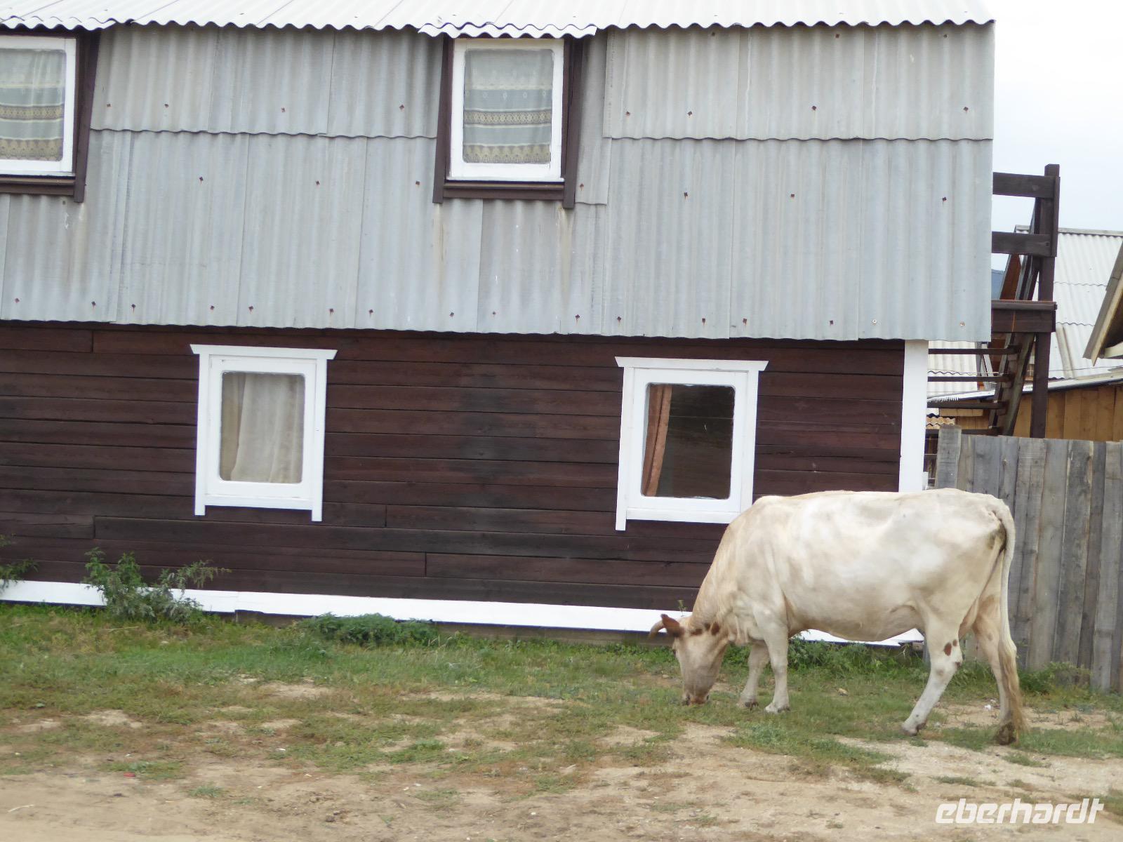 Früh ist es hell, wir brauchen keinen Strom für das Licht. Ein Morgenspaziergang am Baikalsee weckt die müden Glieder. Frühstück gibt es ab um neun. Hm, wie die Quarkkeulchen duften! Dazu Spiegelei auf sibirische Art, Brot, Marmelade, Tee. Kurz vor zehn laden wir die Koffer ein und verabschieden uns von Adel, unserer Gastgeberin. Wieder geht es auf und ab, wieder werden wir ordentlich durchgerüttelt. Doch es ist nicht so matschig wie gestern. Der Weg führt uns durch die traumhafte Landschaft der Tageransteppe. Wir halten an schönen Aussichtspunkten und um nach dem Weg zu schauen. Die Straße, die wir nehmen wollen, ist von Geröll überschüttet. Wir fahren zum Sagan-Saba und legen dort unser Picknick ein. Die Zutaten haben wir gestern im Magasin gekauft. Nun soll es zum Jeche-Jordo gehen. Unsere Tanja vertut sich etwas und hält am falschen Berg. Dafür bekommen wir hier ein Schauspiel der besonderen Art. Eine Gruppe Kühe und Bullen ist gerade dabei, Nachwuchs zu zeugen. Unseren nächsten Stopp legen wir am Adler-Totem ein - auch ein schamanischer Ort.