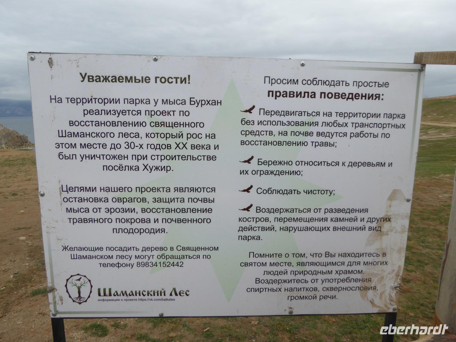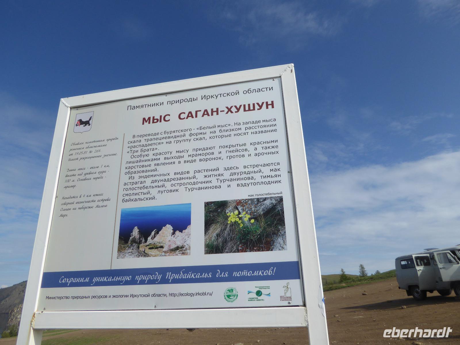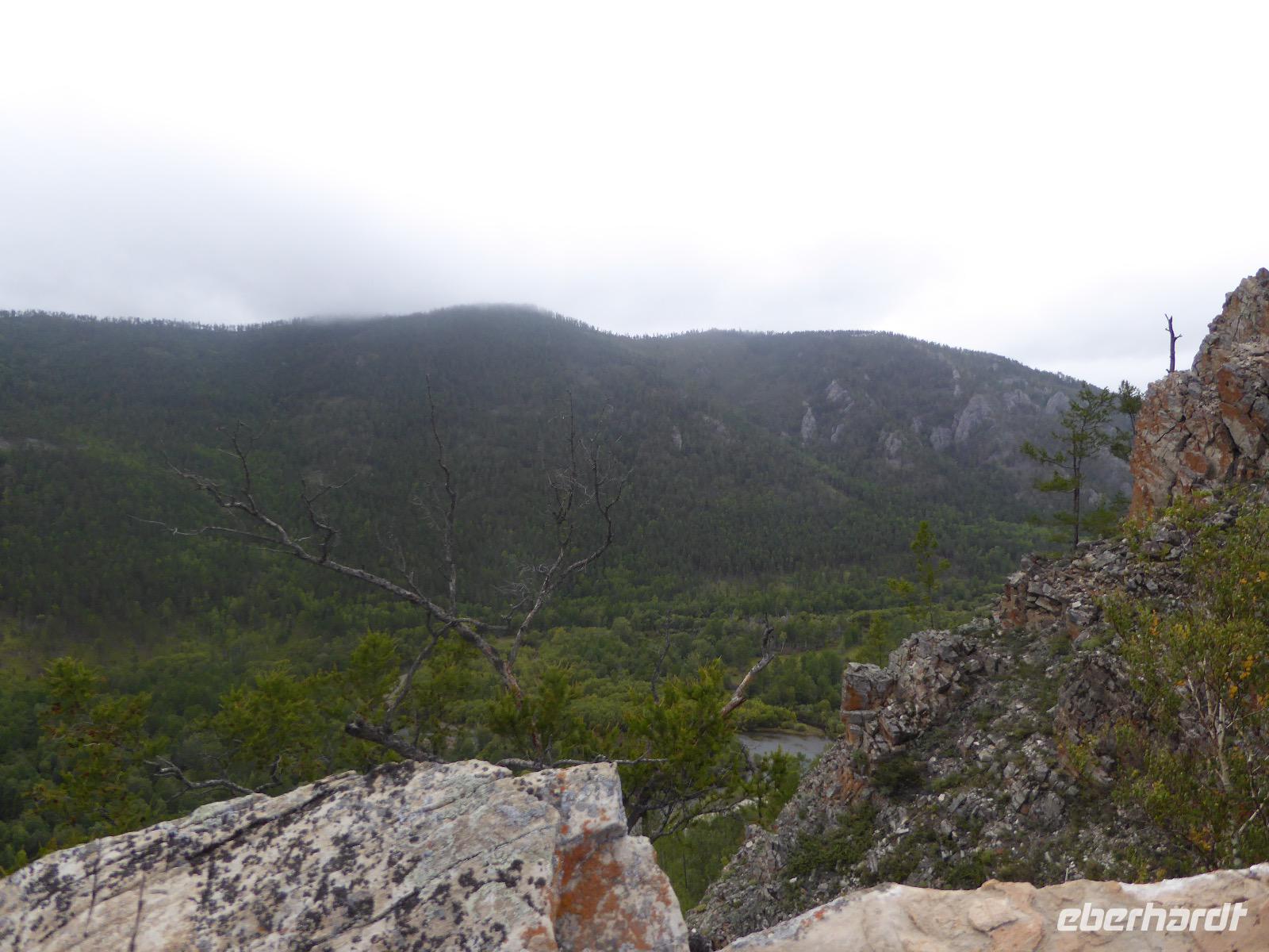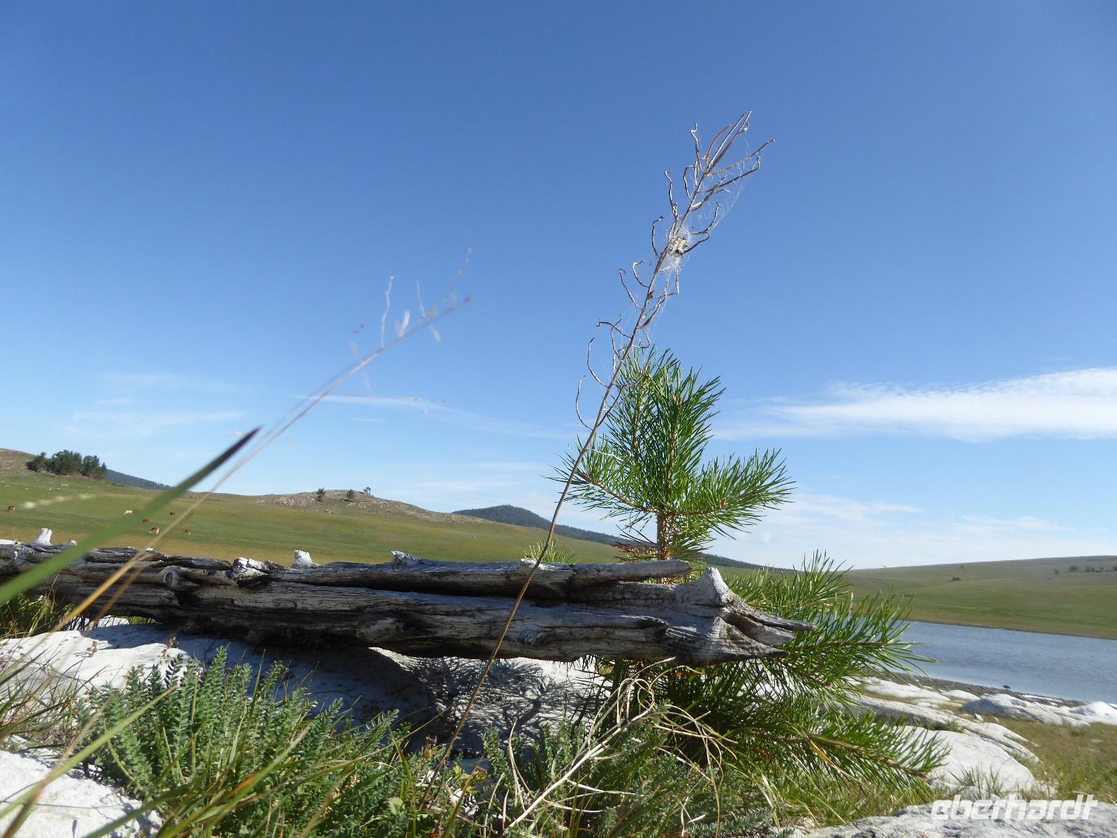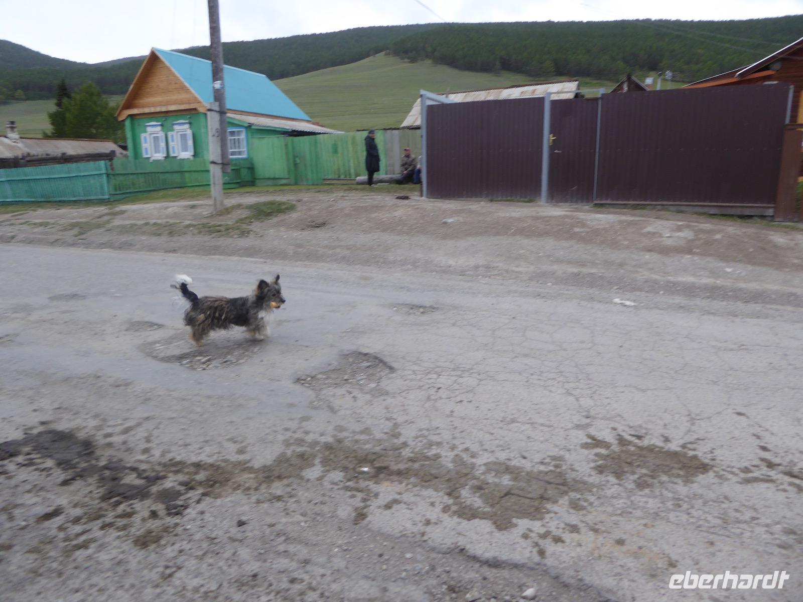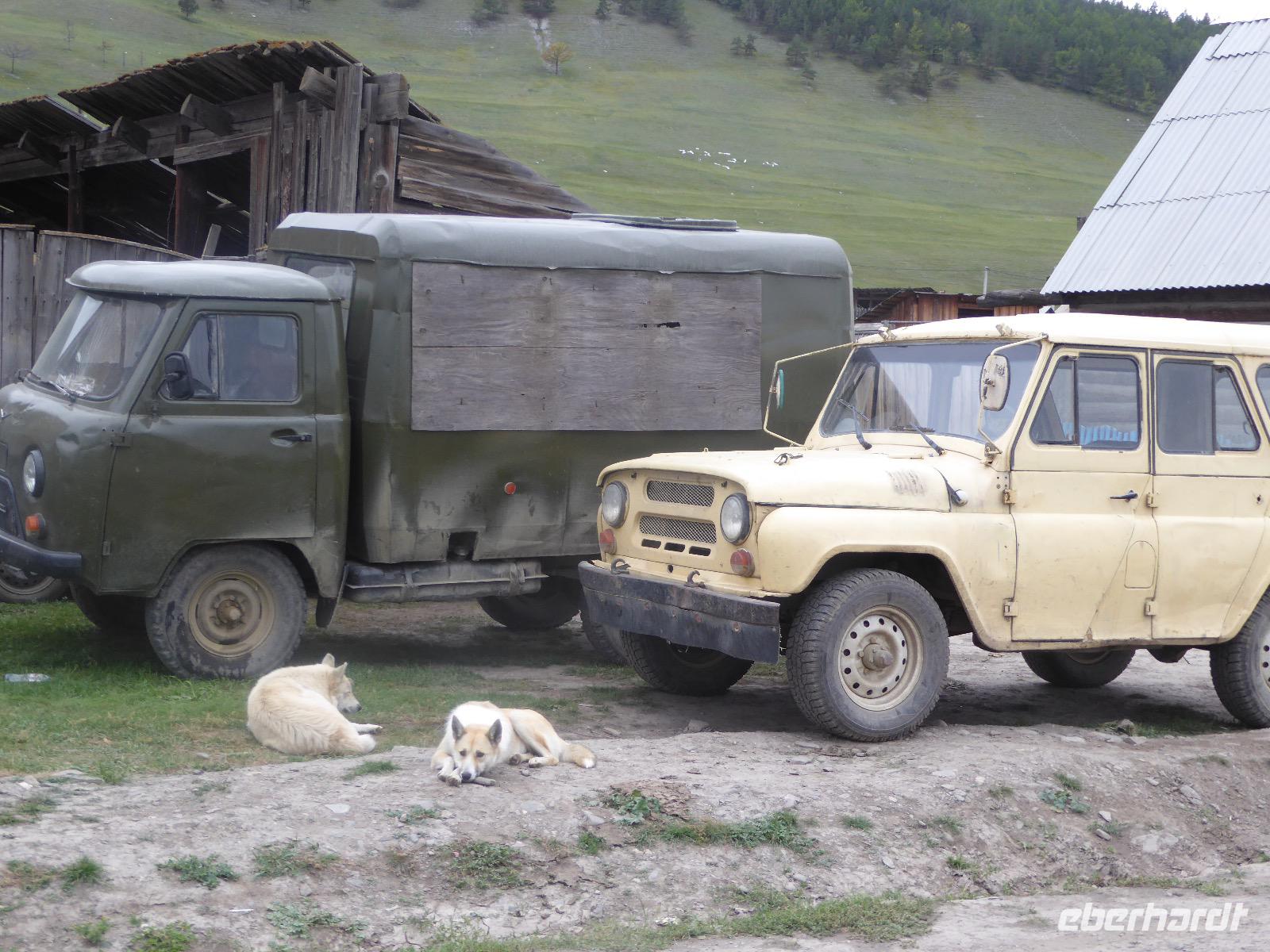 Früh ist es hell, wir brauchen keinen Strom für das Licht. Ein Morgenspaziergang am Baikalsee weckt die müden Glieder. Frühstück gibt es ab um neun. Hm, wie die Quarkkeulchen duften! Dazu Spiegelei auf sibirische Art, Brot, Marmelade, Tee. Kurz vor zehn laden wir die Koffer ein und verabschieden uns von Adel, unserer Gastgeberin. Wieder geht es auf und ab, wieder werden wir ordentlich durchgerüttelt. Doch es ist nicht so matschig wie gestern. Der Weg führt uns durch die traumhafte Landschaft der Tageransteppe. Wir halten an schönen Aussichtspunkten und um nach dem Weg zu schauen. Die Straße, die wir nehmen wollen, ist von Geröll überschüttet. Wir fahren zum Sagan-Saba und legen dort unser Picknick ein. Die Zutaten haben wir gestern im Magasin gekauft. Nun soll es zum Jeche-Jordo gehen. Unsere Tanja vertut sich etwas und hält am falschen Berg. Dafür bekommen wir hier ein Schauspiel der besonderen Art. Eine Gruppe Kühe und Bullen ist gerade dabei, Nachwuchs zu zeugen. Unseren nächsten Stopp legen wir am Adler-Totem ein - auch ein schamanischer Ort.