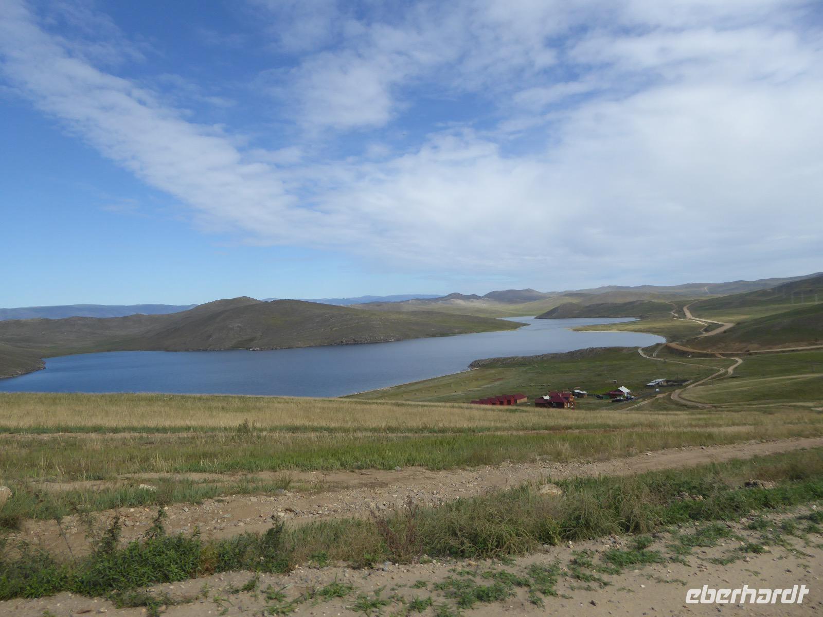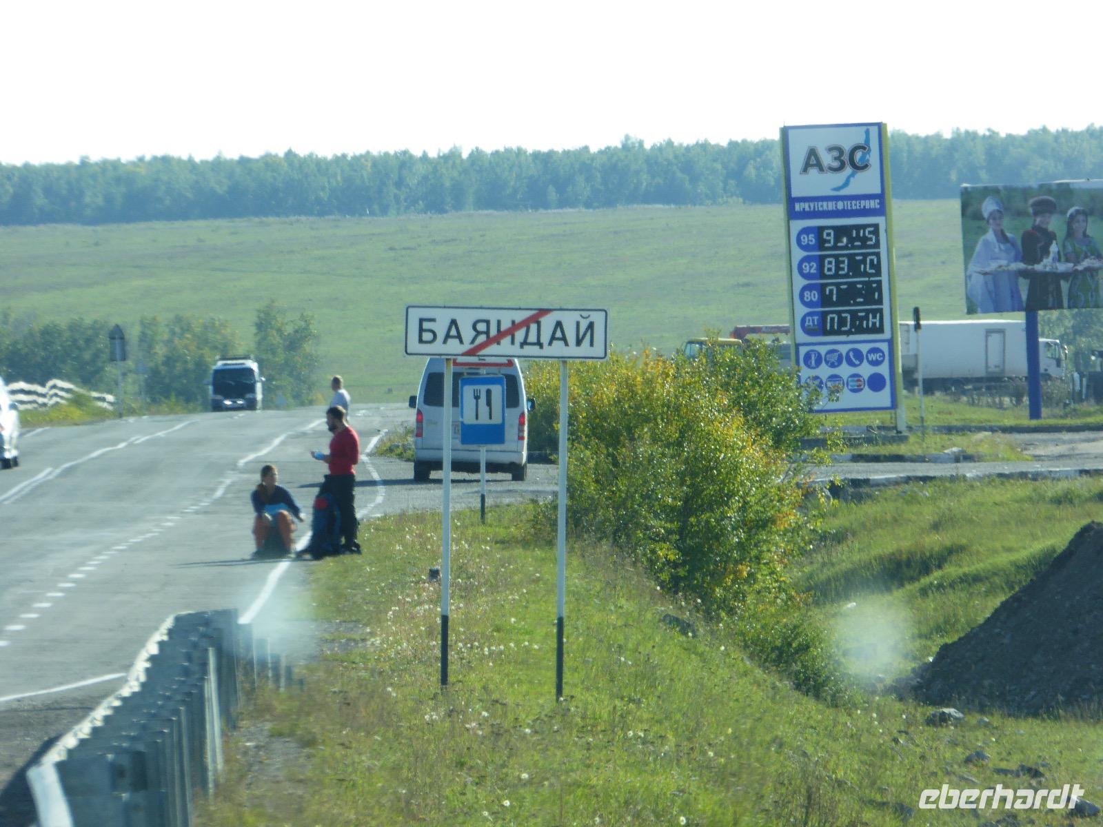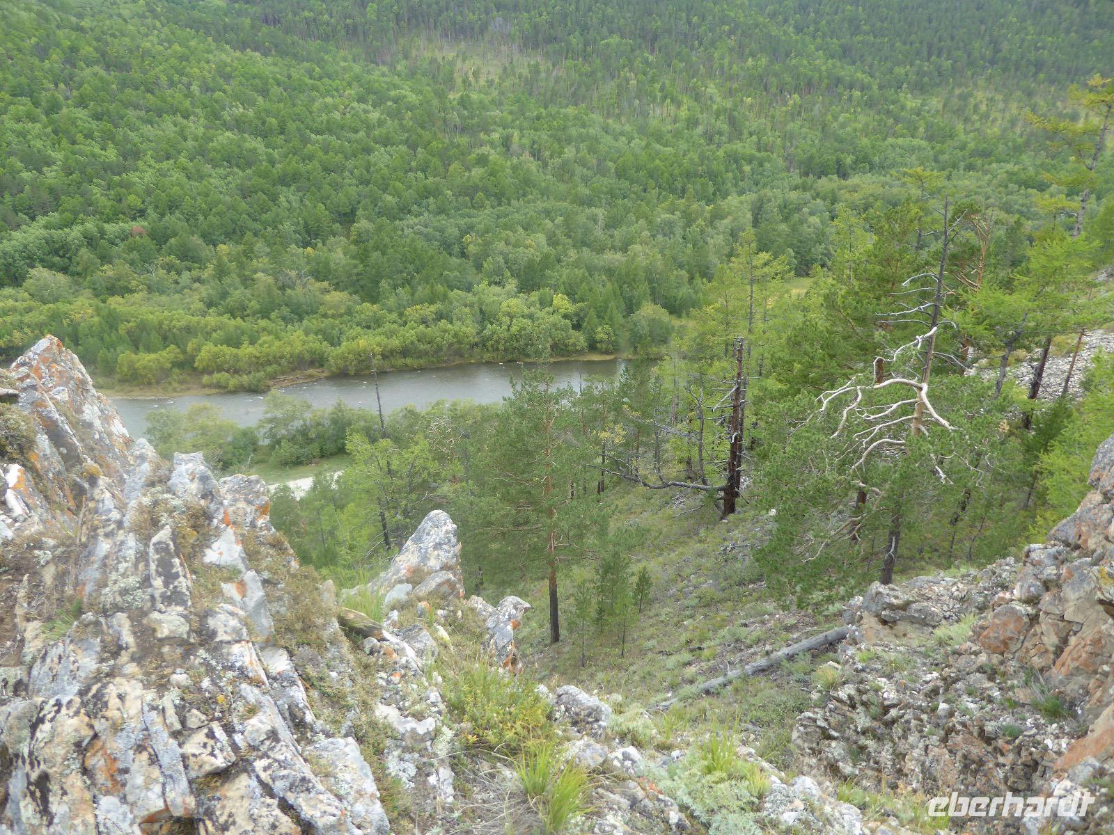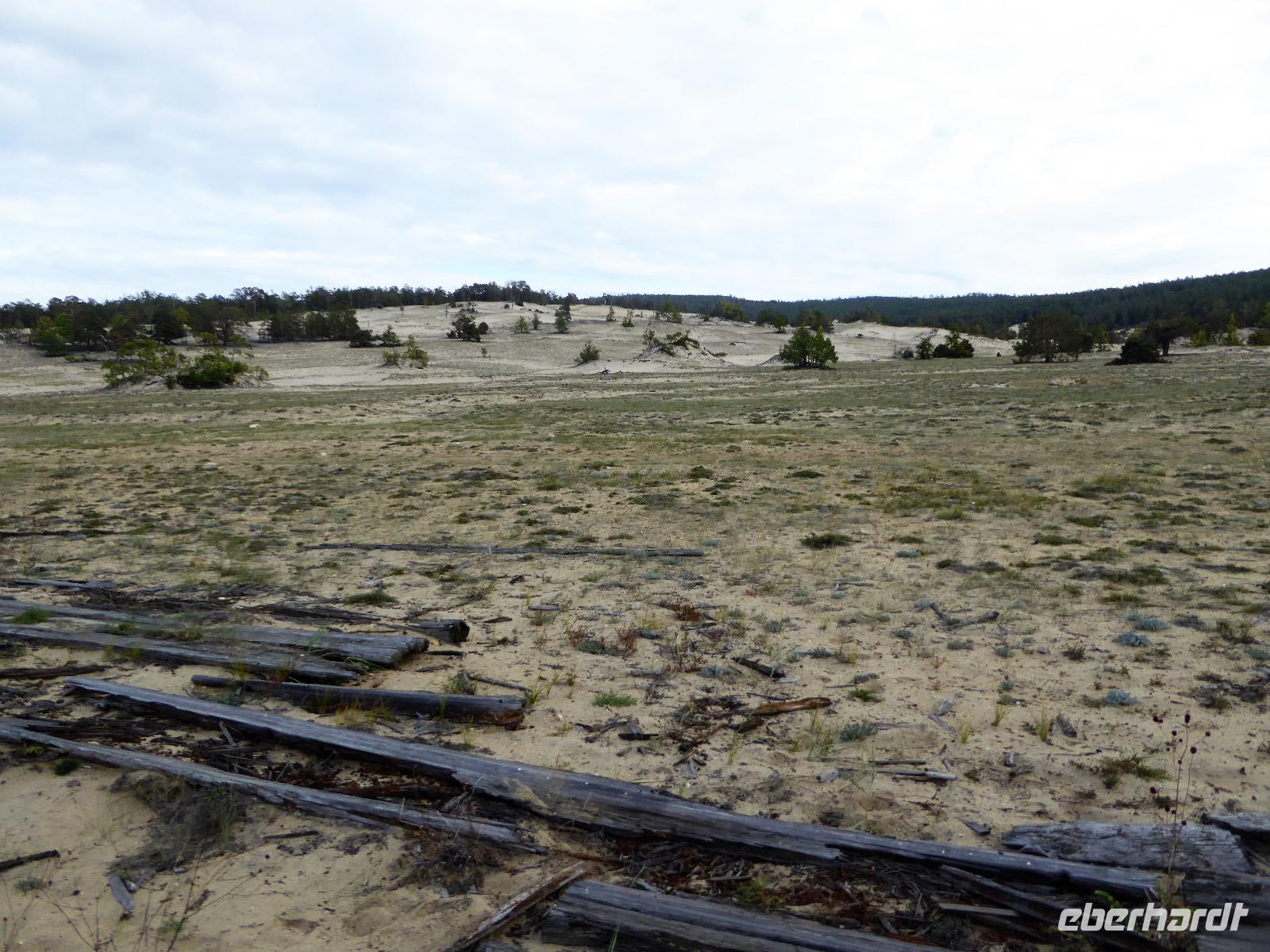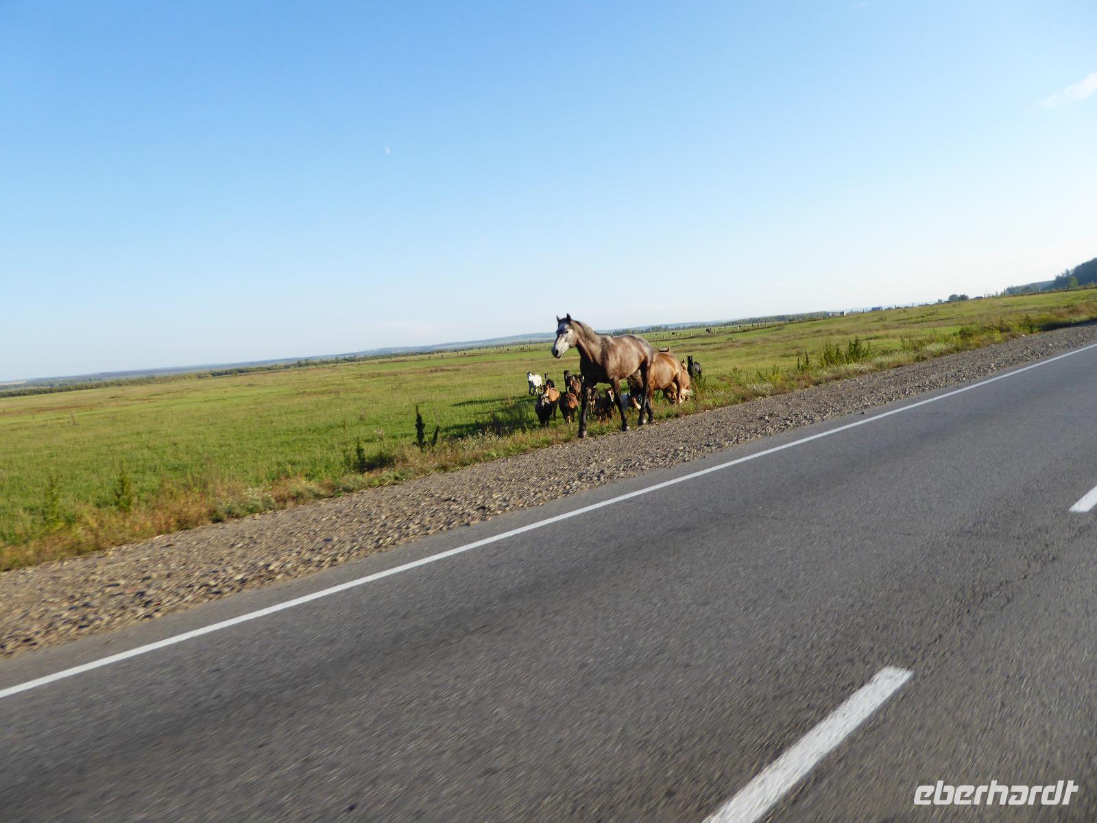 Früh ist es hell, wir brauchen keinen Strom für das Licht. Ein Morgenspaziergang am Baikalsee weckt die müden Glieder. Frühstück gibt es ab um neun. Hm, wie die Quarkkeulchen duften! Dazu Spiegelei auf sibirische Art, Brot, Marmelade, Tee. Kurz vor zehn laden wir die Koffer ein und verabschieden uns von Adel, unserer Gastgeberin. Wieder geht es auf und ab, wieder werden wir ordentlich durchgerüttelt. Doch es ist nicht so matschig wie gestern. Der Weg führt uns durch die traumhafte Landschaft der Tageransteppe. Wir halten an schönen Aussichtspunkten und um nach dem Weg zu schauen. Die Straße, die wir nehmen wollen, ist von Geröll überschüttet. Wir fahren zum Sagan-Saba und legen dort unser Picknick ein. Die Zutaten haben wir gestern im Magasin gekauft. Nun soll es zum Jeche-Jordo gehen. Unsere Tanja vertut sich etwas und hält am falschen Berg. Dafür bekommen wir hier ein Schauspiel der besonderen Art. Eine Gruppe Kühe und Bullen ist gerade dabei, Nachwuchs zu zeugen. Unseren nächsten Stopp legen wir am Adler-Totem ein - auch ein schamanischer Ort.