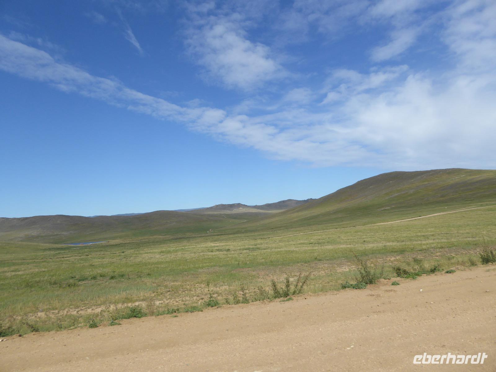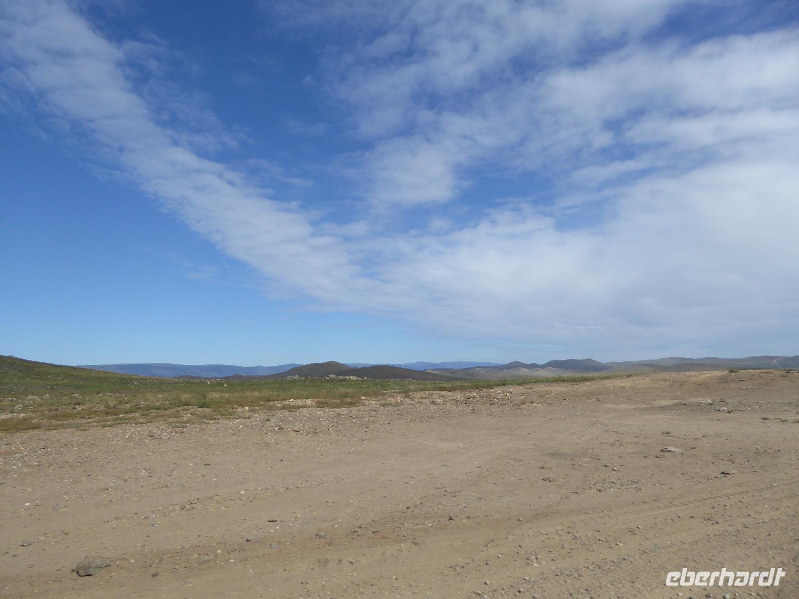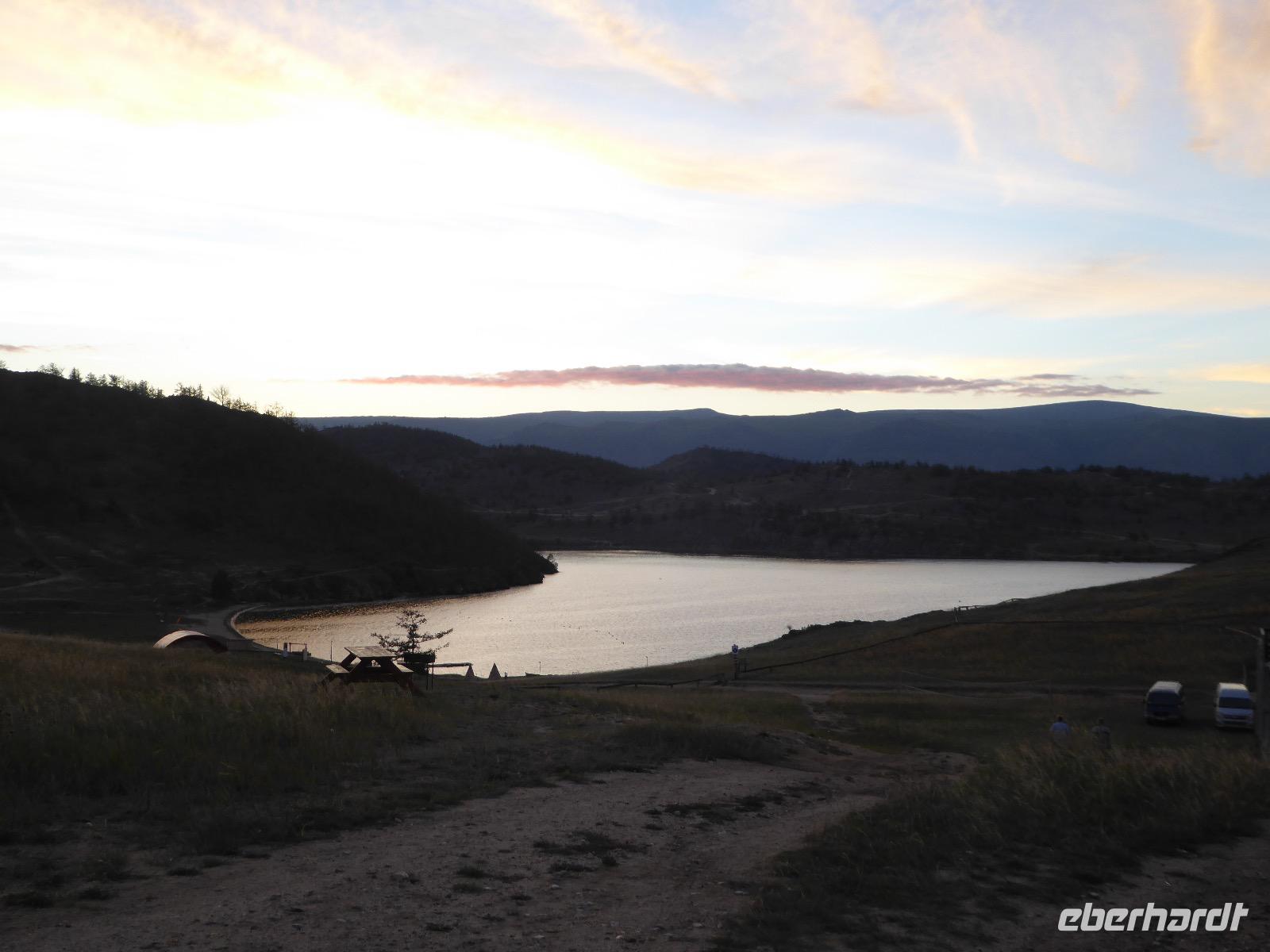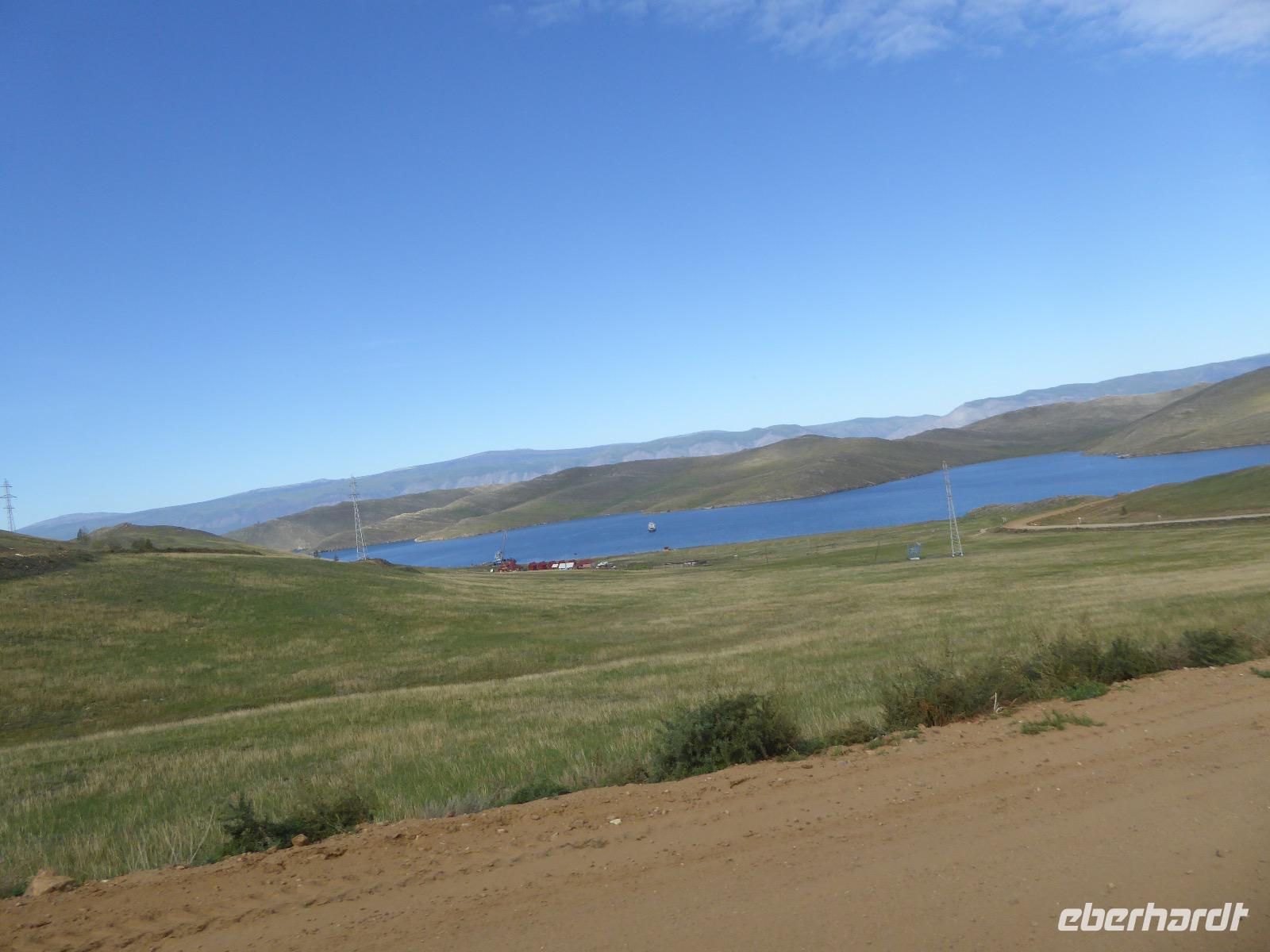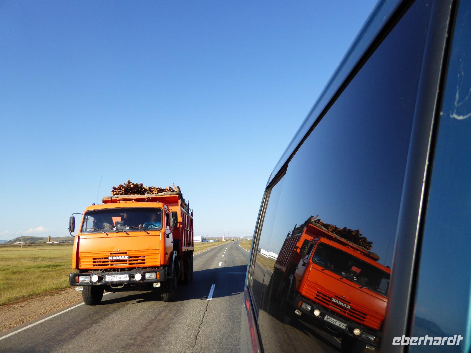 Früh ist es hell, wir brauchen keinen Strom für das Licht. Ein Morgenspaziergang am Baikalsee weckt die müden Glieder. Frühstück gibt es ab um neun. Hm, wie die Quarkkeulchen duften! Dazu Spiegelei auf sibirische Art, Brot, Marmelade, Tee. Kurz vor zehn laden wir die Koffer ein und verabschieden uns von Adel, unserer Gastgeberin. Wieder geht es auf und ab, wieder werden wir ordentlich durchgerüttelt. Doch es ist nicht so matschig wie gestern. Der Weg führt uns durch die traumhafte Landschaft der Tageransteppe. Wir halten an schönen Aussichtspunkten und um nach dem Weg zu schauen. Die Straße, die wir nehmen wollen, ist von Geröll überschüttet. Wir fahren zum Sagan-Saba und legen dort unser Picknick ein. Die Zutaten haben wir gestern im Magasin gekauft. Nun soll es zum Jeche-Jordo gehen. Unsere Tanja vertut sich etwas und hält am falschen Berg. Dafür bekommen wir hier ein Schauspiel der besonderen Art. Eine Gruppe Kühe und Bullen ist gerade dabei, Nachwuchs zu zeugen. Unseren nächsten Stopp legen wir am Adler-Totem ein - auch ein schamanischer Ort.