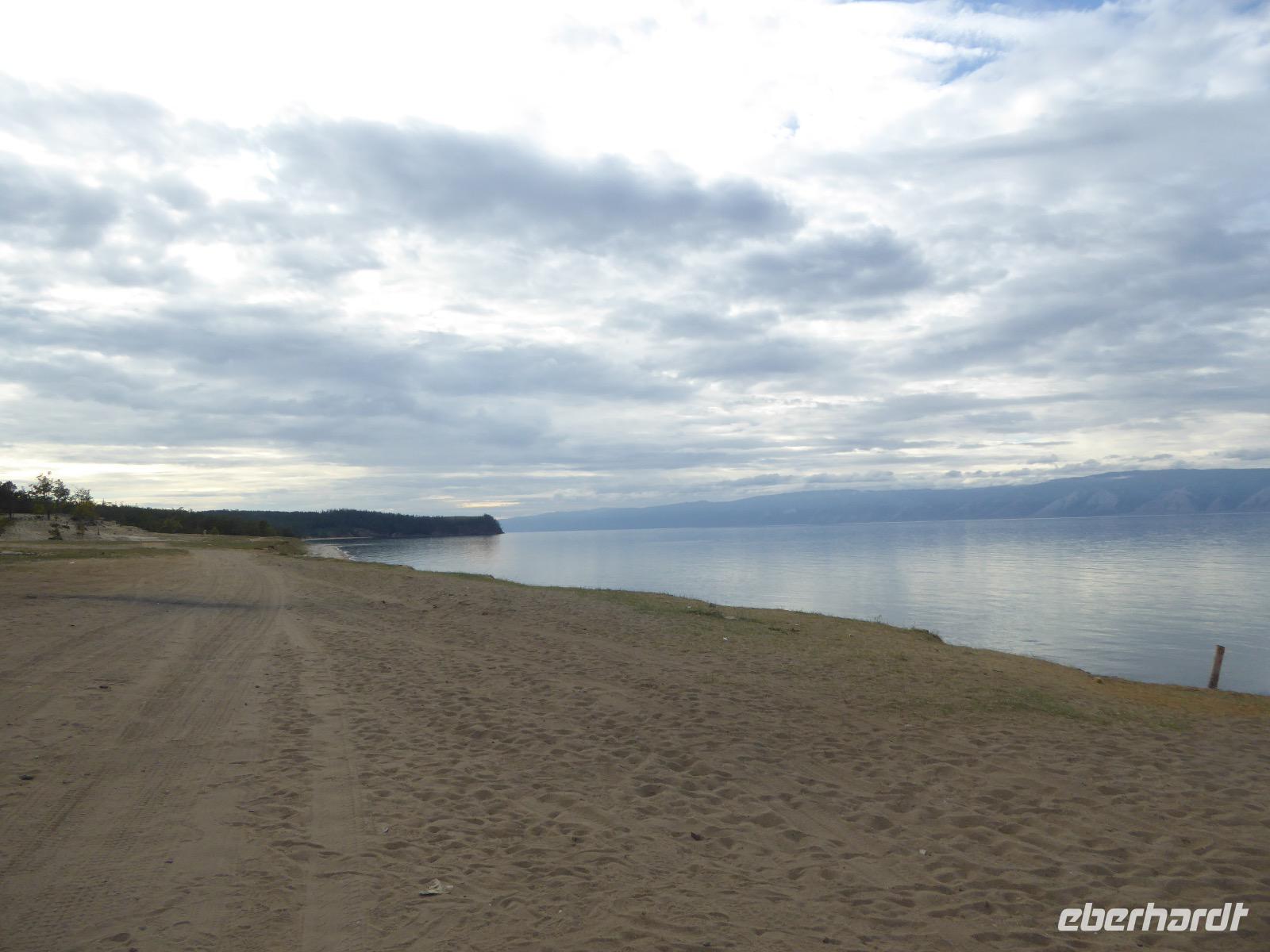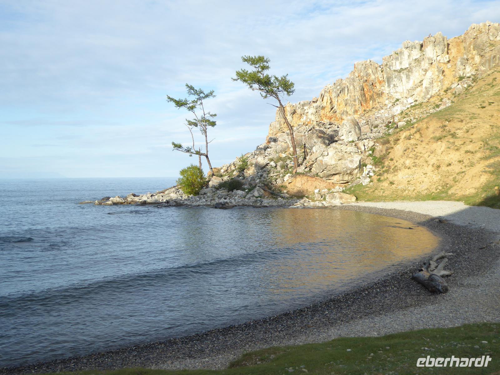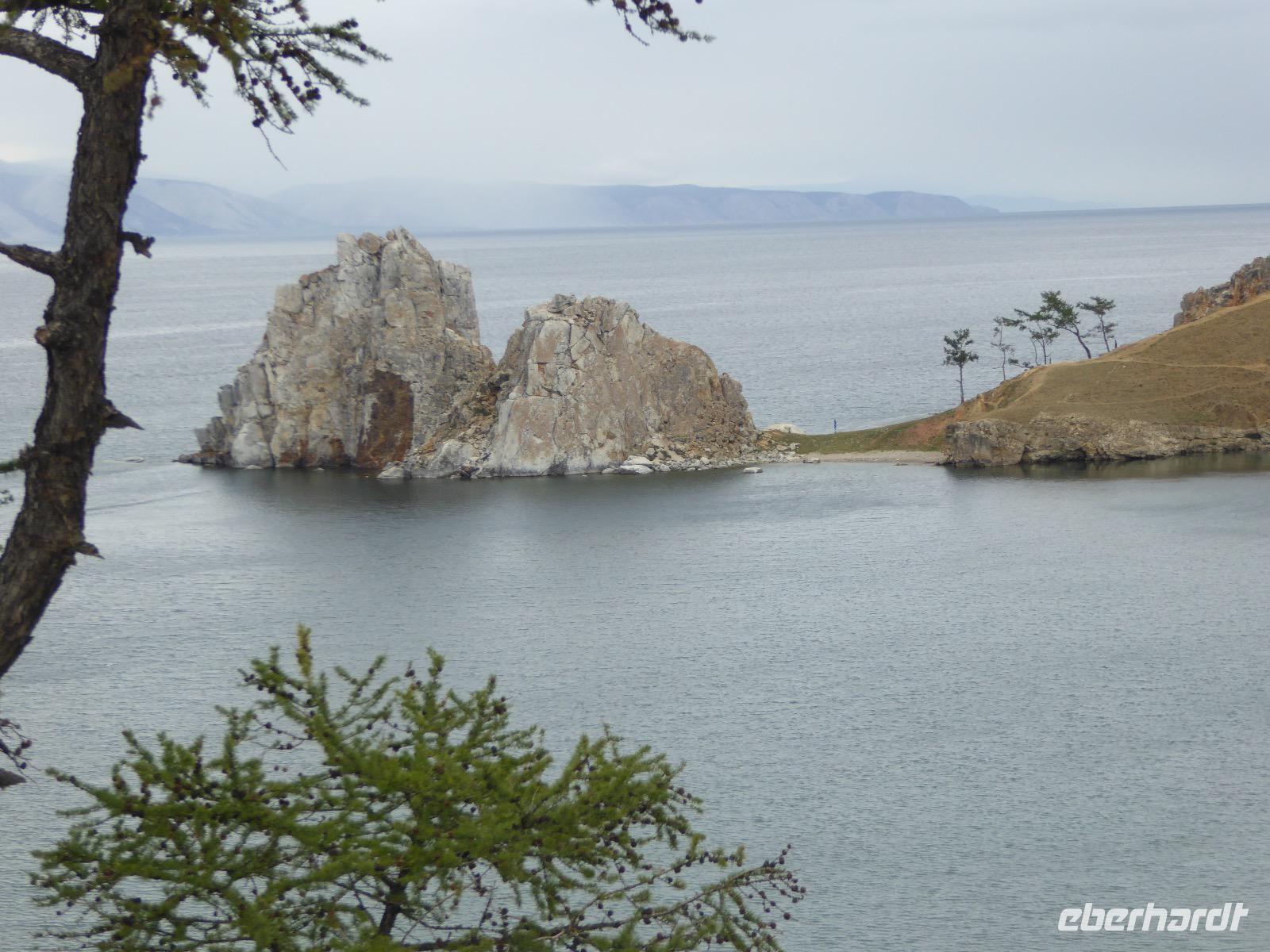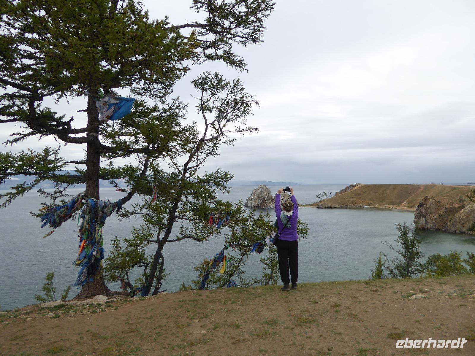 Nach einem gemeinsamen Frühstück steigen wir um zehn in zwei echte russische Geländewagen. Ein Tag voller Abenteuer erwartet uns. Über Stock und Stein geht die Fahrt, bei der wir wieder richtig durchgeschüttelt werden. Den ersten Stopp legen wir am sogenannten Krokodilfelsen ein, was dem Ort die Bezeichnung Natursteinzoo verleiht (es gibt auch noch einen Nilpferdfelsen). Unser Blick fällt auf eine schöne Sandbucht und auf eine Gruppe Chinesen. Diese sind gerade dabei eine Drohne zu starten. Neugierig beobachten wir das Treiben. Sie haben auch nichts dagegen, dass wir uns die ganze Sache aus der Nähe betrachten. Die Drohne startet, die Chinesen und Ingrid lassen sich von oben fotografieren und weg ist das Ding. Zeit, wieder in die Jeeps einzusteigen und weiter zu fahren. Nach ca. zwei Stunden haben wir das Hauptziel des heutigen Tages erreicht. Es ist das Kap Choboi (burjatisch „der Hauer" oder „der Eckzahn"). Von einer Seite aus betrachtet, könnte man meinen, ein Frauenprofil aus Stein zu sehen. Entsprechend gibt es auch eine Legende von einer Frau, die auf ihren Mann neidisch war, trotzdem sie alles hatte und von den Göttern zu Stein verwandelt wurde. Wir marschieren bis zum nördlichsten Ende und schließen dort Freundschaft mit Chinesen, die sich nicht von unserem Foto verscheuchen lassen und auf die Frage, wie sie denn heißen, immer „Cheina" antworten, weil sie denken, wir fragen sie nach ihrer Herkunft. Nachdem wir die Aussicht genossen und uns satt fotografiert haben, kehren wir zu unseren Bussen zurück. Hier erwarten uns unsere Fahrer bereits mit einer leckeren Omul-Fischsuppe, Weißbrot, Tomaten und Gurken und heißem Tee. Ein Falkenpaar jagen wir mit unseren Fotoapparaten und auch einige Möwen müssen daran glauben. Am Liebesfelsen klettern wir entweder in die eine oder andere Richtung, je nachdem, ob der Wunsch nach Nachwuchs ein Junge oder Mädchen ist. Die drei versteinerten Brüder erwarten uns beim nächsten Stopp. Die Legende besagt, dass ein Vater drei Söhne und eine Tochter hatte. Die Tochter rannte mit ihrem Freund davon, die Brüder sollten das Mädchen zurückbringen. Sie hielten jedoch zu ihrer Schwester und verrieten sie nicht. Der Vater, ein Schamane, sah alles und wütend verwandelte er seine Söhne zu Stein. Die meteorologische Station zu der wir als nächstes fahren, ist bereits geschlossen, die Saison ist vorbei. Weiter geht es über Stock und Stein und Sandboden, bis an einem Fahrzeug ein Rad seinen Geist aufgibt. Aber unsere wackeren Russen kennen das und flott ist das Rad ausgewechselt. Ein paar Meter weiter haben sich zwei nicht mehr ganz nüchterne Russen mit ihrem Pkw festgefahren. Auch diesen helfen unsere Fahrer aus ihrer misslichen Lage. Unseren letzten Halt legen wir an einer Stelle mit einer traurigen Geschichte ein. Hier gab es bis 1953 einen Gulag, das heißt ein russisches Lager mit Verbannten. Diese mussten für die Fischindustrie arbeiten, selbst im Winter bei minus 20 Grad. Heute sind nur noch ein paar Holzbohlen zu sehen, die damals eine Straße bildeten, auf der die Holzkarren Fisch transportierten. Nun ist der Ausflug zu Ende, aber Tanja hat noch für uns den Besuch der kleinen Kirche auf dem Programm. Dann ist es endlich Zeit, die Füße hochzulegen und aufs Abendessen zu warten.