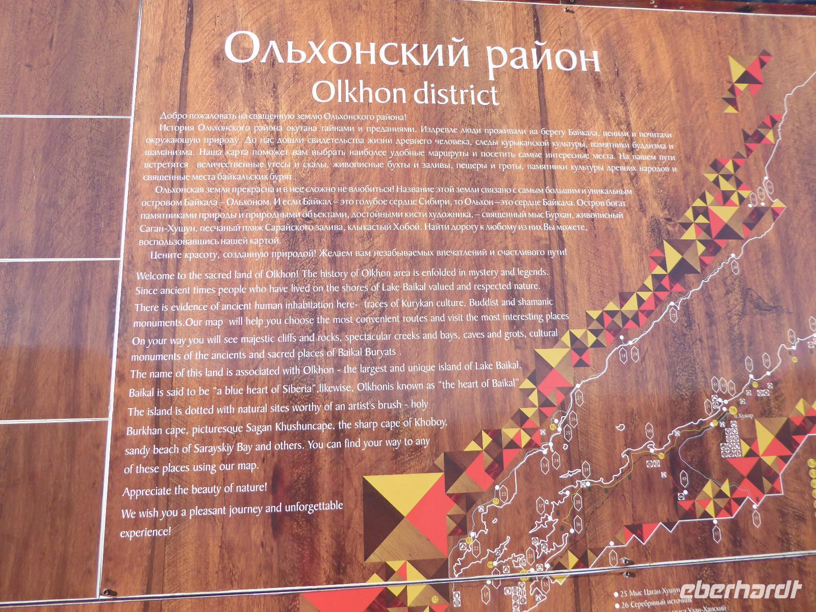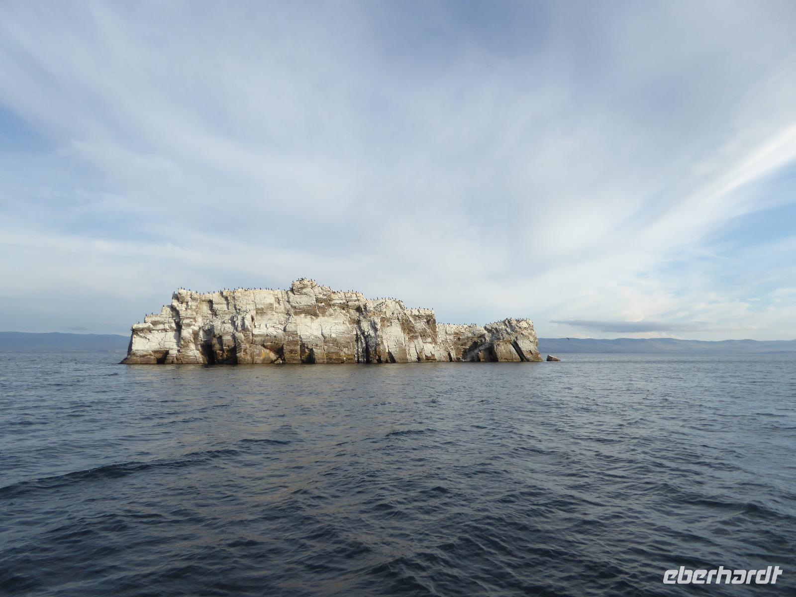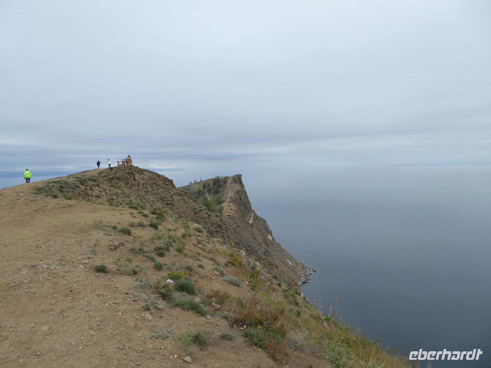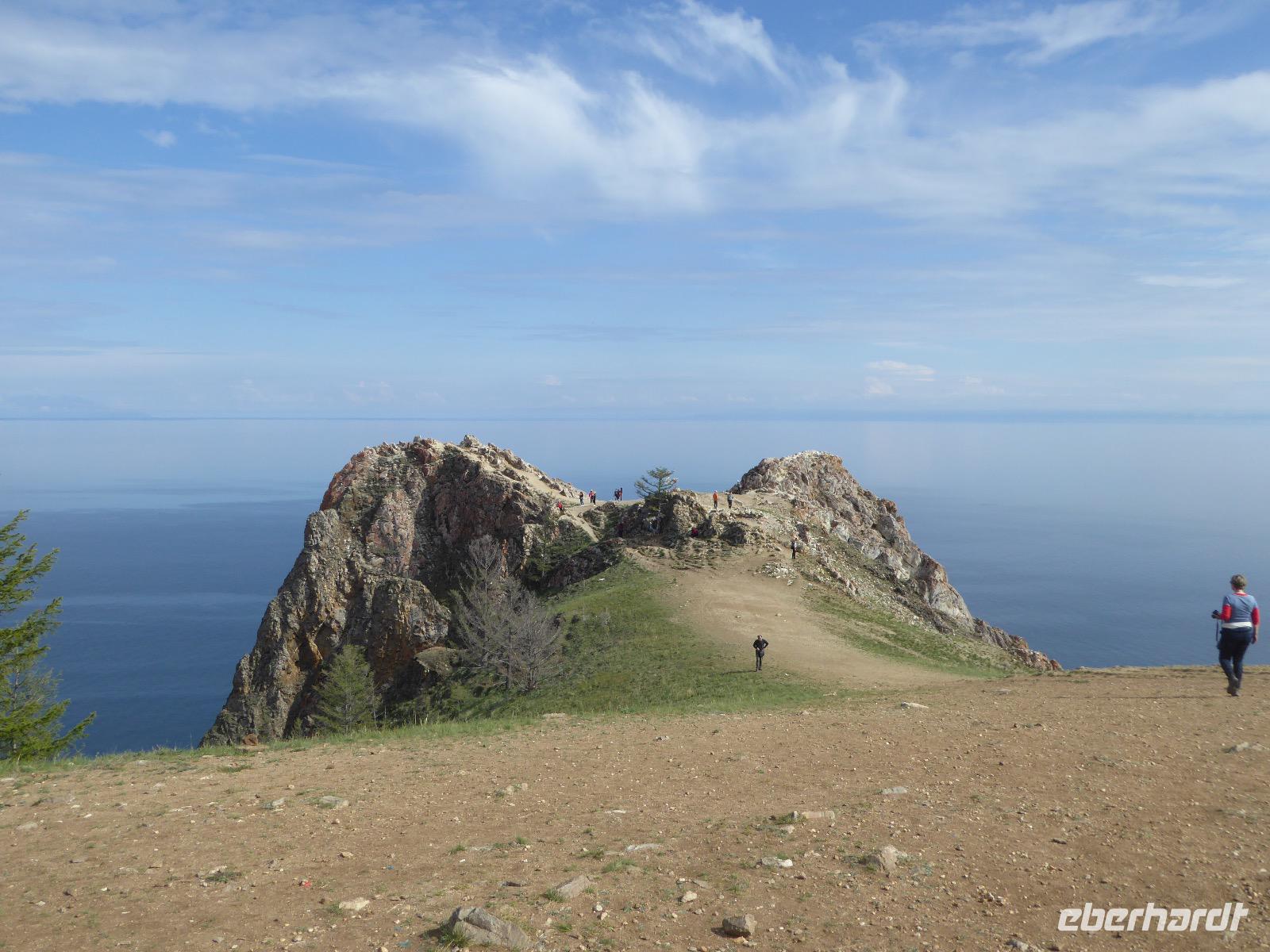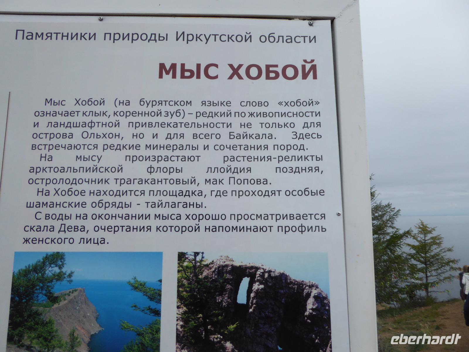 Nach einem gemeinsamen Frühstück steigen wir um zehn in zwei echte russische Geländewagen. Ein Tag voller Abenteuer erwartet uns. Über Stock und Stein geht die Fahrt, bei der wir wieder richtig durchgeschüttelt werden. Den ersten Stopp legen wir am sogenannten Krokodilfelsen ein, was dem Ort die Bezeichnung Natursteinzoo verleiht (es gibt auch noch einen Nilpferdfelsen). Unser Blick fällt auf eine schöne Sandbucht und auf eine Gruppe Chinesen. Diese sind gerade dabei eine Drohne zu starten. Neugierig beobachten wir das Treiben. Sie haben auch nichts dagegen, dass wir uns die ganze Sache aus der Nähe betrachten. Die Drohne startet, die Chinesen und Ingrid lassen sich von oben fotografieren und weg ist das Ding. Zeit, wieder in die Jeeps einzusteigen und weiter zu fahren. Nach ca. zwei Stunden haben wir das Hauptziel des heutigen Tages erreicht. Es ist das Kap Choboi (burjatisch „der Hauer" oder „der Eckzahn"). Von einer Seite aus betrachtet, könnte man meinen, ein Frauenprofil aus Stein zu sehen. Entsprechend gibt es auch eine Legende von einer Frau, die auf ihren Mann neidisch war, trotzdem sie alles hatte und von den Göttern zu Stein verwandelt wurde. Wir marschieren bis zum nördlichsten Ende und schließen dort Freundschaft mit Chinesen, die sich nicht von unserem Foto verscheuchen lassen und auf die Frage, wie sie denn heißen, immer „Cheina" antworten, weil sie denken, wir fragen sie nach ihrer Herkunft. Nachdem wir die Aussicht genossen und uns satt fotografiert haben, kehren wir zu unseren Bussen zurück. Hier erwarten uns unsere Fahrer bereits mit einer leckeren Omul-Fischsuppe, Weißbrot, Tomaten und Gurken und heißem Tee. Ein Falkenpaar jagen wir mit unseren Fotoapparaten und auch einige Möwen müssen daran glauben. Am Liebesfelsen klettern wir entweder in die eine oder andere Richtung, je nachdem, ob der Wunsch nach Nachwuchs ein Junge oder Mädchen ist. Die drei versteinerten Brüder erwarten uns beim nächsten Stopp. Die Legende besagt, dass ein Vater drei Söhne und eine Tochter hatte. Die Tochter rannte mit ihrem Freund davon, die Brüder sollten das Mädchen zurückbringen. Sie hielten jedoch zu ihrer Schwester und verrieten sie nicht. Der Vater, ein Schamane, sah alles und wütend verwandelte er seine Söhne zu Stein. Die meteorologische Station zu der wir als nächstes fahren, ist bereits geschlossen, die Saison ist vorbei. Weiter geht es über Stock und Stein und Sandboden, bis an einem Fahrzeug ein Rad seinen Geist aufgibt. Aber unsere wackeren Russen kennen das und flott ist das Rad ausgewechselt. Ein paar Meter weiter haben sich zwei nicht mehr ganz nüchterne Russen mit ihrem Pkw festgefahren. Auch diesen helfen unsere Fahrer aus ihrer misslichen Lage. Unseren letzten Halt legen wir an einer Stelle mit einer traurigen Geschichte ein. Hier gab es bis 1953 einen Gulag, das heißt ein russisches Lager mit Verbannten. Diese mussten für die Fischindustrie arbeiten, selbst im Winter bei minus 20 Grad. Heute sind nur noch ein paar Holzbohlen zu sehen, die damals eine Straße bildeten, auf der die Holzkarren Fisch transportierten. Nun ist der Ausflug zu Ende, aber Tanja hat noch für uns den Besuch der kleinen Kirche auf dem Programm. Dann ist es endlich Zeit, die Füße hochzulegen und aufs Abendessen zu warten.