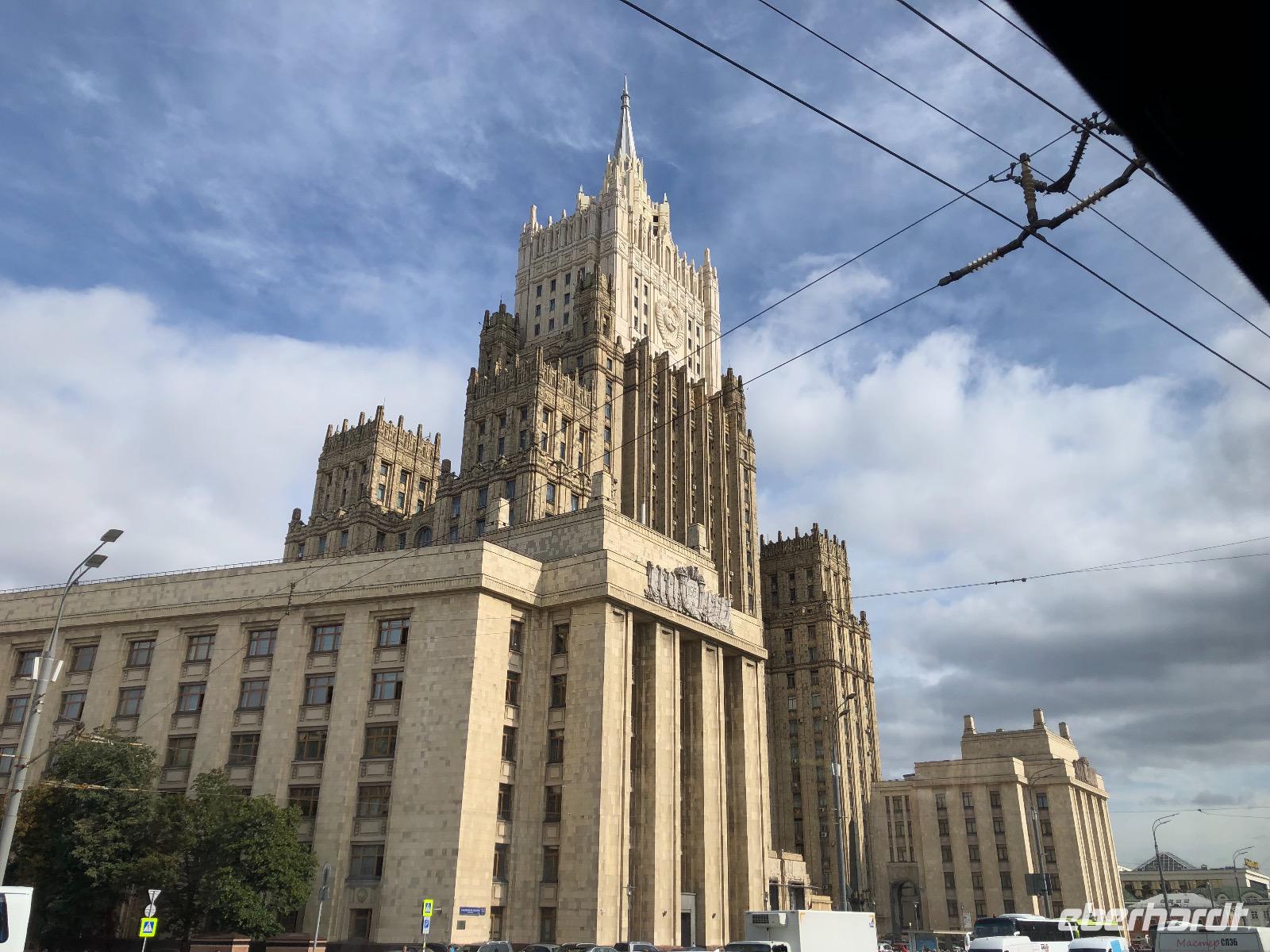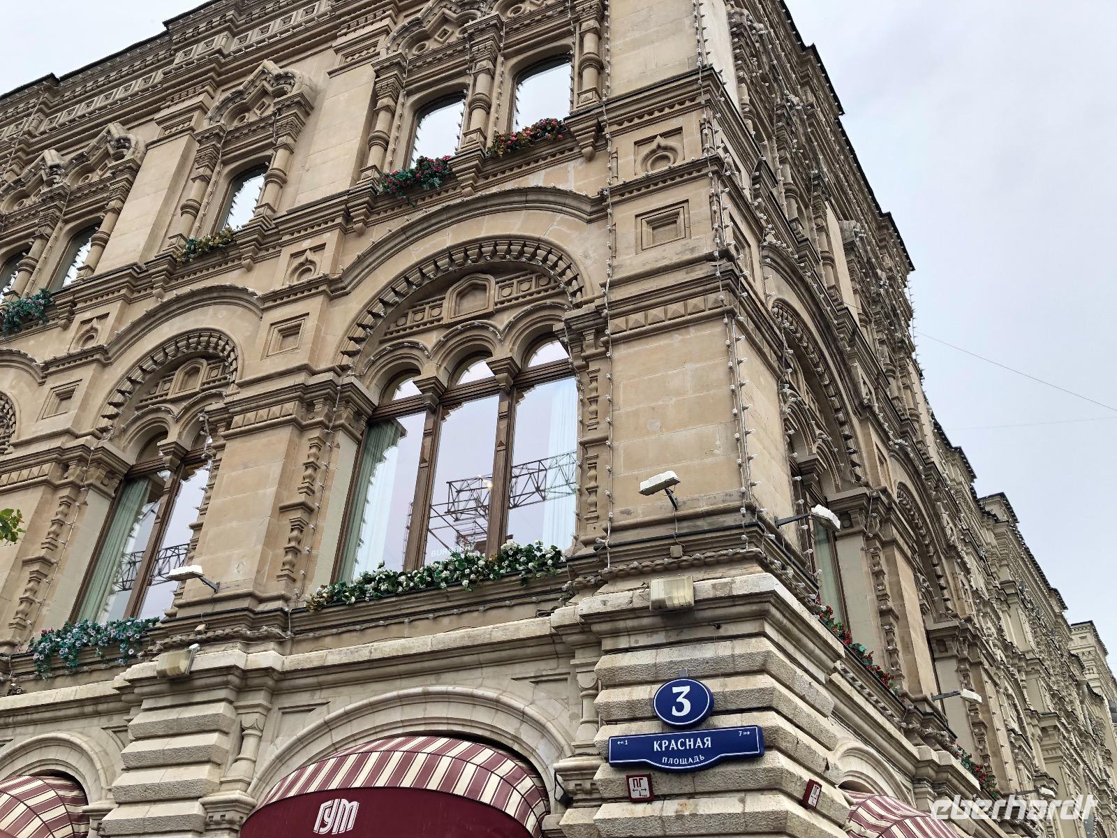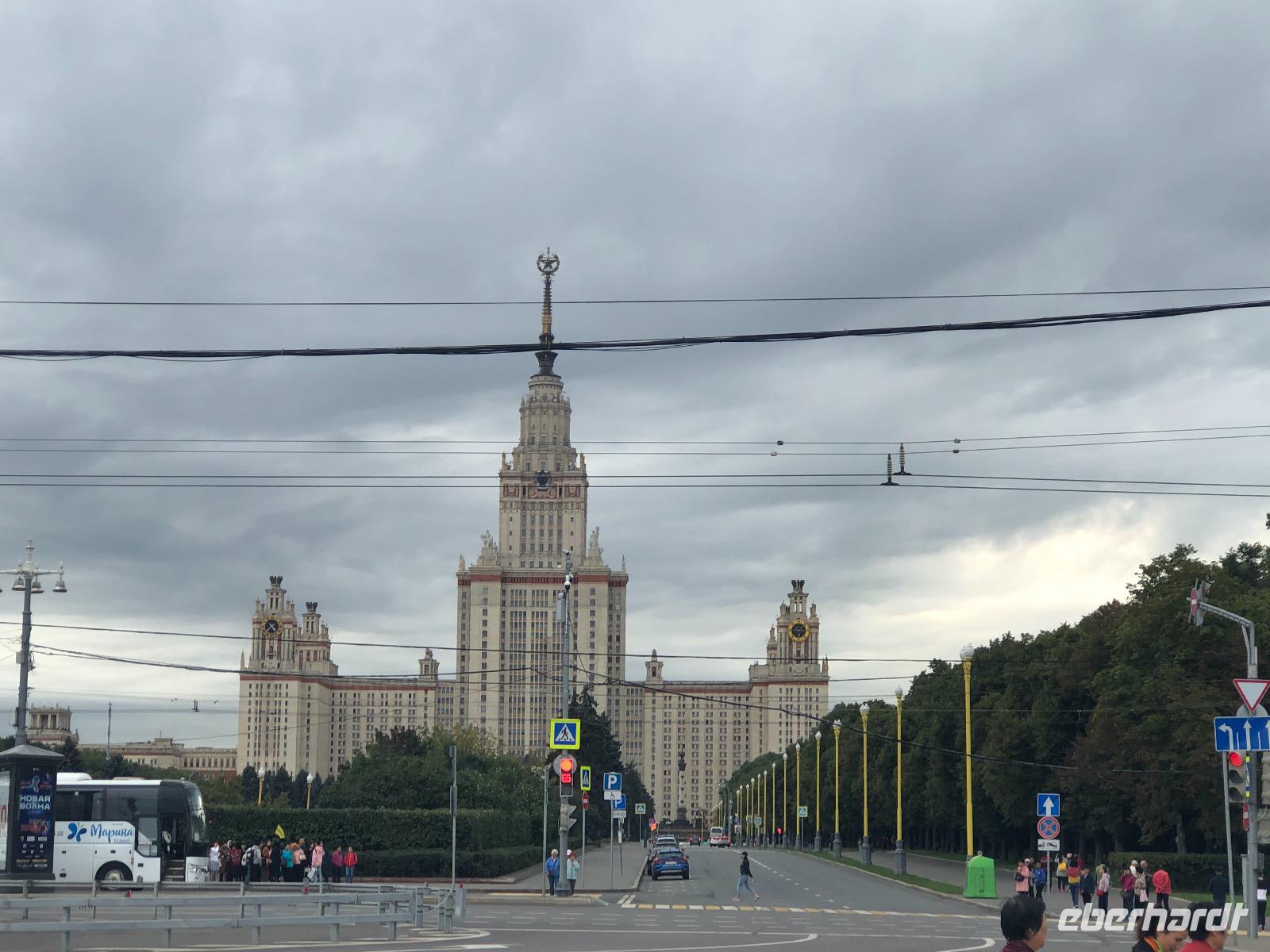 Wir haben uns heute viel vorgenommen und beginnen unsere Fahrt am Neuen Arbat. Vorbei geht es an der Simeonskirche, weiß, mit grünen Dächern und Zwiebeltürmchen, dem Morosow Schloss, das ein junger Adliger bauen ließ, dessen Mutter über ihn sagte: Dass du ein Idiot bist, habe früher nur ich gewusst, jetzt weiß es ganz Moskau und dem Verteidigungsministerium. Wir durchfahren das Theaterviertel und kommen am Puschkinplatz vorbei. An der Hauptstraße Twerskaja Uliza befindet sich das Hotel Lux mit einer geschichtsträchtigen Vergangenheit, hier waren in den 1930er Jahren deutsche Emigranten untergebracht, von denen viele zwischen 1936 und 1938 durch den NKWD verhaftet, gefoltert und ermordet wurden. Heute wird es immer noch saniert.