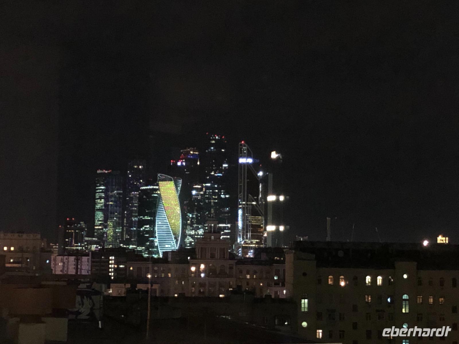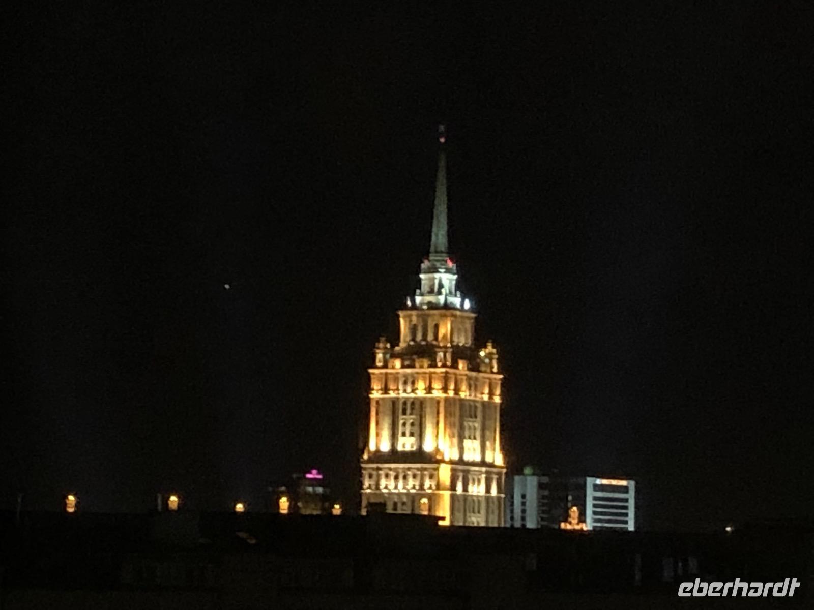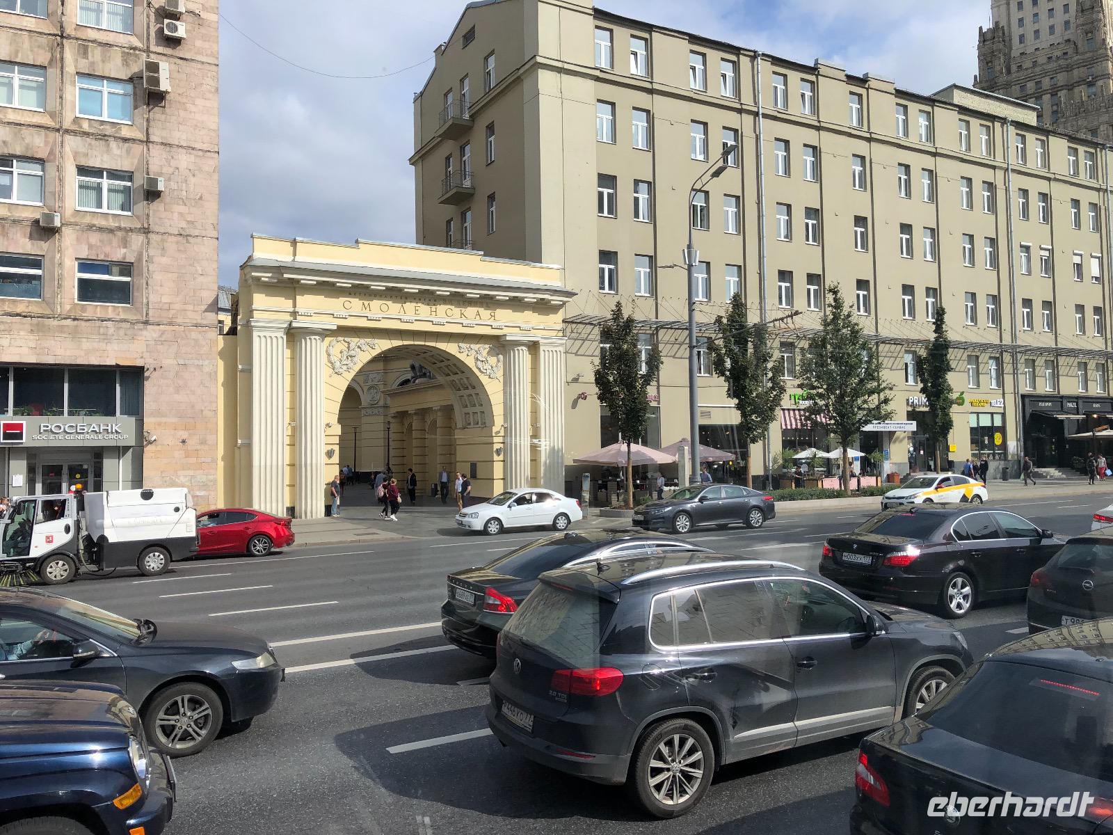 Wir müssen keine Einreisezettel ausfüllen und auch keine Zollerklärung. Wir passieren die Passkontrolle, jeder bekommt einen Immigrationsnachweis (ein kleiner weißer Zettel, den man auf gar keinen Fall verlieren darf) und wir gehen gemeinsam zum Kofferband. Auch hier läuft alles reibungslos, schnell sind alle Koffer gefunden und wir begeben uns zum Ausgang. Hier erwartet uns Jelena, die uns heute und morgen in Moskau betreuen wird. Den Busfahrer Valeri kenne ich von der Weltreise, da hat er unsere Gruppe ebenfalls gefahren. Auch er erkennt mich wieder, ist ja auch noch gar nicht lange her. Etwas mehr als eine Stunde fahren wir Richtung Zentrum zu unserem Hotel. Unterwegs gibt uns Jelena Informationen darüber was an der Strecke zu sehen ist und über das Leben in Moskau. Unser Hotel Azimut liegt zentral, fußläufig zum Alten Arbat. Gleich nebenan gibt es eine Bank mit Geldautomaten, wo wir auch mit der EC-Karte Rubel abheben können. Nach einer halben Stunde zum Frischmachen treffen wir uns und wollen zum Metrohopping aufbrechen. Ein unerwartetes Ereignis durchkreuzt unsere Pläne und so kommt es zunächst einmal zu einem Spaziergang auf dem Arbat. Um 19 Uhr gibt es ein Abendessen in Menüform in der 4. Etage des Hotels im Restaurant Avenue.